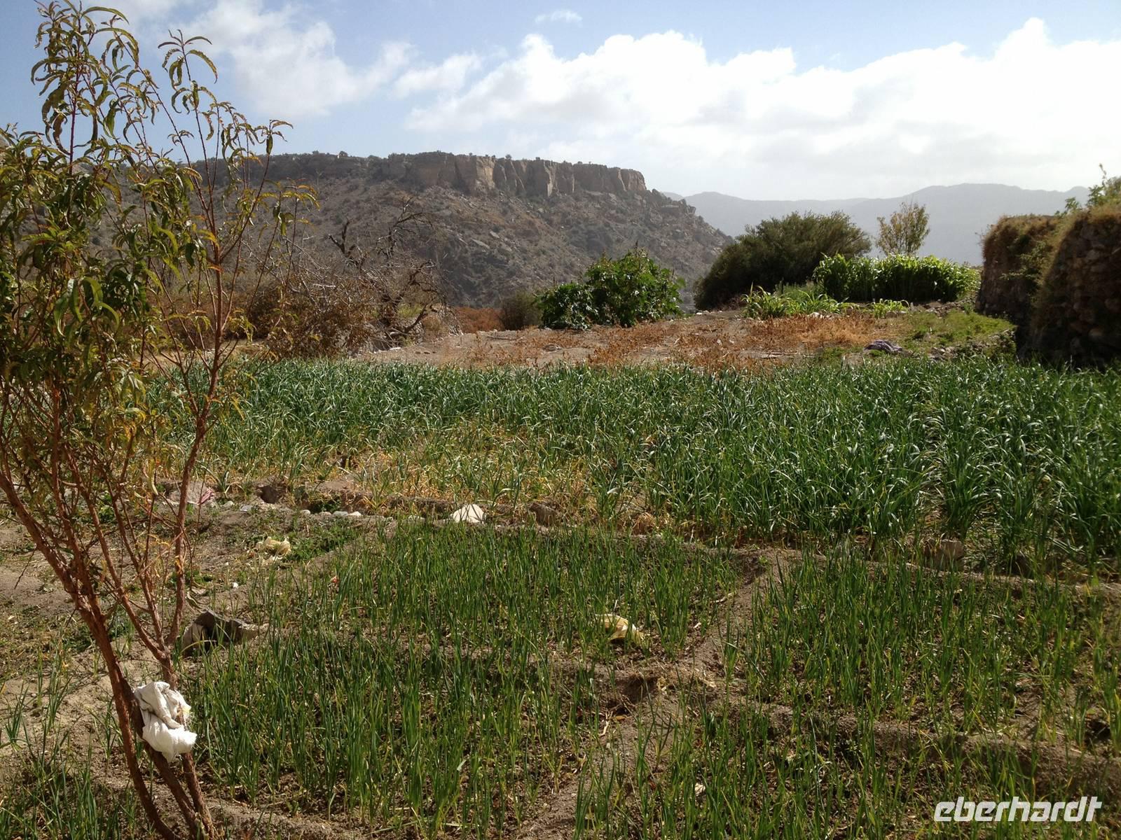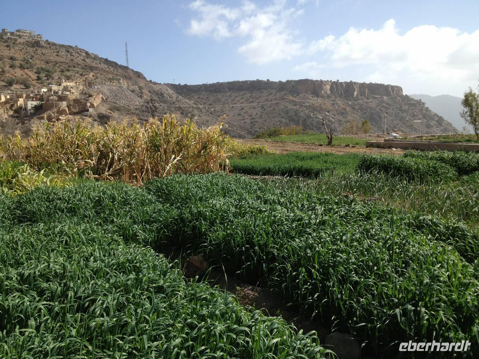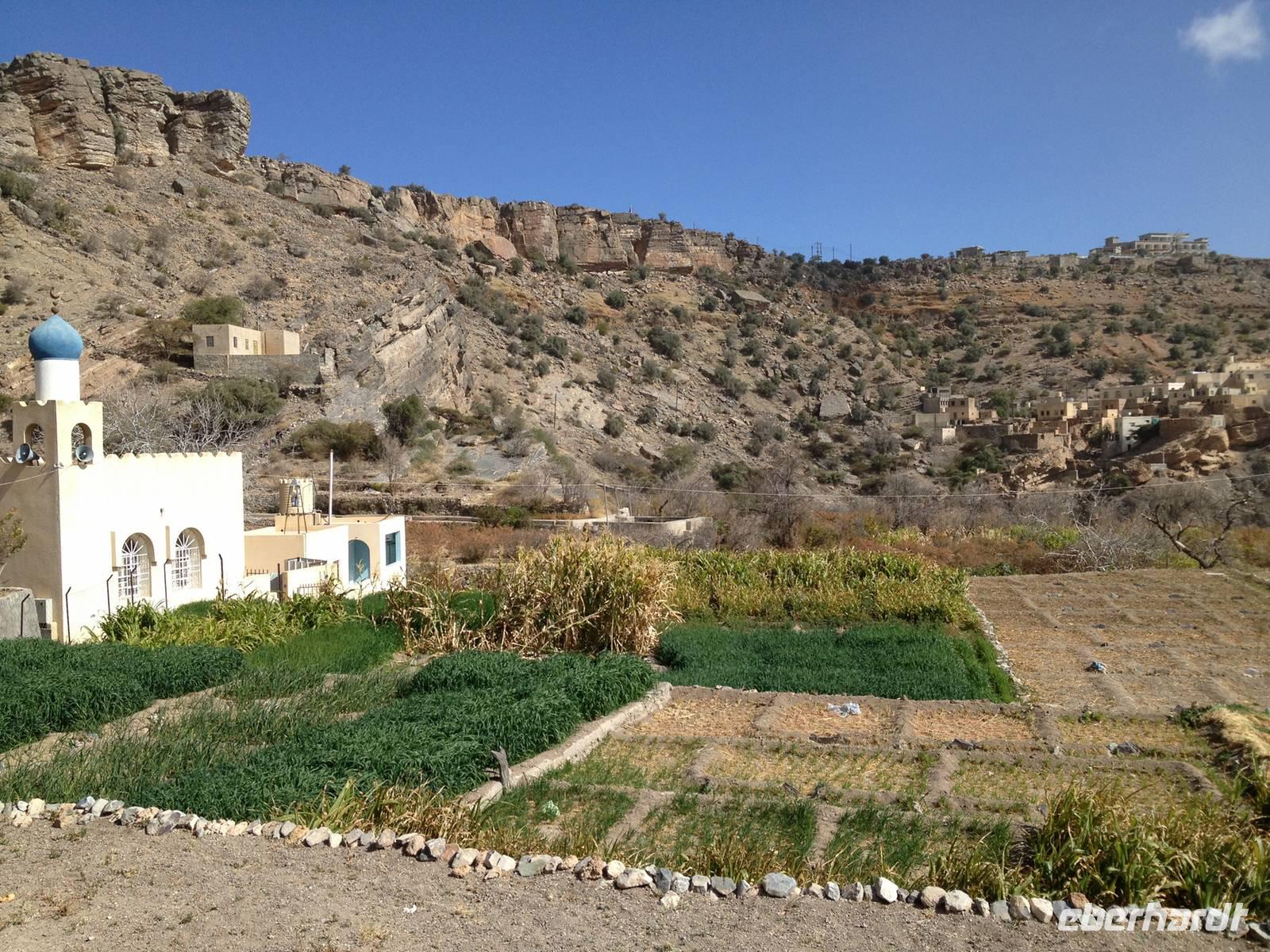 Der Jebel Akhdar ist das grüne Juwel des Hajar-Gebirges und ein Ort, der auf der ganzen arabischen Halbinsel seinesgleichen sucht. In wildromantischer Weise trotzt des Saiq-Plateau der Gebirgswüste. Wir ließen uns die frische Luft hoch oben im Gebirge um die Nase wehen und entdeckten den Jebel Akhdar mit seinen terrassenartig angelegten Obstgärten, welche mit Hilfe der traditionellen Falaj-Systeme bewässert werden. Verschiedene Obstsorten werden hier angebaut, darunter Pfirsiche, Aprikosen, Feigen, Trauben, Äpfel, Pflaumen und Birnen, welche in der Regel zwischen Juli und September geerntet werden. Neben Obst werden auch Mandeln und Walnüsse angebaut. Im März und April ist die Luft am Jebel al Akhdar vom Duft der Rosen erfüllt, welche zu dieser Zeit in voller Blüte stehen und aus denen die Dorfbewohner das begehrte Rosenwasser herstellen.