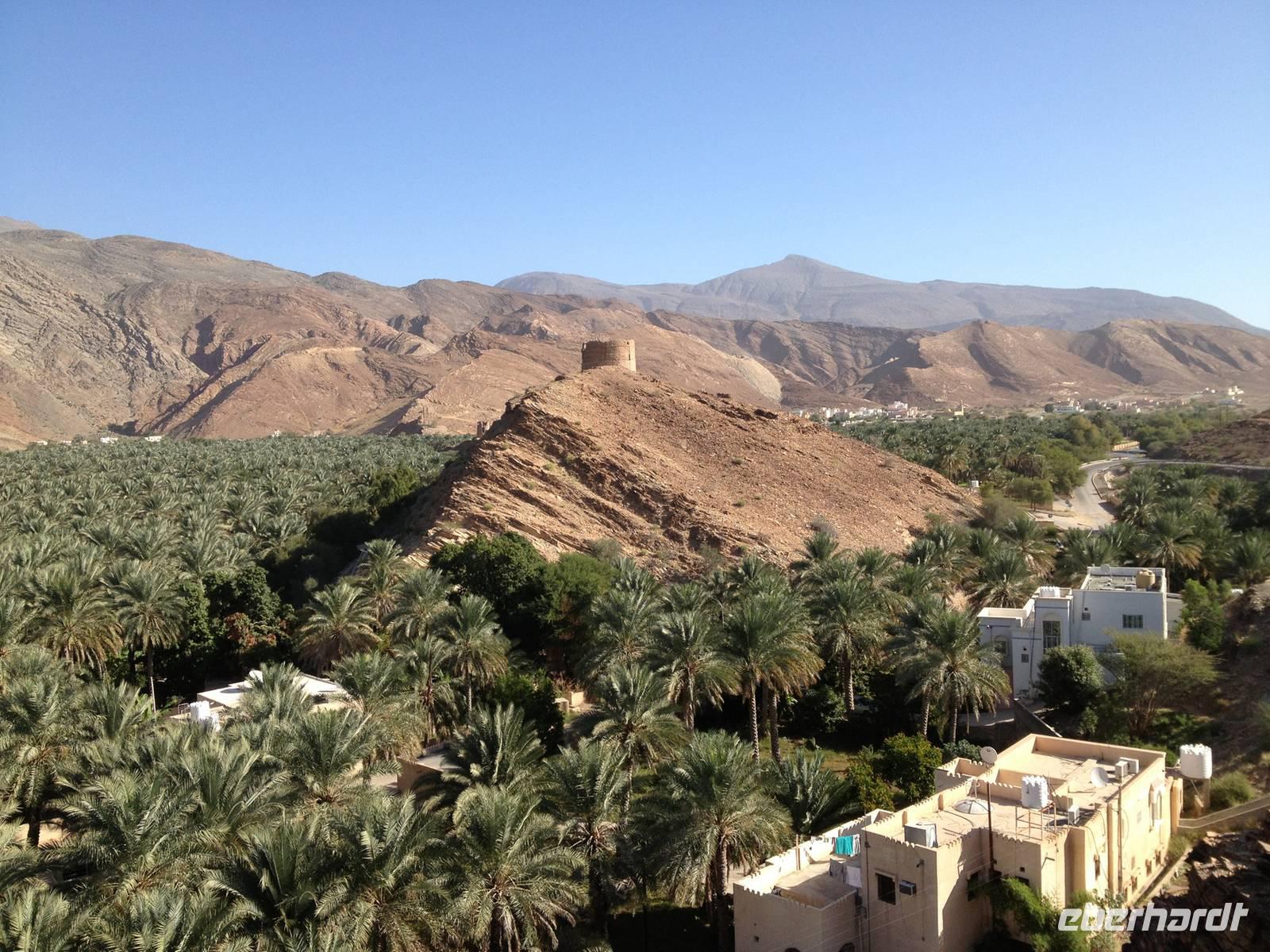 Im Supermarkt kauften wir für unser späteres Picknick ein, bevor wir uns auf den Weg in die Oasenstadt Nakhal machten. Über der wunderschönen Oase aus tausenden Dattelpalmen erhebt sich die malerisch auf einem Felsen gelegene Festung. Sie ist die größte im Sultanat. Die 30 Meter langen Festungsmauern sind 6 Meter hoch und mit 6 Wachtürmen ausgestattet, haben sechs Beobachtungstürme. Aus dem Inneren konnten wir durch die Löcher in den dicken Mauern ein spektakuläres Panorama genießen.