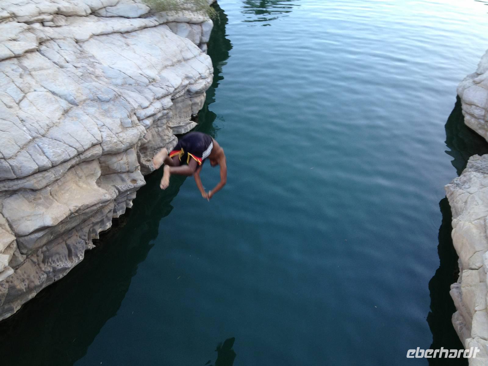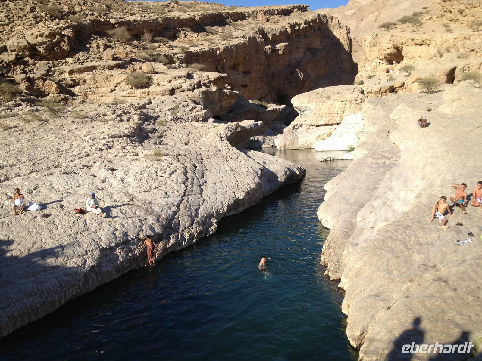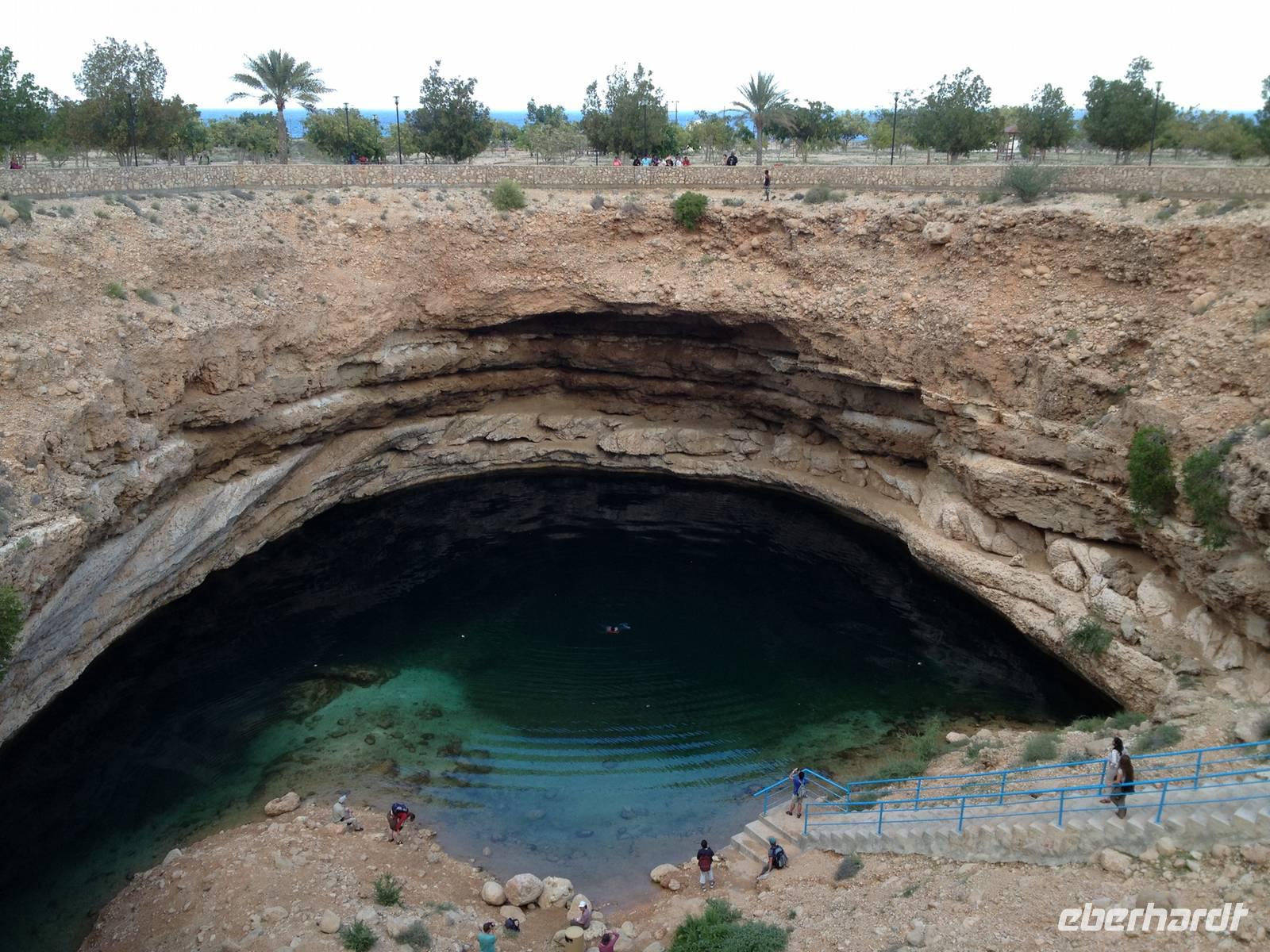 Im herrlichen Wadi Tiwi legten wir unsere Mittagspause ein. Wir ließen und das Lunchpaket umgeben von einmaliger Natur im sattgrünen Wadi schmecken und hatten die Gelegenheit, ein paar Schritte zu gehen. Unser Weg führte uns anschließend immer entlang der Küste Richtung Norden. Die breite Panoramastraße ermöglichte herrliche Ausblicke auf die Bergwelt links von uns und auf das blaue Meer auf der rechten Seite. Auf dem Weg zurück nach Muscat legten wir noch einen Stopp am Bimah Sinkhole ein. Es ist das "Loch" im Nirgendwo, ein spektakulärer Kalksteinkrater mit fantastischem blau-grünem Wasser. Ein Wagemutiger beeindruckte uns mit einem furchtlosen Sprung in die Tiefe.