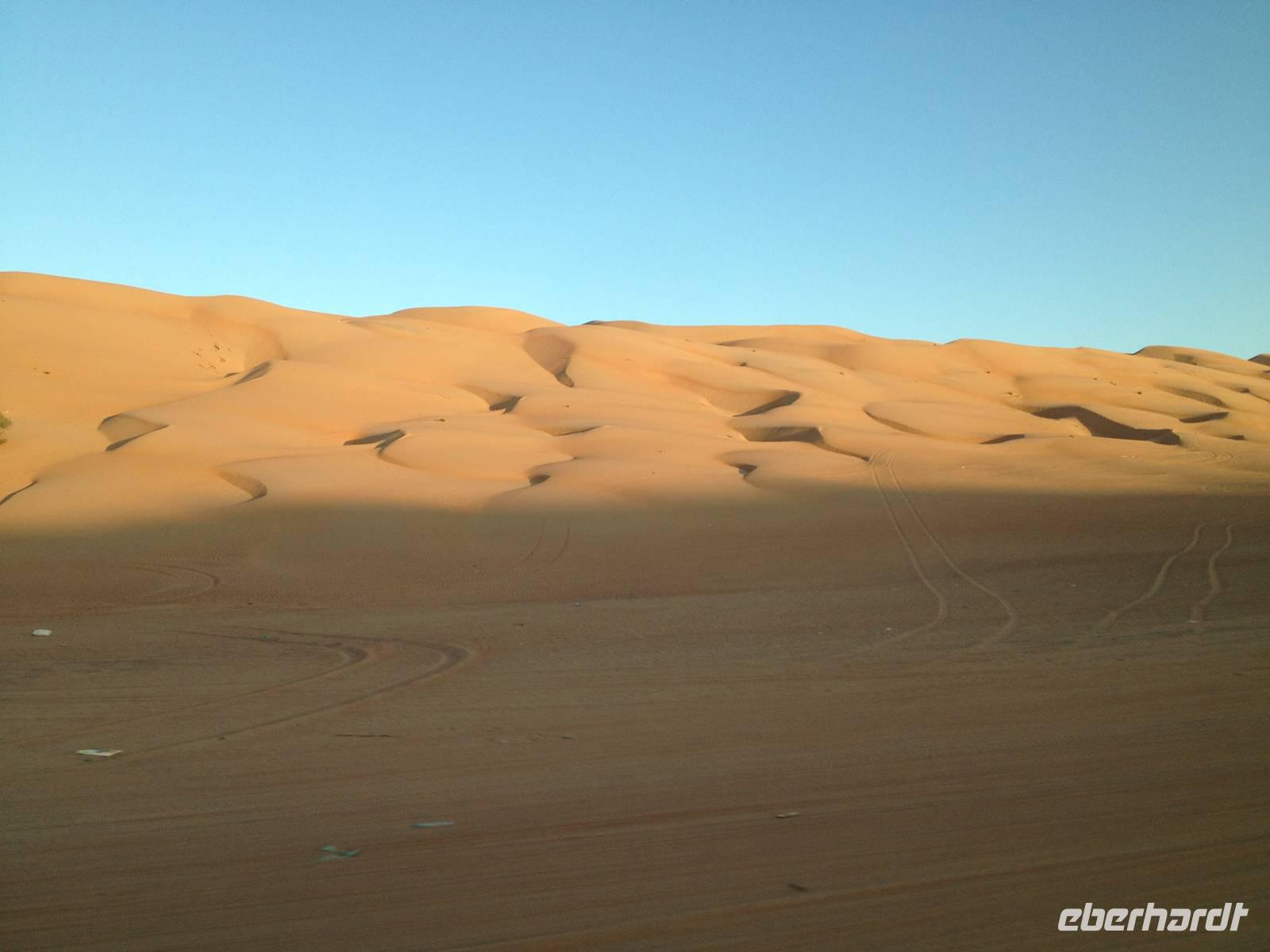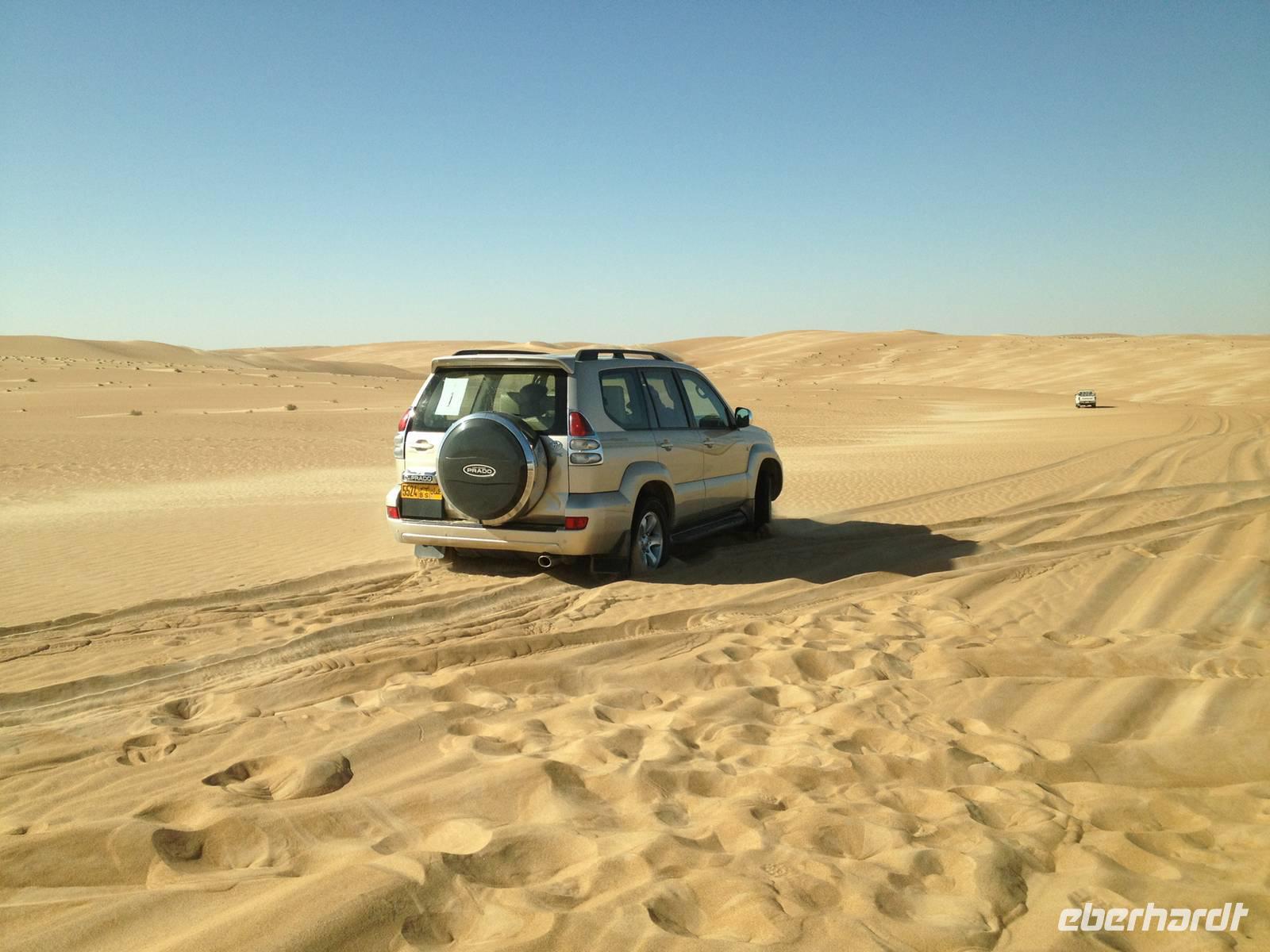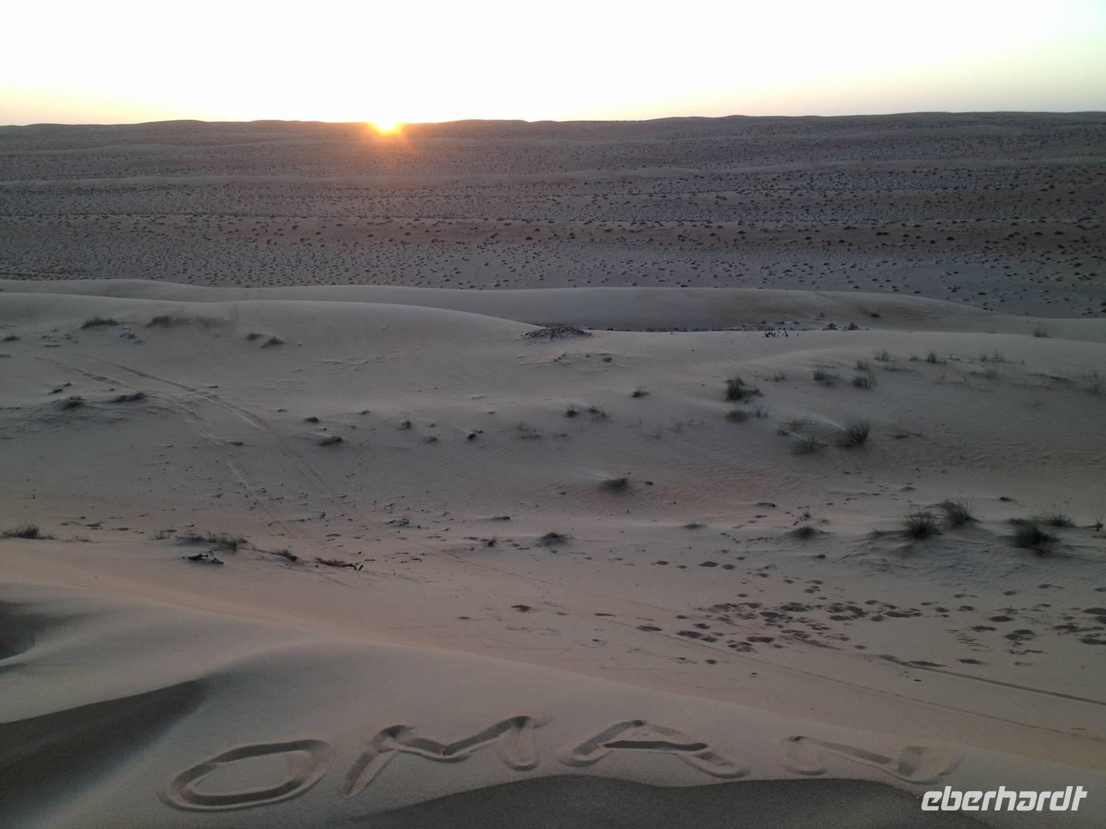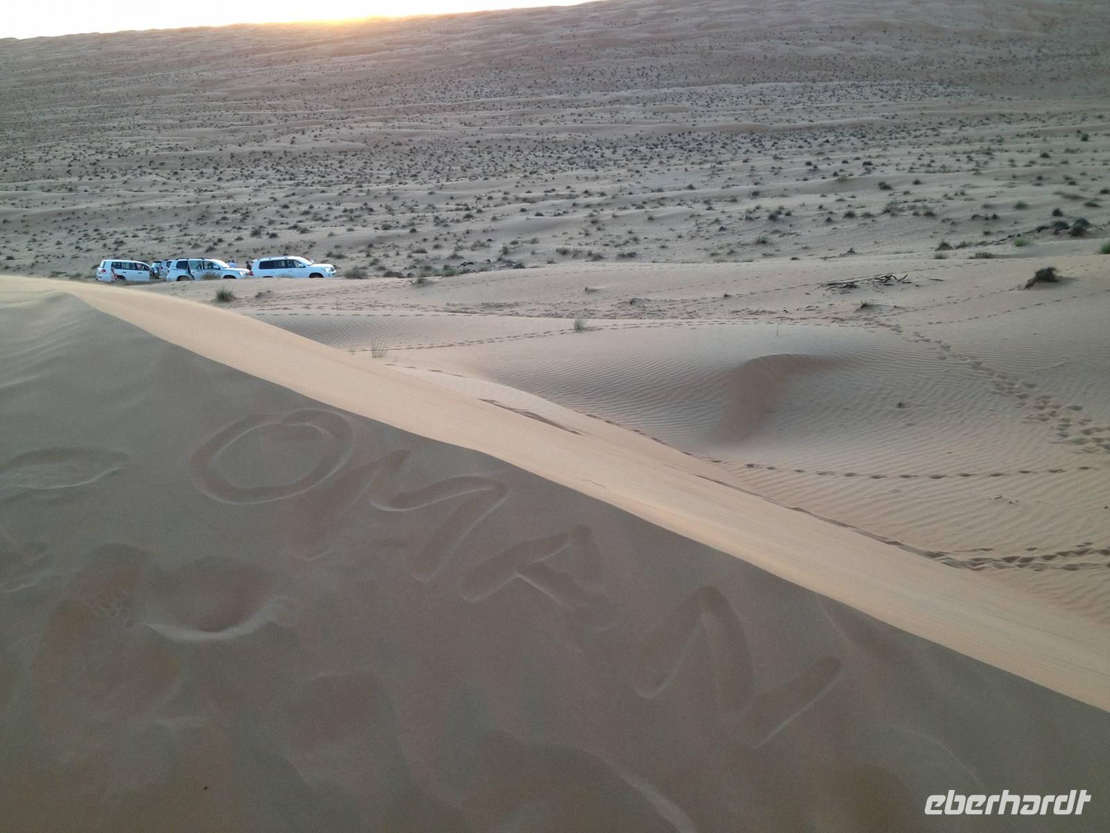 Den Silvestertag verbrachten wir in der riesigen Wahiba Sands Wüste - der Klassiker! Die rasante Fahrt mit den Geländewagen und den besten Fahrern führte uns die sanften Luv- und steilen Leehänge der Sicheldünen auf und ab. Der Jeep schwamm die Hänge förmlich hinab, grub sich fast senkrecht mit der Schnauze im weichen Boden ein und drohte vermeintlich jeden Moment zu kippen. Die flachen Reifen erinnerten irgendwie an die Plattfüße der Dromedare