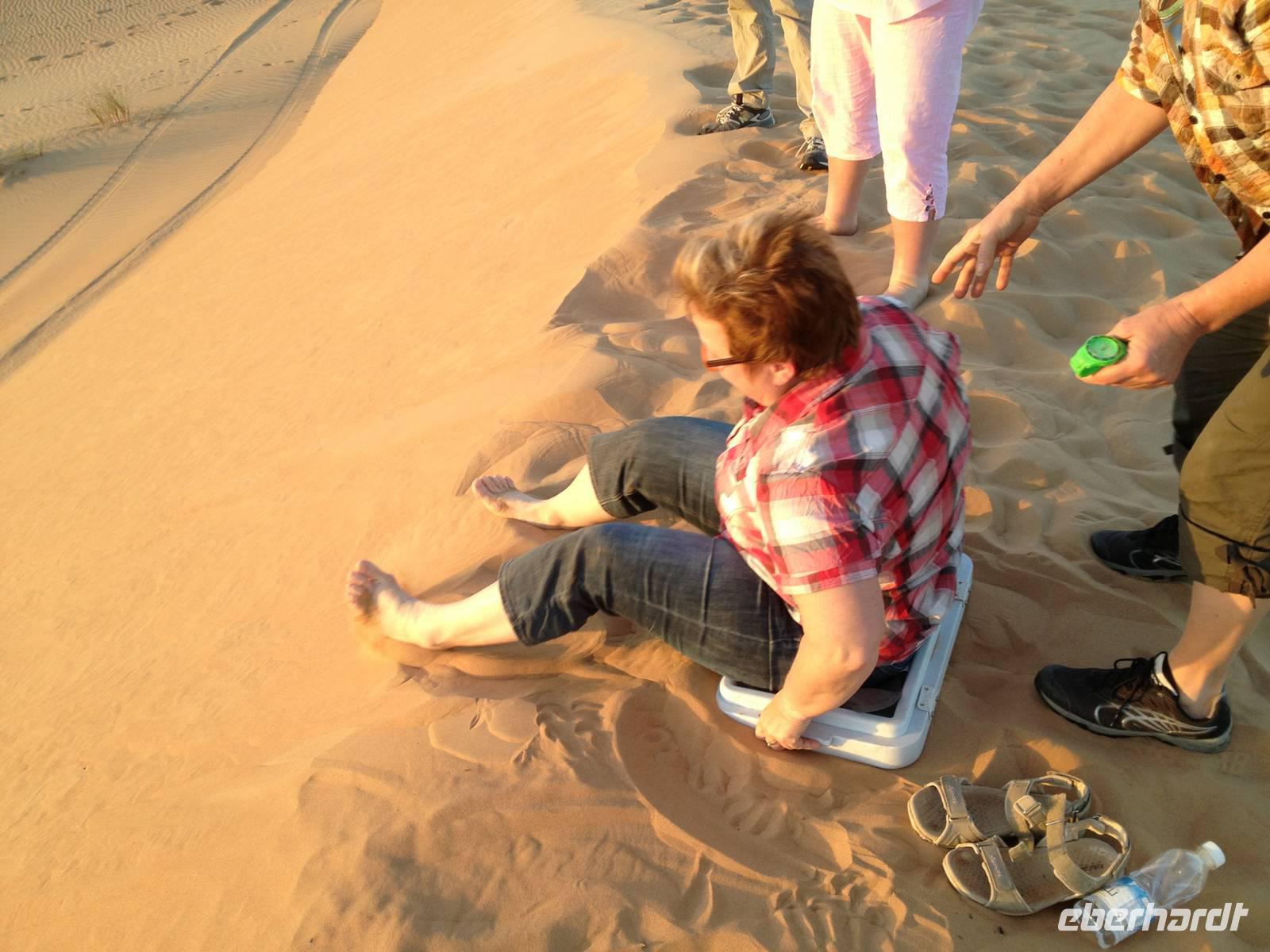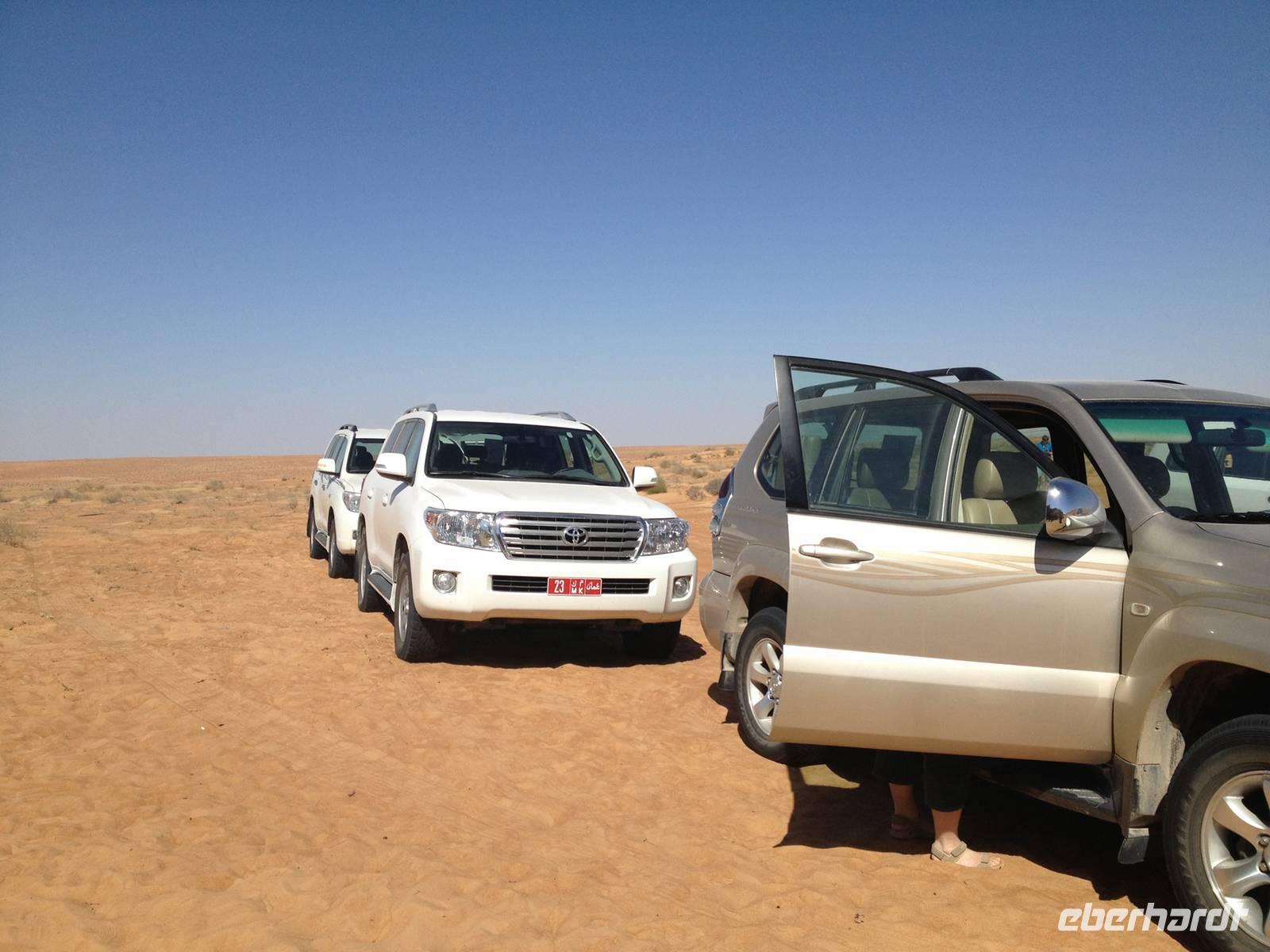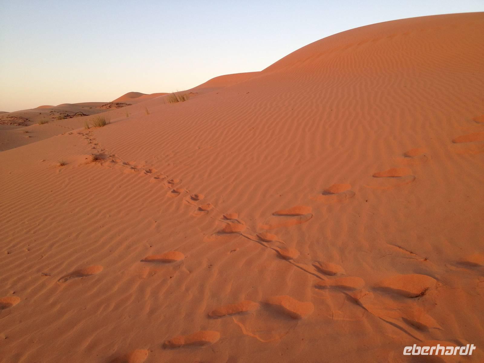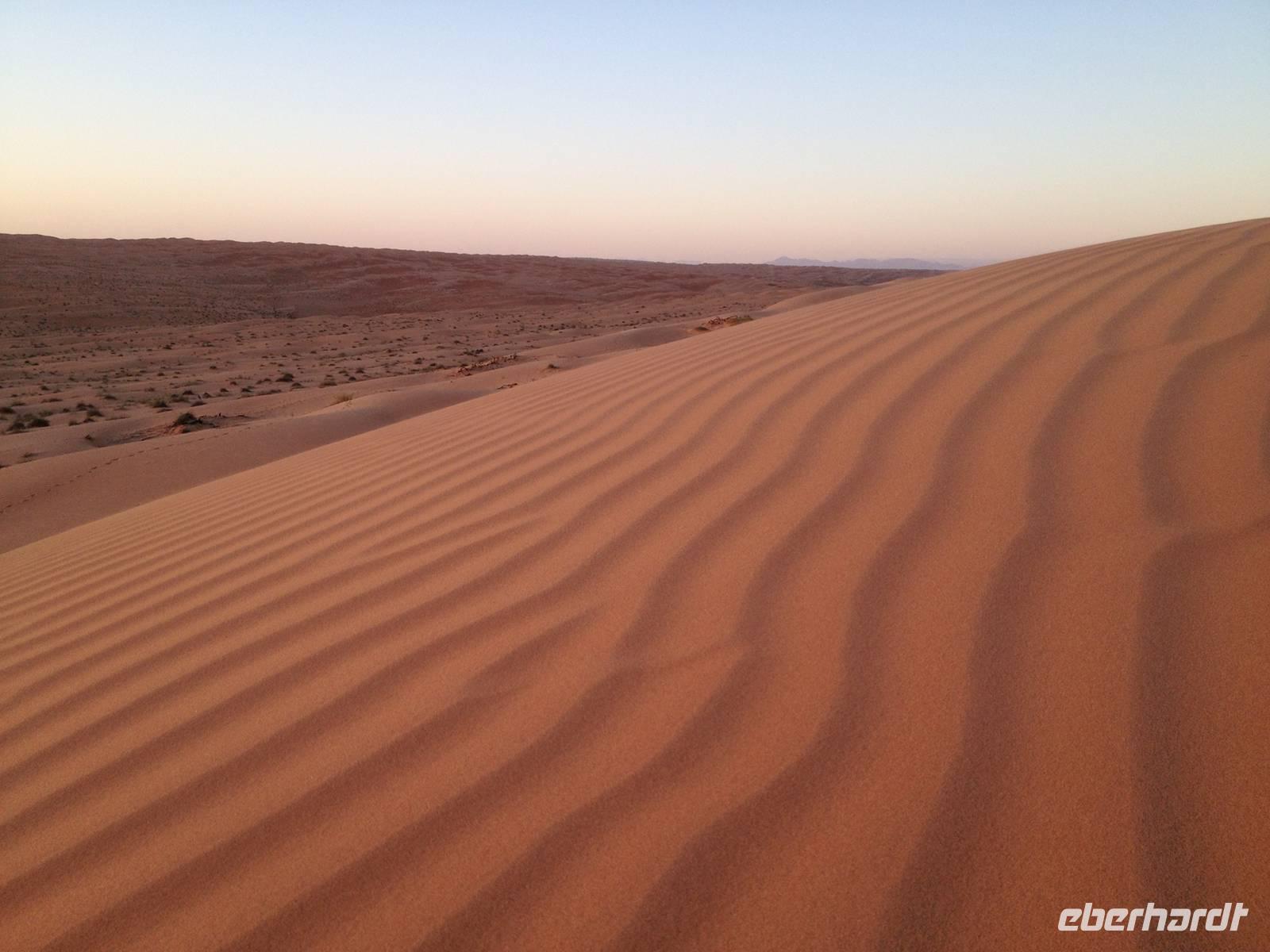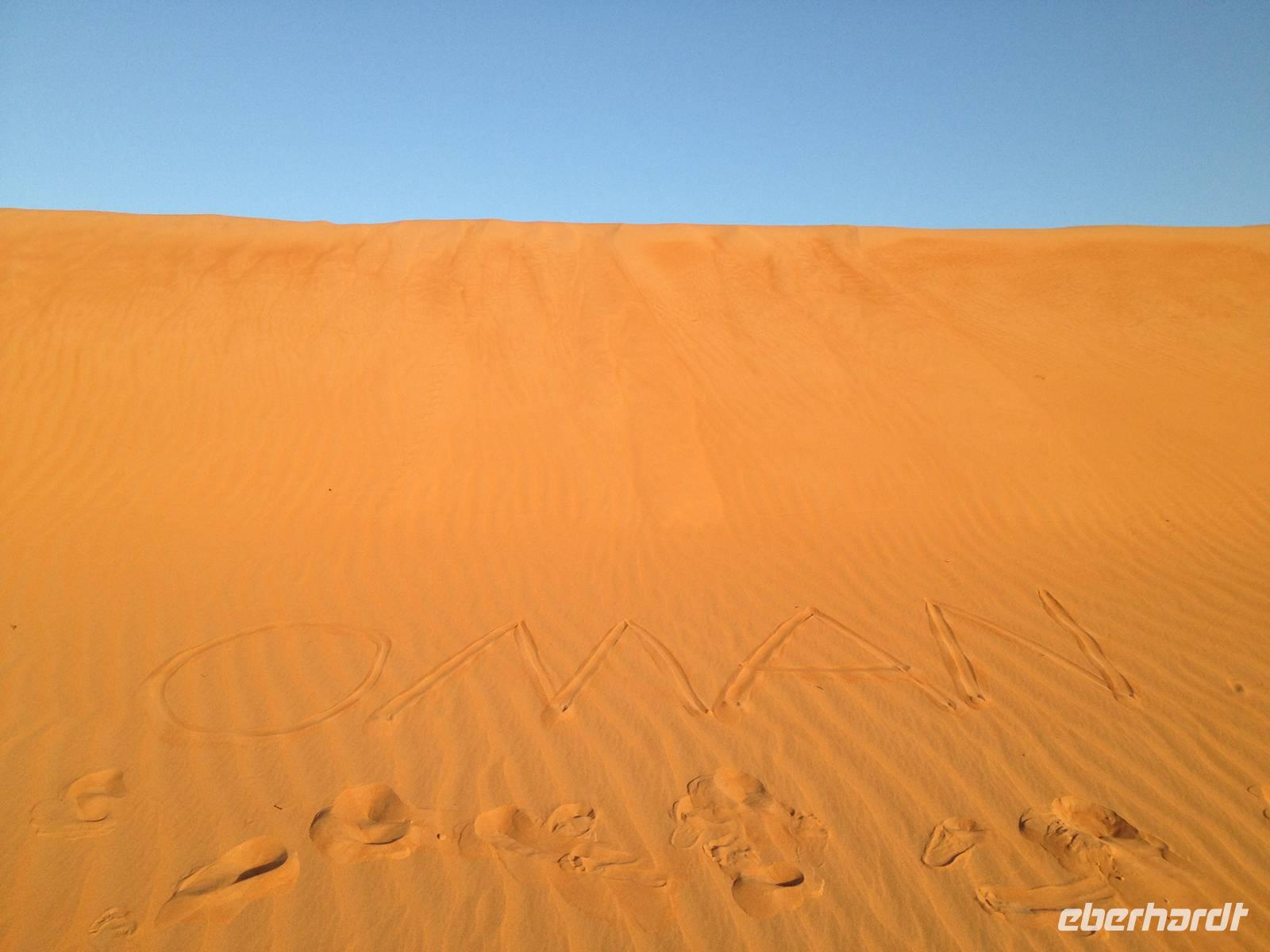 Den Silvestertag verbrachten wir in der riesigen Wahiba Sands Wüste - der Klassiker! Die rasante Fahrt mit den Geländewagen und den besten Fahrern führte uns die sanften Luv- und steilen Leehänge der Sicheldünen auf und ab. Der Jeep schwamm die Hänge förmlich hinab, grub sich fast senkrecht mit der Schnauze im weichen Boden ein und drohte vermeintlich jeden Moment zu kippen. Die flachen Reifen erinnerten irgendwie an die Plattfüße der Dromedare