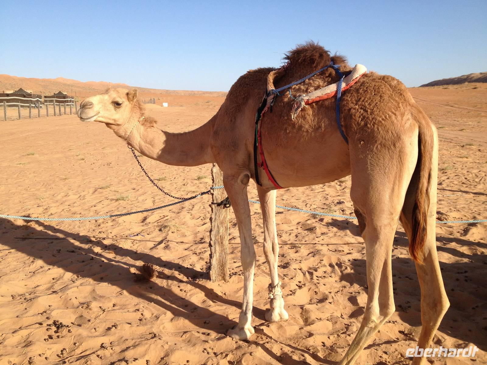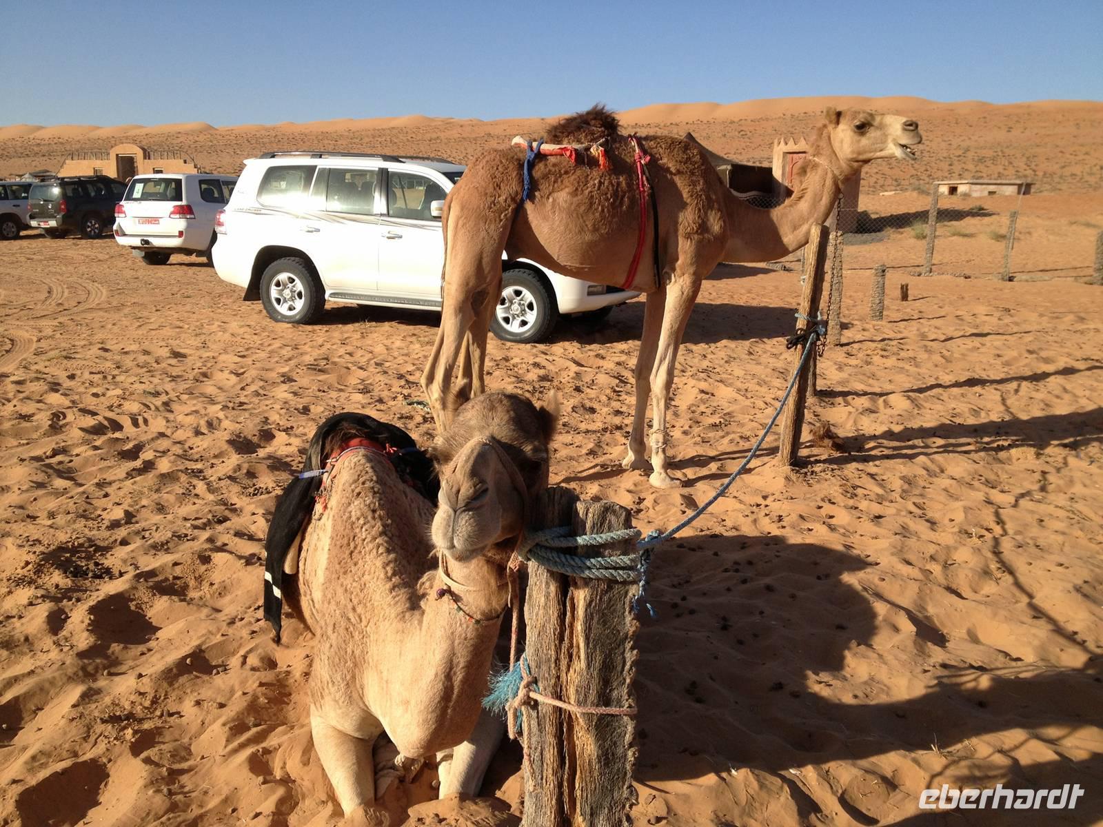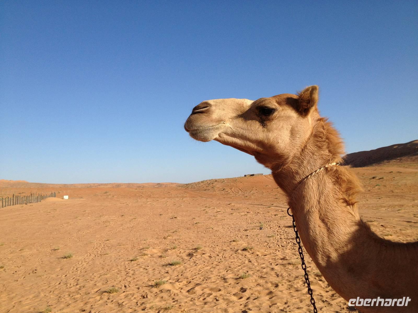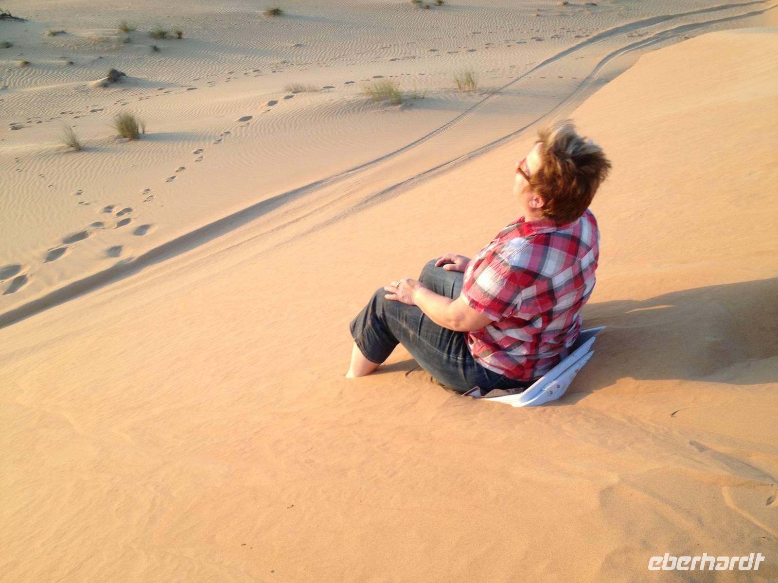 Den Silvestertag verbrachten wir in der riesigen Wahiba Sands Wüste - der Klassiker! Die rasante Fahrt mit den Geländewagen und den besten Fahrern führte uns die sanften Luv- und steilen Leehänge der Sicheldünen auf und ab. Der Jeep schwamm die Hänge förmlich hinab, grub sich fast senkrecht mit der Schnauze im weichen Boden ein und drohte vermeintlich jeden Moment zu kippen. Die flachen Reifen erinnerten irgendwie an die Plattfüße der Dromedare