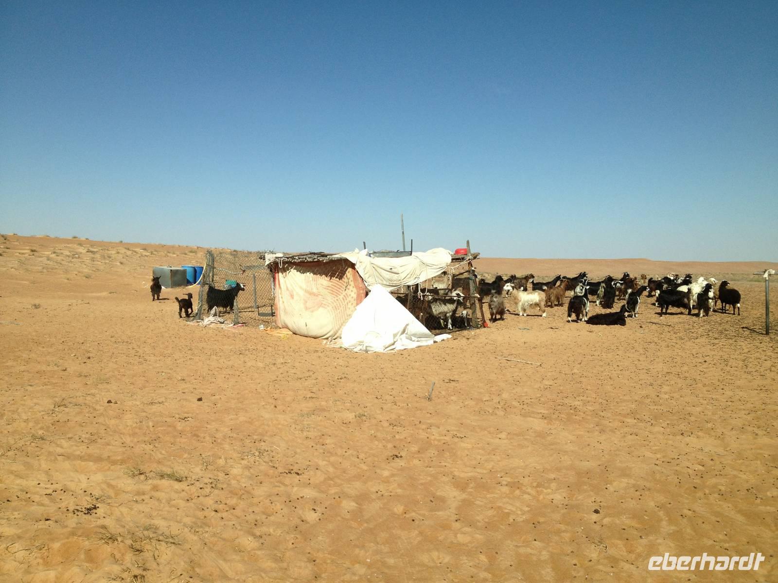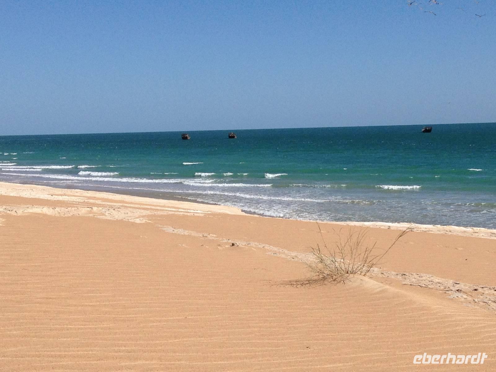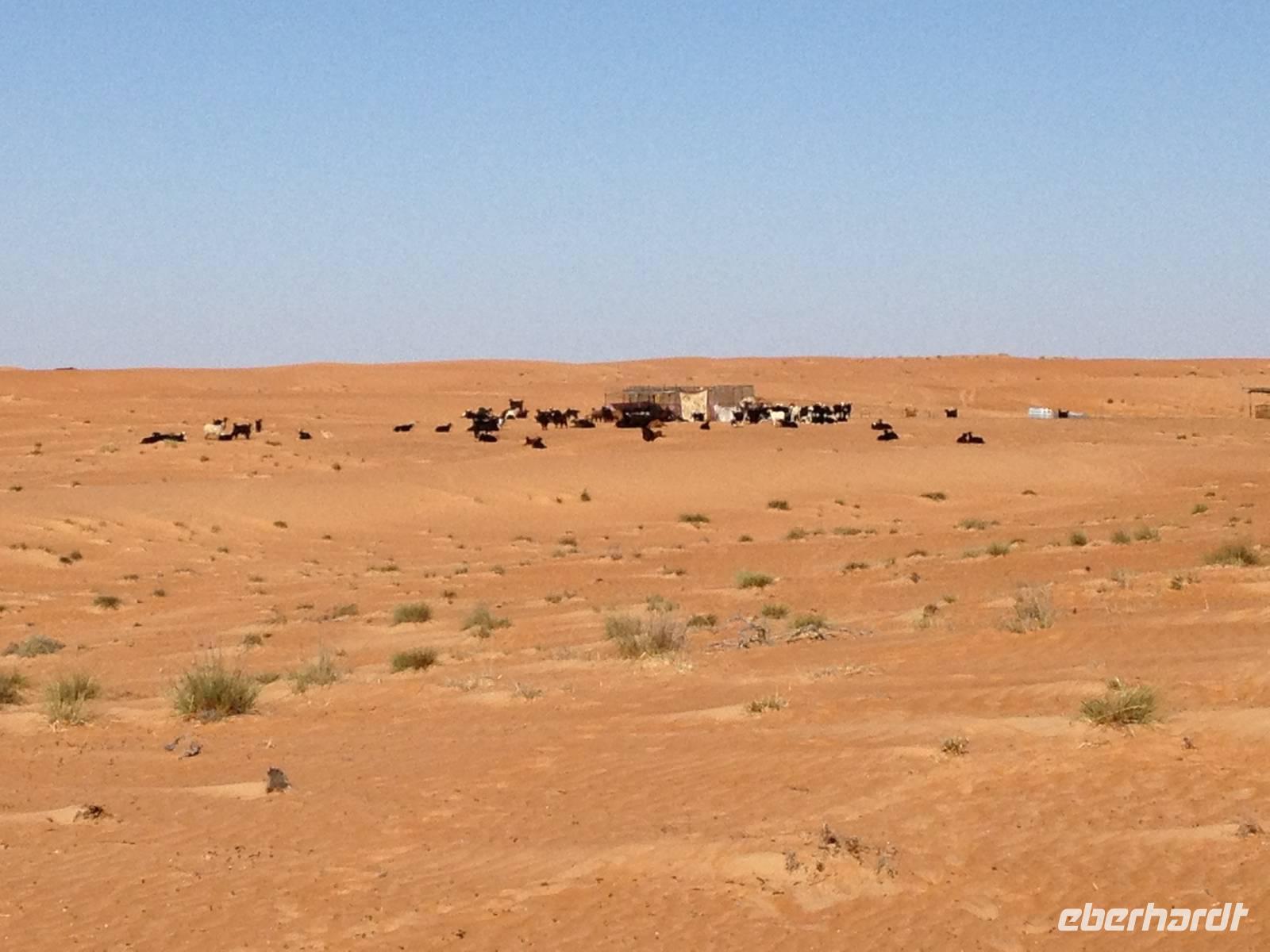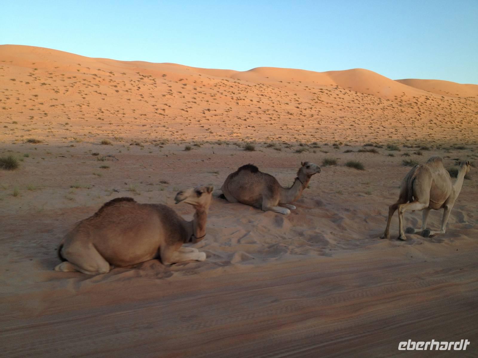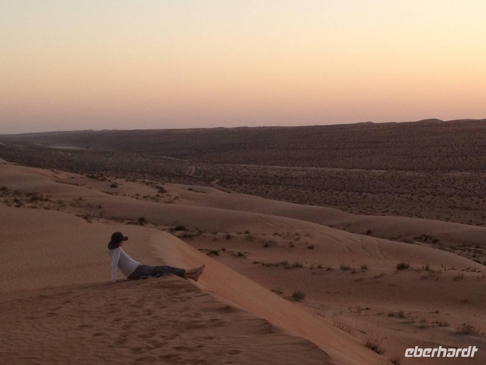 Noch immer ziehen hier die Beduinen mit ihren Kamelen, Ziegen und Palmzweighütten in der endlosen Weite des Sandmeeres umher. Freiheit und Mobilität sind ihnen wichtiger als Hab und Gut. Immer wieder stehen Gestrüpp und Buschwerk zwischen den weit über 100 Metern Sandbergen, die im Osten des Landes das Hajar-Gebirge vom Arabischen Meer trennen. Die Lage zwischen Gebirge und Meer prägt auch die Unterschiede der Sandfarben. Während die feinen Felspartikel die Dünen im Norden rötlich-gelb schimmern lassen, strahlen sie an der Küste in hellen Weißtönen. Unser Ziel war Ras al Ruwais an der Küste des Arabischen Meeres, wo wir unser Mittagspicknick einlegten und uns in die angenehm warmen Fluten stürzten. Hier waren wir am Strand ganz für uns allein und genossen die Sonne und das Meer. Und das am 31. Dezember! Schöner kann man den letzten Tag des Jahres nicht verbringen!