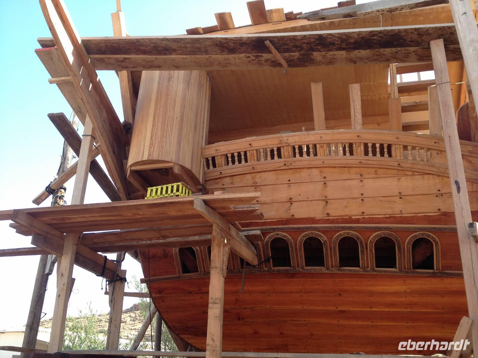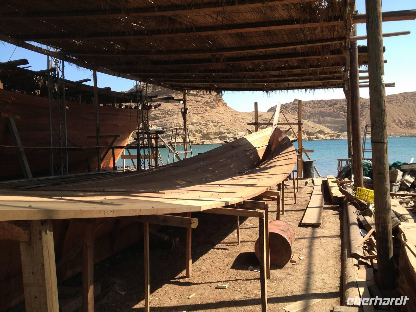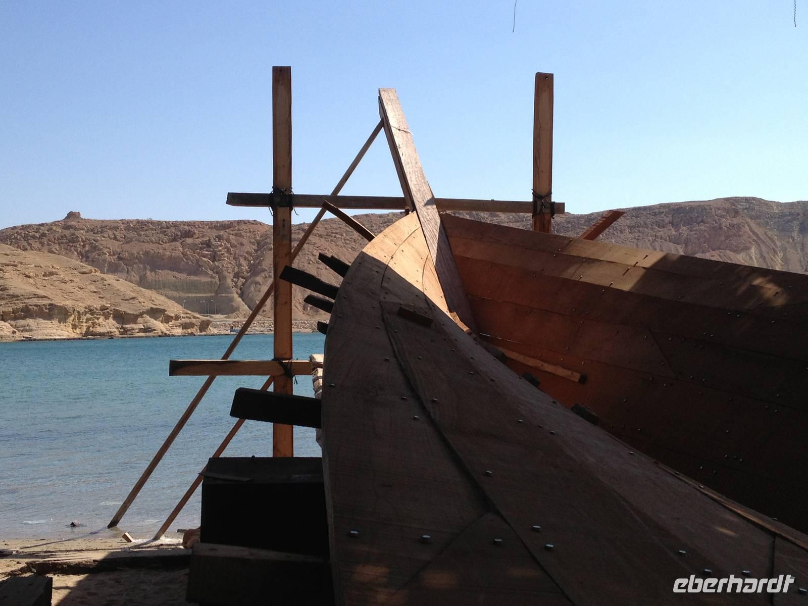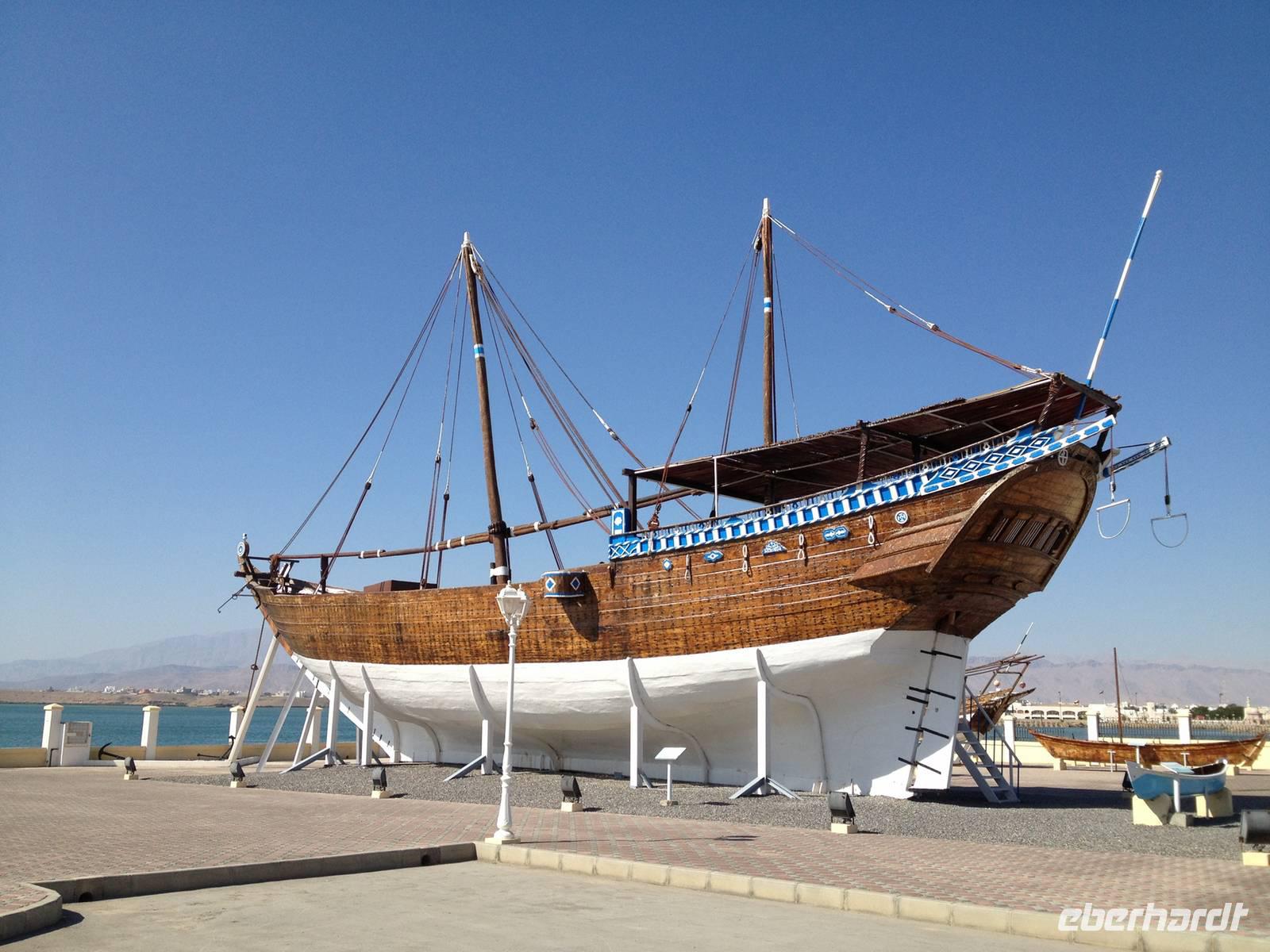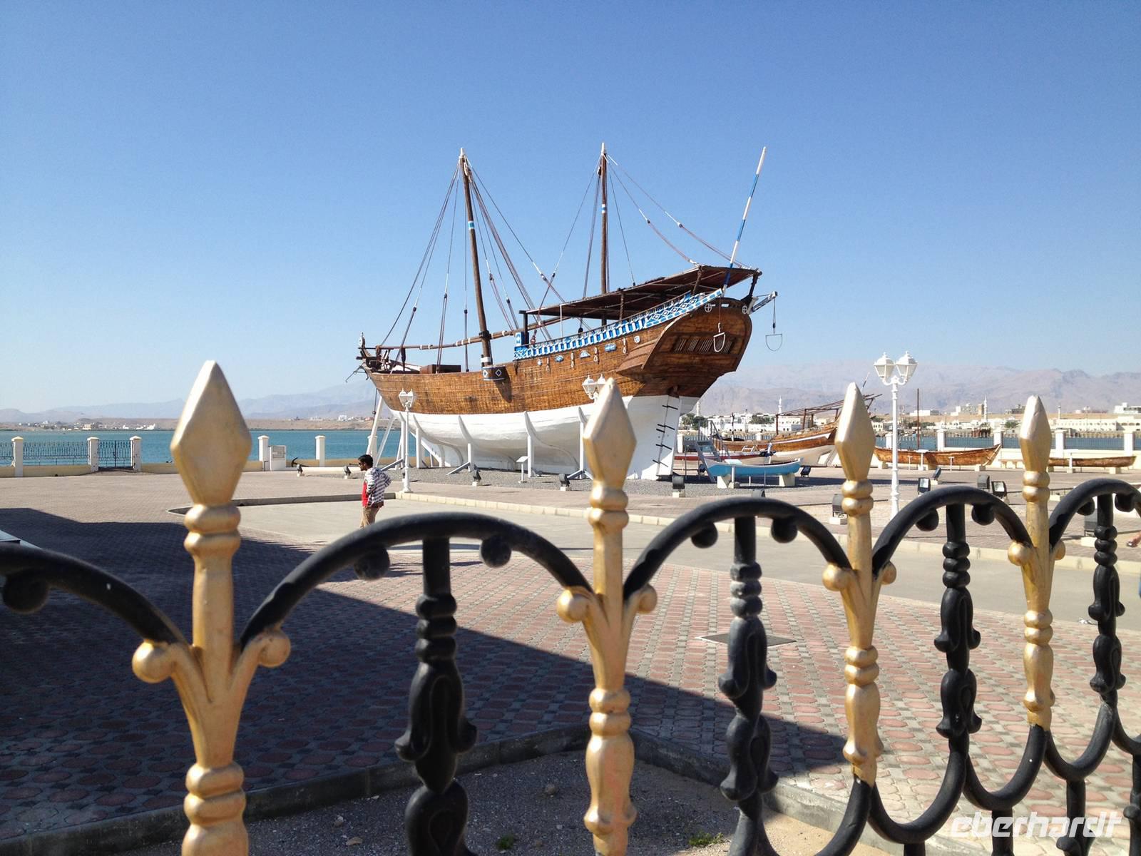 Nach dem Frühstück im Camp machten wir uns auf dem Weg an die Küste. Noch immer erinnerte uns der Sand in den Socken, Taschen und Schuhen an das Erlebnis Wüste. Unser erstes Ziel am heutigen Neujahrstag war die Hafenstadt Sur. Sur war das Tor nach Sansibar und Indien, Umschlagplatz für Gewürze, Elfenbein, Gold und Seide. Doch nach dem Ende des Sklavenhandels und der Eröffnung des Suezkanals verlor die Stadt immer mehr an Bedeutung. Geblieben ist jedoch das Erbe des traditionellen Schiffsbaus. Einst wurden hier in reiner Handarbeit die größten Dhaus auf Kiel gelegt. Daran erinnert die vor fast 100 Jahren in Sur gebaute und 20 Meter lange "Fatah al Khair", eine elegante Dhau, die nun im Maritime Museum aufgebockt ist. In einer traditionellen Werft erhielten wir schöne Einblicke in die Arbeit des Dhau-Schiffsbaus und konnten uns im Museum umschauen.