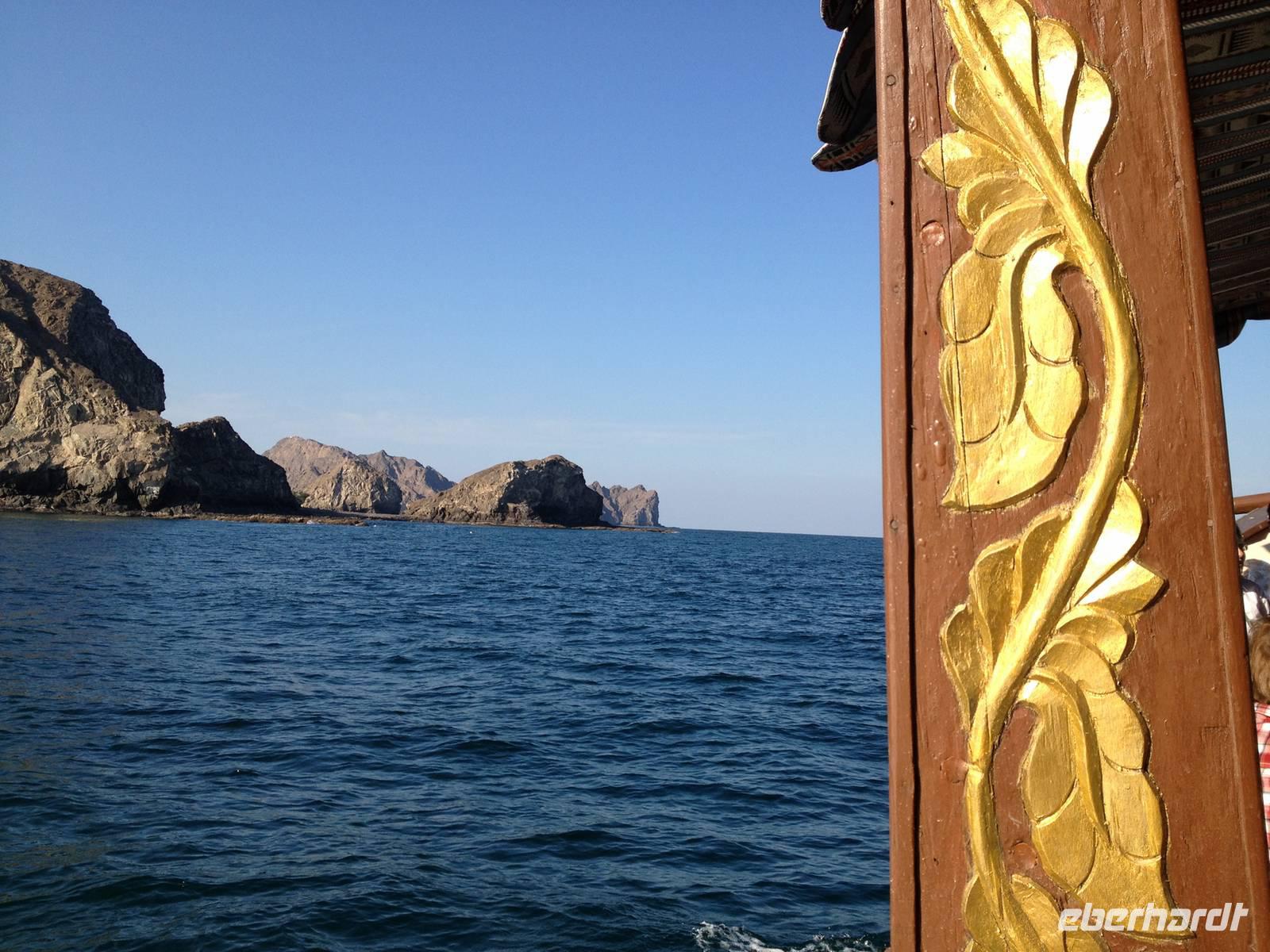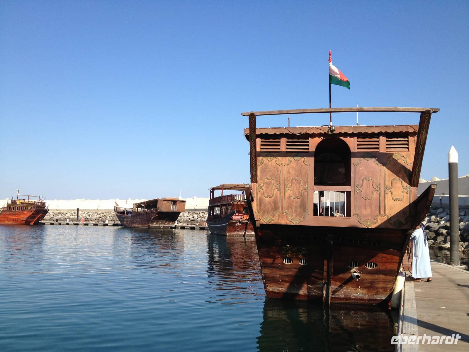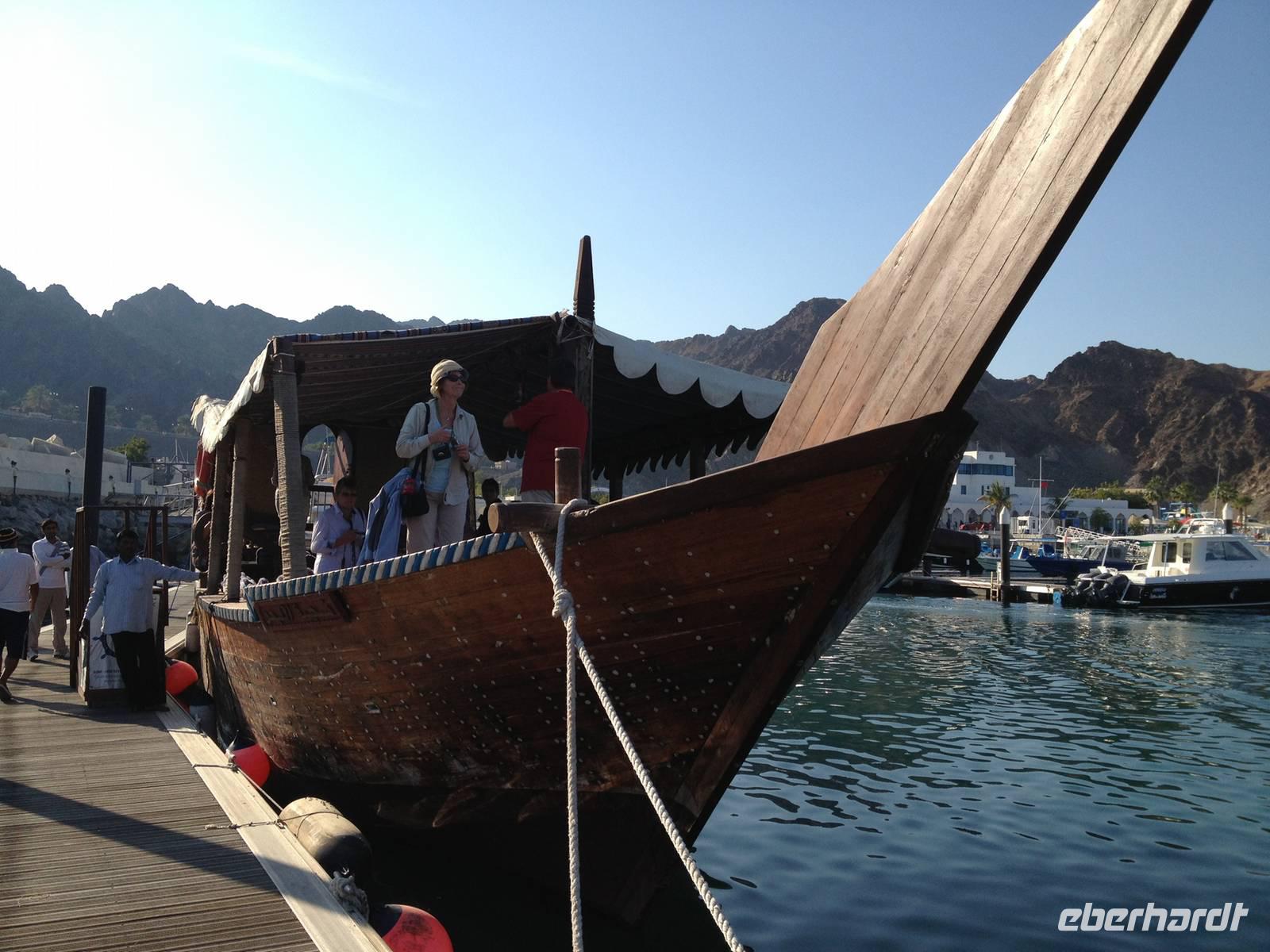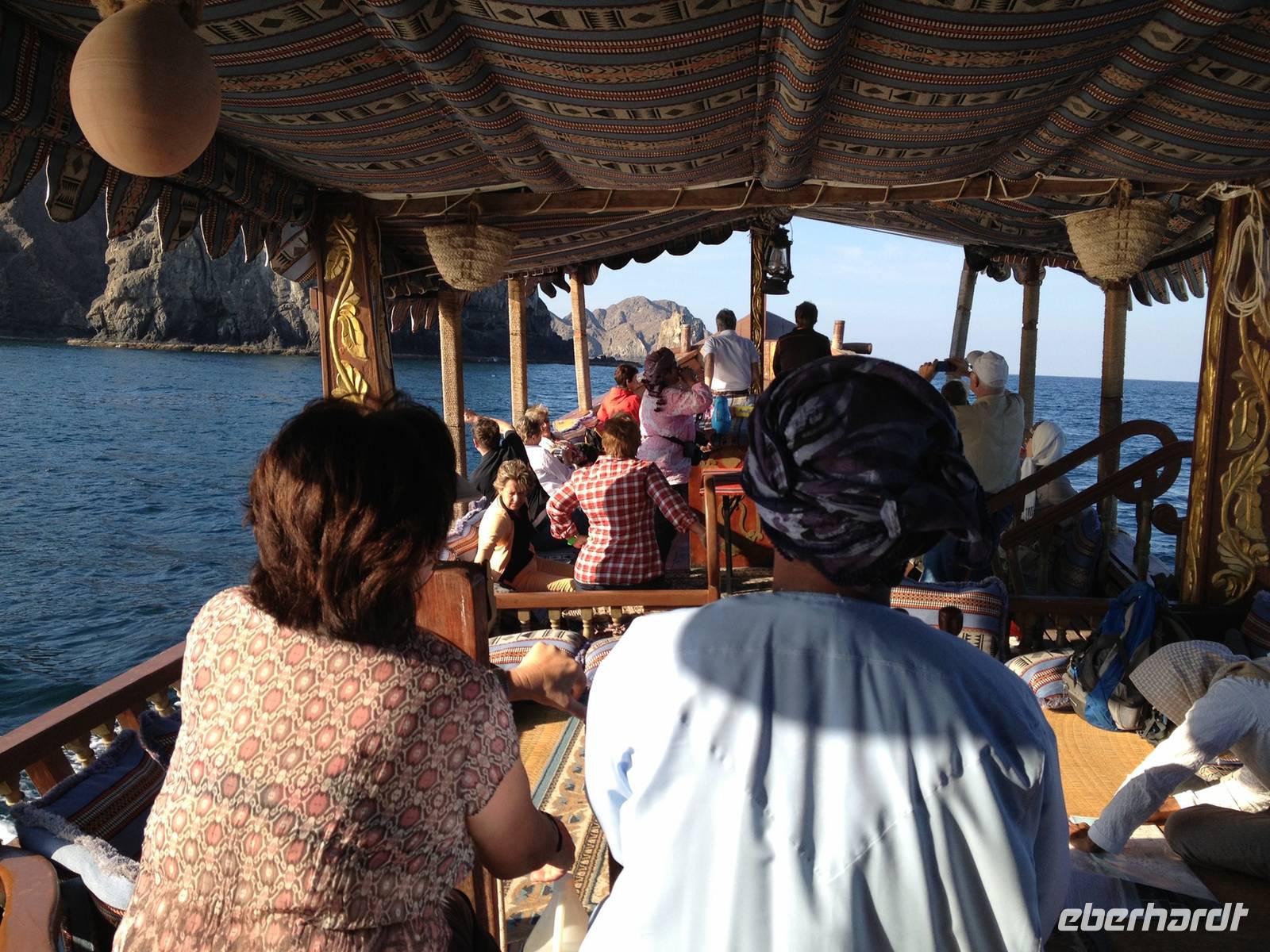 Nach diesen wahnsinnig tollen Eindrücken wurden wir mit einem sehr guten Mittagsbuffet im Restaurant "Kargeen" verwöhnt. Gestärkt mit bester arabischer Küche erreichten wir die kleine Marina von Muscat. Hier wurden wir schon von unserem Kapitän freudig erwartet. Auf einer traditionellen Dhau schipperten wir entlang der felsigen Küste und genossen die Sonne an Deck. Monika übernahm das Steuer und segelte mit uns im Golf von Oman, dessen maritimes Bild noch heute von zahlreichen Dhau-Schiffen geprägt ist.