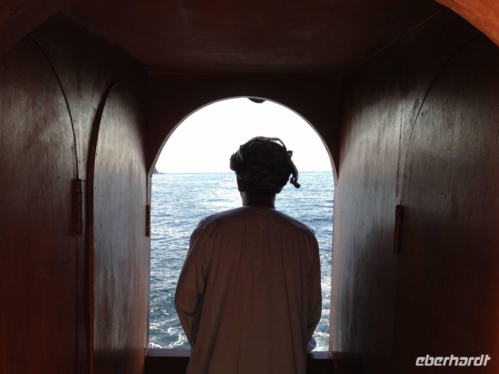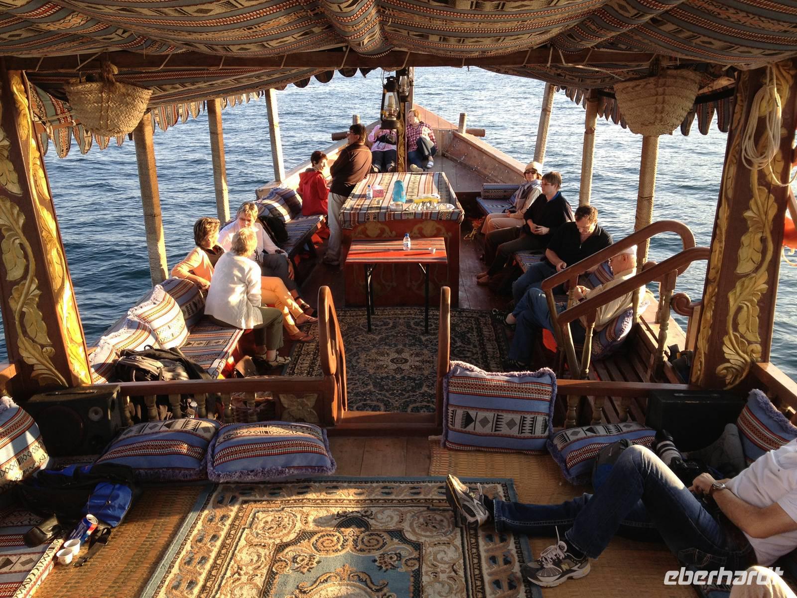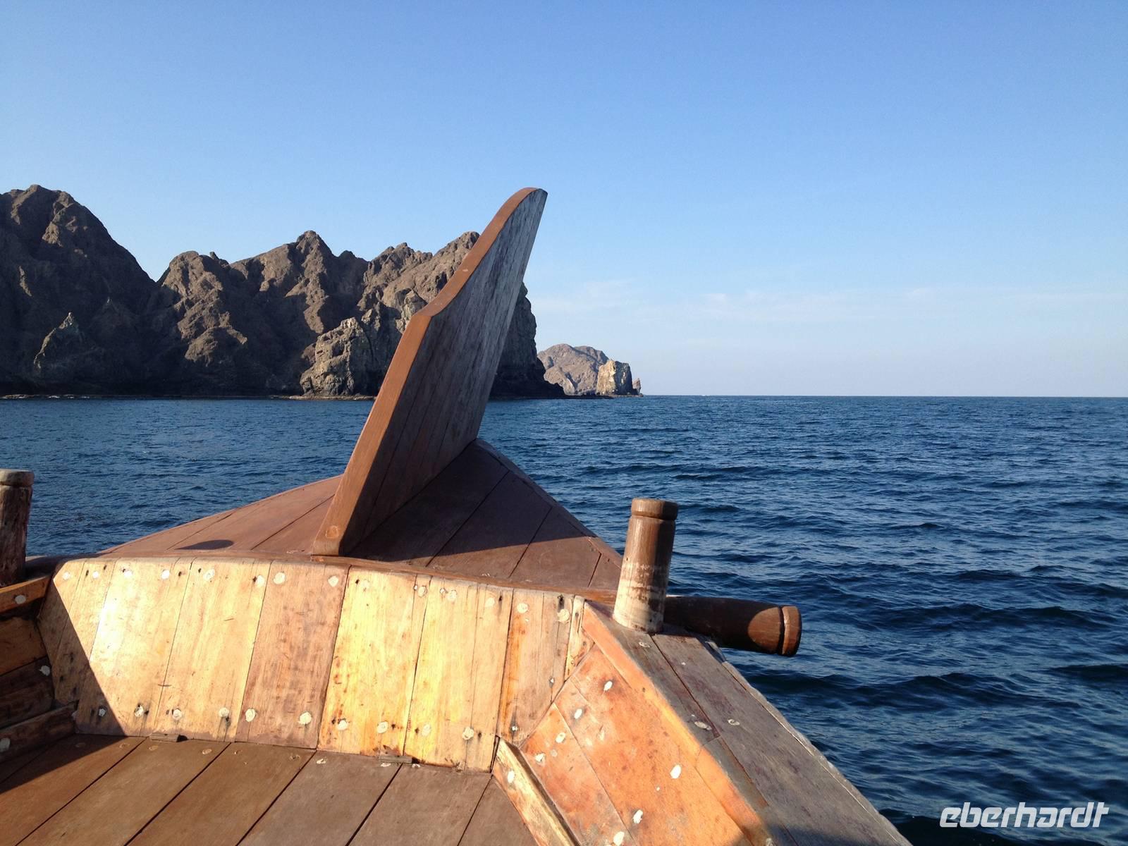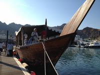 Nach diesen wahnsinnig tollen Eindrücken wurden wir mit einem sehr guten Mittagsbuffet im Restaurant "Kargeen" verwöhnt. Gestärkt mit bester arabischer Küche erreichten wir die kleine Marina von Muscat. Hier wurden wir schon von unserem Kapitän freudig erwartet. Auf einer traditionellen Dhau schipperten wir entlang der felsigen Küste und genossen die Sonne an Deck. Monika übernahm das Steuer und segelte mit uns im Golf von Oman, dessen maritimes Bild noch heute von zahlreichen Dhau-Schiffen geprägt ist.