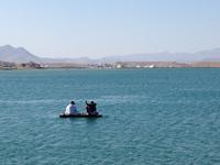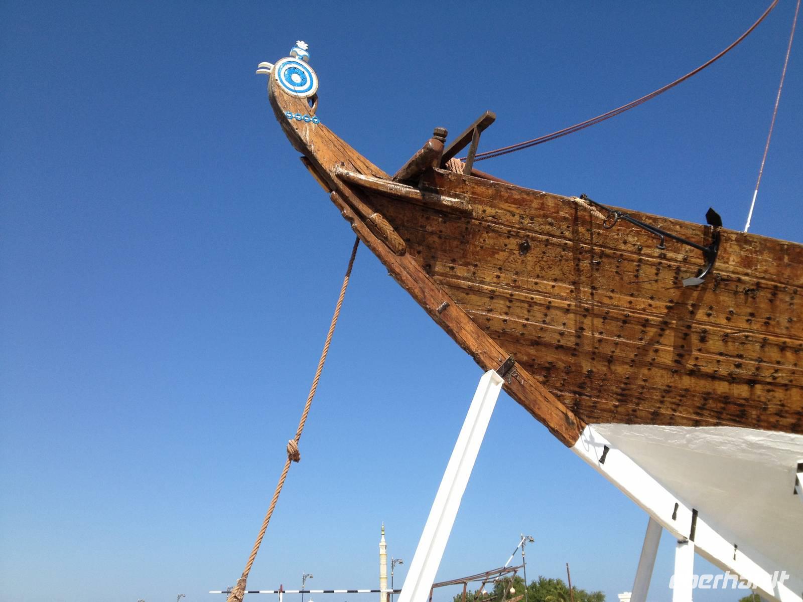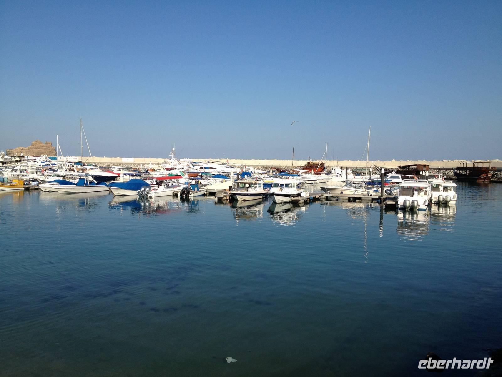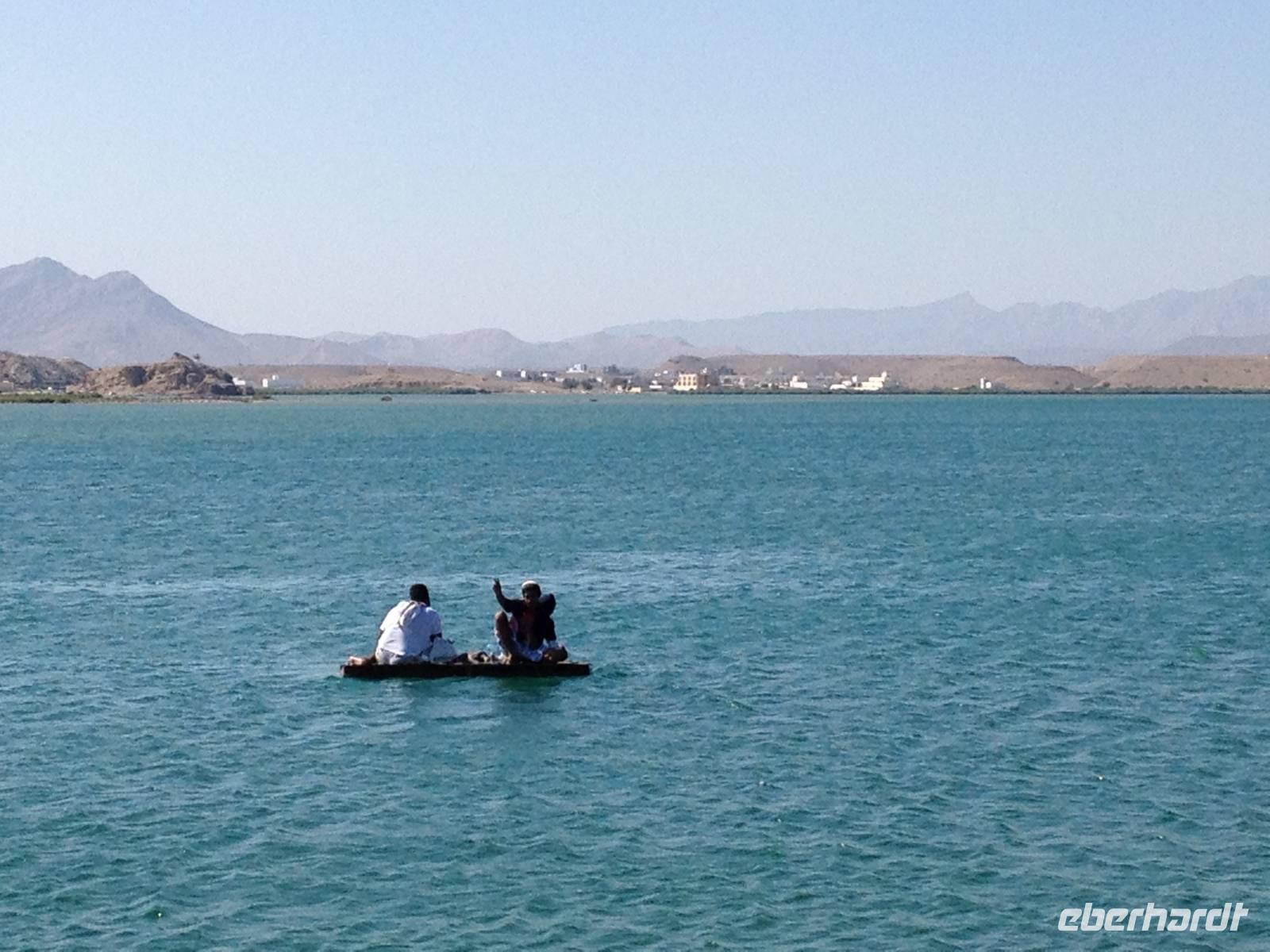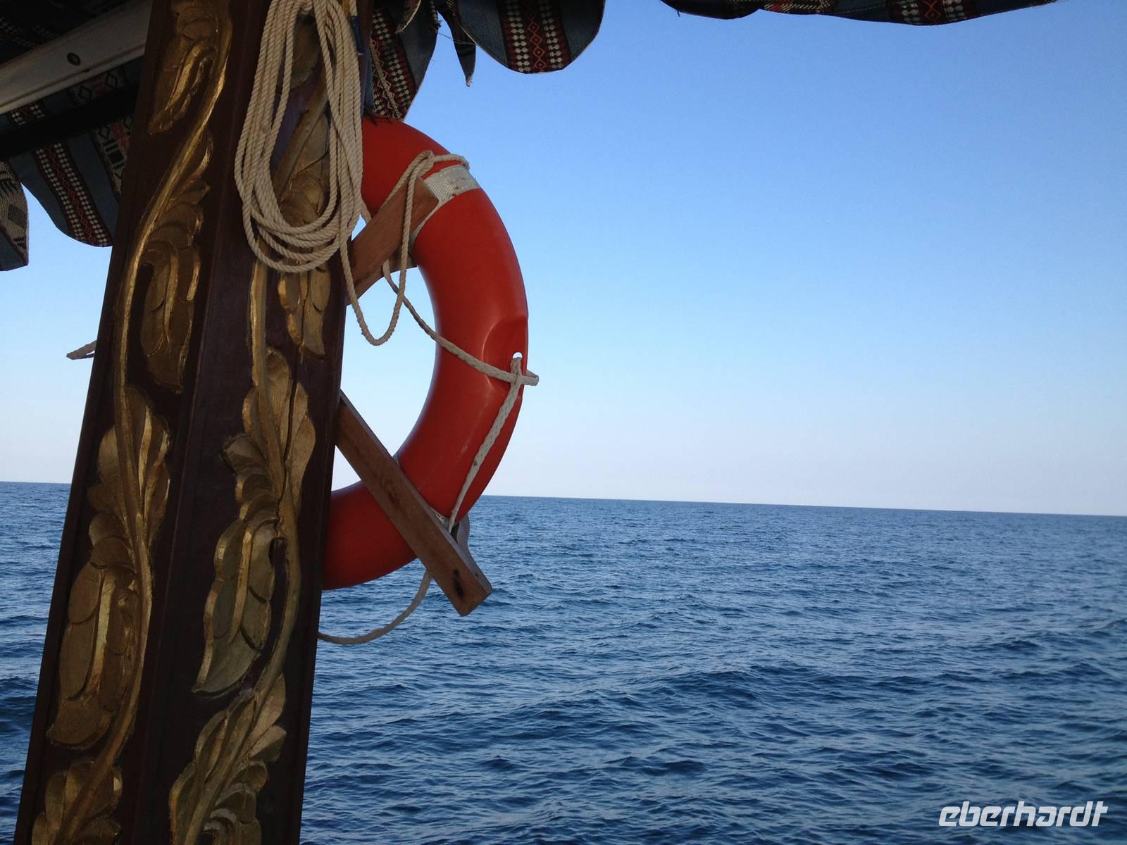 Nach diesen wahnsinnig tollen Eindrücken wurden wir mit einem sehr guten Mittagsbuffet im Restaurant "Kargeen" verwöhnt. Gestärkt mit bester arabischer Küche erreichten wir die kleine Marina von Muscat. Hier wurden wir schon von unserem Kapitän freudig erwartet. Auf einer traditionellen Dhau schipperten wir entlang der felsigen Küste und genossen die Sonne an Deck. Monika übernahm das Steuer und segelte mit uns im Golf von Oman, dessen maritimes Bild noch heute von zahlreichen Dhau-Schiffen geprägt ist.