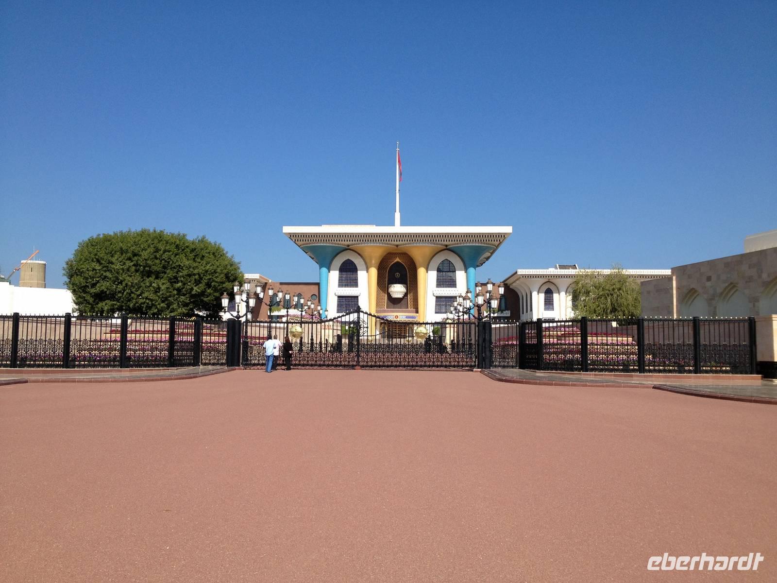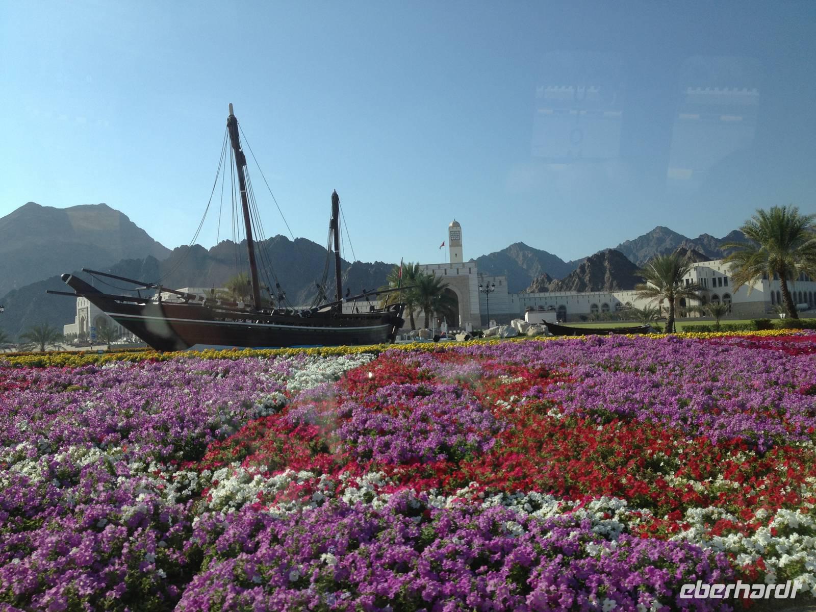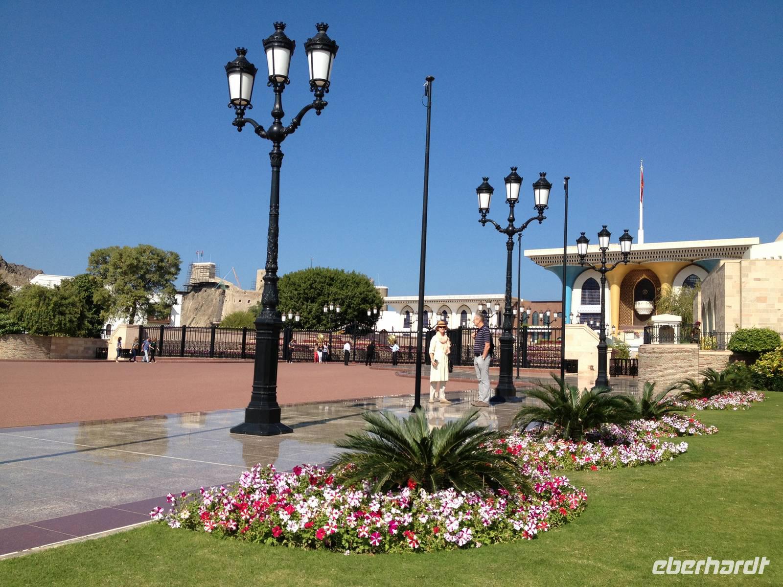 Weitaus verschlafener wirkt Alt-Muscat, das an einer hufeisenförmigen Bucht liegt. Bilderbuchmäßig kleben die beiden Festungen aus dem 16. Jahrhundert an den gezackten Felsen und beherbergen die königliche Garde des Sultans sowie dessen Privatmuseum. Der alte Baubestand wurde weitgehend abgerissen. Zwei Drittel allein für den Sultan Qaboos' Al-Alam-Palast, das in Blau und Gold schimmernde Regierungsgebäude mit wunderschönen Blumenbeeten. Natürlich war dies ein weiterer Anlass für ein Gruppenfoto.