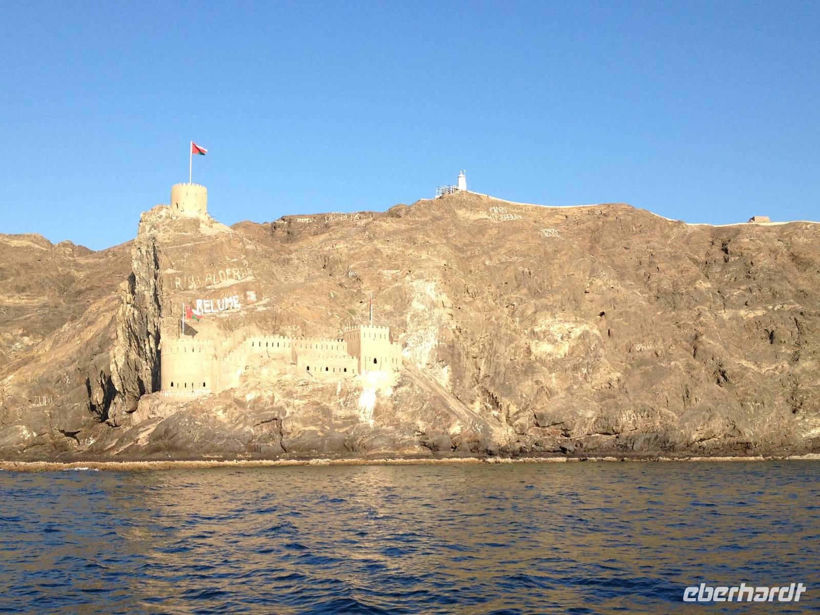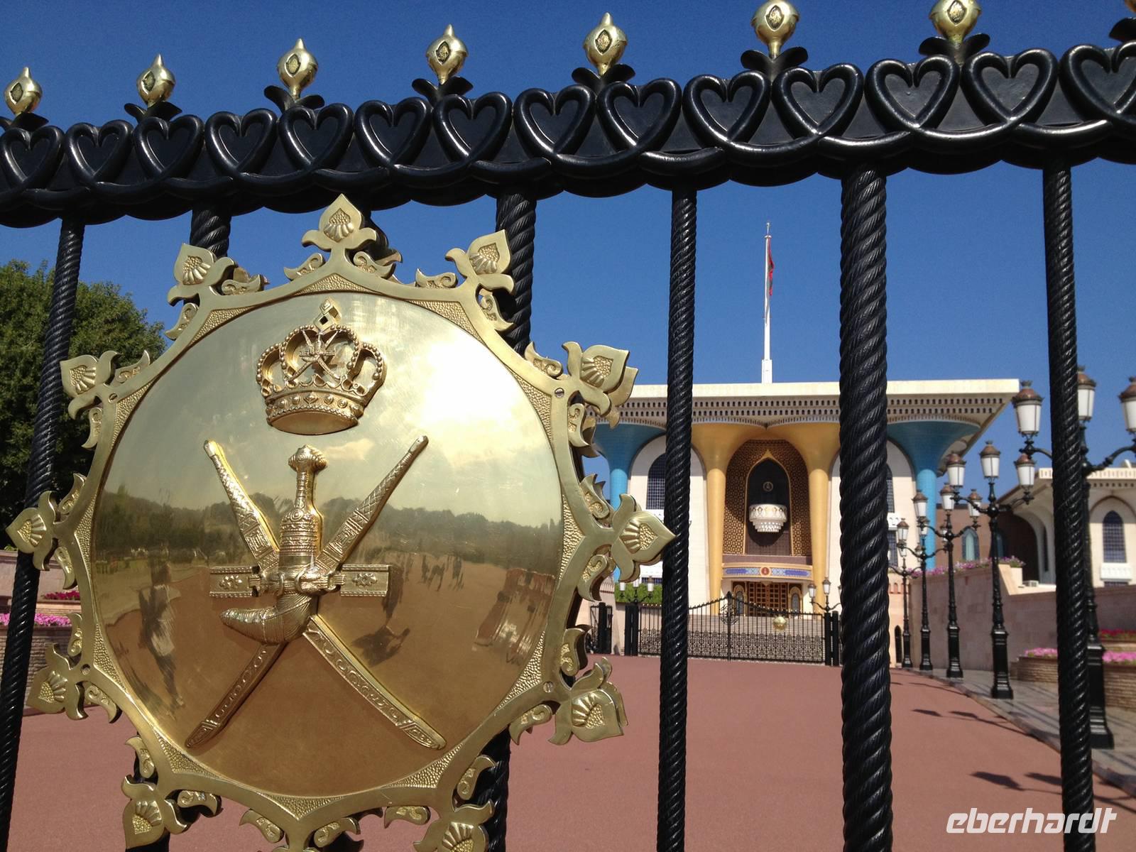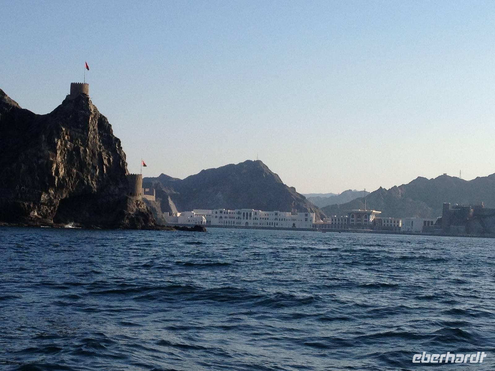 Weitaus verschlafener wirkt Alt-Muscat, das an einer hufeisenförmigen Bucht liegt. Bilderbuchmäßig kleben die beiden Festungen aus dem 16. Jahrhundert an den gezackten Felsen und beherbergen die königliche Garde des Sultans sowie dessen Privatmuseum. Der alte Baubestand wurde weitgehend abgerissen. Zwei Drittel allein für den Sultan Qaboos' Al-Alam-Palast, das in Blau und Gold schimmernde Regierungsgebäude mit wunderschönen Blumenbeeten. Natürlich war dies ein weiterer Anlass für ein Gruppenfoto.