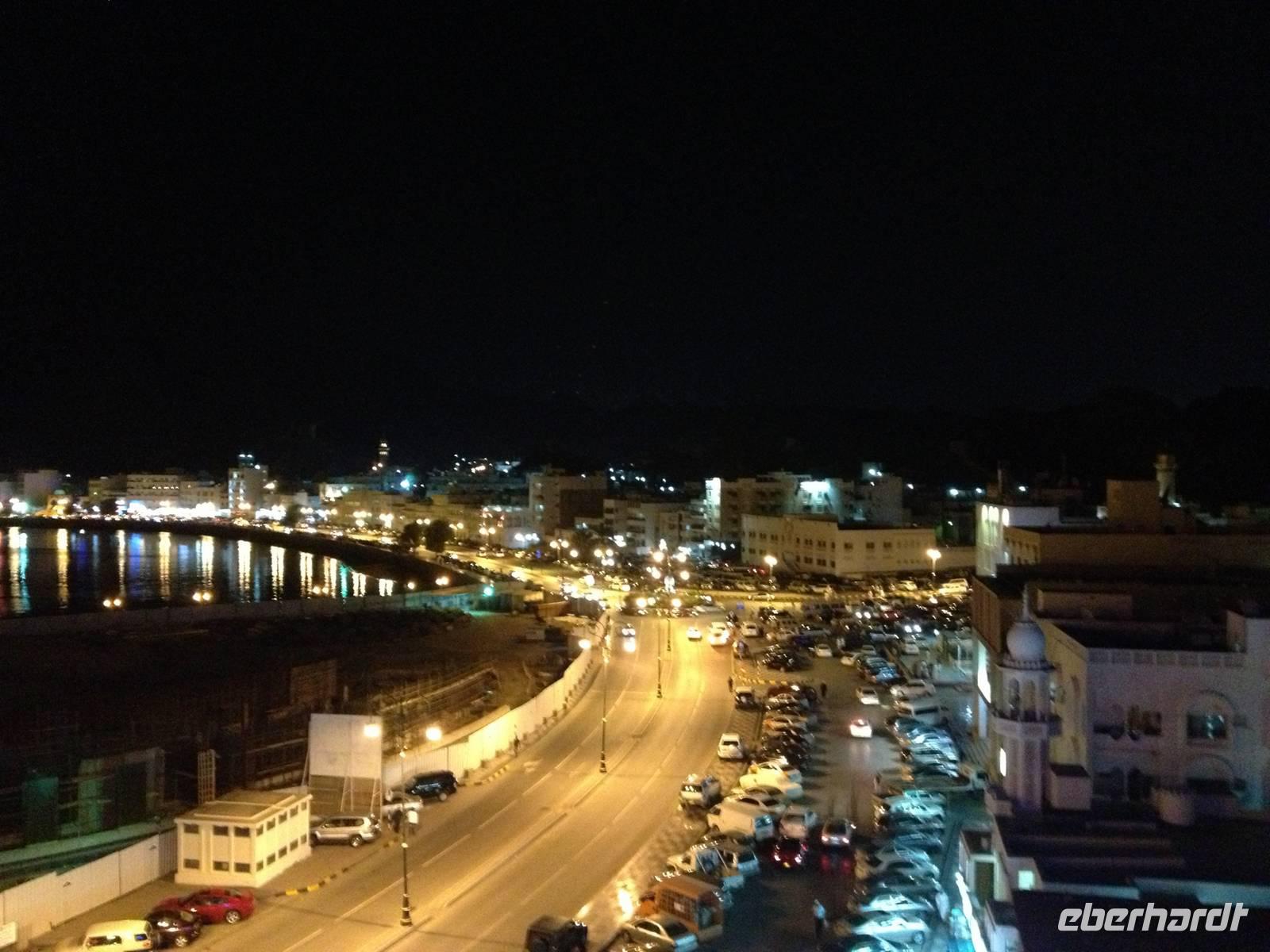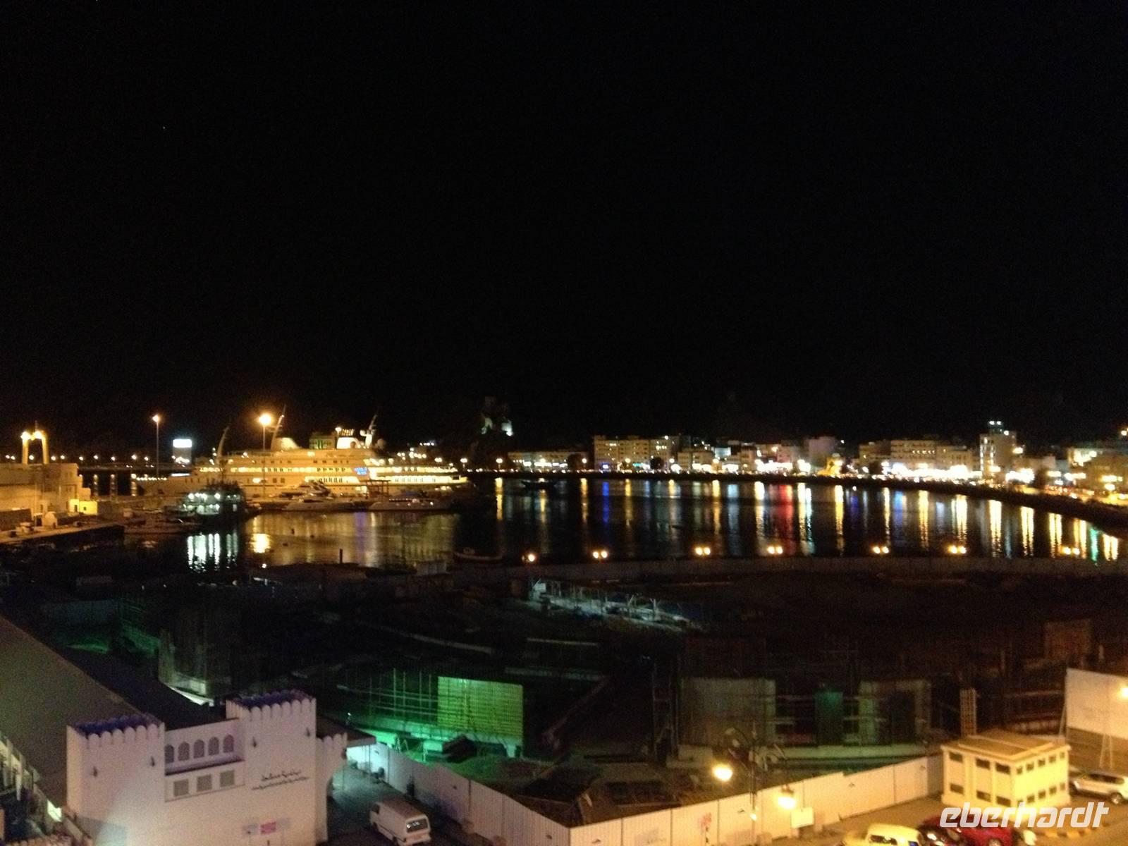 Am Nachmittag waren wir wieder im Hotel und hatten noch Zeit für ein Bad im Meer oder im Pool bevor wir uns am Abend erneut ins Stadtzentrum aufmachten. Mit Taxis wurden wir zur Marina mit dem Schiff des Sultans gebracht. In einem Fischrestaurant über den Dächern der Stadt und mit einem schönen Blick auf das abendliche Muscat nahmen wir schon langsam Abschied.