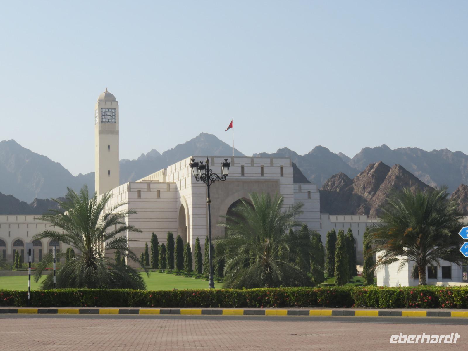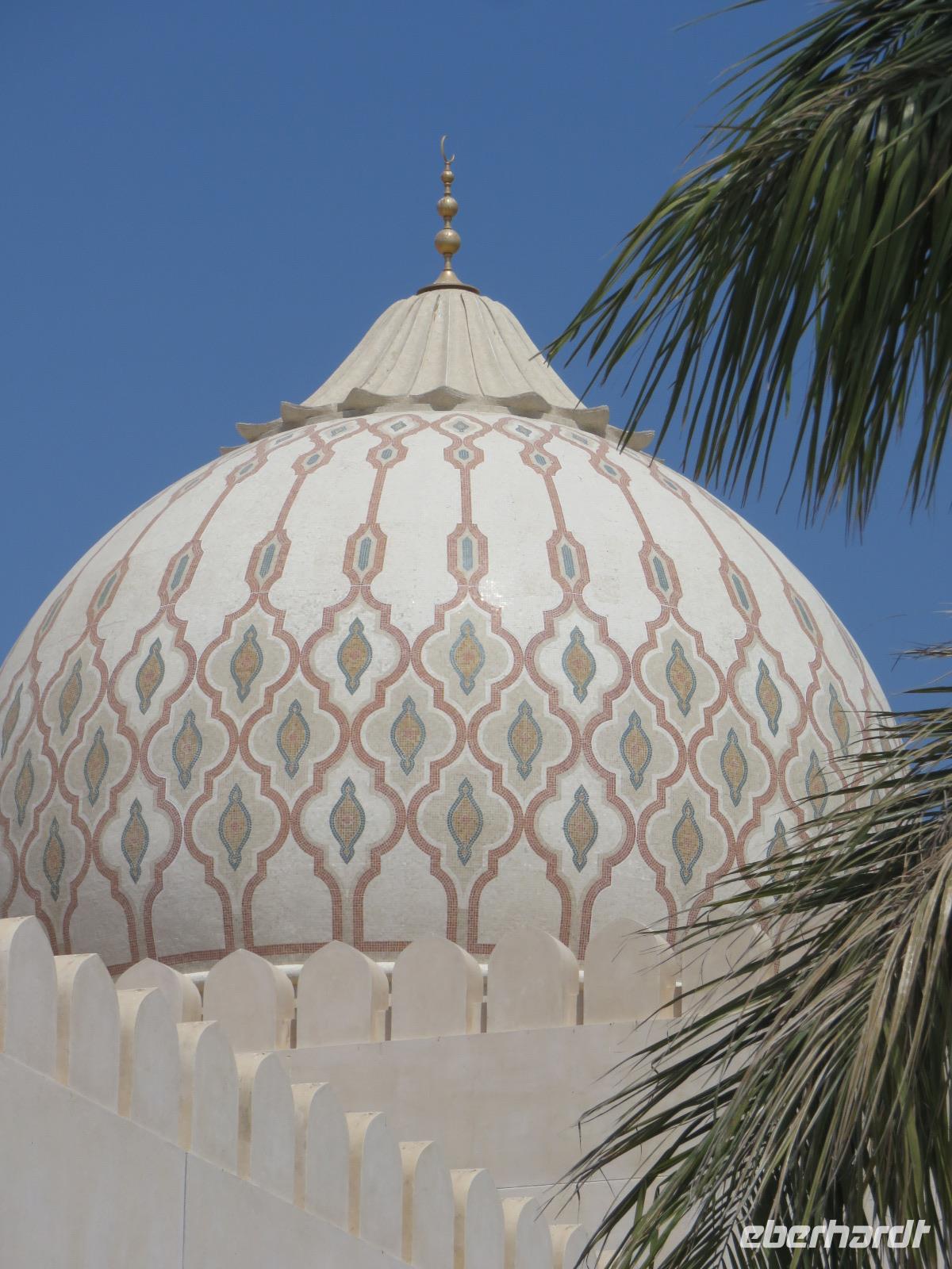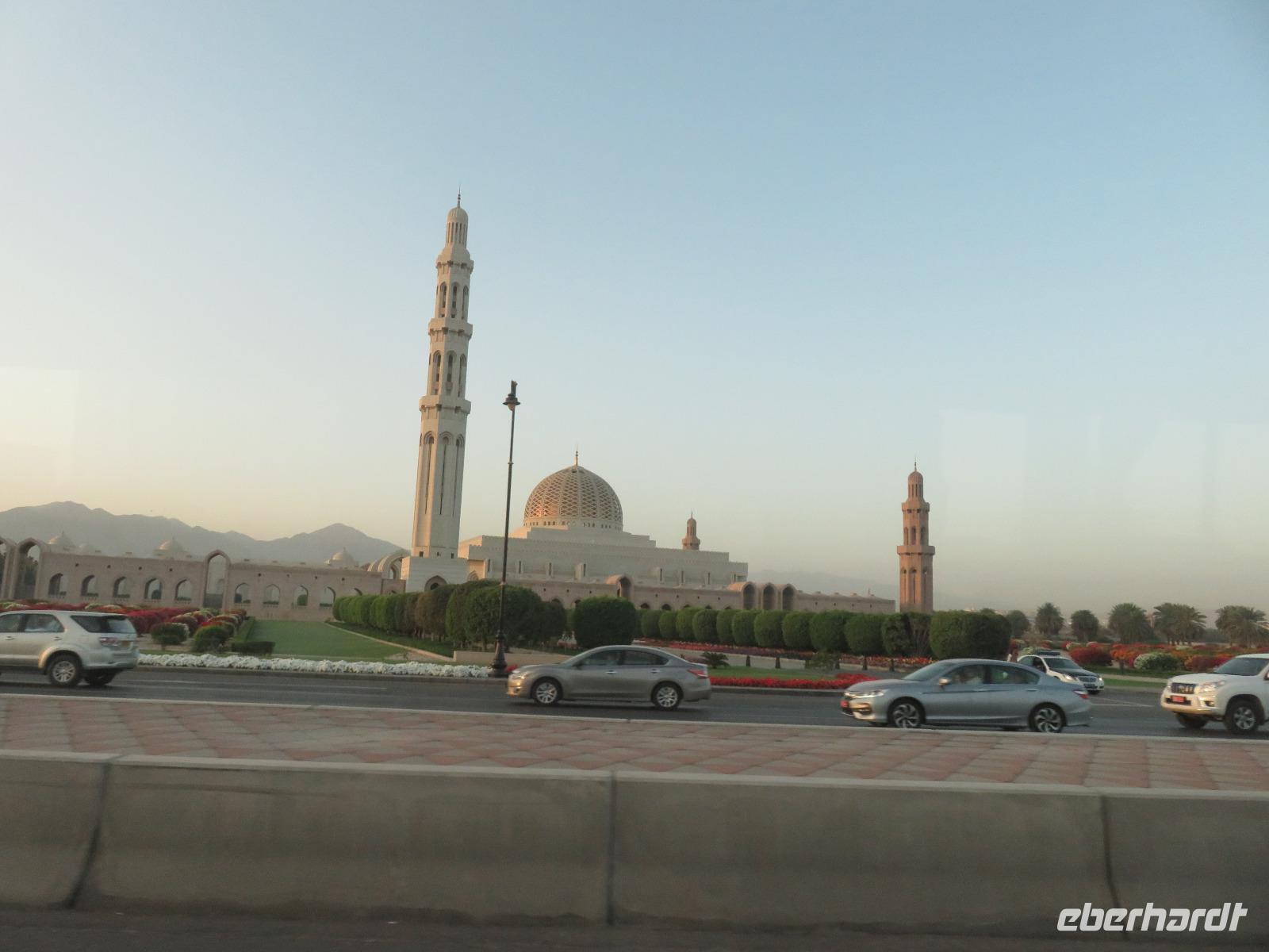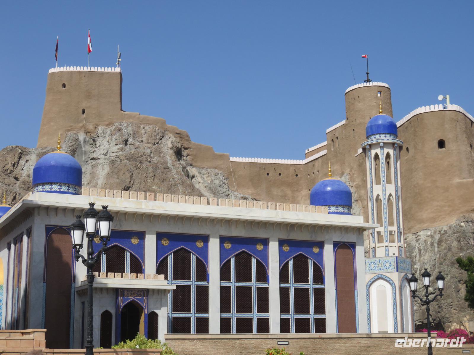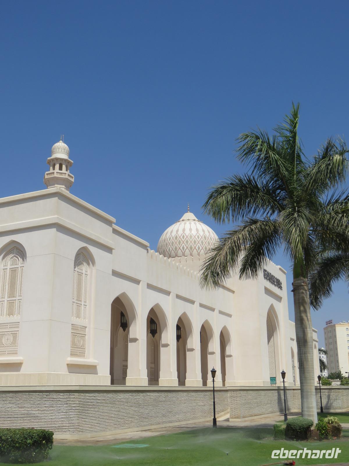 Nach dem Frühstück steht der Besuch der Großen Sultan Qaboos Moschee. Die fünftgrößte Moschee der Welt bietet Platz für bis zu 20.000 Menschen zum Gebet. Der Sultan von Oman ließ dieses imposante Bauerk in nur 6 Jahren Bauzeit von 1995 bis 2001 aus indischem Sandstein und vielen anderen wertvollen Baustoffen, wie Marmor aus Italien und edlen Hölzern errichten. Den riesigen Teppich knüpften im Iran 600 Frauen in vier Jahren von Hand. Die imposanten Kronleuchter, der größte wiegt 8 Tonnen, gestaltete und fertigte die Firma Swarovski in Österreich. Tawfiq gibt uns wieder sehr viele Informationen zur Moschee und zum Islam und dessen 5 Säulen. Diese werden die durch die 5 Minarette symbolisiert. Die Große Sultan Qaboos Moschee ist in der Ausschmückung wirklich orientalisch und wir sind sehr beeindruckt. Anschließend geht es zurück nach Muscat. Am modernen Royalen Opernhaus, welches 2011 eingeweiht wurde, legen wir einen Fotostopp ein. In dem wunderschönen Bau im orientalischen Stil eines alten Forts hat heute die Musik ihr Zuhause. Nun geht es in die Altstadt von Muscat zum berühmten Muttrah Souk. Wir spazieren durch den Markt mit seinem bunten Treiben und zahlreichen Angeboten. Von der Corniche aus sehen wir die beiden großen Yachten des Sultans. Anschließend bringt uns der Bus in das alte Muscat. Oberhalb der alten Straße eröffnet sich uns ein schöner Blick auf den Sultanspalast und die beiden alten Forts, die aus der Zeit der portugiesischen Besetzung stammen. Wir besuchen das Bait Al Zubair Museum. In dieser privaten Sammlung wird das Leben der Omanis an Hand vieler interessanter Exponate, wie Schmuck, traditionelle Kleidung, Alltagsgegenstände sehr anschaulich dargestellt. Wir bekommen dadurch einen guten Einblick in die Traditionen, die Tawfiq mit seinen Informationen noch untersetzt. Unsere Tour führt uns nun zum Sultanspalast Qasr al-Alam. Den heutigen prunkvollen Palast ließ der Sultan Qaboos von Oman in den frühen 1970er Jahren auf der Stelle erweitern, wo die Al-Bu-Said-Regenten seit dem 19. Jahrhundert ihre Residenzen hatten. Der Palast dient heute für offizielle Anlässe und dem Empfang von Staatsgästen. Anschließend kehren wir zum Hotel zurück. Nun bleibt noch Zeit für einen Spaziergang am Meer, bevor uns Tawfiq zum Abendessen in einem typischen arabischen Restaurant abholt. In einem netten Garten des Restaurants Kargeen werden wir mit arabischen Köstlichkeiten verwöhnt. Es gibt gegrilltes Lamm und Hühnchen, Hummus, arabischen Salat und natürlich Fladenbrot. Statt Wein oder Bier wird uns eine super leckere Lemon-Minze-Limonade. Der Abend ist ein schöner Abschluss unseres Aufenthaltes im Norden des Omans.