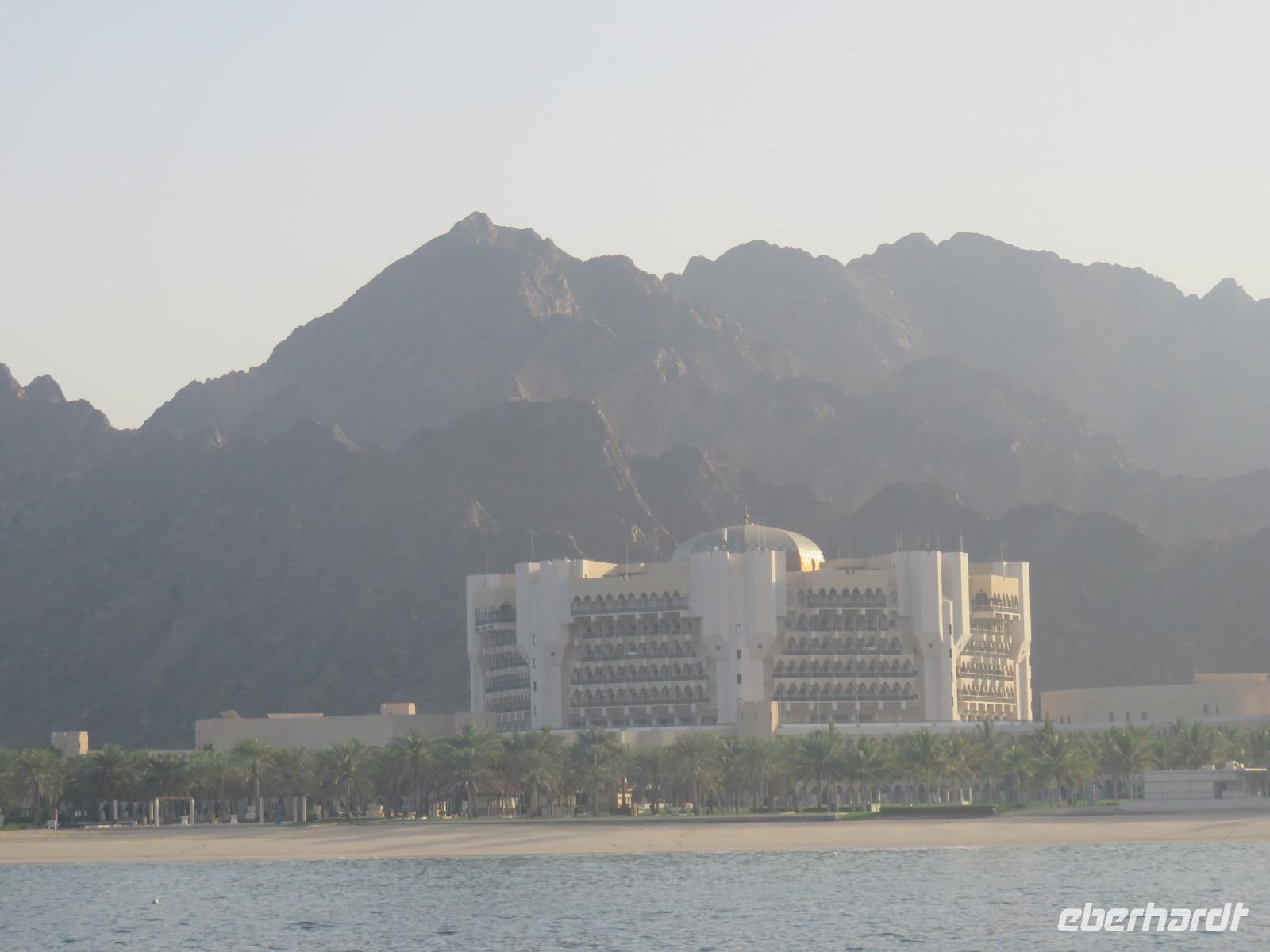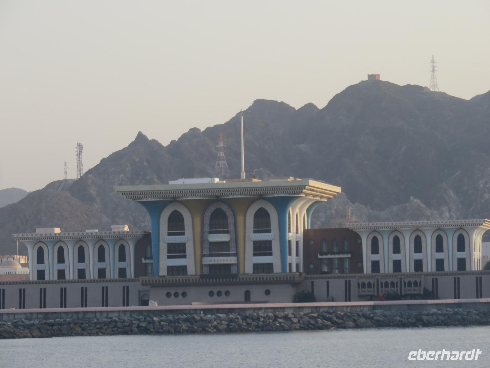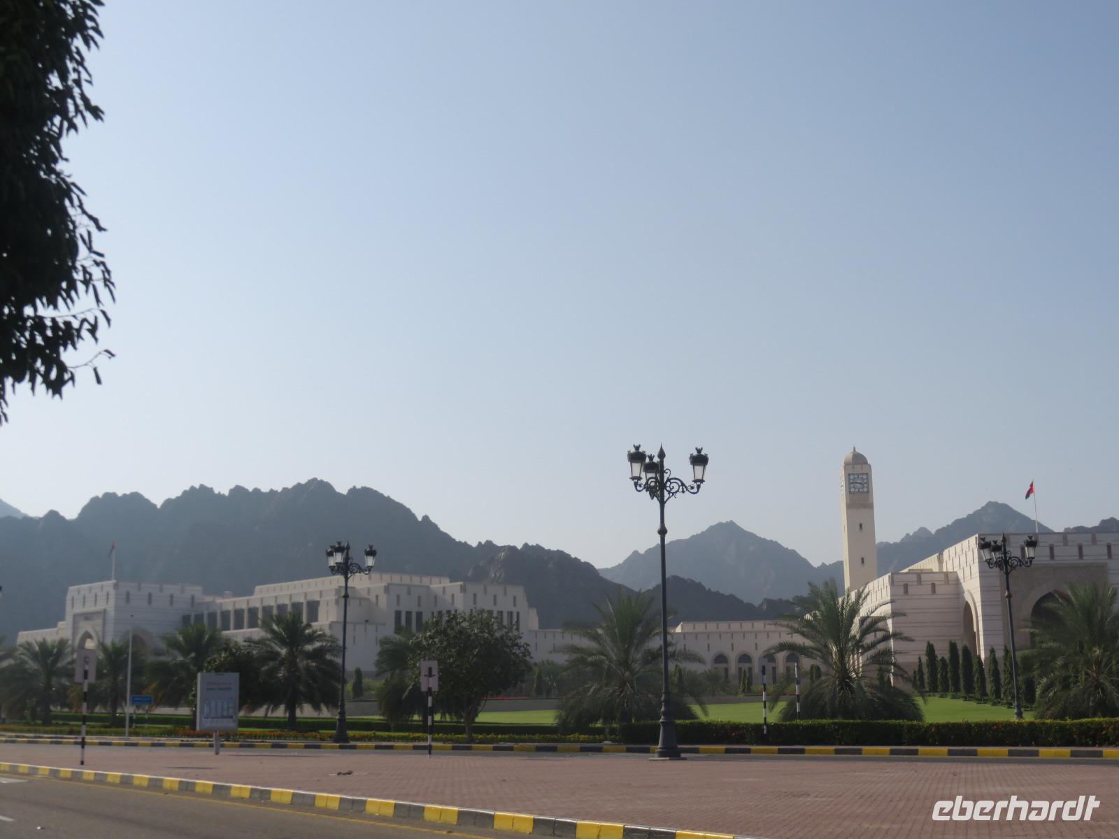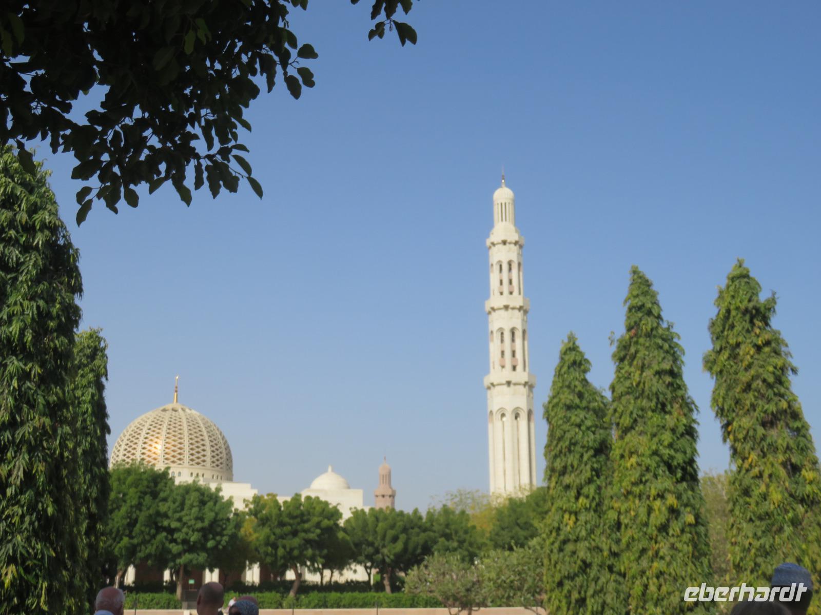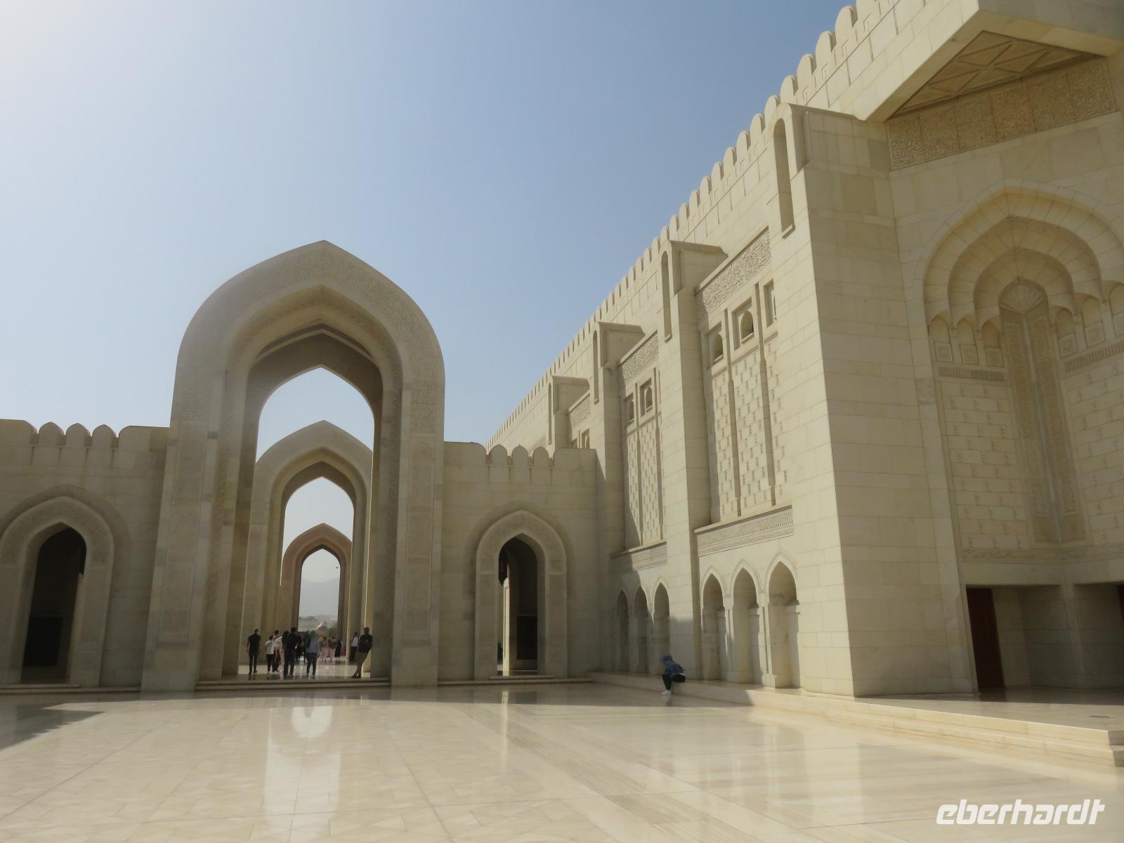 Nach dem Frühstück steht der Besuch der Großen Sultan Qaboos Moschee. Die fünftgrößte Moschee der Welt bietet Platz für bis zu 20.000 Menschen zum Gebet. Der Sultan von Oman ließ dieses imposante Bauerk in nur 6 Jahren Bauzeit von 1995 bis 2001 aus indischem Sandstein und vielen anderen wertvollen Baustoffen, wie Marmor aus Italien und edlen Hölzern errichten. Den riesigen Teppich knüpften im Iran 600 Frauen in vier Jahren von Hand. Die imposanten Kronleuchter, der größte wiegt 8 Tonnen, gestaltete und fertigte die Firma Swarovski in Österreich. Tawfiq gibt uns wieder sehr viele Informationen zur Moschee und zum Islam und dessen 5 Säulen. Diese werden die durch die 5 Minarette symbolisiert. Die Große Sultan Qaboos Moschee ist in der Ausschmückung wirklich orientalisch und wir sind sehr beeindruckt. Anschließend geht es zurück nach Muscat. Am modernen Royalen Opernhaus, welches 2011 eingeweiht wurde, legen wir einen Fotostopp ein. In dem wunderschönen Bau im orientalischen Stil eines alten Forts hat heute die Musik ihr Zuhause. Nun geht es in die Altstadt von Muscat zum berühmten Muttrah Souk. Wir spazieren durch den Markt mit seinem bunten Treiben und zahlreichen Angeboten. Von der Corniche aus sehen wir die beiden großen Yachten des Sultans. Anschließend bringt uns der Bus in das alte Muscat. Oberhalb der alten Straße eröffnet sich uns ein schöner Blick auf den Sultanspalast und die beiden alten Forts, die aus der Zeit der portugiesischen Besetzung stammen. Wir besuchen das Bait Al Zubair Museum. In dieser privaten Sammlung wird das Leben der Omanis an Hand vieler interessanter Exponate, wie Schmuck, traditionelle Kleidung, Alltagsgegenstände sehr anschaulich dargestellt. Wir bekommen dadurch einen guten Einblick in die Traditionen, die Tawfiq mit seinen Informationen noch untersetzt. Unsere Tour führt uns nun zum Sultanspalast Qasr al-Alam. Den heutigen prunkvollen Palast ließ der Sultan Qaboos von Oman in den frühen 1970er Jahren auf der Stelle erweitern, wo die Al-Bu-Said-Regenten seit dem 19. Jahrhundert ihre Residenzen hatten. Der Palast dient heute für offizielle Anlässe und dem Empfang von Staatsgästen. Anschließend kehren wir zum Hotel zurück. Nun bleibt noch Zeit für einen Spaziergang am Meer, bevor uns Tawfiq zum Abendessen in einem typischen arabischen Restaurant abholt. In einem netten Garten des Restaurants Kargeen werden wir mit arabischen Köstlichkeiten verwöhnt. Es gibt gegrilltes Lamm und Hühnchen, Hummus, arabischen Salat und natürlich Fladenbrot. Statt Wein oder Bier wird uns eine super leckere Lemon-Minze-Limonade. Der Abend ist ein schöner Abschluss unseres Aufenthaltes im Norden des Omans.