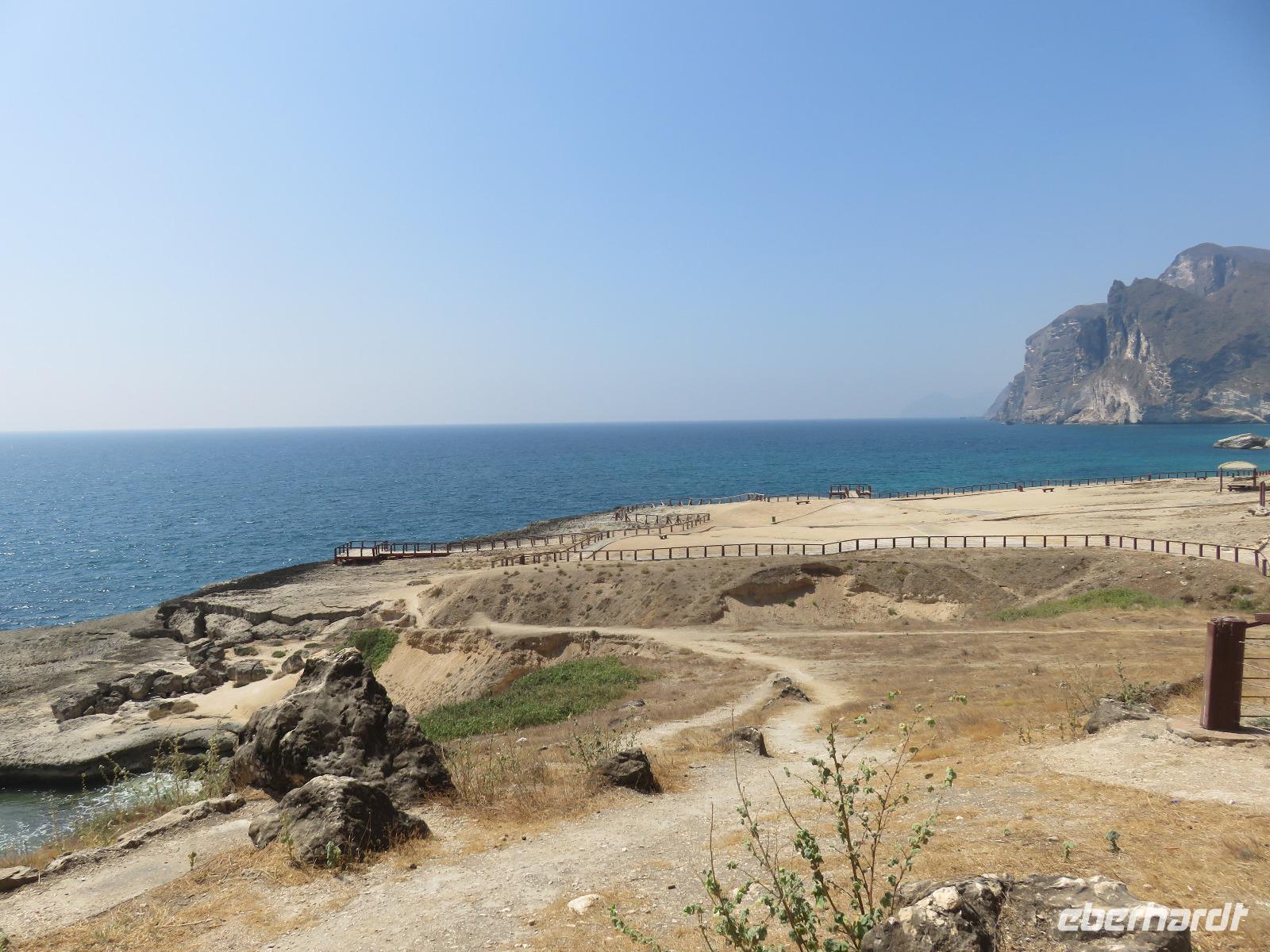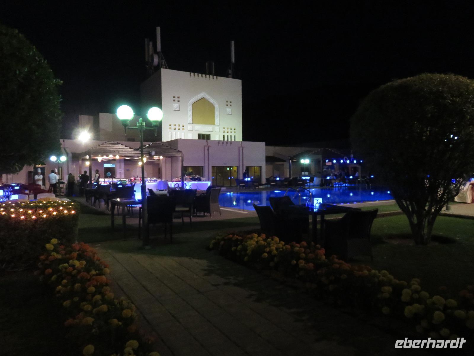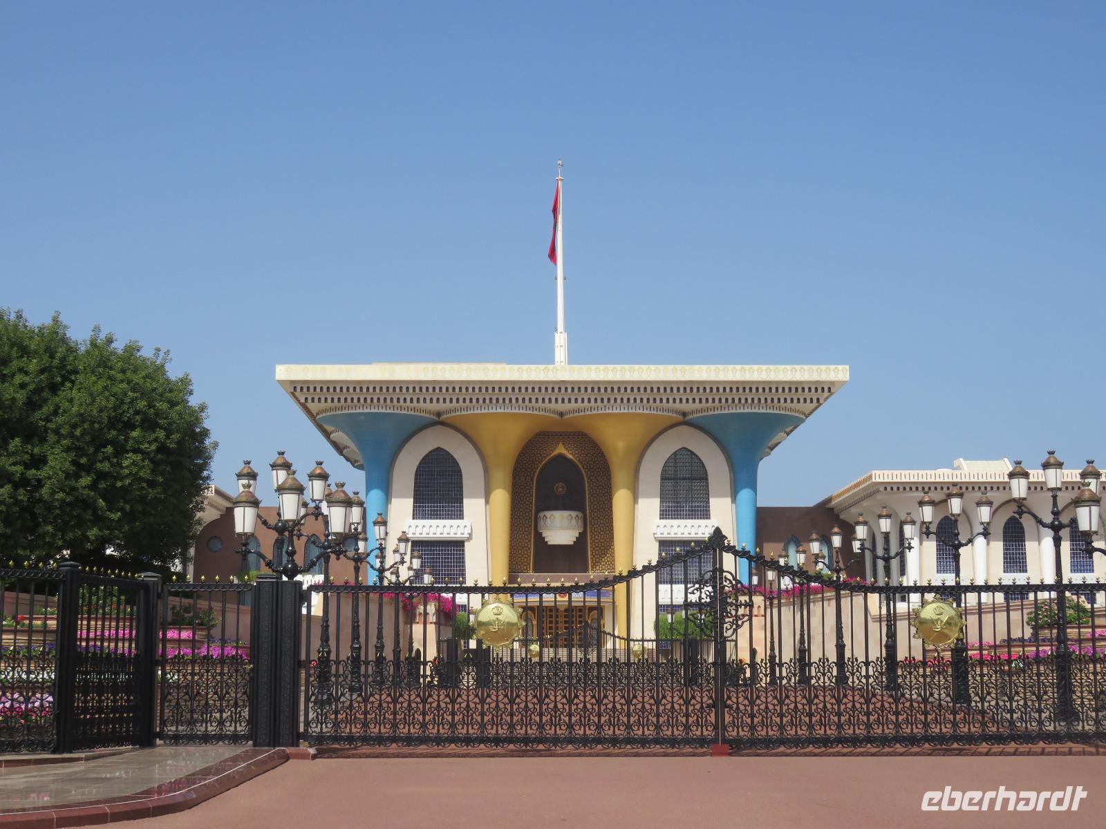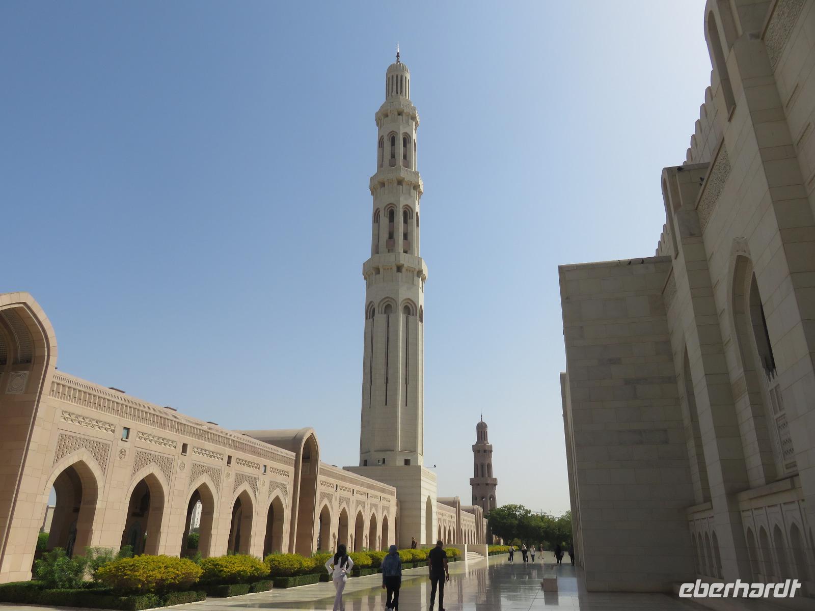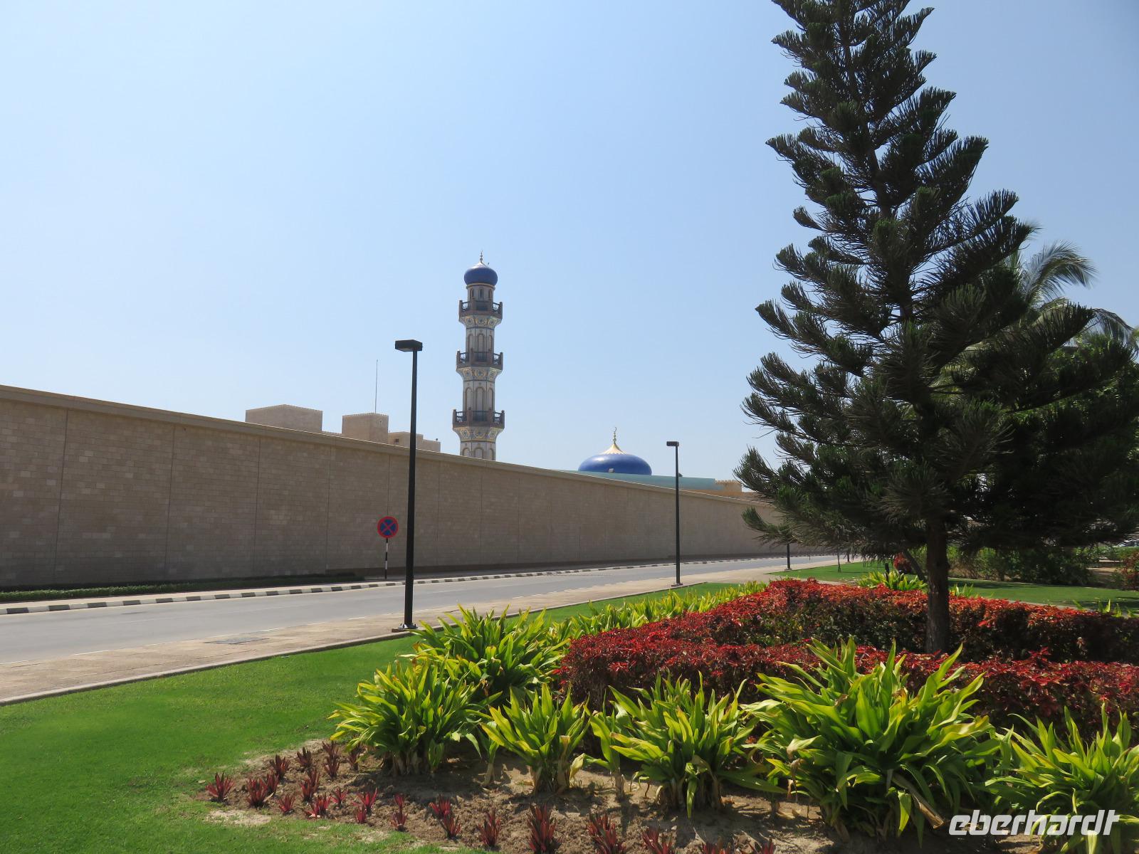 Nach dem Frühstück steht der Besuch der Großen Sultan Qaboos Moschee. Die fünftgrößte Moschee der Welt bietet Platz für bis zu 20.000 Menschen zum Gebet. Der Sultan von Oman ließ dieses imposante Bauerk in nur 6 Jahren Bauzeit von 1995 bis 2001 aus indischem Sandstein und vielen anderen wertvollen Baustoffen, wie Marmor aus Italien und edlen Hölzern errichten. Den riesigen Teppich knüpften im Iran 600 Frauen in vier Jahren von Hand. Die imposanten Kronleuchter, der größte wiegt 8 Tonnen, gestaltete und fertigte die Firma Swarovski in Österreich. Tawfiq gibt uns wieder sehr viele Informationen zur Moschee und zum Islam und dessen 5 Säulen. Diese werden die durch die 5 Minarette symbolisiert. Die Große Sultan Qaboos Moschee ist in der Ausschmückung wirklich orientalisch und wir sind sehr beeindruckt. Anschließend geht es zurück nach Muscat. Am modernen Royalen Opernhaus, welches 2011 eingeweiht wurde, legen wir einen Fotostopp ein. In dem wunderschönen Bau im orientalischen Stil eines alten Forts hat heute die Musik ihr Zuhause. Nun geht es in die Altstadt von Muscat zum berühmten Muttrah Souk. Wir spazieren durch den Markt mit seinem bunten Treiben und zahlreichen Angeboten. Von der Corniche aus sehen wir die beiden großen Yachten des Sultans. Anschließend bringt uns der Bus in das alte Muscat. Oberhalb der alten Straße eröffnet sich uns ein schöner Blick auf den Sultanspalast und die beiden alten Forts, die aus der Zeit der portugiesischen Besetzung stammen. Wir besuchen das Bait Al Zubair Museum. In dieser privaten Sammlung wird das Leben der Omanis an Hand vieler interessanter Exponate, wie Schmuck, traditionelle Kleidung, Alltagsgegenstände sehr anschaulich dargestellt. Wir bekommen dadurch einen guten Einblick in die Traditionen, die Tawfiq mit seinen Informationen noch untersetzt. Unsere Tour führt uns nun zum Sultanspalast Qasr al-Alam. Den heutigen prunkvollen Palast ließ der Sultan Qaboos von Oman in den frühen 1970er Jahren auf der Stelle erweitern, wo die Al-Bu-Said-Regenten seit dem 19. Jahrhundert ihre Residenzen hatten. Der Palast dient heute für offizielle Anlässe und dem Empfang von Staatsgästen. Anschließend kehren wir zum Hotel zurück. Nun bleibt noch Zeit für einen Spaziergang am Meer, bevor uns Tawfiq zum Abendessen in einem typischen arabischen Restaurant abholt. In einem netten Garten des Restaurants Kargeen werden wir mit arabischen Köstlichkeiten verwöhnt. Es gibt gegrilltes Lamm und Hühnchen, Hummus, arabischen Salat und natürlich Fladenbrot. Statt Wein oder Bier wird uns eine super leckere Lemon-Minze-Limonade. Der Abend ist ein schöner Abschluss unseres Aufenthaltes im Norden des Omans.
