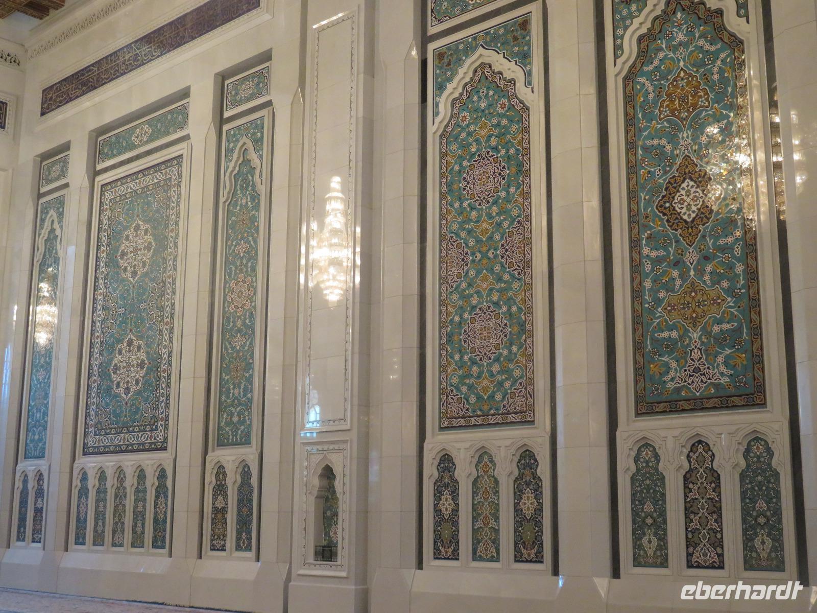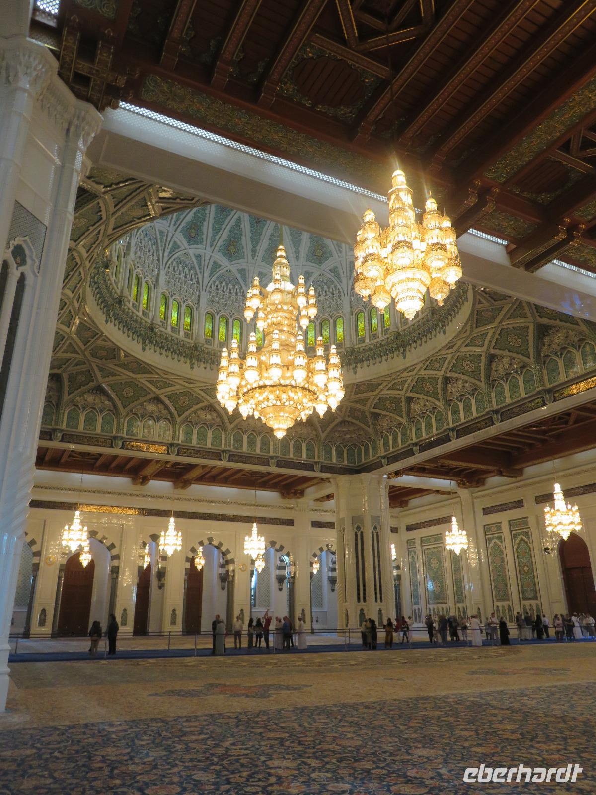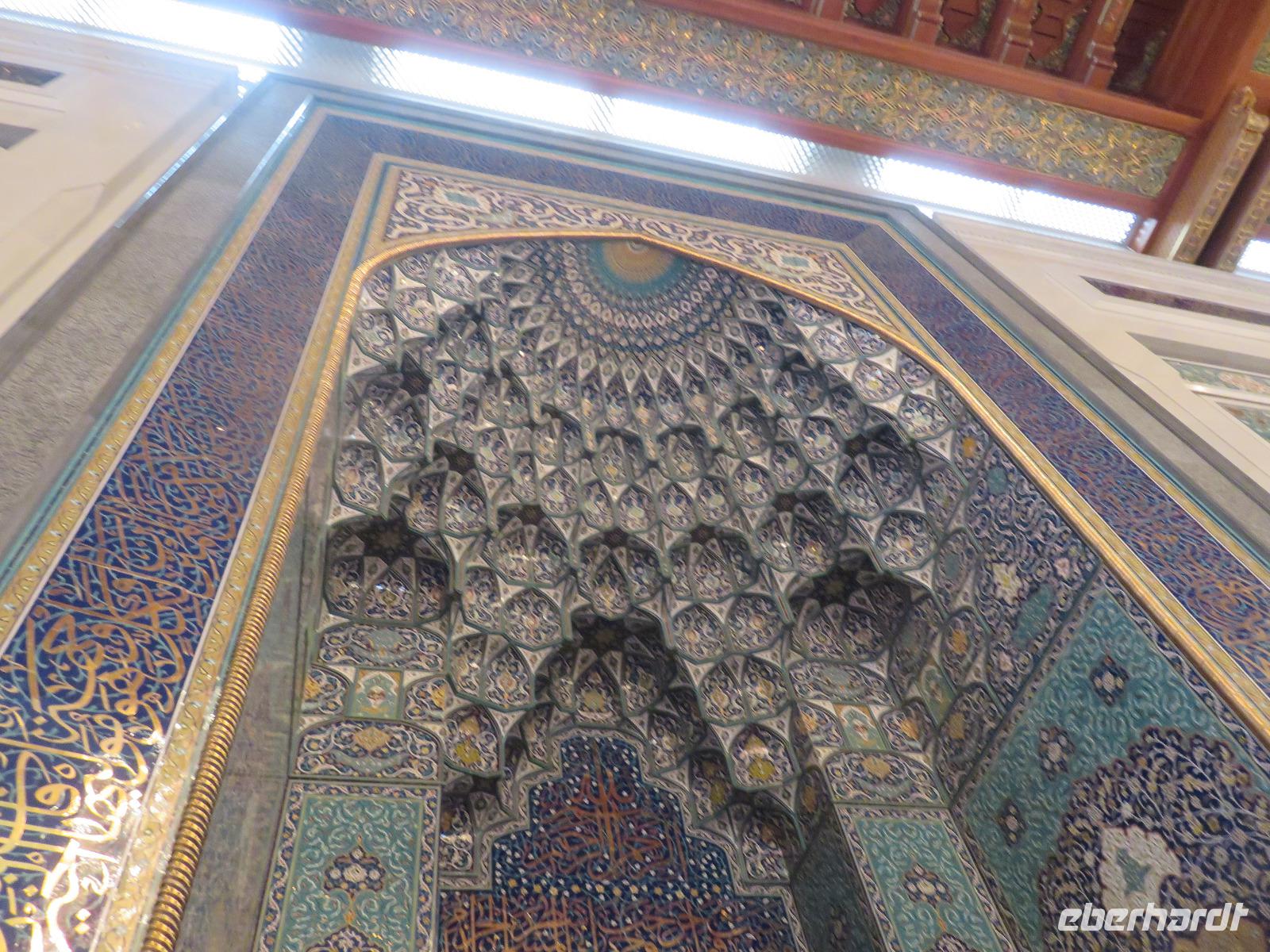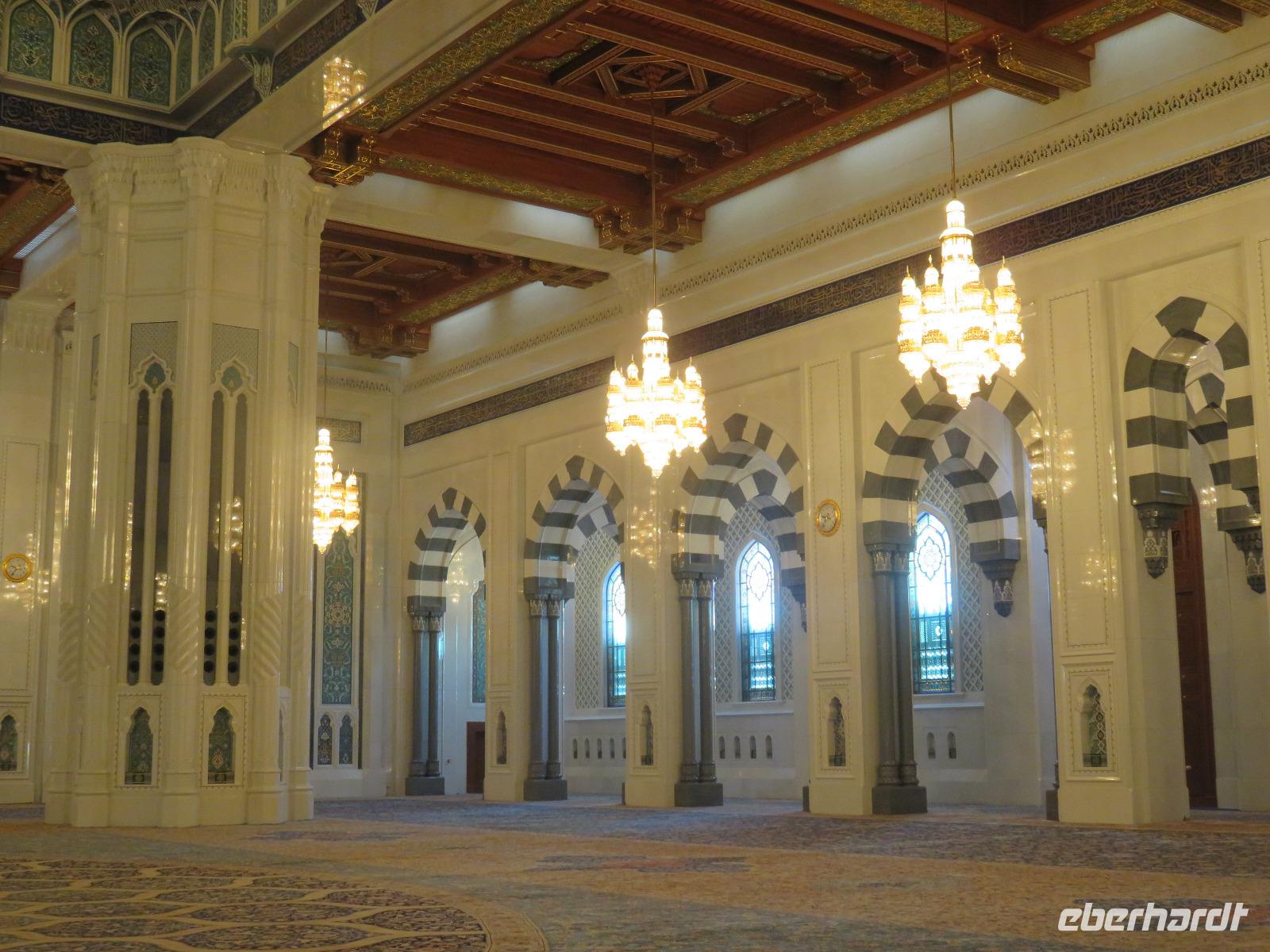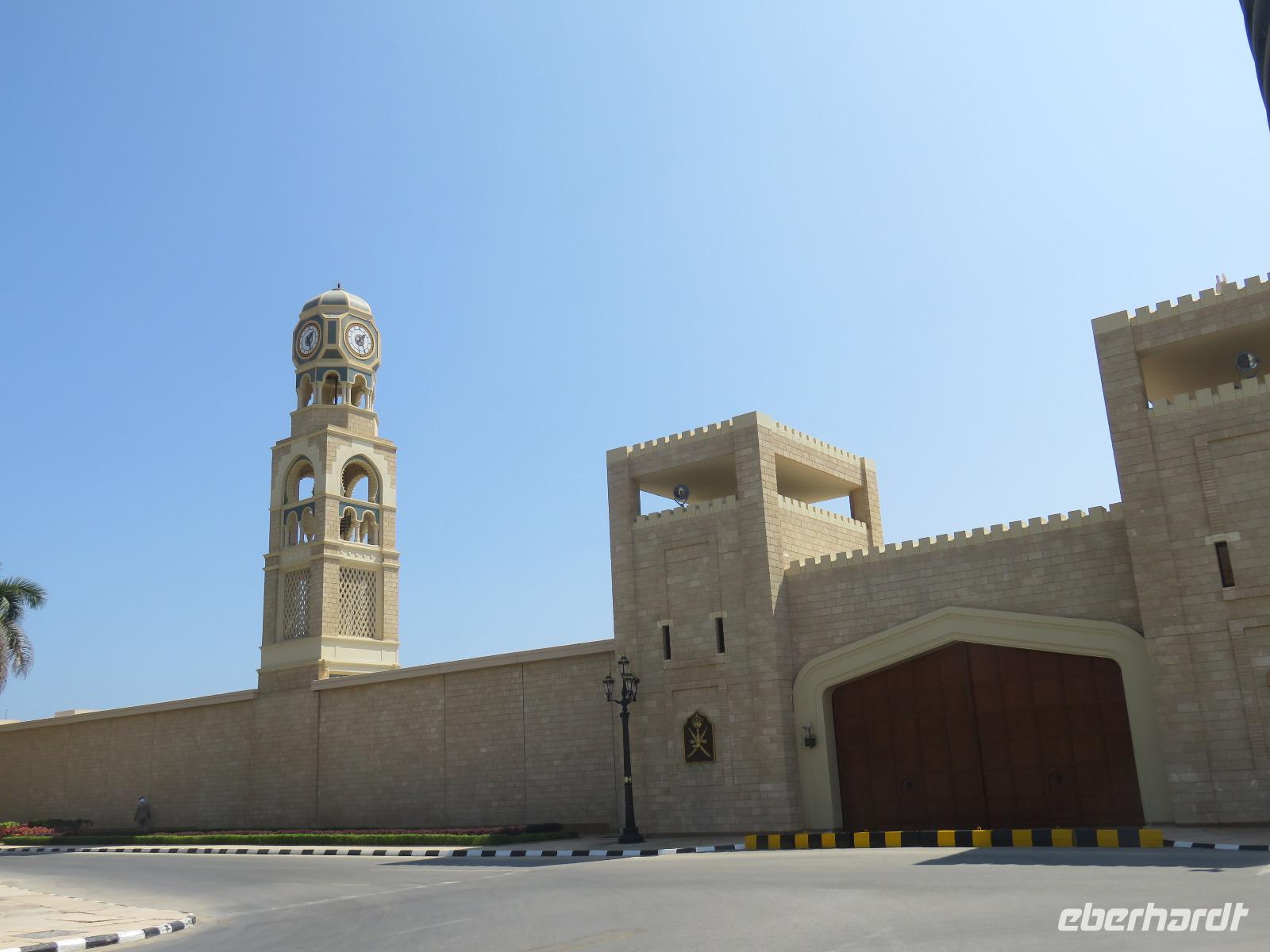 Nach dem Frühstück steht der Besuch der Großen Sultan Qaboos Moschee. Die fünftgrößte Moschee der Welt bietet Platz für bis zu 20.000 Menschen zum Gebet. Der Sultan von Oman ließ dieses imposante Bauerk in nur 6 Jahren Bauzeit von 1995 bis 2001 aus indischem Sandstein und vielen anderen wertvollen Baustoffen, wie Marmor aus Italien und edlen Hölzern errichten. Den riesigen Teppich knüpften im Iran 600 Frauen in vier Jahren von Hand. Die imposanten Kronleuchter, der größte wiegt 8 Tonnen, gestaltete und fertigte die Firma Swarovski in Österreich. Tawfiq gibt uns wieder sehr viele Informationen zur Moschee und zum Islam und dessen 5 Säulen. Diese werden die durch die 5 Minarette symbolisiert. Die Große Sultan Qaboos Moschee ist in der Ausschmückung wirklich orientalisch und wir sind sehr beeindruckt. Anschließend geht es zurück nach Muscat. Am modernen Royalen Opernhaus, welches 2011 eingeweiht wurde, legen wir einen Fotostopp ein. In dem wunderschönen Bau im orientalischen Stil eines alten Forts hat heute die Musik ihr Zuhause. Nun geht es in die Altstadt von Muscat zum berühmten Muttrah Souk. Wir spazieren durch den Markt mit seinem bunten Treiben und zahlreichen Angeboten. Von der Corniche aus sehen wir die beiden großen Yachten des Sultans. Anschließend bringt uns der Bus in das alte Muscat. Oberhalb der alten Straße eröffnet sich uns ein schöner Blick auf den Sultanspalast und die beiden alten Forts, die aus der Zeit der portugiesischen Besetzung stammen. Wir besuchen das Bait Al Zubair Museum. In dieser privaten Sammlung wird das Leben der Omanis an Hand vieler interessanter Exponate, wie Schmuck, traditionelle Kleidung, Alltagsgegenstände sehr anschaulich dargestellt. Wir bekommen dadurch einen guten Einblick in die Traditionen, die Tawfiq mit seinen Informationen noch untersetzt. Unsere Tour führt uns nun zum Sultanspalast Qasr al-Alam. Den heutigen prunkvollen Palast ließ der Sultan Qaboos von Oman in den frühen 1970er Jahren auf der Stelle erweitern, wo die Al-Bu-Said-Regenten seit dem 19. Jahrhundert ihre Residenzen hatten. Der Palast dient heute für offizielle Anlässe und dem Empfang von Staatsgästen. Anschließend kehren wir zum Hotel zurück. Nun bleibt noch Zeit für einen Spaziergang am Meer, bevor uns Tawfiq zum Abendessen in einem typischen arabischen Restaurant abholt. In einem netten Garten des Restaurants Kargeen werden wir mit arabischen Köstlichkeiten verwöhnt. Es gibt gegrilltes Lamm und Hühnchen, Hummus, arabischen Salat und natürlich Fladenbrot. Statt Wein oder Bier wird uns eine super leckere Lemon-Minze-Limonade. Der Abend ist ein schöner Abschluss unseres Aufenthaltes im Norden des Omans.