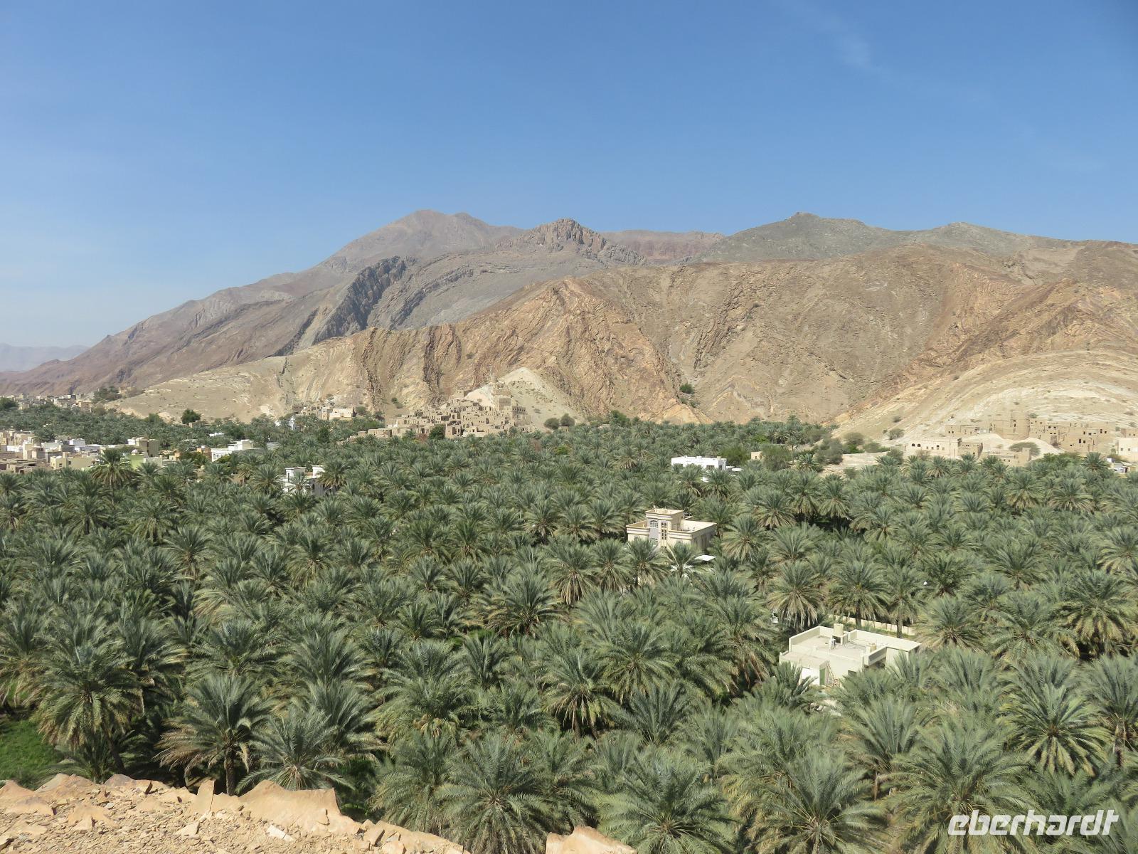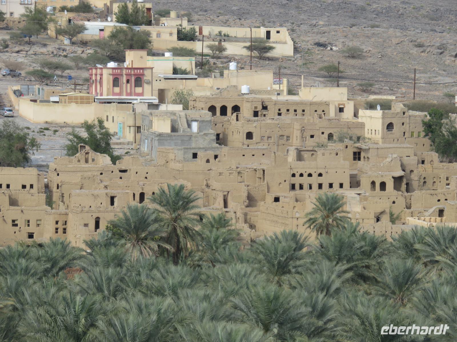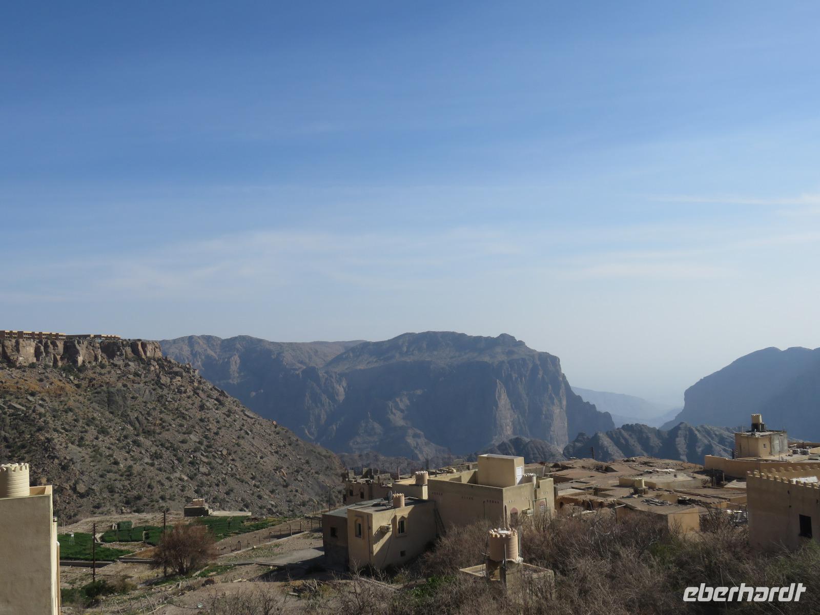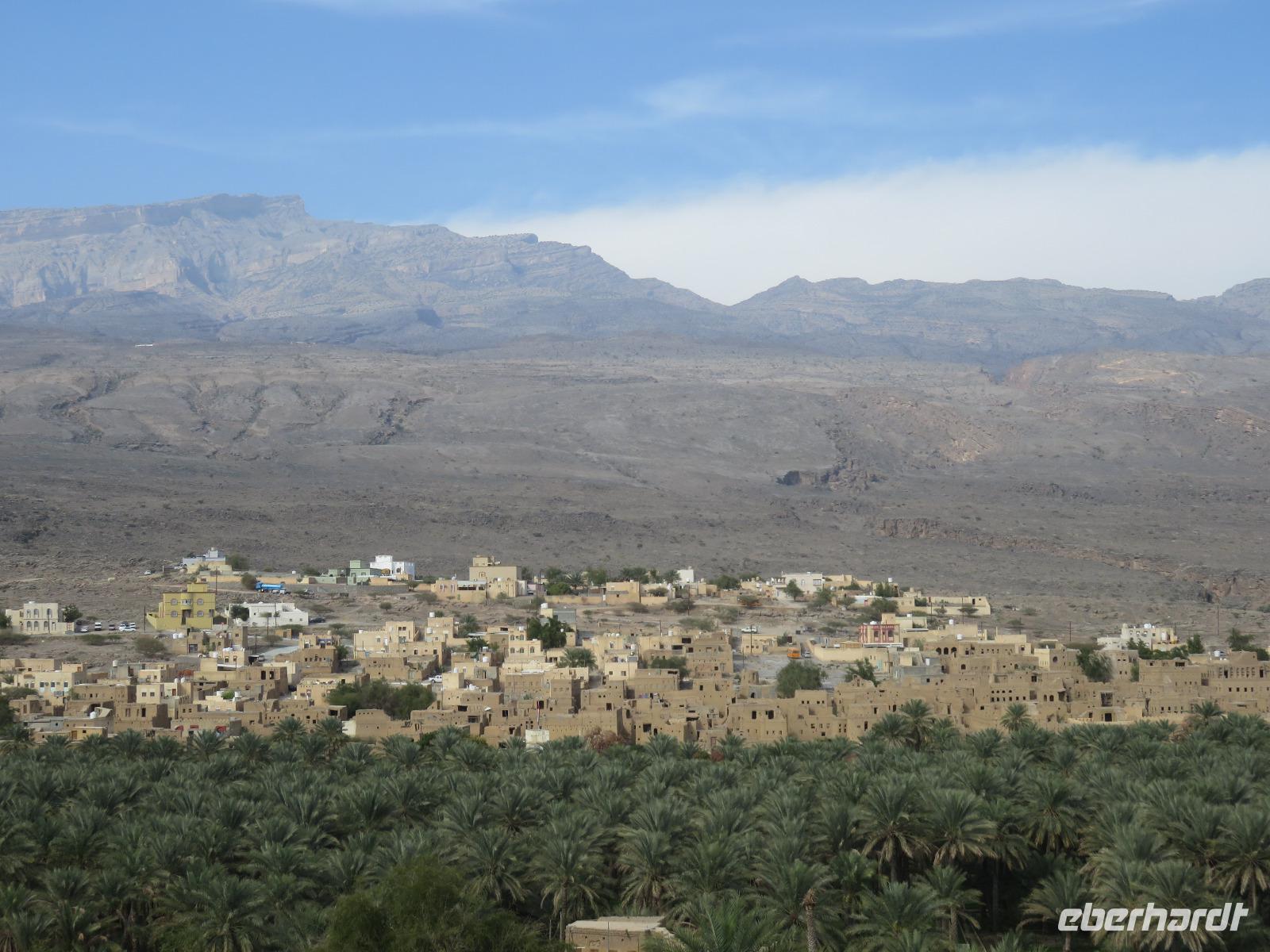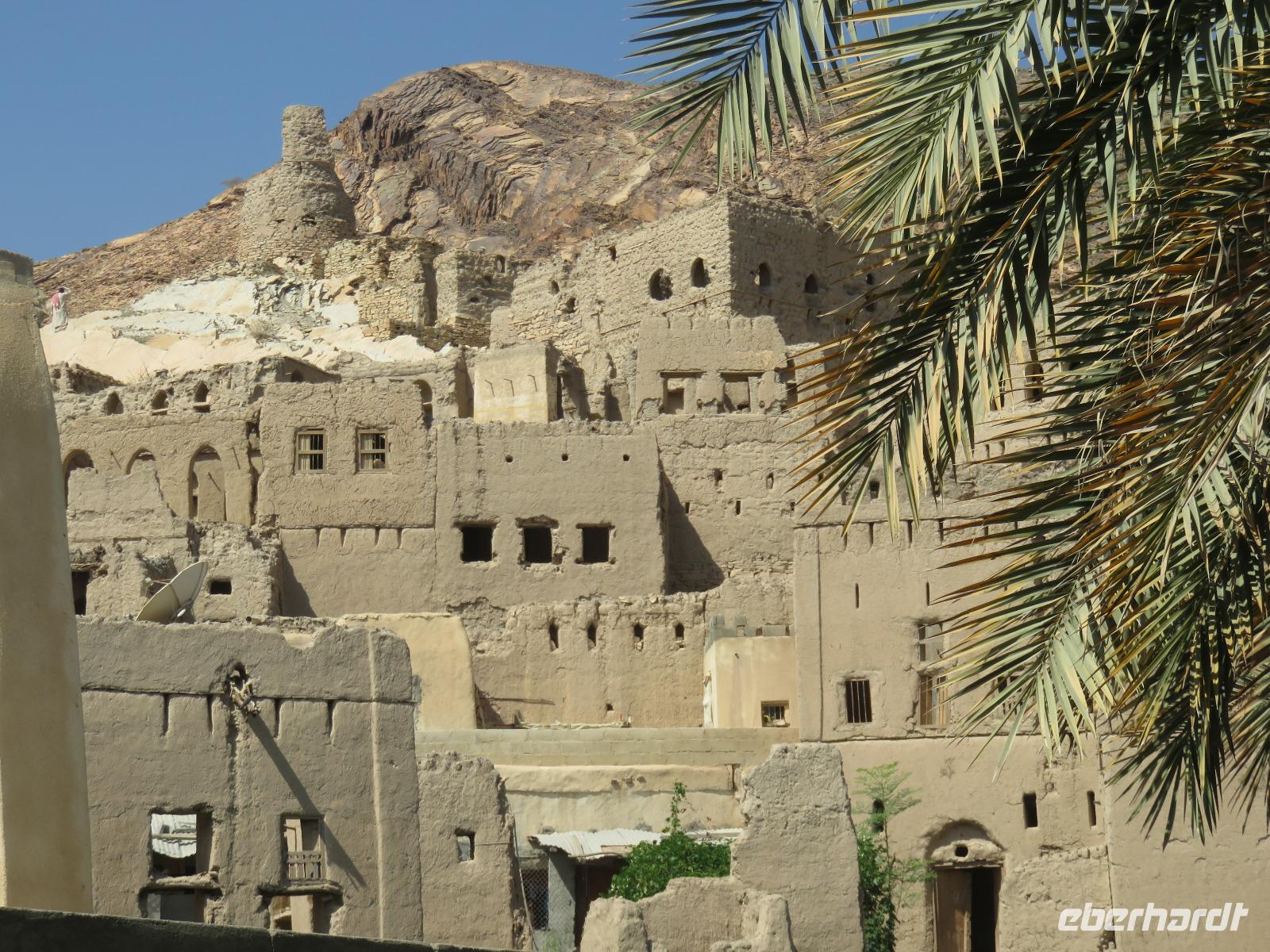 Am Vormittag besuchen wir die Festung Jabrin. Tawfiq erzählt uns die wichtigsten Details aus der Geschichte des Omans und der Festung. Das imposante Bauwerk wurde 1670 unter Bil'arub bin Sultan al- Ya'aruba erbaut. Er wurde 1688 zum Imam gewählt und legte die Hauptstadt des Omans nach Nizwa und residierte auf Jarbin. Bil'arub war Förderer und Finanzier der Wissenschaftler und Gelehrten seiner Zeit. Der Palast wollte er eigentlich als einen Ort des Wissens und als eine prachtvolle Wohnresidenz etablieren. Allerdings musste er sich immer wieder mit seinem Bruder Saif auseinandersetzen. Dieser beanspruchte ebenfalls den Imamtitel und die Herrschermacht. Deshalb baute man den Palast zur Festung aus. Die Festung lang lange Zeit im Dornröschenschlaf. Mit viel Liebe zum Detail wurde Sie im 20. Jahrhundert restauriert. Wir erhalten eine gute Vorstellung, wie der Imam im 17. Jahrhundert regierte. Uns fasziniert die reiche Ausstattung der Räume mit wunderschönen geschnitzten und bemalten Deckenverzierungen und verschiedenen architektonischen Kleinoden. Unsere Reise führt uns zum Fort Bahla. Diese ist das größte Lehmfort im Oman und gehört gleichzeitig zum UNESCO Weltkulturerbe. Es wurde nach seinem Erbauer Hisn Tamah benannt. Das Fort wurde im 17. Jahrhundert auf den Resten einer älteren persischen Anlage erbaut. Die Außenmauern wurden ungewöhnlich hoch aus Lehmziegeln mit Natursteinen errichtet. Es entstand über mehrere Epochen in unterschiedlichen Bauabschnitten. Die frühesten Teile gehen auf die vorislamische Zeit zurück. Die Restaurierung der großen Anlage dauerte fast 20 Jahre. Auch auf Grund der Unterstützung deutscher Fachleute konnte das Fort 2013 wieder eröffnet werden. Am Mittag fahren wir mit den Jeeps weiter in das Jebel Akhbar-Gebirge. Ein kurzer Fotostopp ermöglicht uns einen schönen Blick auf das alte Lehmdorf Guhl mit den dazugehörigen Feldern. Die Straße führt uns zunächst über Asphalt und mit einigen Serpentinen hinauf auf ca. 800 Meter Höhe. Nun geht es off Road über die Piste weiter auf 2.200 Meter. Vom Aussichtspunkt eröffnet sich uns ein grandioser Blick in den fast 1000 Meter tiefen Grand Canyon Omans - den Jebel Shams. Die Schlucht ist der drittgrößte Canyon der Welt. Nachdem wir ausgiebig geschaut und fotografiert haben, zeigen unsere Chauffeure wieder ihr ganzes Können bei der Rückfahrt hinab. Anschließend fahren wir Richtung Al Hamra. Unterwegs legen wir eine Mittagspause in einem typischen omanischen Restaurant ein. Taufiq hat uns empfohlen, unbedingt Ziege nach omanischer Art zubereitet zu probieren. Wir bestellen also alle das Gericht und sind begeistert, denn das gebratene Ziegenfleisch mit Reise schmeckt sehr lecker. Gut gestärkt reisen wir zu einem Aussichtspunkt oberhalb von Al Hamra. Hier bietet sich ein schöner Blick auf die alte Stadt und die sie umgebenden Palmengärten. Nun geht es hinab nach Al Hamra. Wir spazieren durch die engen Gassen zwischen den teilweise bis zu vierhundert Jahre alten Lehmhäusern. Interessant sind die verschiedenen Bauweisen der Häuser mit teilweise reichen Verzierungen und unterschiedlich kunstvoll gestalteten Fenstern und Türen. Bis 2003 war der Ort noch bewohnt. Da sich der Großteil der Häuser in Privatbesitz befindet, ist das Dorf leider dem Verfall preisgegeben. Es fehlt einfach das Geld, um die Häuser zu erhalten. Unsere Tour führt uns zu einem Aussichtspunkt, von dem wir einen schönen Blick auf das Oasendorf Misfah Al Abreen haben. Es liegt an einem Hang in mitten von Palmengärten und Terrassenfeldern. Anschließend besuchen wir auch dieses Dorf mit interessanten Häusern aus Stein und einem ausgeklügelten Bewässerungssystem für die vielen Pflanzen und Palmen. Wir entdecken Bananenstauden, Granatapfelbäume, Kakaopflanzen und vieles mehr. Anschließend geht es zurück zum Hotel.
