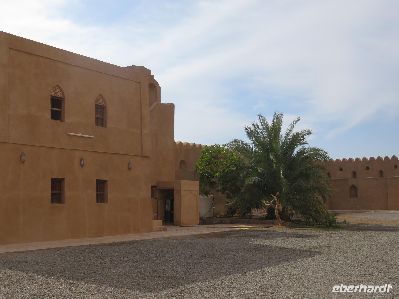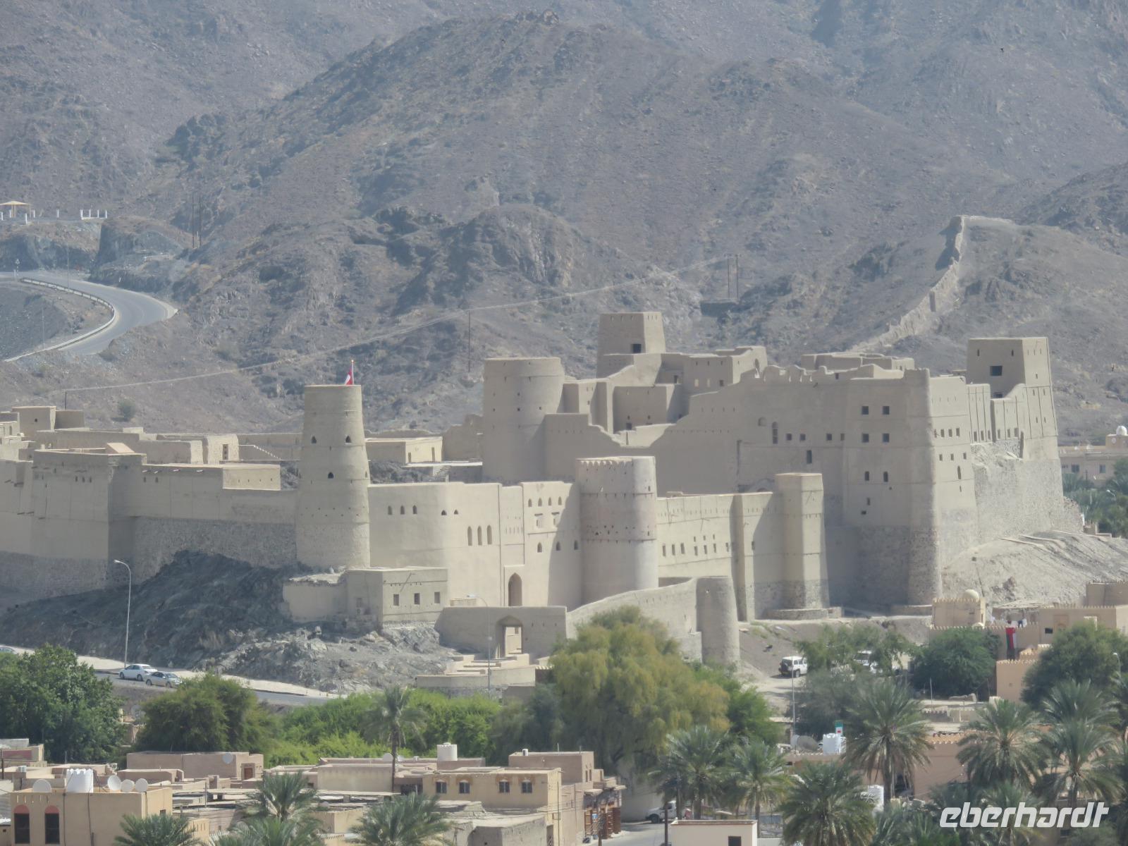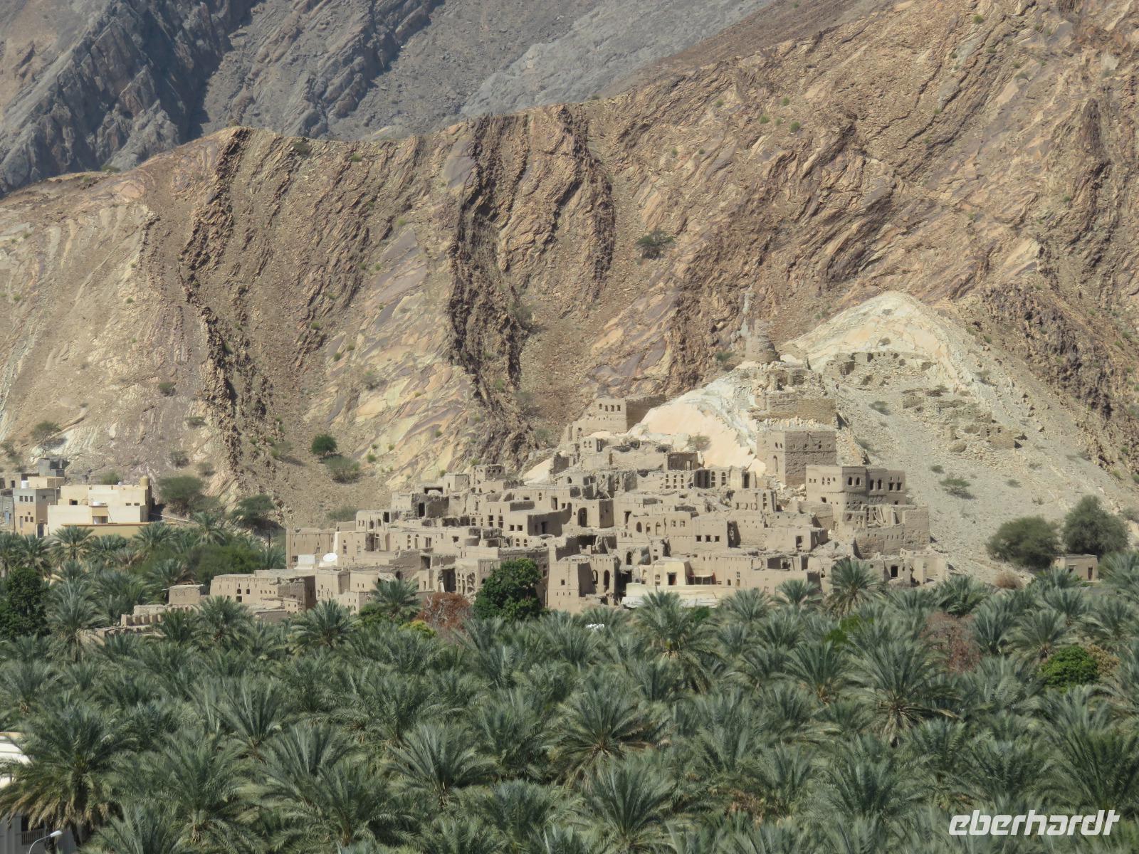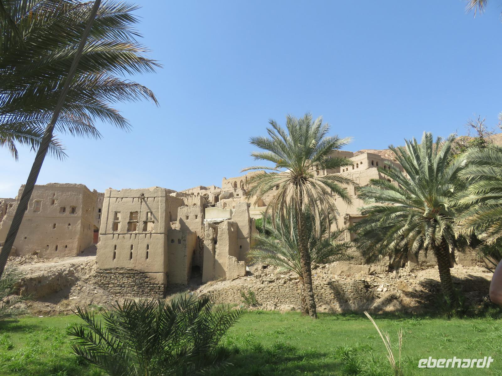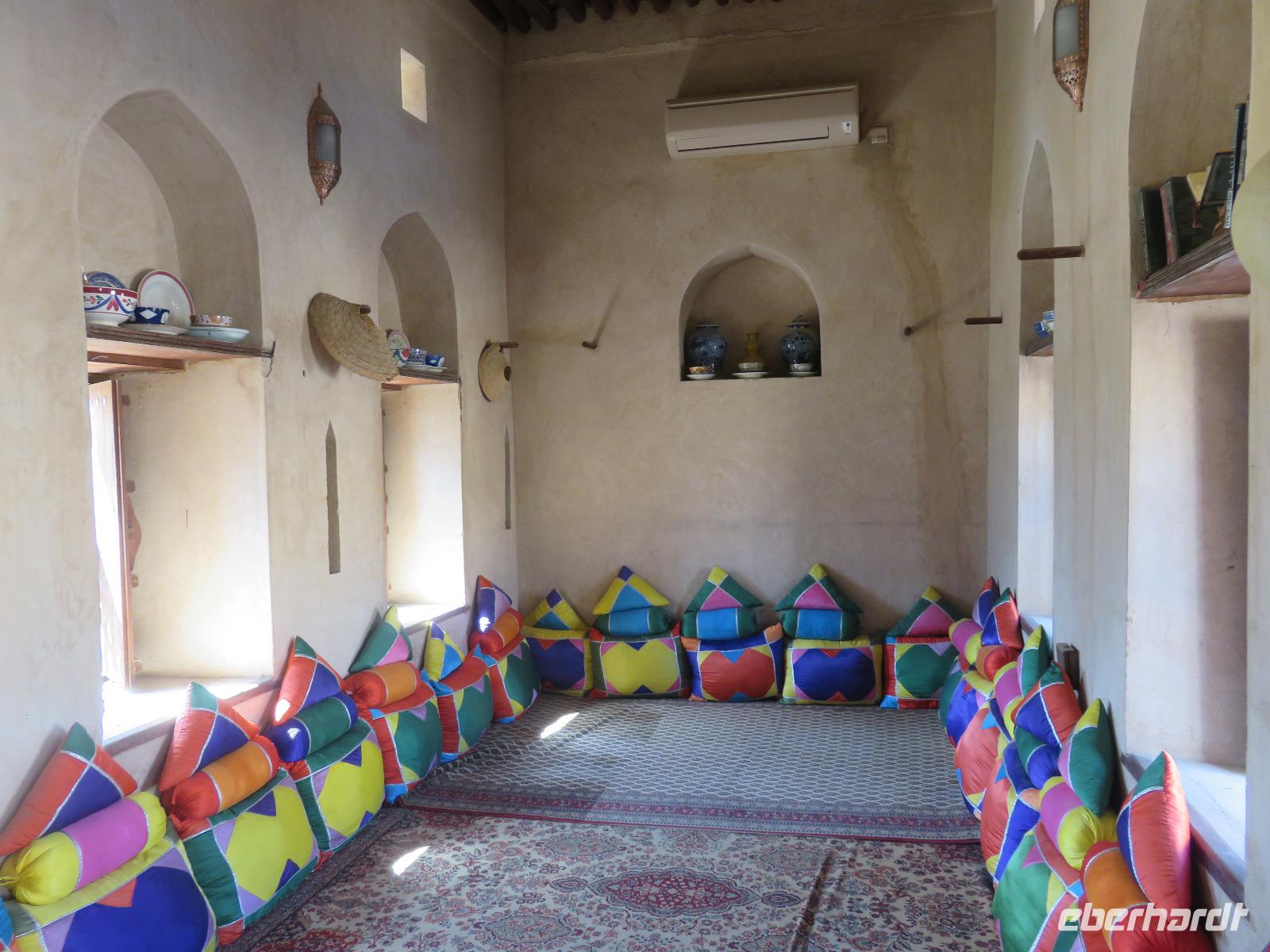 Am Vormittag besuchen wir die Festung Jabrin. Tawfiq erzählt uns die wichtigsten Details aus der Geschichte des Omans und der Festung. Das imposante Bauwerk wurde 1670 unter Bil'arub bin Sultan al- Ya'aruba erbaut. Er wurde 1688 zum Imam gewählt und legte die Hauptstadt des Omans nach Nizwa und residierte auf Jarbin. Bil'arub war Förderer und Finanzier der Wissenschaftler und Gelehrten seiner Zeit. Der Palast wollte er eigentlich als einen Ort des Wissens und als eine prachtvolle Wohnresidenz etablieren. Allerdings musste er sich immer wieder mit seinem Bruder Saif auseinandersetzen. Dieser beanspruchte ebenfalls den Imamtitel und die Herrschermacht. Deshalb baute man den Palast zur Festung aus. Die Festung lang lange Zeit im Dornröschenschlaf. Mit viel Liebe zum Detail wurde Sie im 20. Jahrhundert restauriert. Wir erhalten eine gute Vorstellung, wie der Imam im 17. Jahrhundert regierte. Uns fasziniert die reiche Ausstattung der Räume mit wunderschönen geschnitzten und bemalten Deckenverzierungen und verschiedenen architektonischen Kleinoden. Unsere Reise führt uns zum Fort Bahla. Diese ist das größte Lehmfort im Oman und gehört gleichzeitig zum UNESCO Weltkulturerbe. Es wurde nach seinem Erbauer Hisn Tamah benannt. Das Fort wurde im 17. Jahrhundert auf den Resten einer älteren persischen Anlage erbaut. Die Außenmauern wurden ungewöhnlich hoch aus Lehmziegeln mit Natursteinen errichtet. Es entstand über mehrere Epochen in unterschiedlichen Bauabschnitten. Die frühesten Teile gehen auf die vorislamische Zeit zurück. Die Restaurierung der großen Anlage dauerte fast 20 Jahre. Auch auf Grund der Unterstützung deutscher Fachleute konnte das Fort 2013 wieder eröffnet werden. Am Mittag fahren wir mit den Jeeps weiter in das Jebel Akhbar-Gebirge. Ein kurzer Fotostopp ermöglicht uns einen schönen Blick auf das alte Lehmdorf Guhl mit den dazugehörigen Feldern. Die Straße führt uns zunächst über Asphalt und mit einigen Serpentinen hinauf auf ca. 800 Meter Höhe. Nun geht es off Road über die Piste weiter auf 2.200 Meter. Vom Aussichtspunkt eröffnet sich uns ein grandioser Blick in den fast 1000 Meter tiefen Grand Canyon Omans - den Jebel Shams. Die Schlucht ist der drittgrößte Canyon der Welt. Nachdem wir ausgiebig geschaut und fotografiert haben, zeigen unsere Chauffeure wieder ihr ganzes Können bei der Rückfahrt hinab. Anschließend fahren wir Richtung Al Hamra. Unterwegs legen wir eine Mittagspause in einem typischen omanischen Restaurant ein. Taufiq hat uns empfohlen, unbedingt Ziege nach omanischer Art zubereitet zu probieren. Wir bestellen also alle das Gericht und sind begeistert, denn das gebratene Ziegenfleisch mit Reise schmeckt sehr lecker. Gut gestärkt reisen wir zu einem Aussichtspunkt oberhalb von Al Hamra. Hier bietet sich ein schöner Blick auf die alte Stadt und die sie umgebenden Palmengärten. Nun geht es hinab nach Al Hamra. Wir spazieren durch die engen Gassen zwischen den teilweise bis zu vierhundert Jahre alten Lehmhäusern. Interessant sind die verschiedenen Bauweisen der Häuser mit teilweise reichen Verzierungen und unterschiedlich kunstvoll gestalteten Fenstern und Türen. Bis 2003 war der Ort noch bewohnt. Da sich der Großteil der Häuser in Privatbesitz befindet, ist das Dorf leider dem Verfall preisgegeben. Es fehlt einfach das Geld, um die Häuser zu erhalten. Unsere Tour führt uns zu einem Aussichtspunkt, von dem wir einen schönen Blick auf das Oasendorf Misfah Al Abreen haben. Es liegt an einem Hang in mitten von Palmengärten und Terrassenfeldern. Anschließend besuchen wir auch dieses Dorf mit interessanten Häusern aus Stein und einem ausgeklügelten Bewässerungssystem für die vielen Pflanzen und Palmen. Wir entdecken Bananenstauden, Granatapfelbäume, Kakaopflanzen und vieles mehr. Anschließend geht es zurück zum Hotel.