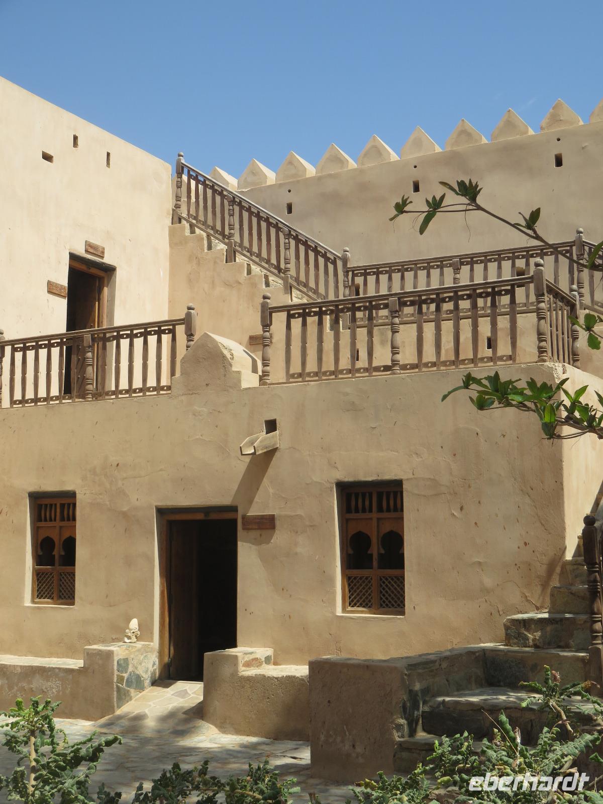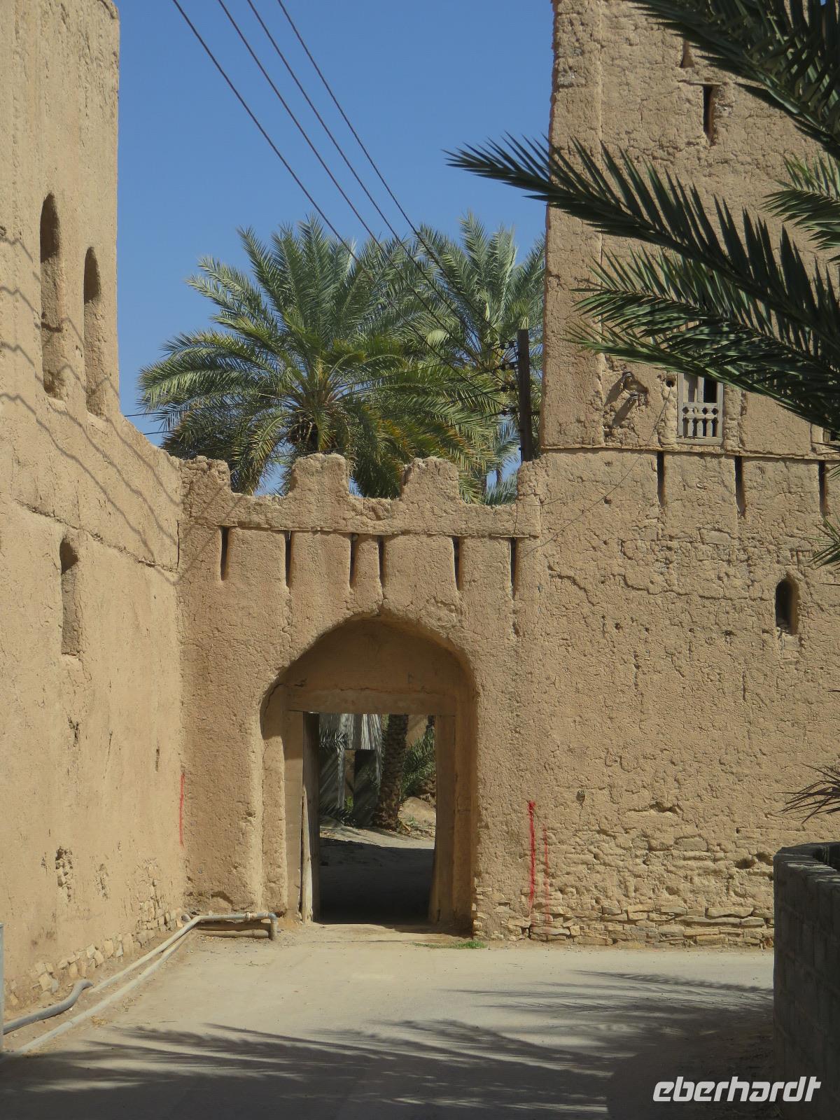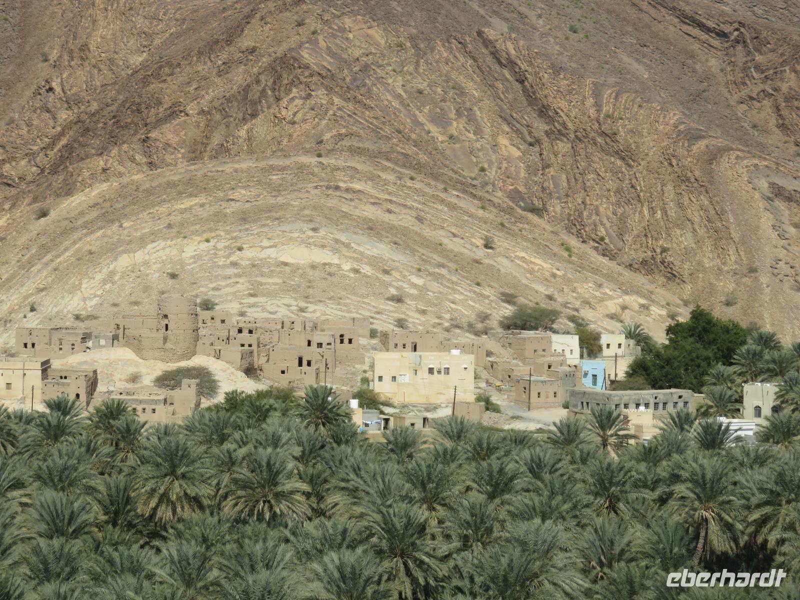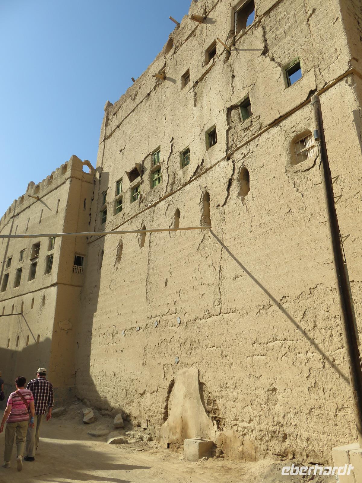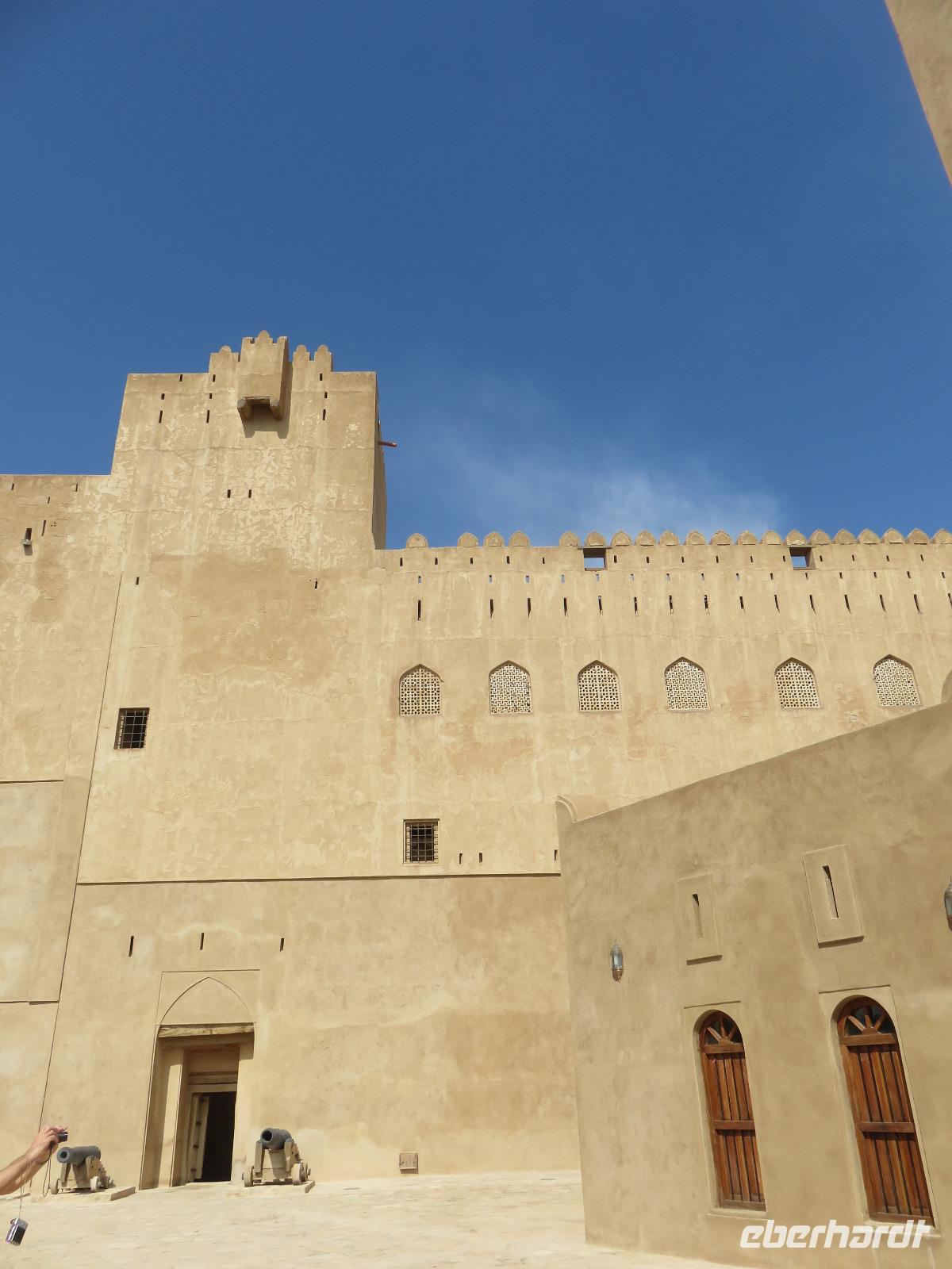 Am Vormittag besuchen wir die Festung Jabrin. Tawfiq erzählt uns die wichtigsten Details aus der Geschichte des Omans und der Festung. Das imposante Bauwerk wurde 1670 unter Bil'arub bin Sultan al- Ya'aruba erbaut. Er wurde 1688 zum Imam gewählt und legte die Hauptstadt des Omans nach Nizwa und residierte auf Jarbin. Bil'arub war Förderer und Finanzier der Wissenschaftler und Gelehrten seiner Zeit. Der Palast wollte er eigentlich als einen Ort des Wissens und als eine prachtvolle Wohnresidenz etablieren. Allerdings musste er sich immer wieder mit seinem Bruder Saif auseinandersetzen. Dieser beanspruchte ebenfalls den Imamtitel und die Herrschermacht. Deshalb baute man den Palast zur Festung aus. Die Festung lang lange Zeit im Dornröschenschlaf. Mit viel Liebe zum Detail wurde Sie im 20. Jahrhundert restauriert. Wir erhalten eine gute Vorstellung, wie der Imam im 17. Jahrhundert regierte. Uns fasziniert die reiche Ausstattung der Räume mit wunderschönen geschnitzten und bemalten Deckenverzierungen und verschiedenen architektonischen Kleinoden. Unsere Reise führt uns zum Fort Bahla. Diese ist das größte Lehmfort im Oman und gehört gleichzeitig zum UNESCO Weltkulturerbe. Es wurde nach seinem Erbauer Hisn Tamah benannt. Das Fort wurde im 17. Jahrhundert auf den Resten einer älteren persischen Anlage erbaut. Die Außenmauern wurden ungewöhnlich hoch aus Lehmziegeln mit Natursteinen errichtet. Es entstand über mehrere Epochen in unterschiedlichen Bauabschnitten. Die frühesten Teile gehen auf die vorislamische Zeit zurück. Die Restaurierung der großen Anlage dauerte fast 20 Jahre. Auch auf Grund der Unterstützung deutscher Fachleute konnte das Fort 2013 wieder eröffnet werden. Am Mittag fahren wir mit den Jeeps weiter in das Jebel Akhbar-Gebirge. Ein kurzer Fotostopp ermöglicht uns einen schönen Blick auf das alte Lehmdorf Guhl mit den dazugehörigen Feldern. Die Straße führt uns zunächst über Asphalt und mit einigen Serpentinen hinauf auf ca. 800 Meter Höhe. Nun geht es off Road über die Piste weiter auf 2.200 Meter. Vom Aussichtspunkt eröffnet sich uns ein grandioser Blick in den fast 1000 Meter tiefen Grand Canyon Omans - den Jebel Shams. Die Schlucht ist der drittgrößte Canyon der Welt. Nachdem wir ausgiebig geschaut und fotografiert haben, zeigen unsere Chauffeure wieder ihr ganzes Können bei der Rückfahrt hinab. Anschließend fahren wir Richtung Al Hamra. Unterwegs legen wir eine Mittagspause in einem typischen omanischen Restaurant ein. Taufiq hat uns empfohlen, unbedingt Ziege nach omanischer Art zubereitet zu probieren. Wir bestellen also alle das Gericht und sind begeistert, denn das gebratene Ziegenfleisch mit Reise schmeckt sehr lecker. Gut gestärkt reisen wir zu einem Aussichtspunkt oberhalb von Al Hamra. Hier bietet sich ein schöner Blick auf die alte Stadt und die sie umgebenden Palmengärten. Nun geht es hinab nach Al Hamra. Wir spazieren durch die engen Gassen zwischen den teilweise bis zu vierhundert Jahre alten Lehmhäusern. Interessant sind die verschiedenen Bauweisen der Häuser mit teilweise reichen Verzierungen und unterschiedlich kunstvoll gestalteten Fenstern und Türen. Bis 2003 war der Ort noch bewohnt. Da sich der Großteil der Häuser in Privatbesitz befindet, ist das Dorf leider dem Verfall preisgegeben. Es fehlt einfach das Geld, um die Häuser zu erhalten. Unsere Tour führt uns zu einem Aussichtspunkt, von dem wir einen schönen Blick auf das Oasendorf Misfah Al Abreen haben. Es liegt an einem Hang in mitten von Palmengärten und Terrassenfeldern. Anschließend besuchen wir auch dieses Dorf mit interessanten Häusern aus Stein und einem ausgeklügelten Bewässerungssystem für die vielen Pflanzen und Palmen. Wir entdecken Bananenstauden, Granatapfelbäume, Kakaopflanzen und vieles mehr. Anschließend geht es zurück zum Hotel.