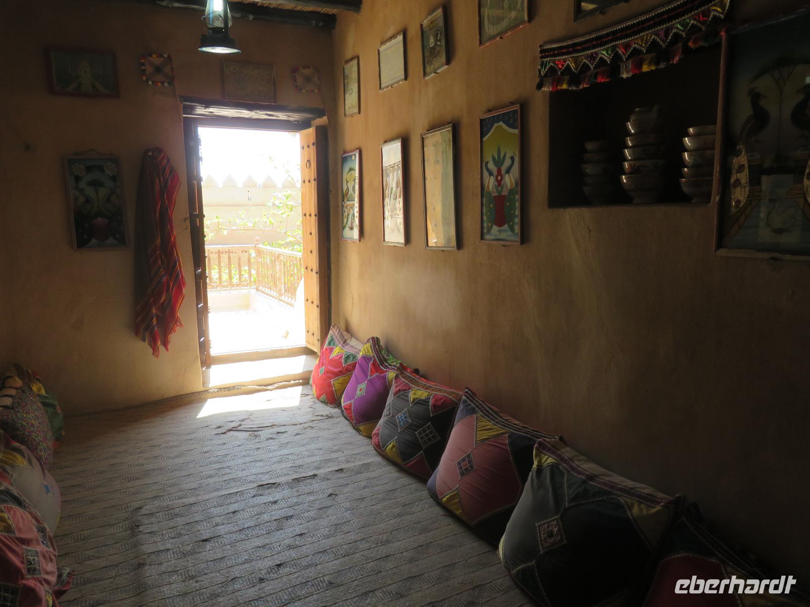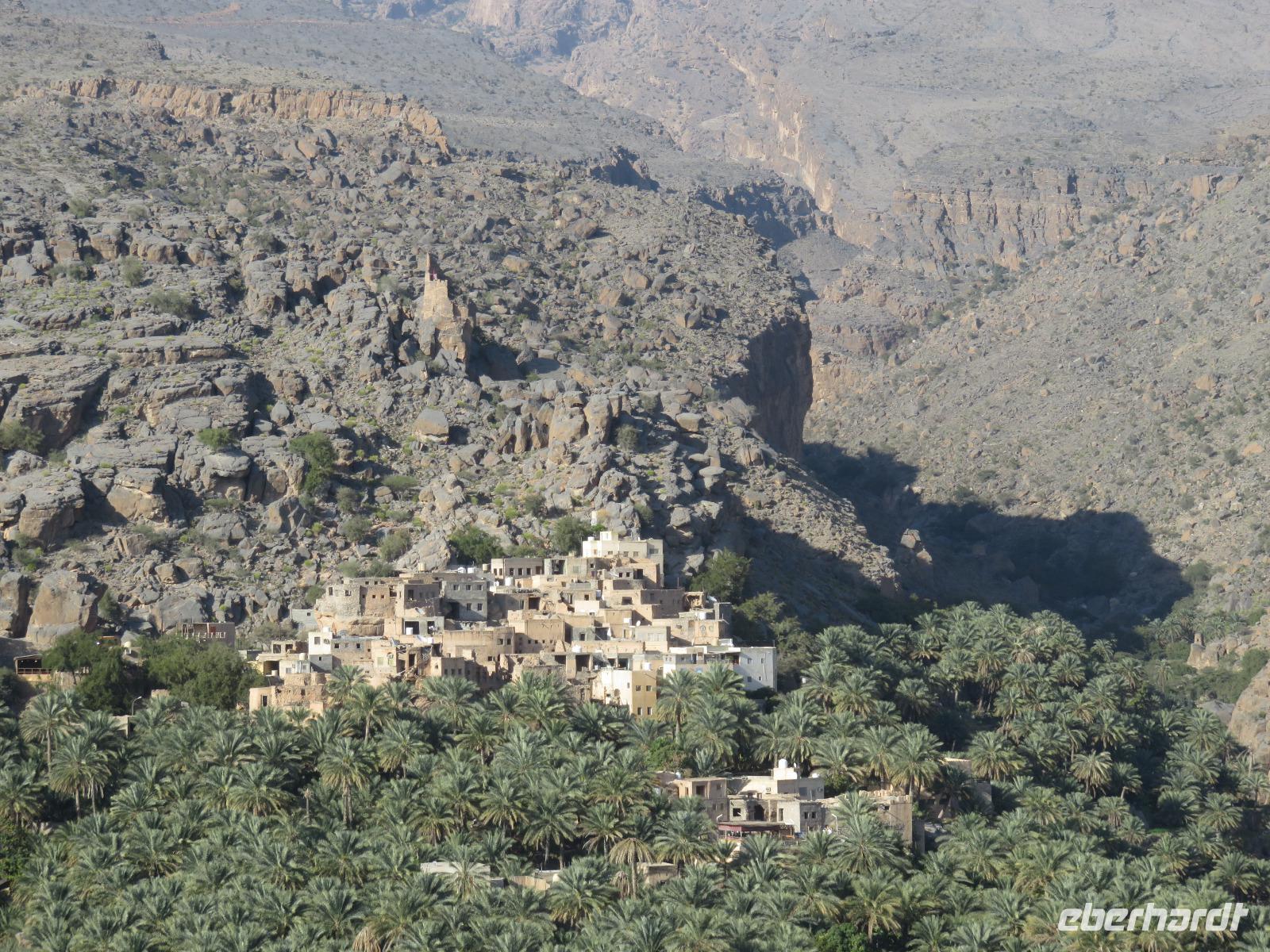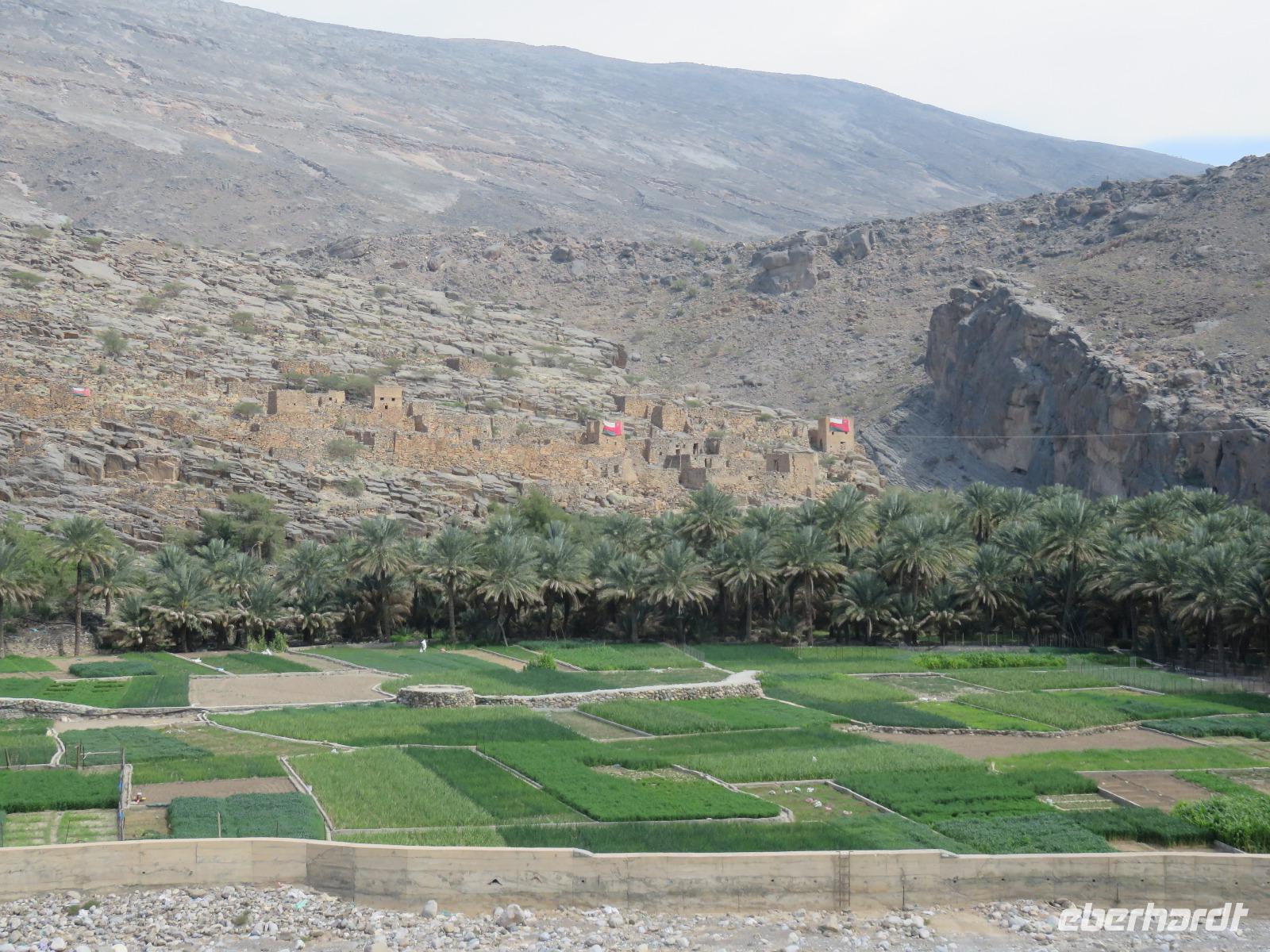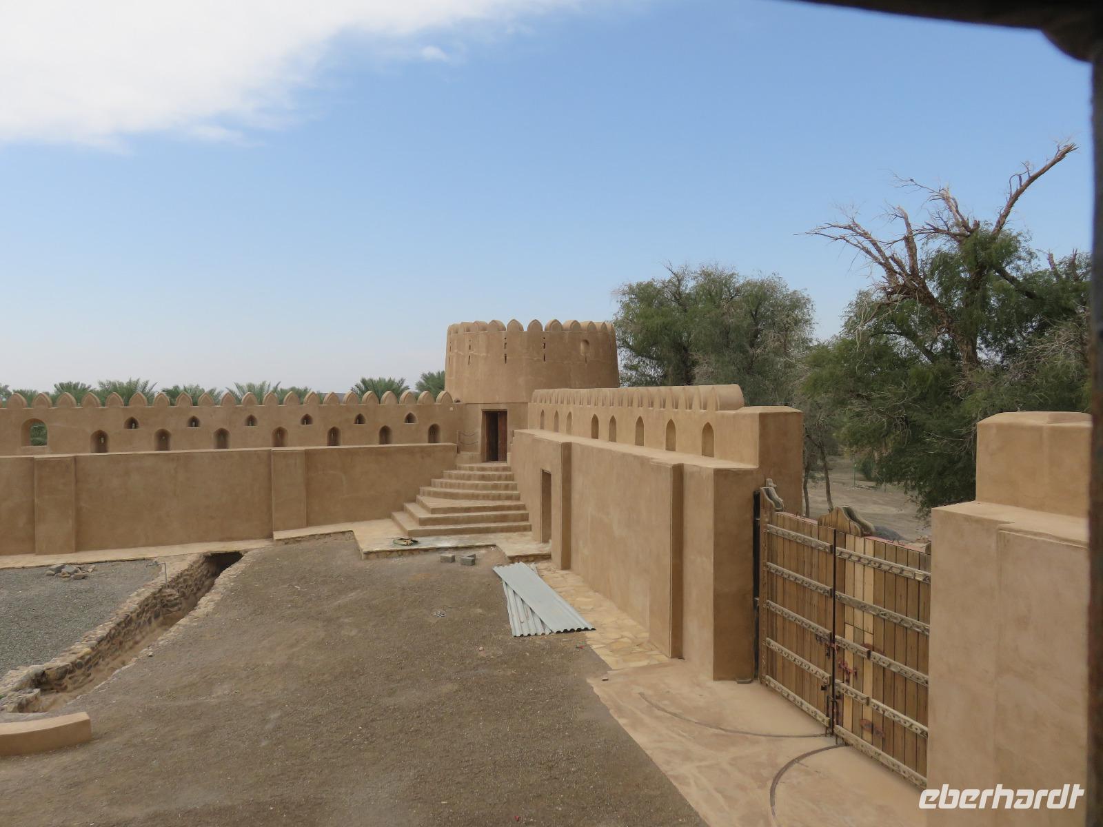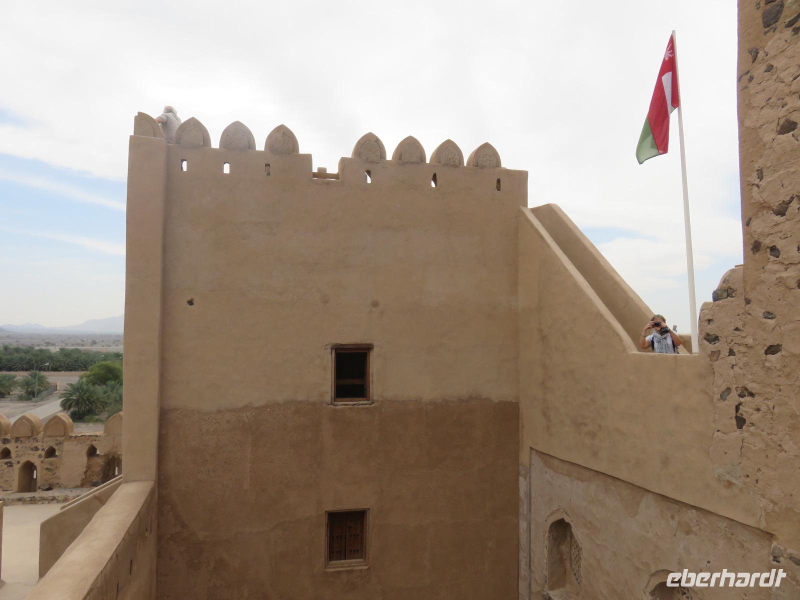 Am Vormittag besuchen wir die Festung Jabrin. Tawfiq erzählt uns die wichtigsten Details aus der Geschichte des Omans und der Festung. Das imposante Bauwerk wurde 1670 unter Bil'arub bin Sultan al- Ya'aruba erbaut. Er wurde 1688 zum Imam gewählt und legte die Hauptstadt des Omans nach Nizwa und residierte auf Jarbin. Bil'arub war Förderer und Finanzier der Wissenschaftler und Gelehrten seiner Zeit. Der Palast wollte er eigentlich als einen Ort des Wissens und als eine prachtvolle Wohnresidenz etablieren. Allerdings musste er sich immer wieder mit seinem Bruder Saif auseinandersetzen. Dieser beanspruchte ebenfalls den Imamtitel und die Herrschermacht. Deshalb baute man den Palast zur Festung aus. Die Festung lang lange Zeit im Dornröschenschlaf. Mit viel Liebe zum Detail wurde Sie im 20. Jahrhundert restauriert. Wir erhalten eine gute Vorstellung, wie der Imam im 17. Jahrhundert regierte. Uns fasziniert die reiche Ausstattung der Räume mit wunderschönen geschnitzten und bemalten Deckenverzierungen und verschiedenen architektonischen Kleinoden. Unsere Reise führt uns zum Fort Bahla. Diese ist das größte Lehmfort im Oman und gehört gleichzeitig zum UNESCO Weltkulturerbe. Es wurde nach seinem Erbauer Hisn Tamah benannt. Das Fort wurde im 17. Jahrhundert auf den Resten einer älteren persischen Anlage erbaut. Die Außenmauern wurden ungewöhnlich hoch aus Lehmziegeln mit Natursteinen errichtet. Es entstand über mehrere Epochen in unterschiedlichen Bauabschnitten. Die frühesten Teile gehen auf die vorislamische Zeit zurück. Die Restaurierung der großen Anlage dauerte fast 20 Jahre. Auch auf Grund der Unterstützung deutscher Fachleute konnte das Fort 2013 wieder eröffnet werden. Am Mittag fahren wir mit den Jeeps weiter in das Jebel Akhbar-Gebirge. Ein kurzer Fotostopp ermöglicht uns einen schönen Blick auf das alte Lehmdorf Guhl mit den dazugehörigen Feldern. Die Straße führt uns zunächst über Asphalt und mit einigen Serpentinen hinauf auf ca. 800 Meter Höhe. Nun geht es off Road über die Piste weiter auf 2.200 Meter. Vom Aussichtspunkt eröffnet sich uns ein grandioser Blick in den fast 1000 Meter tiefen Grand Canyon Omans - den Jebel Shams. Die Schlucht ist der drittgrößte Canyon der Welt. Nachdem wir ausgiebig geschaut und fotografiert haben, zeigen unsere Chauffeure wieder ihr ganzes Können bei der Rückfahrt hinab. Anschließend fahren wir Richtung Al Hamra. Unterwegs legen wir eine Mittagspause in einem typischen omanischen Restaurant ein. Taufiq hat uns empfohlen, unbedingt Ziege nach omanischer Art zubereitet zu probieren. Wir bestellen also alle das Gericht und sind begeistert, denn das gebratene Ziegenfleisch mit Reise schmeckt sehr lecker. Gut gestärkt reisen wir zu einem Aussichtspunkt oberhalb von Al Hamra. Hier bietet sich ein schöner Blick auf die alte Stadt und die sie umgebenden Palmengärten. Nun geht es hinab nach Al Hamra. Wir spazieren durch die engen Gassen zwischen den teilweise bis zu vierhundert Jahre alten Lehmhäusern. Interessant sind die verschiedenen Bauweisen der Häuser mit teilweise reichen Verzierungen und unterschiedlich kunstvoll gestalteten Fenstern und Türen. Bis 2003 war der Ort noch bewohnt. Da sich der Großteil der Häuser in Privatbesitz befindet, ist das Dorf leider dem Verfall preisgegeben. Es fehlt einfach das Geld, um die Häuser zu erhalten. Unsere Tour führt uns zu einem Aussichtspunkt, von dem wir einen schönen Blick auf das Oasendorf Misfah Al Abreen haben. Es liegt an einem Hang in mitten von Palmengärten und Terrassenfeldern. Anschließend besuchen wir auch dieses Dorf mit interessanten Häusern aus Stein und einem ausgeklügelten Bewässerungssystem für die vielen Pflanzen und Palmen. Wir entdecken Bananenstauden, Granatapfelbäume, Kakaopflanzen und vieles mehr. Anschließend geht es zurück zum Hotel.