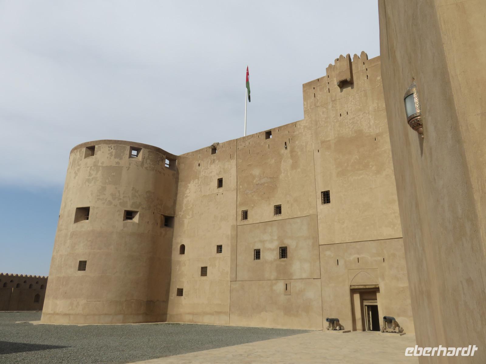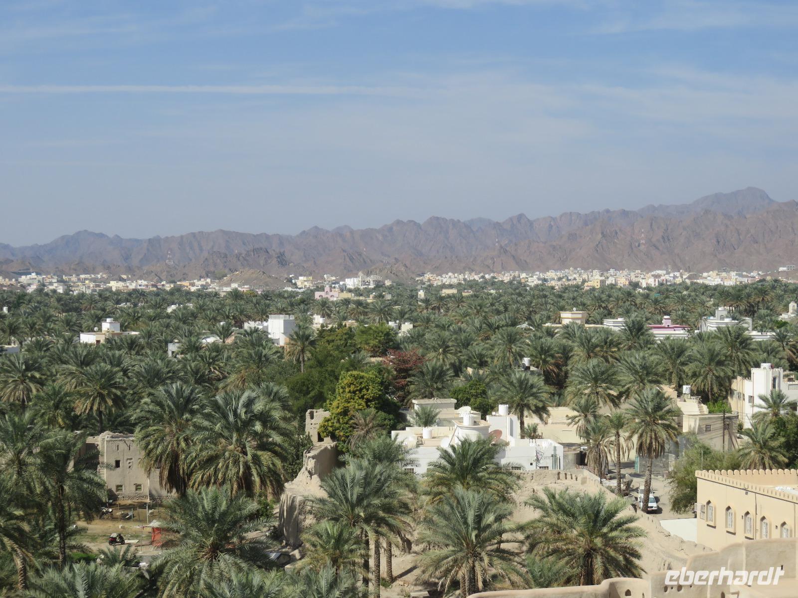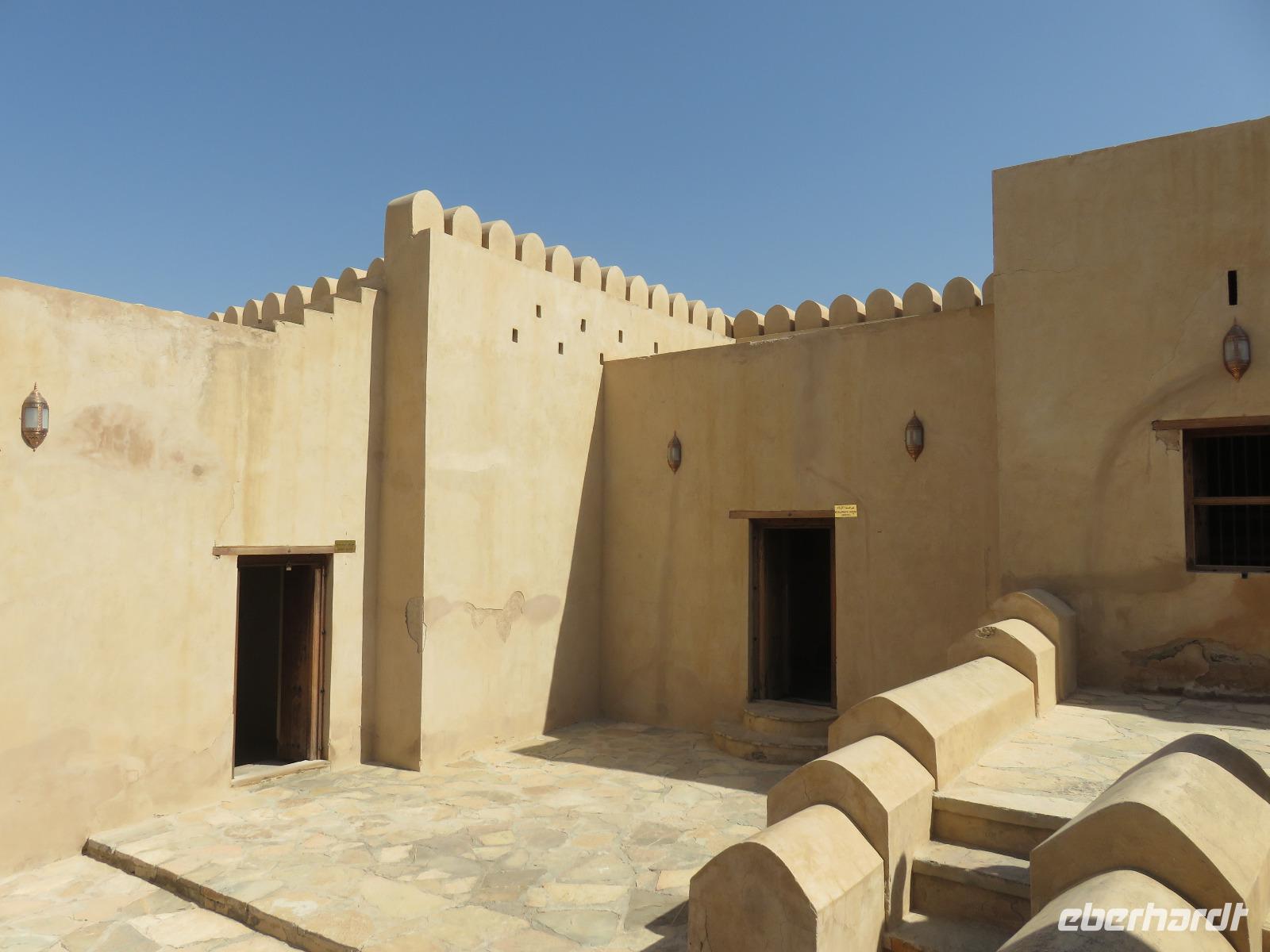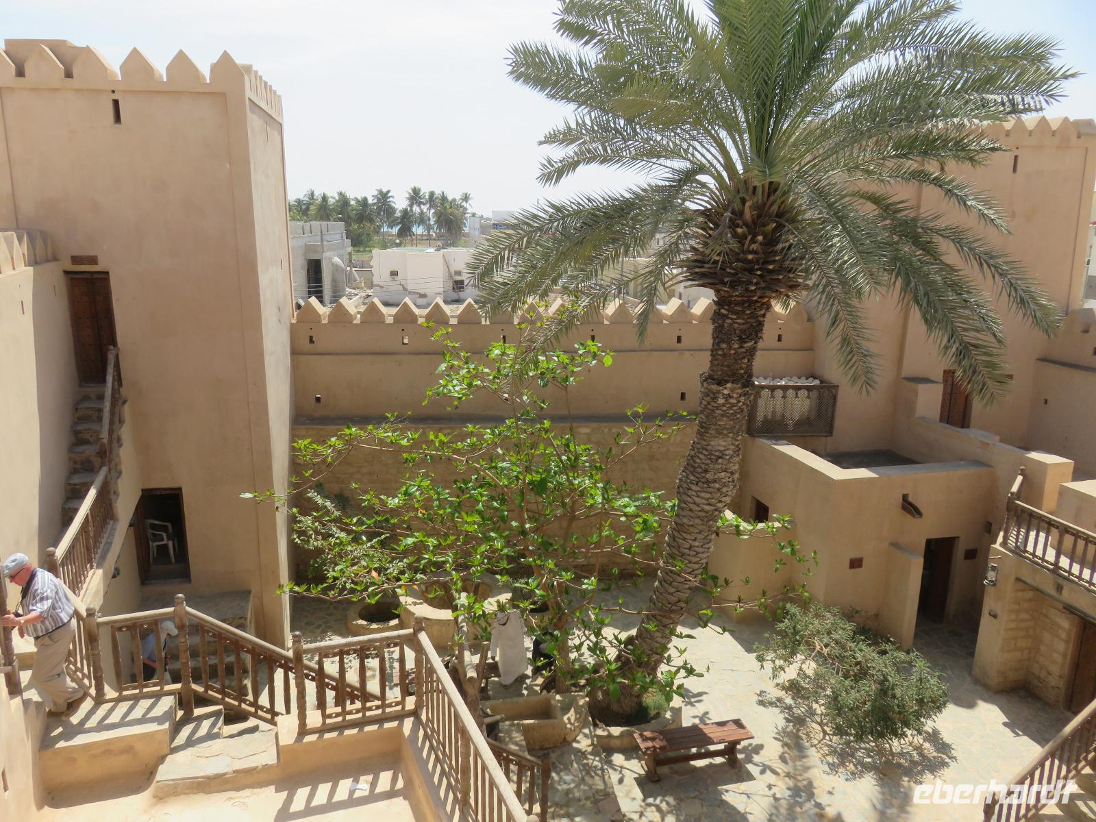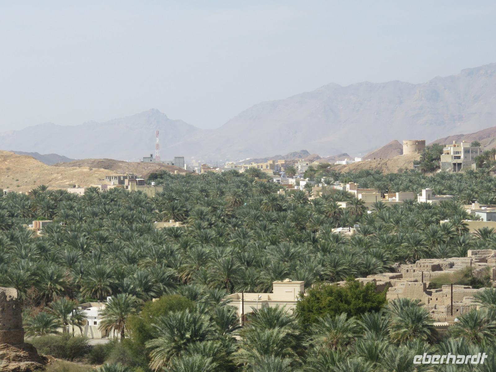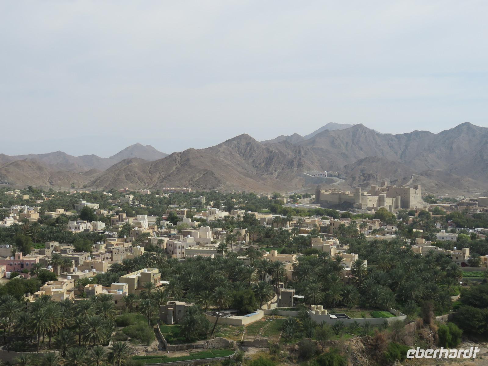 Am Vormittag besuchen wir die Festung Jabrin. Tawfiq erzählt uns die wichtigsten Details aus der Geschichte des Omans und der Festung. Das imposante Bauwerk wurde 1670 unter Bil'arub bin Sultan al- Ya'aruba erbaut. Er wurde 1688 zum Imam gewählt und legte die Hauptstadt des Omans nach Nizwa und residierte auf Jarbin. Bil'arub war Förderer und Finanzier der Wissenschaftler und Gelehrten seiner Zeit. Der Palast wollte er eigentlich als einen Ort des Wissens und als eine prachtvolle Wohnresidenz etablieren. Allerdings musste er sich immer wieder mit seinem Bruder Saif auseinandersetzen. Dieser beanspruchte ebenfalls den Imamtitel und die Herrschermacht. Deshalb baute man den Palast zur Festung aus. Die Festung lang lange Zeit im Dornröschenschlaf. Mit viel Liebe zum Detail wurde Sie im 20. Jahrhundert restauriert. Wir erhalten eine gute Vorstellung, wie der Imam im 17. Jahrhundert regierte. Uns fasziniert die reiche Ausstattung der Räume mit wunderschönen geschnitzten und bemalten Deckenverzierungen und verschiedenen architektonischen Kleinoden. Unsere Reise führt uns zum Fort Bahla. Diese ist das größte Lehmfort im Oman und gehört gleichzeitig zum UNESCO Weltkulturerbe. Es wurde nach seinem Erbauer Hisn Tamah benannt. Das Fort wurde im 17. Jahrhundert auf den Resten einer älteren persischen Anlage erbaut. Die Außenmauern wurden ungewöhnlich hoch aus Lehmziegeln mit Natursteinen errichtet. Es entstand über mehrere Epochen in unterschiedlichen Bauabschnitten. Die frühesten Teile gehen auf die vorislamische Zeit zurück. Die Restaurierung der großen Anlage dauerte fast 20 Jahre. Auch auf Grund der Unterstützung deutscher Fachleute konnte das Fort 2013 wieder eröffnet werden. Am Mittag fahren wir mit den Jeeps weiter in das Jebel Akhbar-Gebirge. Ein kurzer Fotostopp ermöglicht uns einen schönen Blick auf das alte Lehmdorf Guhl mit den dazugehörigen Feldern. Die Straße führt uns zunächst über Asphalt und mit einigen Serpentinen hinauf auf ca. 800 Meter Höhe. Nun geht es off Road über die Piste weiter auf 2.200 Meter. Vom Aussichtspunkt eröffnet sich uns ein grandioser Blick in den fast 1000 Meter tiefen Grand Canyon Omans - den Jebel Shams. Die Schlucht ist der drittgrößte Canyon der Welt. Nachdem wir ausgiebig geschaut und fotografiert haben, zeigen unsere Chauffeure wieder ihr ganzes Können bei der Rückfahrt hinab. Anschließend fahren wir Richtung Al Hamra. Unterwegs legen wir eine Mittagspause in einem typischen omanischen Restaurant ein. Taufiq hat uns empfohlen, unbedingt Ziege nach omanischer Art zubereitet zu probieren. Wir bestellen also alle das Gericht und sind begeistert, denn das gebratene Ziegenfleisch mit Reise schmeckt sehr lecker. Gut gestärkt reisen wir zu einem Aussichtspunkt oberhalb von Al Hamra. Hier bietet sich ein schöner Blick auf die alte Stadt und die sie umgebenden Palmengärten. Nun geht es hinab nach Al Hamra. Wir spazieren durch die engen Gassen zwischen den teilweise bis zu vierhundert Jahre alten Lehmhäusern. Interessant sind die verschiedenen Bauweisen der Häuser mit teilweise reichen Verzierungen und unterschiedlich kunstvoll gestalteten Fenstern und Türen. Bis 2003 war der Ort noch bewohnt. Da sich der Großteil der Häuser in Privatbesitz befindet, ist das Dorf leider dem Verfall preisgegeben. Es fehlt einfach das Geld, um die Häuser zu erhalten. Unsere Tour führt uns zu einem Aussichtspunkt, von dem wir einen schönen Blick auf das Oasendorf Misfah Al Abreen haben. Es liegt an einem Hang in mitten von Palmengärten und Terrassenfeldern. Anschließend besuchen wir auch dieses Dorf mit interessanten Häusern aus Stein und einem ausgeklügelten Bewässerungssystem für die vielen Pflanzen und Palmen. Wir entdecken Bananenstauden, Granatapfelbäume, Kakaopflanzen und vieles mehr. Anschließend geht es zurück zum Hotel.
