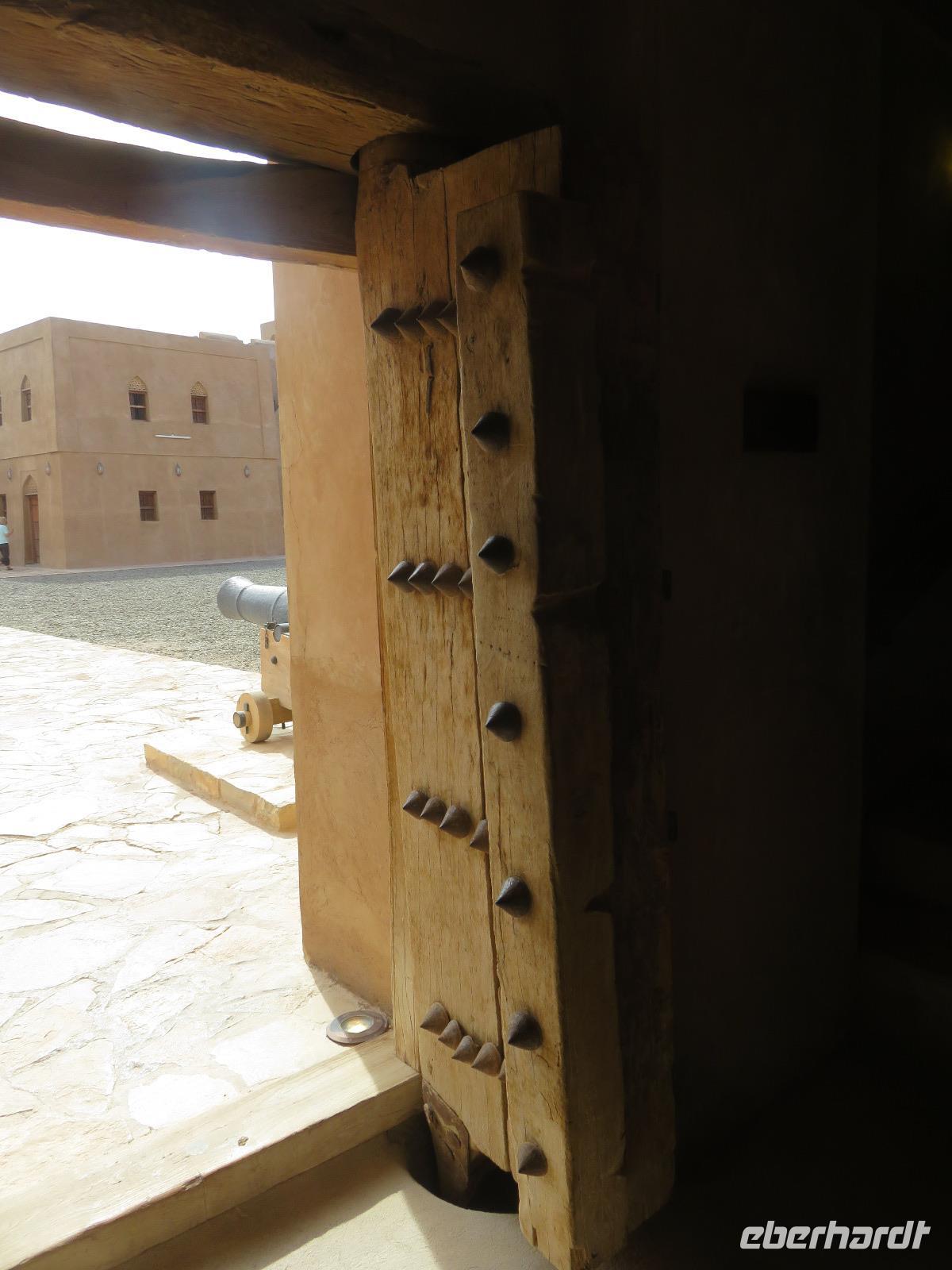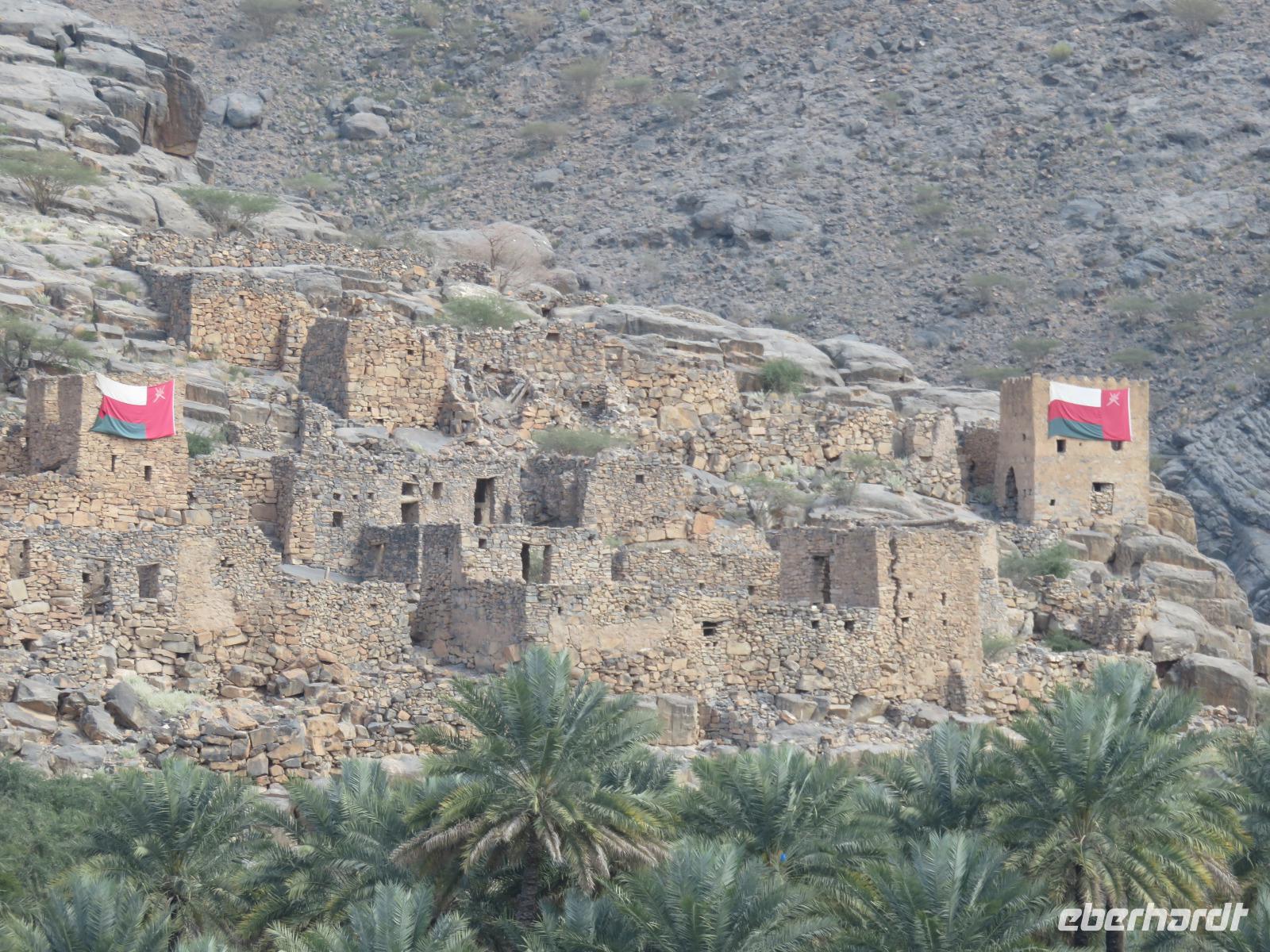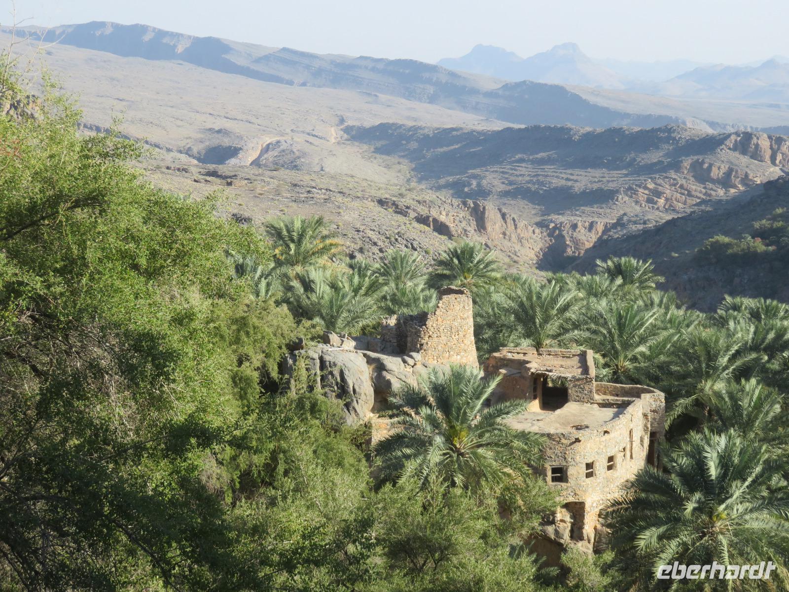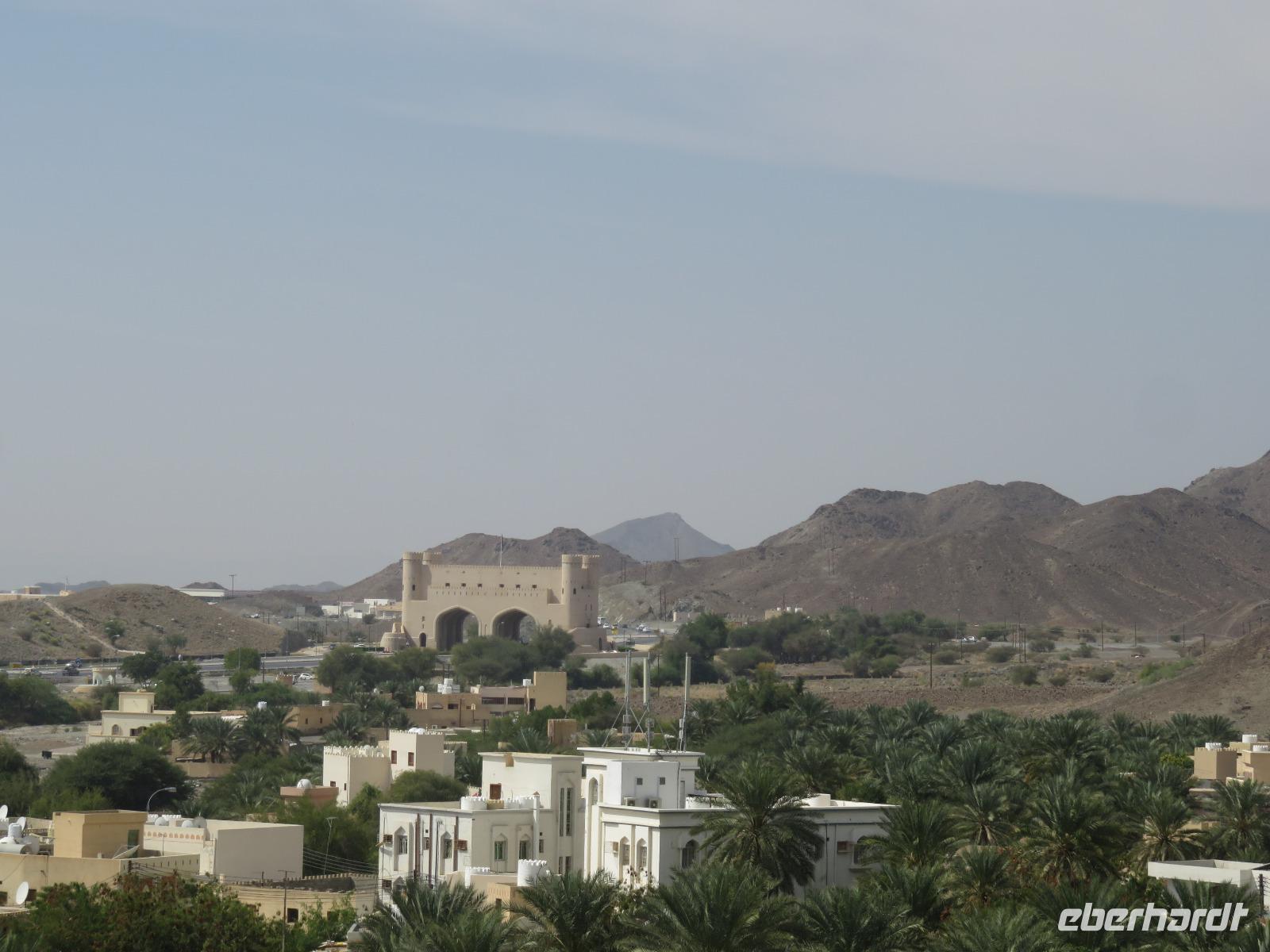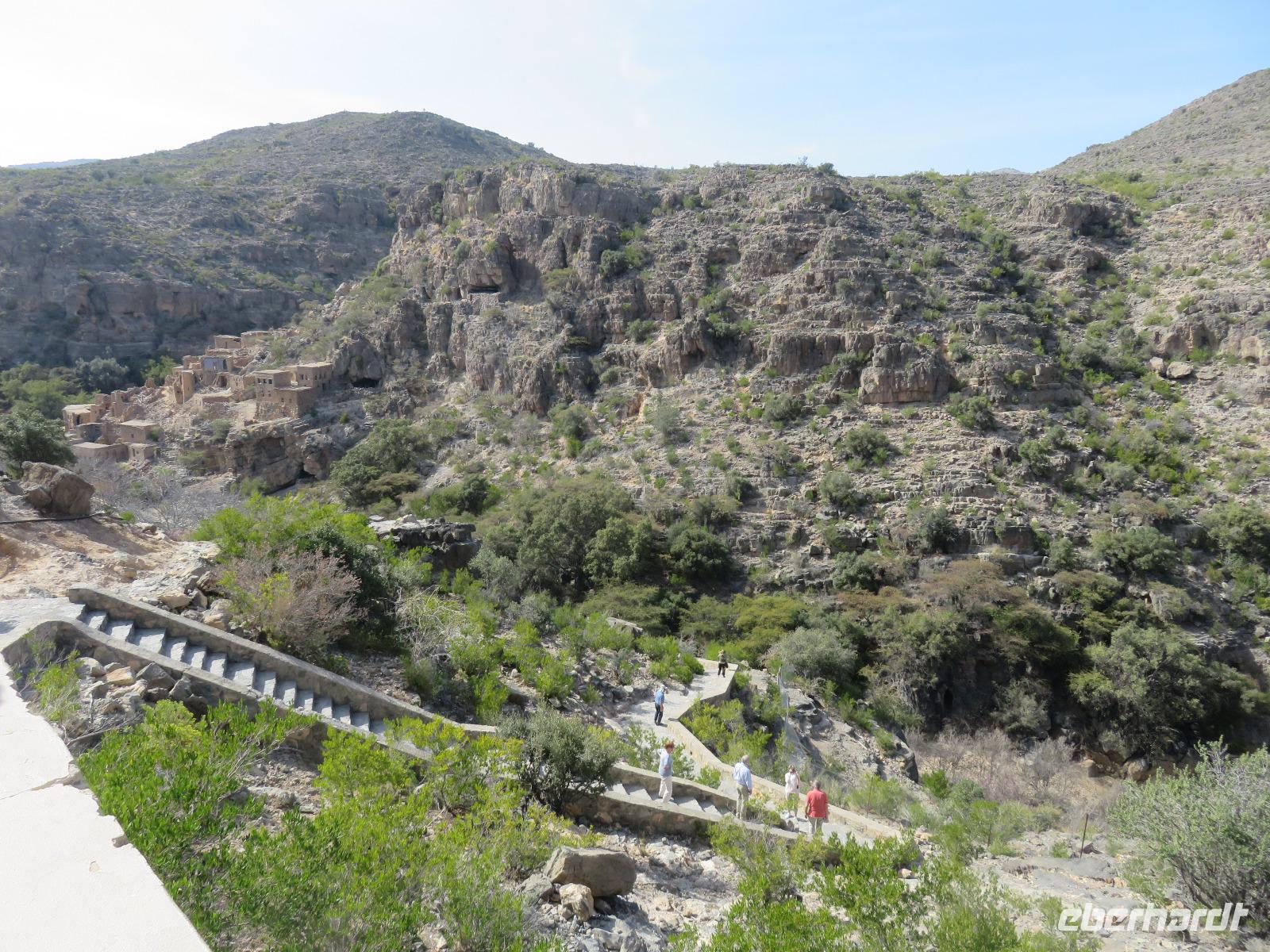 Am Vormittag besuchen wir die Festung Jabrin. Tawfiq erzählt uns die wichtigsten Details aus der Geschichte des Omans und der Festung. Das imposante Bauwerk wurde 1670 unter Bil'arub bin Sultan al- Ya'aruba erbaut. Er wurde 1688 zum Imam gewählt und legte die Hauptstadt des Omans nach Nizwa und residierte auf Jarbin. Bil'arub war Förderer und Finanzier der Wissenschaftler und Gelehrten seiner Zeit. Der Palast wollte er eigentlich als einen Ort des Wissens und als eine prachtvolle Wohnresidenz etablieren. Allerdings musste er sich immer wieder mit seinem Bruder Saif auseinandersetzen. Dieser beanspruchte ebenfalls den Imamtitel und die Herrschermacht. Deshalb baute man den Palast zur Festung aus. Die Festung lang lange Zeit im Dornröschenschlaf. Mit viel Liebe zum Detail wurde Sie im 20. Jahrhundert restauriert. Wir erhalten eine gute Vorstellung, wie der Imam im 17. Jahrhundert regierte. Uns fasziniert die reiche Ausstattung der Räume mit wunderschönen geschnitzten und bemalten Deckenverzierungen und verschiedenen architektonischen Kleinoden. Unsere Reise führt uns zum Fort Bahla. Diese ist das größte Lehmfort im Oman und gehört gleichzeitig zum UNESCO Weltkulturerbe. Es wurde nach seinem Erbauer Hisn Tamah benannt. Das Fort wurde im 17. Jahrhundert auf den Resten einer älteren persischen Anlage erbaut. Die Außenmauern wurden ungewöhnlich hoch aus Lehmziegeln mit Natursteinen errichtet. Es entstand über mehrere Epochen in unterschiedlichen Bauabschnitten. Die frühesten Teile gehen auf die vorislamische Zeit zurück. Die Restaurierung der großen Anlage dauerte fast 20 Jahre. Auch auf Grund der Unterstützung deutscher Fachleute konnte das Fort 2013 wieder eröffnet werden. Am Mittag fahren wir mit den Jeeps weiter in das Jebel Akhbar-Gebirge. Ein kurzer Fotostopp ermöglicht uns einen schönen Blick auf das alte Lehmdorf Guhl mit den dazugehörigen Feldern. Die Straße führt uns zunächst über Asphalt und mit einigen Serpentinen hinauf auf ca. 800 Meter Höhe. Nun geht es off Road über die Piste weiter auf 2.200 Meter. Vom Aussichtspunkt eröffnet sich uns ein grandioser Blick in den fast 1000 Meter tiefen Grand Canyon Omans - den Jebel Shams. Die Schlucht ist der drittgrößte Canyon der Welt. Nachdem wir ausgiebig geschaut und fotografiert haben, zeigen unsere Chauffeure wieder ihr ganzes Können bei der Rückfahrt hinab. Anschließend fahren wir Richtung Al Hamra. Unterwegs legen wir eine Mittagspause in einem typischen omanischen Restaurant ein. Taufiq hat uns empfohlen, unbedingt Ziege nach omanischer Art zubereitet zu probieren. Wir bestellen also alle das Gericht und sind begeistert, denn das gebratene Ziegenfleisch mit Reise schmeckt sehr lecker. Gut gestärkt reisen wir zu einem Aussichtspunkt oberhalb von Al Hamra. Hier bietet sich ein schöner Blick auf die alte Stadt und die sie umgebenden Palmengärten. Nun geht es hinab nach Al Hamra. Wir spazieren durch die engen Gassen zwischen den teilweise bis zu vierhundert Jahre alten Lehmhäusern. Interessant sind die verschiedenen Bauweisen der Häuser mit teilweise reichen Verzierungen und unterschiedlich kunstvoll gestalteten Fenstern und Türen. Bis 2003 war der Ort noch bewohnt. Da sich der Großteil der Häuser in Privatbesitz befindet, ist das Dorf leider dem Verfall preisgegeben. Es fehlt einfach das Geld, um die Häuser zu erhalten. Unsere Tour führt uns zu einem Aussichtspunkt, von dem wir einen schönen Blick auf das Oasendorf Misfah Al Abreen haben. Es liegt an einem Hang in mitten von Palmengärten und Terrassenfeldern. Anschließend besuchen wir auch dieses Dorf mit interessanten Häusern aus Stein und einem ausgeklügelten Bewässerungssystem für die vielen Pflanzen und Palmen. Wir entdecken Bananenstauden, Granatapfelbäume, Kakaopflanzen und vieles mehr. Anschließend geht es zurück zum Hotel.