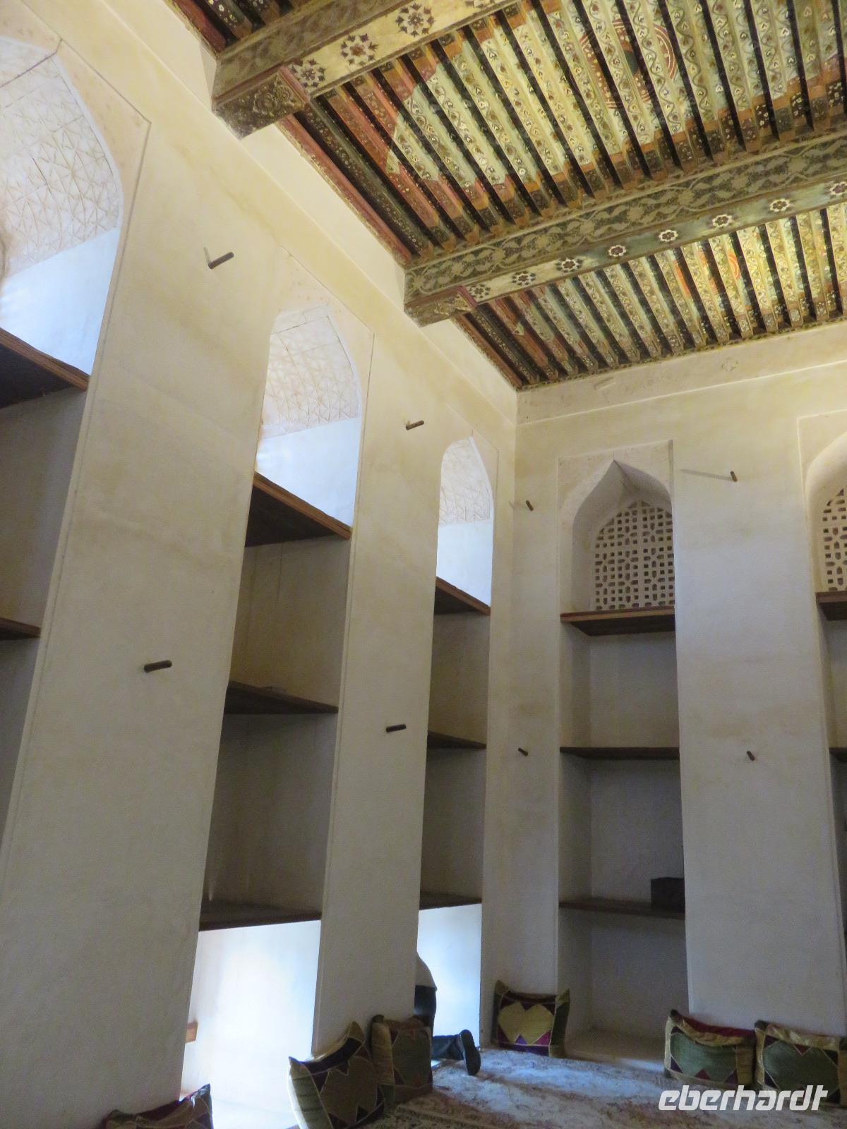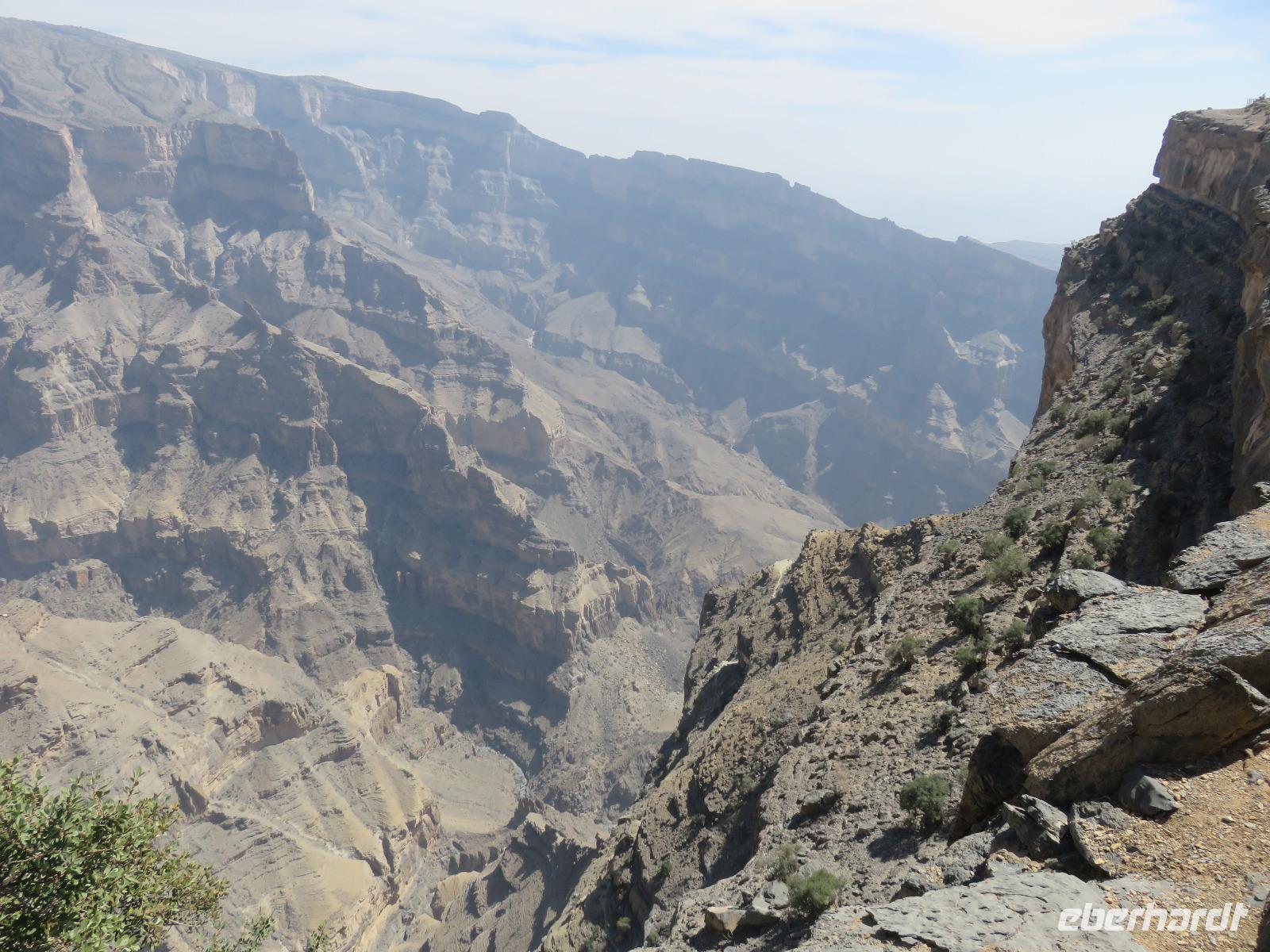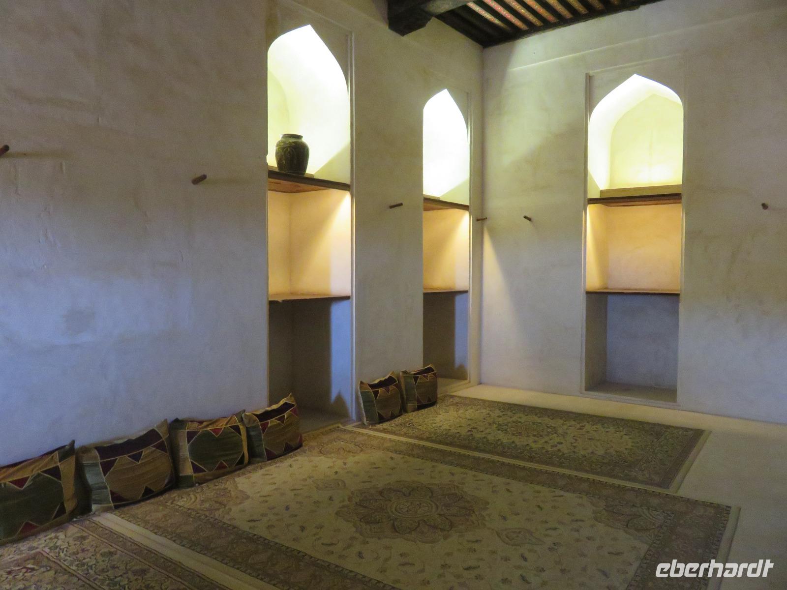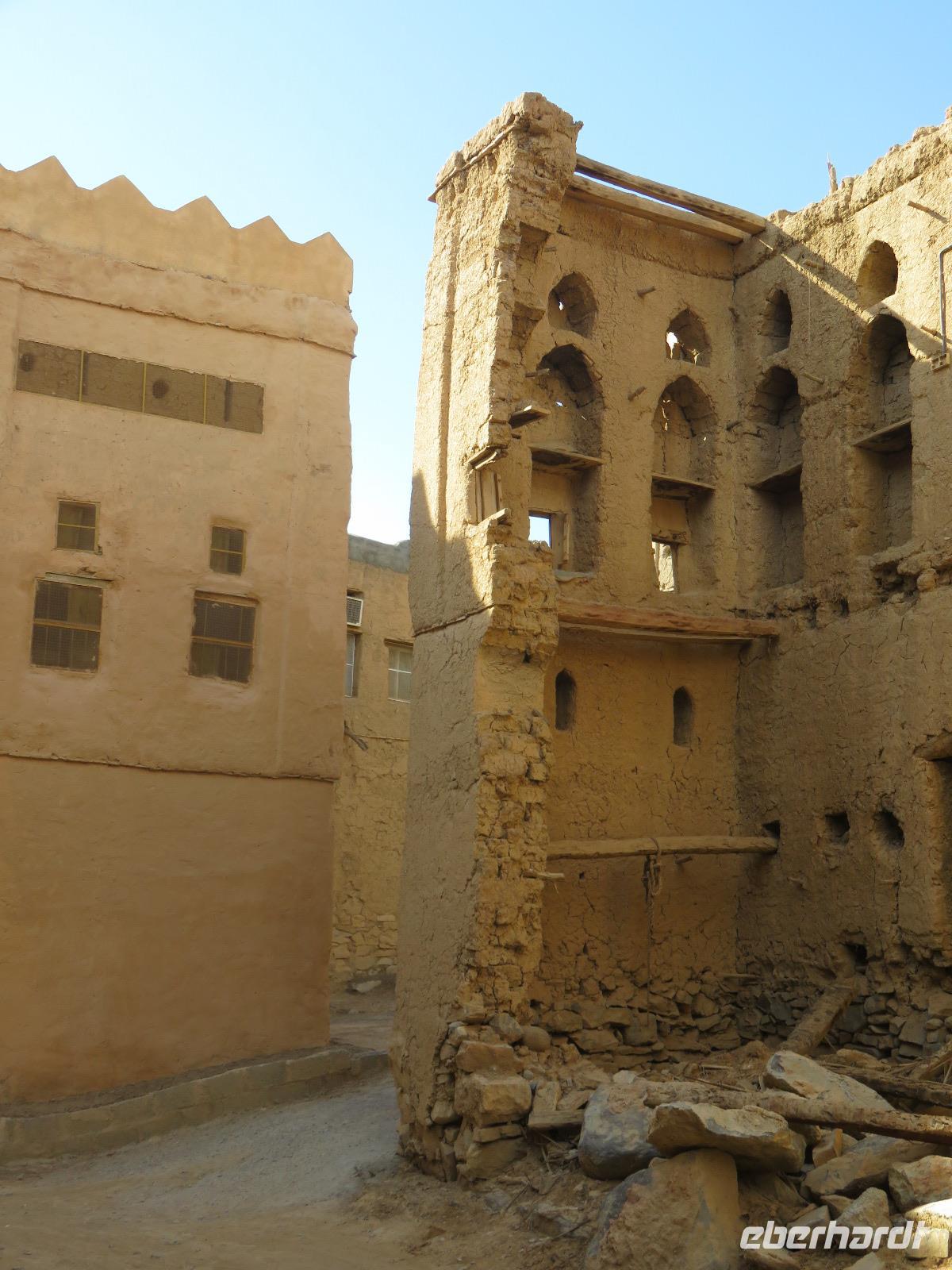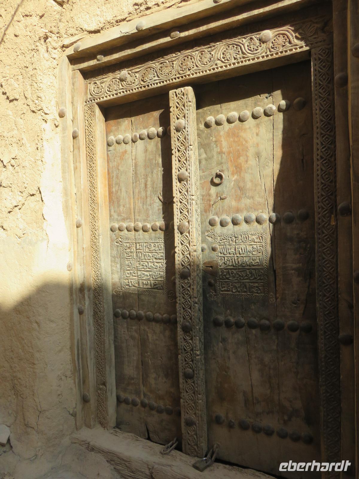 Am Vormittag besuchen wir die Festung Jabrin. Tawfiq erzählt uns die wichtigsten Details aus der Geschichte des Omans und der Festung. Das imposante Bauwerk wurde 1670 unter Bil'arub bin Sultan al- Ya'aruba erbaut. Er wurde 1688 zum Imam gewählt und legte die Hauptstadt des Omans nach Nizwa und residierte auf Jarbin. Bil'arub war Förderer und Finanzier der Wissenschaftler und Gelehrten seiner Zeit. Der Palast wollte er eigentlich als einen Ort des Wissens und als eine prachtvolle Wohnresidenz etablieren. Allerdings musste er sich immer wieder mit seinem Bruder Saif auseinandersetzen. Dieser beanspruchte ebenfalls den Imamtitel und die Herrschermacht. Deshalb baute man den Palast zur Festung aus. Die Festung lang lange Zeit im Dornröschenschlaf. Mit viel Liebe zum Detail wurde Sie im 20. Jahrhundert restauriert. Wir erhalten eine gute Vorstellung, wie der Imam im 17. Jahrhundert regierte. Uns fasziniert die reiche Ausstattung der Räume mit wunderschönen geschnitzten und bemalten Deckenverzierungen und verschiedenen architektonischen Kleinoden. Unsere Reise führt uns zum Fort Bahla. Diese ist das größte Lehmfort im Oman und gehört gleichzeitig zum UNESCO Weltkulturerbe. Es wurde nach seinem Erbauer Hisn Tamah benannt. Das Fort wurde im 17. Jahrhundert auf den Resten einer älteren persischen Anlage erbaut. Die Außenmauern wurden ungewöhnlich hoch aus Lehmziegeln mit Natursteinen errichtet. Es entstand über mehrere Epochen in unterschiedlichen Bauabschnitten. Die frühesten Teile gehen auf die vorislamische Zeit zurück. Die Restaurierung der großen Anlage dauerte fast 20 Jahre. Auch auf Grund der Unterstützung deutscher Fachleute konnte das Fort 2013 wieder eröffnet werden. Am Mittag fahren wir mit den Jeeps weiter in das Jebel Akhbar-Gebirge. Ein kurzer Fotostopp ermöglicht uns einen schönen Blick auf das alte Lehmdorf Guhl mit den dazugehörigen Feldern. Die Straße führt uns zunächst über Asphalt und mit einigen Serpentinen hinauf auf ca. 800 Meter Höhe. Nun geht es off Road über die Piste weiter auf 2.200 Meter. Vom Aussichtspunkt eröffnet sich uns ein grandioser Blick in den fast 1000 Meter tiefen Grand Canyon Omans - den Jebel Shams. Die Schlucht ist der drittgrößte Canyon der Welt. Nachdem wir ausgiebig geschaut und fotografiert haben, zeigen unsere Chauffeure wieder ihr ganzes Können bei der Rückfahrt hinab. Anschließend fahren wir Richtung Al Hamra. Unterwegs legen wir eine Mittagspause in einem typischen omanischen Restaurant ein. Taufiq hat uns empfohlen, unbedingt Ziege nach omanischer Art zubereitet zu probieren. Wir bestellen also alle das Gericht und sind begeistert, denn das gebratene Ziegenfleisch mit Reise schmeckt sehr lecker. Gut gestärkt reisen wir zu einem Aussichtspunkt oberhalb von Al Hamra. Hier bietet sich ein schöner Blick auf die alte Stadt und die sie umgebenden Palmengärten. Nun geht es hinab nach Al Hamra. Wir spazieren durch die engen Gassen zwischen den teilweise bis zu vierhundert Jahre alten Lehmhäusern. Interessant sind die verschiedenen Bauweisen der Häuser mit teilweise reichen Verzierungen und unterschiedlich kunstvoll gestalteten Fenstern und Türen. Bis 2003 war der Ort noch bewohnt. Da sich der Großteil der Häuser in Privatbesitz befindet, ist das Dorf leider dem Verfall preisgegeben. Es fehlt einfach das Geld, um die Häuser zu erhalten. Unsere Tour führt uns zu einem Aussichtspunkt, von dem wir einen schönen Blick auf das Oasendorf Misfah Al Abreen haben. Es liegt an einem Hang in mitten von Palmengärten und Terrassenfeldern. Anschließend besuchen wir auch dieses Dorf mit interessanten Häusern aus Stein und einem ausgeklügelten Bewässerungssystem für die vielen Pflanzen und Palmen. Wir entdecken Bananenstauden, Granatapfelbäume, Kakaopflanzen und vieles mehr. Anschließend geht es zurück zum Hotel.