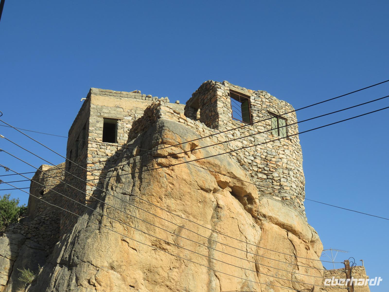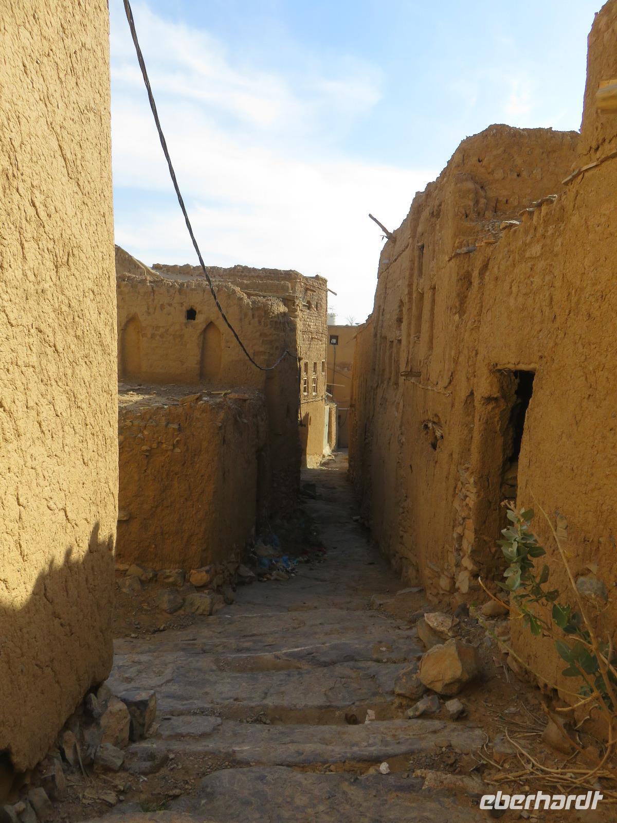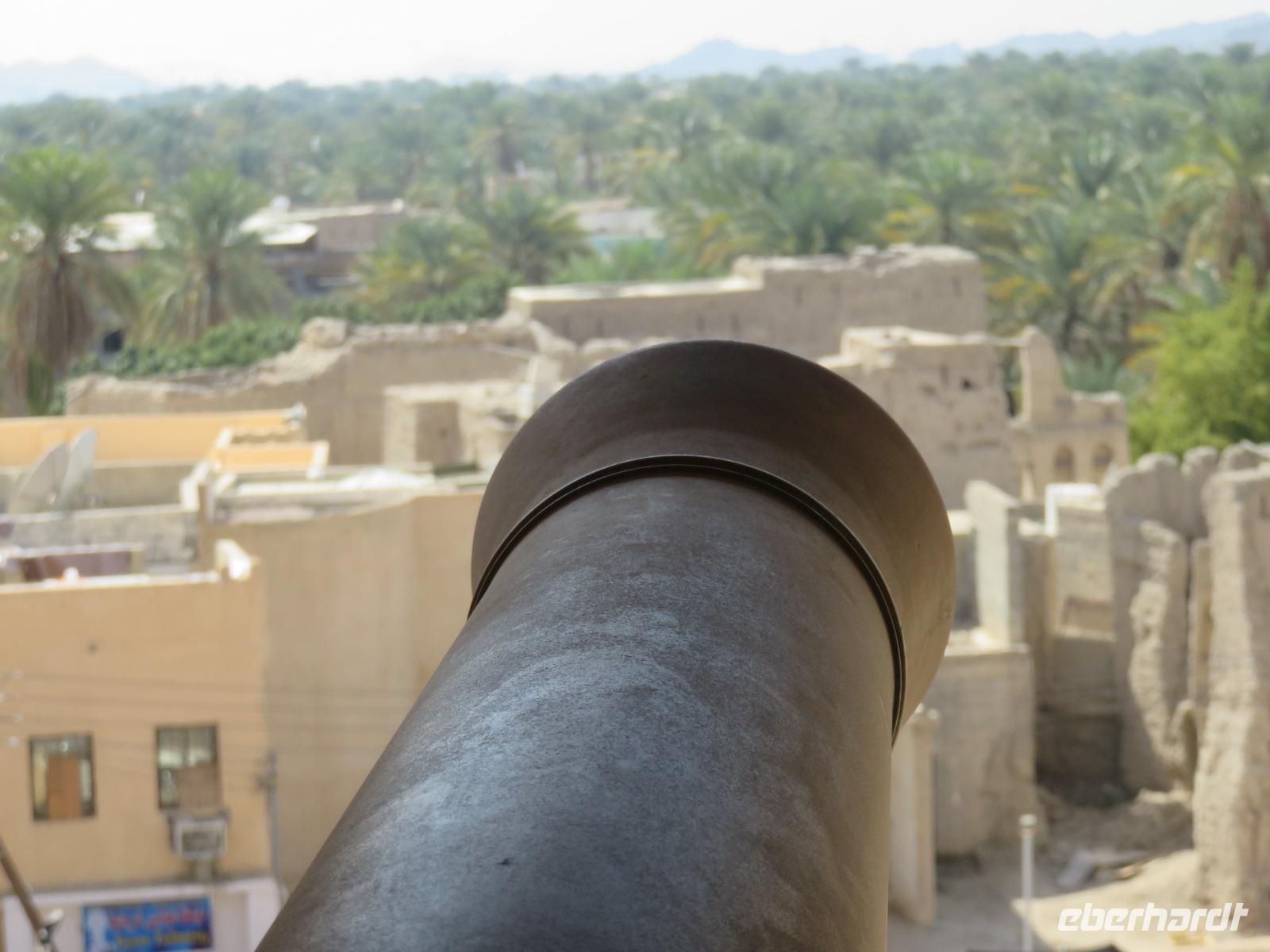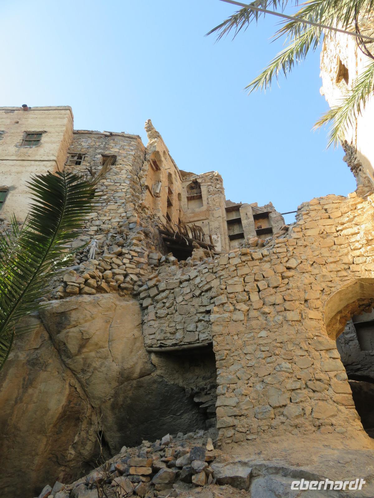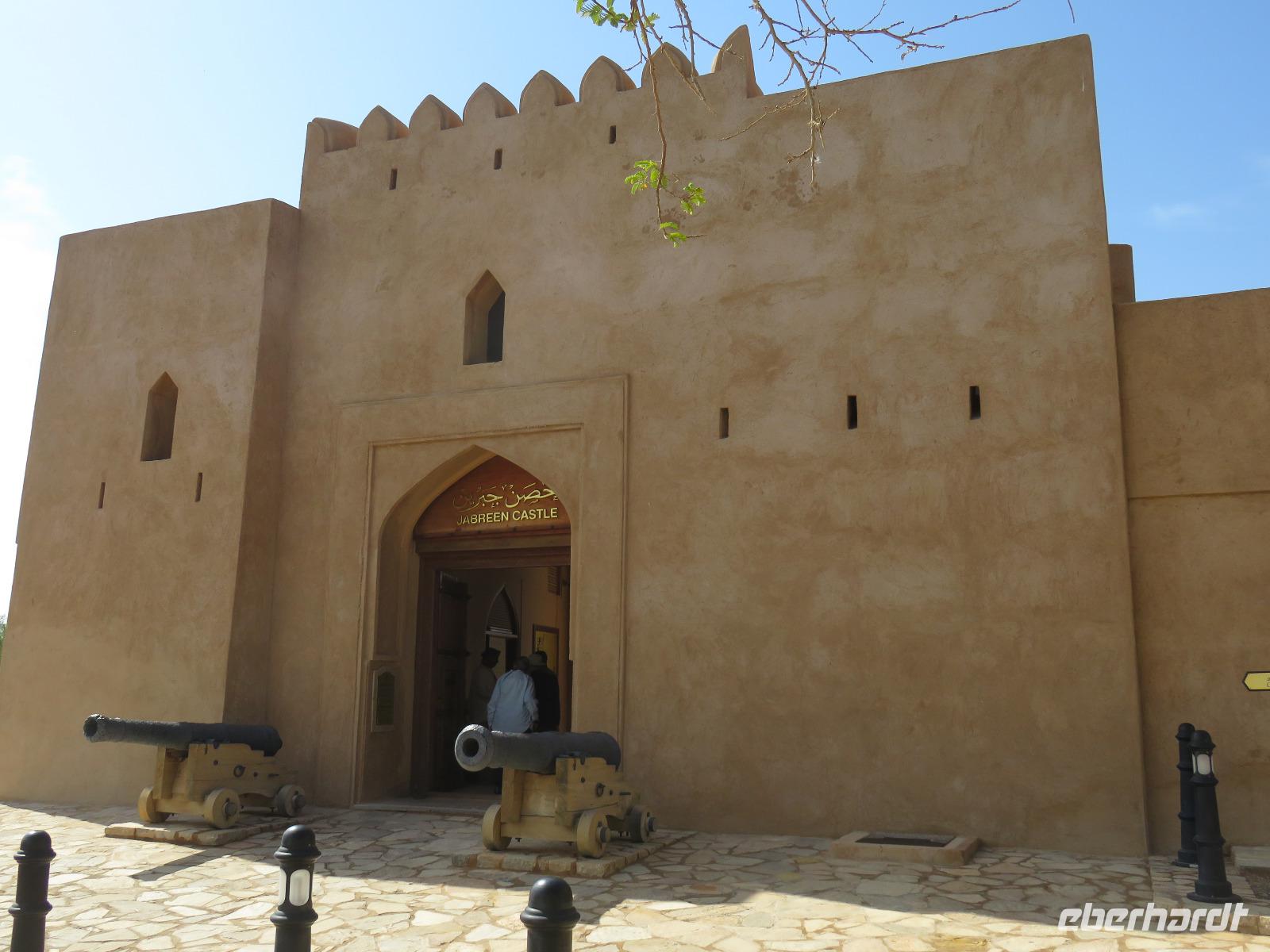 Am Vormittag besuchen wir die Festung Jabrin. Tawfiq erzählt uns die wichtigsten Details aus der Geschichte des Omans und der Festung. Das imposante Bauwerk wurde 1670 unter Bil'arub bin Sultan al- Ya'aruba erbaut. Er wurde 1688 zum Imam gewählt und legte die Hauptstadt des Omans nach Nizwa und residierte auf Jarbin. Bil'arub war Förderer und Finanzier der Wissenschaftler und Gelehrten seiner Zeit. Der Palast wollte er eigentlich als einen Ort des Wissens und als eine prachtvolle Wohnresidenz etablieren. Allerdings musste er sich immer wieder mit seinem Bruder Saif auseinandersetzen. Dieser beanspruchte ebenfalls den Imamtitel und die Herrschermacht. Deshalb baute man den Palast zur Festung aus. Die Festung lang lange Zeit im Dornröschenschlaf. Mit viel Liebe zum Detail wurde Sie im 20. Jahrhundert restauriert. Wir erhalten eine gute Vorstellung, wie der Imam im 17. Jahrhundert regierte. Uns fasziniert die reiche Ausstattung der Räume mit wunderschönen geschnitzten und bemalten Deckenverzierungen und verschiedenen architektonischen Kleinoden. Unsere Reise führt uns zum Fort Bahla. Diese ist das größte Lehmfort im Oman und gehört gleichzeitig zum UNESCO Weltkulturerbe. Es wurde nach seinem Erbauer Hisn Tamah benannt. Das Fort wurde im 17. Jahrhundert auf den Resten einer älteren persischen Anlage erbaut. Die Außenmauern wurden ungewöhnlich hoch aus Lehmziegeln mit Natursteinen errichtet. Es entstand über mehrere Epochen in unterschiedlichen Bauabschnitten. Die frühesten Teile gehen auf die vorislamische Zeit zurück. Die Restaurierung der großen Anlage dauerte fast 20 Jahre. Auch auf Grund der Unterstützung deutscher Fachleute konnte das Fort 2013 wieder eröffnet werden. Am Mittag fahren wir mit den Jeeps weiter in das Jebel Akhbar-Gebirge. Ein kurzer Fotostopp ermöglicht uns einen schönen Blick auf das alte Lehmdorf Guhl mit den dazugehörigen Feldern. Die Straße führt uns zunächst über Asphalt und mit einigen Serpentinen hinauf auf ca. 800 Meter Höhe. Nun geht es off Road über die Piste weiter auf 2.200 Meter. Vom Aussichtspunkt eröffnet sich uns ein grandioser Blick in den fast 1000 Meter tiefen Grand Canyon Omans - den Jebel Shams. Die Schlucht ist der drittgrößte Canyon der Welt. Nachdem wir ausgiebig geschaut und fotografiert haben, zeigen unsere Chauffeure wieder ihr ganzes Können bei der Rückfahrt hinab. Anschließend fahren wir Richtung Al Hamra. Unterwegs legen wir eine Mittagspause in einem typischen omanischen Restaurant ein. Taufiq hat uns empfohlen, unbedingt Ziege nach omanischer Art zubereitet zu probieren. Wir bestellen also alle das Gericht und sind begeistert, denn das gebratene Ziegenfleisch mit Reise schmeckt sehr lecker. Gut gestärkt reisen wir zu einem Aussichtspunkt oberhalb von Al Hamra. Hier bietet sich ein schöner Blick auf die alte Stadt und die sie umgebenden Palmengärten. Nun geht es hinab nach Al Hamra. Wir spazieren durch die engen Gassen zwischen den teilweise bis zu vierhundert Jahre alten Lehmhäusern. Interessant sind die verschiedenen Bauweisen der Häuser mit teilweise reichen Verzierungen und unterschiedlich kunstvoll gestalteten Fenstern und Türen. Bis 2003 war der Ort noch bewohnt. Da sich der Großteil der Häuser in Privatbesitz befindet, ist das Dorf leider dem Verfall preisgegeben. Es fehlt einfach das Geld, um die Häuser zu erhalten. Unsere Tour führt uns zu einem Aussichtspunkt, von dem wir einen schönen Blick auf das Oasendorf Misfah Al Abreen haben. Es liegt an einem Hang in mitten von Palmengärten und Terrassenfeldern. Anschließend besuchen wir auch dieses Dorf mit interessanten Häusern aus Stein und einem ausgeklügelten Bewässerungssystem für die vielen Pflanzen und Palmen. Wir entdecken Bananenstauden, Granatapfelbäume, Kakaopflanzen und vieles mehr. Anschließend geht es zurück zum Hotel.