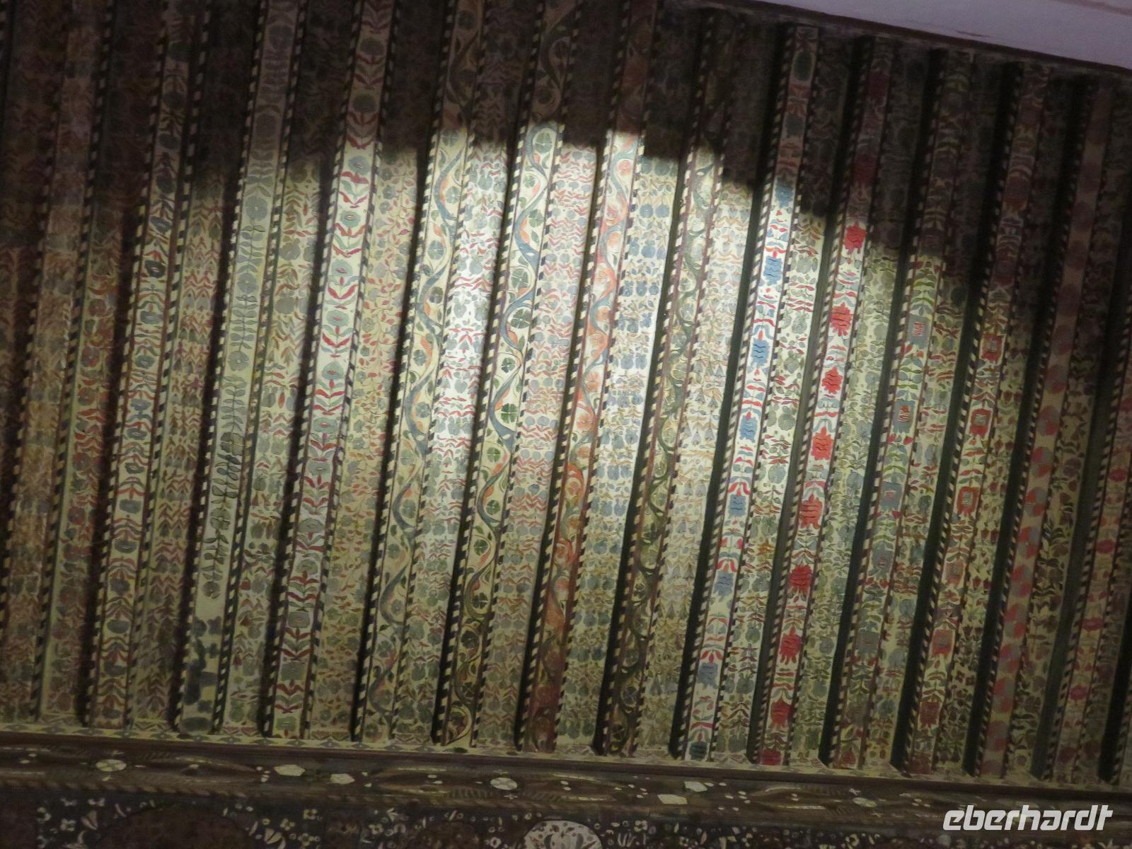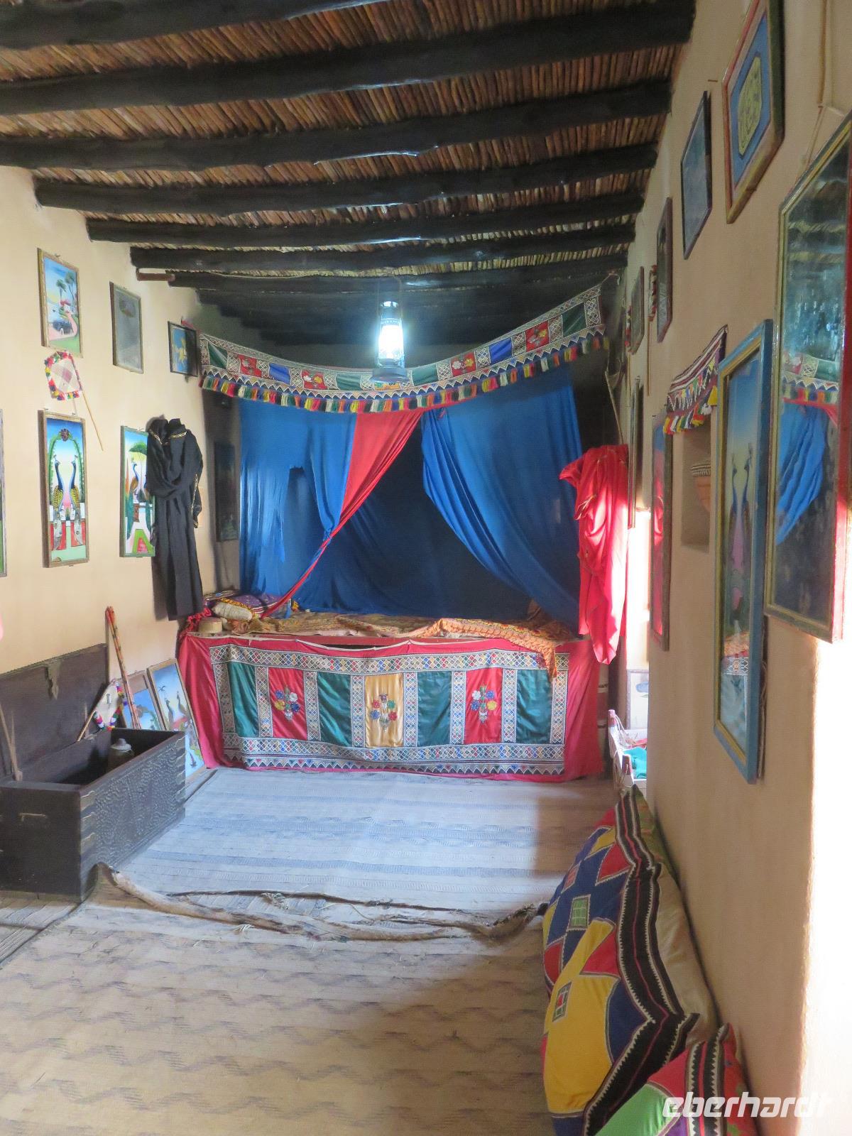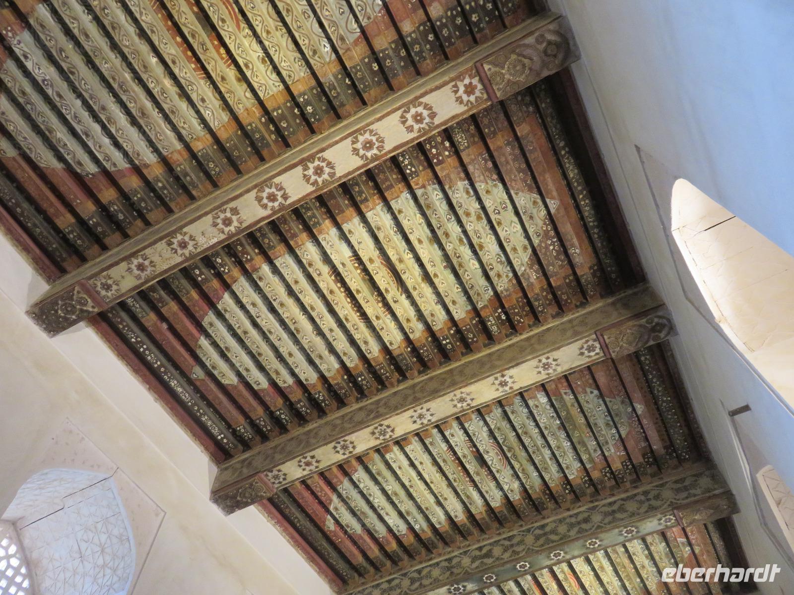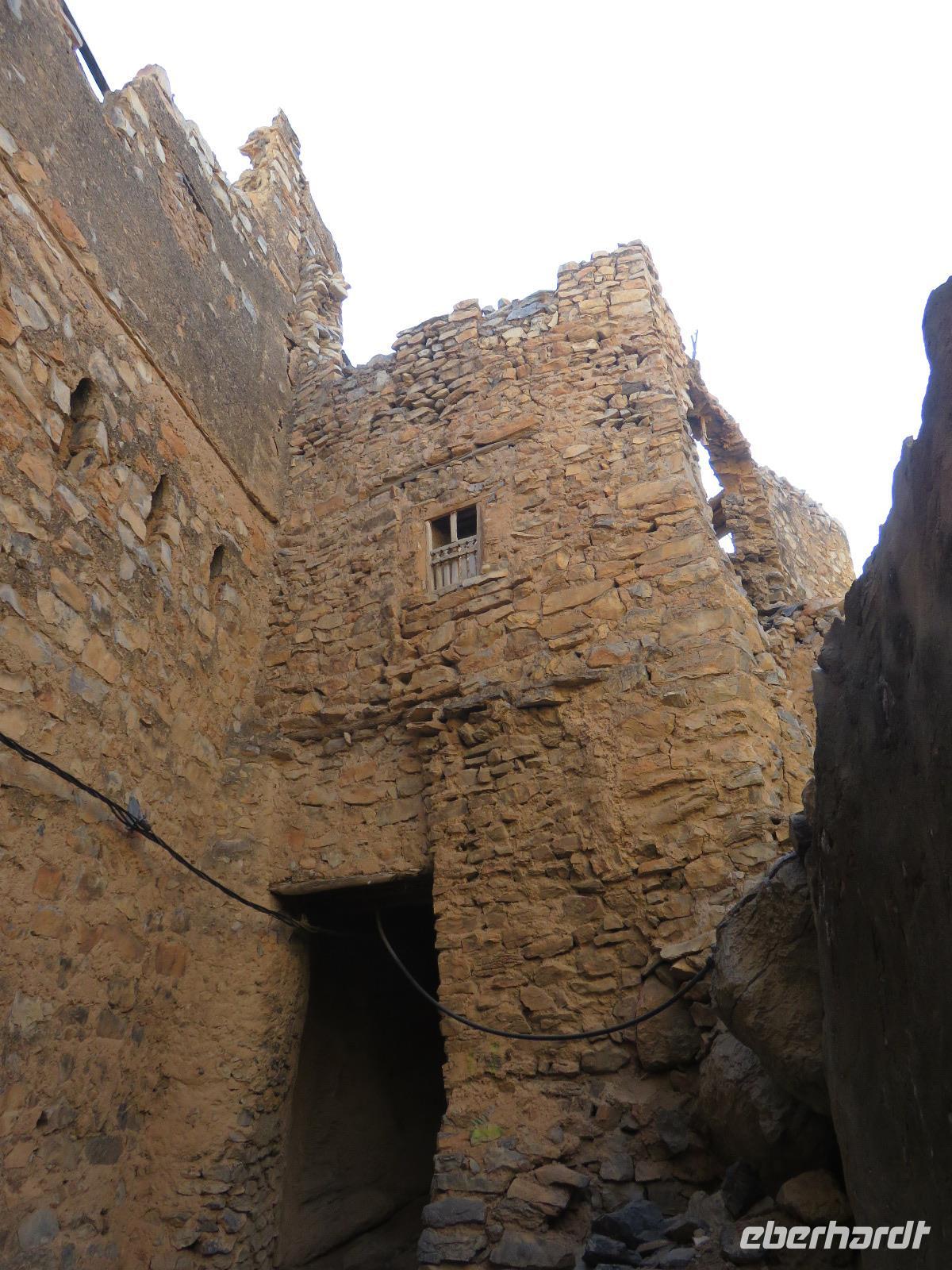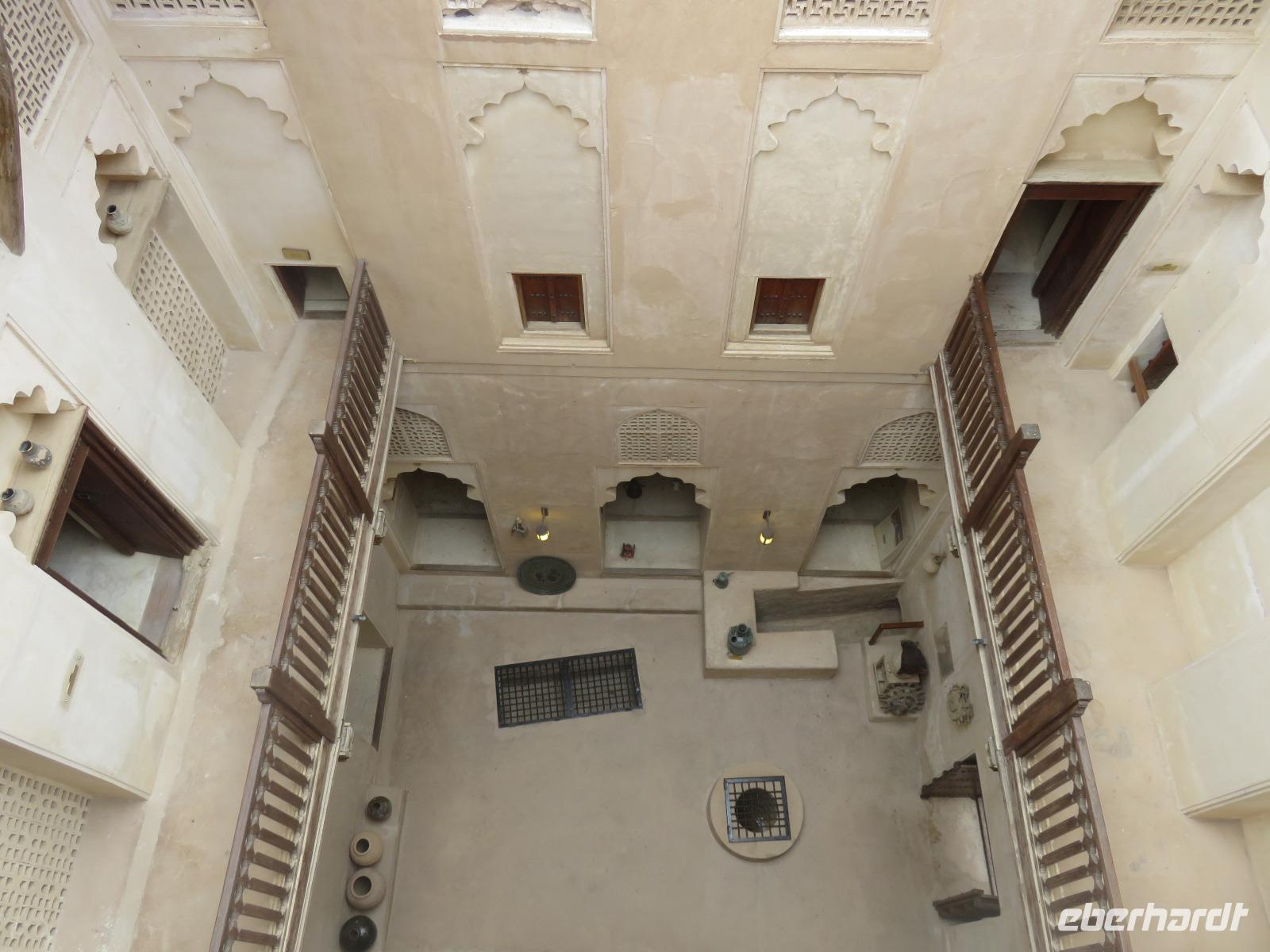 Am Vormittag besuchen wir die Festung Jabrin. Tawfiq erzählt uns die wichtigsten Details aus der Geschichte des Omans und der Festung. Das imposante Bauwerk wurde 1670 unter Bil'arub bin Sultan al- Ya'aruba erbaut. Er wurde 1688 zum Imam gewählt und legte die Hauptstadt des Omans nach Nizwa und residierte auf Jarbin. Bil'arub war Förderer und Finanzier der Wissenschaftler und Gelehrten seiner Zeit. Der Palast wollte er eigentlich als einen Ort des Wissens und als eine prachtvolle Wohnresidenz etablieren. Allerdings musste er sich immer wieder mit seinem Bruder Saif auseinandersetzen. Dieser beanspruchte ebenfalls den Imamtitel und die Herrschermacht. Deshalb baute man den Palast zur Festung aus. Die Festung lang lange Zeit im Dornröschenschlaf. Mit viel Liebe zum Detail wurde Sie im 20. Jahrhundert restauriert. Wir erhalten eine gute Vorstellung, wie der Imam im 17. Jahrhundert regierte. Uns fasziniert die reiche Ausstattung der Räume mit wunderschönen geschnitzten und bemalten Deckenverzierungen und verschiedenen architektonischen Kleinoden. Unsere Reise führt uns zum Fort Bahla. Diese ist das größte Lehmfort im Oman und gehört gleichzeitig zum UNESCO Weltkulturerbe. Es wurde nach seinem Erbauer Hisn Tamah benannt. Das Fort wurde im 17. Jahrhundert auf den Resten einer älteren persischen Anlage erbaut. Die Außenmauern wurden ungewöhnlich hoch aus Lehmziegeln mit Natursteinen errichtet. Es entstand über mehrere Epochen in unterschiedlichen Bauabschnitten. Die frühesten Teile gehen auf die vorislamische Zeit zurück. Die Restaurierung der großen Anlage dauerte fast 20 Jahre. Auch auf Grund der Unterstützung deutscher Fachleute konnte das Fort 2013 wieder eröffnet werden. Am Mittag fahren wir mit den Jeeps weiter in das Jebel Akhbar-Gebirge. Ein kurzer Fotostopp ermöglicht uns einen schönen Blick auf das alte Lehmdorf Guhl mit den dazugehörigen Feldern. Die Straße führt uns zunächst über Asphalt und mit einigen Serpentinen hinauf auf ca. 800 Meter Höhe. Nun geht es off Road über die Piste weiter auf 2.200 Meter. Vom Aussichtspunkt eröffnet sich uns ein grandioser Blick in den fast 1000 Meter tiefen Grand Canyon Omans - den Jebel Shams. Die Schlucht ist der drittgrößte Canyon der Welt. Nachdem wir ausgiebig geschaut und fotografiert haben, zeigen unsere Chauffeure wieder ihr ganzes Können bei der Rückfahrt hinab. Anschließend fahren wir Richtung Al Hamra. Unterwegs legen wir eine Mittagspause in einem typischen omanischen Restaurant ein. Taufiq hat uns empfohlen, unbedingt Ziege nach omanischer Art zubereitet zu probieren. Wir bestellen also alle das Gericht und sind begeistert, denn das gebratene Ziegenfleisch mit Reise schmeckt sehr lecker. Gut gestärkt reisen wir zu einem Aussichtspunkt oberhalb von Al Hamra. Hier bietet sich ein schöner Blick auf die alte Stadt und die sie umgebenden Palmengärten. Nun geht es hinab nach Al Hamra. Wir spazieren durch die engen Gassen zwischen den teilweise bis zu vierhundert Jahre alten Lehmhäusern. Interessant sind die verschiedenen Bauweisen der Häuser mit teilweise reichen Verzierungen und unterschiedlich kunstvoll gestalteten Fenstern und Türen. Bis 2003 war der Ort noch bewohnt. Da sich der Großteil der Häuser in Privatbesitz befindet, ist das Dorf leider dem Verfall preisgegeben. Es fehlt einfach das Geld, um die Häuser zu erhalten. Unsere Tour führt uns zu einem Aussichtspunkt, von dem wir einen schönen Blick auf das Oasendorf Misfah Al Abreen haben. Es liegt an einem Hang in mitten von Palmengärten und Terrassenfeldern. Anschließend besuchen wir auch dieses Dorf mit interessanten Häusern aus Stein und einem ausgeklügelten Bewässerungssystem für die vielen Pflanzen und Palmen. Wir entdecken Bananenstauden, Granatapfelbäume, Kakaopflanzen und vieles mehr. Anschließend geht es zurück zum Hotel.