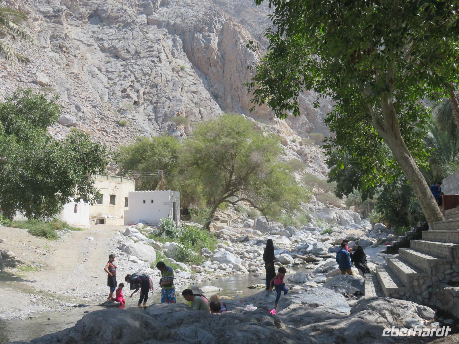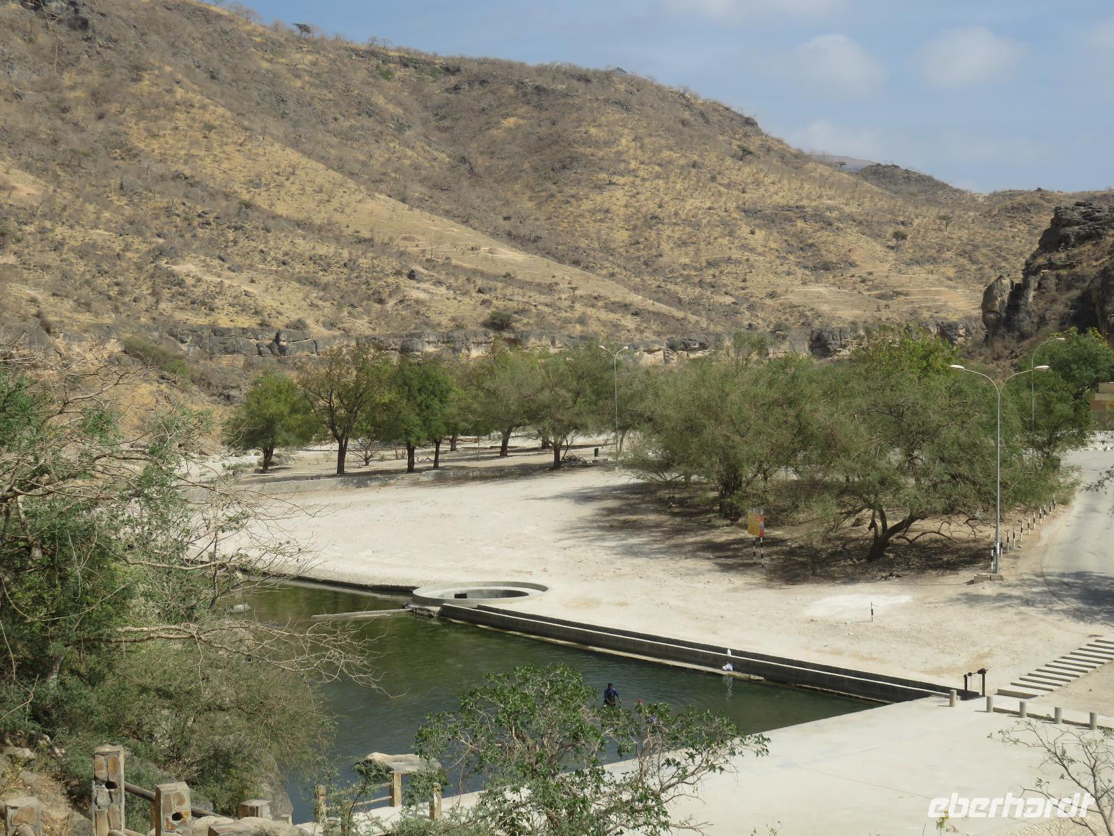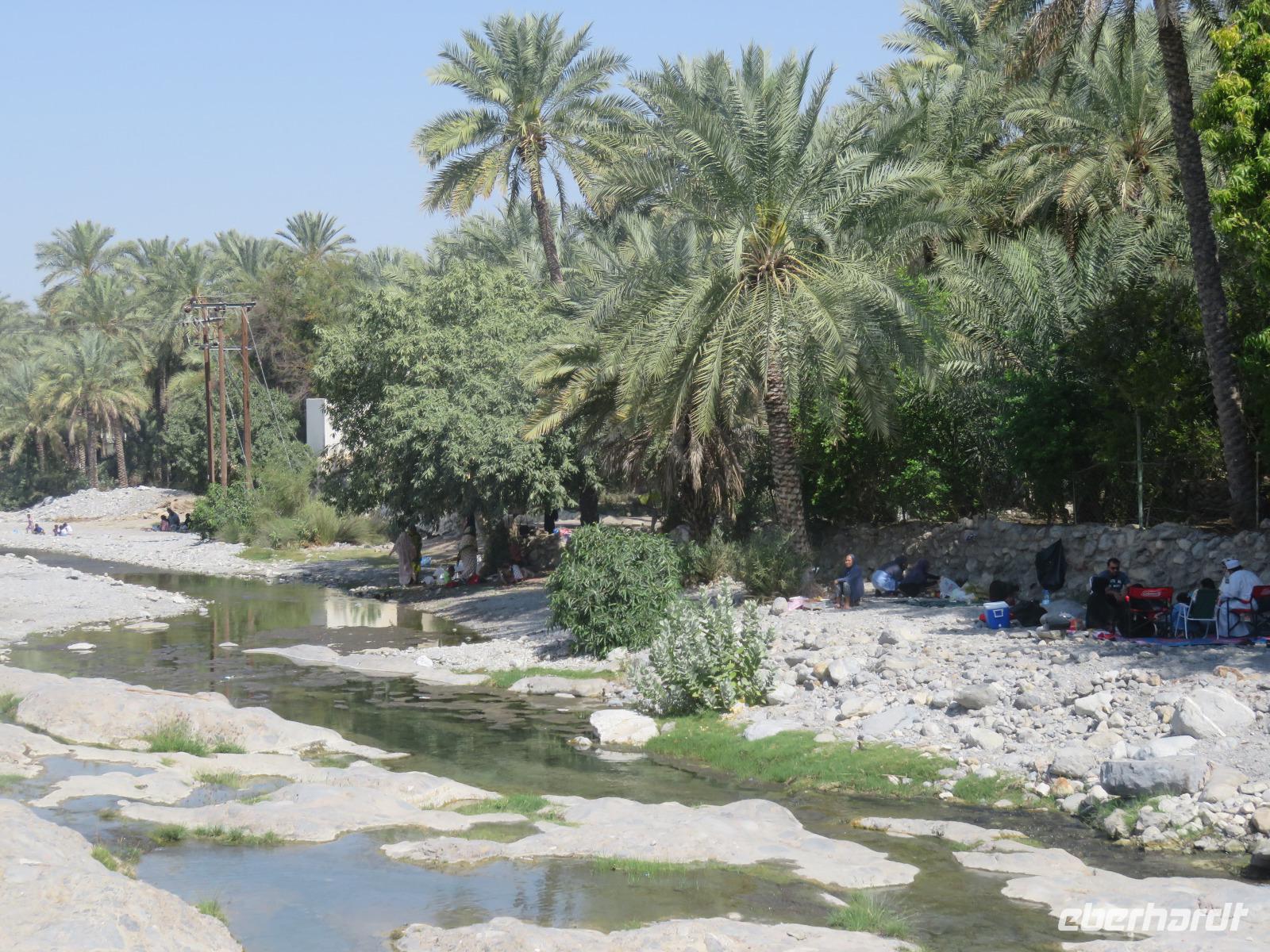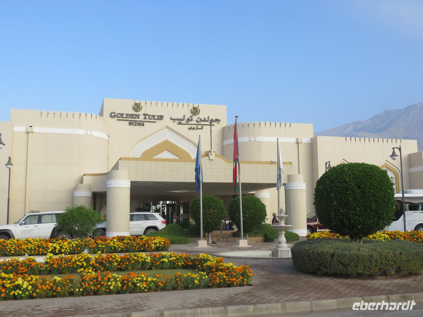 Heute heißt es für uns Umstieg in 4 Jeeps. Unsere Chauffeure erwarten uns bereits. Eigentlich ist die Große Sultan Qaboos Moschee unser erstes Ziel. Auf Grund des Besuches der indischen Premierministerin ist diese aber für Besucher geschlossen und keiner kann sagen, wie lange es dauert. Also beschließen wir den Besuch auf die Tage nach unserer Rückkehr nach Muscat zu verschieben. Anschließend fahren wir zur Fabrik in der das teuerste Parfüm der Welt - Amouage - hergestellt und verkauft wird. Wir sehen die Destilationsanlage, in der früher die Essenzen gewonnen wurden. Heute gibt es modernere Anlagen, in denen aus natürlichen Stoffen edelsten Essenzen destilliert werden. Diese werden nach geheimen Rezepten gemischt und so entsteht Amouage. Wir schnuppern an den edlen Düften. Anschließend beginnt unsere Reise in das Landesinnere Richtung Nizwa. Wir legen unseren ersten Stopp Fuß des Gebirges in Birkat Al Mauz ein. Teilweise gibt es hier traditionelle Lehmbauten, welche wir bei einem kurzen Spaziergang sehen. Bekannt ist der Ort für sein Falaj Al-Khatmeen, ein altes Wasserkanalsytem, welches zum UNESCO Welterbe gehört. Mit diesem über 2.000 Jahre alten Bewässerungssytem versorgten die Menschen ihren Orten auf einer Länge von über 5.000 km mit Wasser aus den Bergen und bewässerten die Felder. Ein Stück dieses Systems ist hier sehr schön restauriert und wir bekommen einen guten Eindruck über die Funktion des Systems. Nun haben wir etwas Hunger und Tawfik führt uns in einen kleinen Coffeshop. Wir wollen unbedingt typisches omanisches Brot probieren. Aus Mehl, Wasser und Salz stellen die Inhaber eine Art Crepés her. Diese werden mit verschiedenen Zutaten, wie Käse, Marmelade oder Honig gefüllt. Es war eine sehr gute Idee und es hat uns sehr gut geschmeckt. Unsere Tour führt uns zunächst weiter über eine atemberaubende Straße in das Gebirge Jebel Al Akadar. Die Passstraße ist teilweise zweispurig ausgebaut und führt auf über 2.000 Meter durch eine faszinierende Landschaft. Unser erstes Ziel ist der Grüne Berg, wie der Jebel Al Akadar genannt wird. Von verschiedenen Aussichtspunkten eröffnen sich uns wunderbare Blicke über die einmalige Landschaft. Danach fahren wir in das Dorf Al Ain, welches hoch über dem Tal an einem Hang thront. Weiter geht es auf die andere Seite des Tales zu „Dianas Viewpoint". Dies ist ein Aussichtspunkt, den Prinzessin Diana besonders geliebt hat. Hier eröffnet sich uns ein einmaliger Blick nach Al Ain und weitere Dörfer, die förmlich am Berghang zu kleben scheinen. Beeindruckend sind die unter den Dörfern liegenden Terrassenfelder. Auf ihnen wachsen Rosen und Granatapfelbäume. Nach einer Kaffeepause geht es die Straße wieder hinab und unsere Fahrer zeigen dabei ihr ganzes Können. Am Nachmittag erreichen wir das Golden Tulip Hotel in Nizwa. Am Abend bedienen wir uns am ausgezeichneten Buffet im Garten des Hotels. Es ist ein schöner Abschluss für unseren Tag.