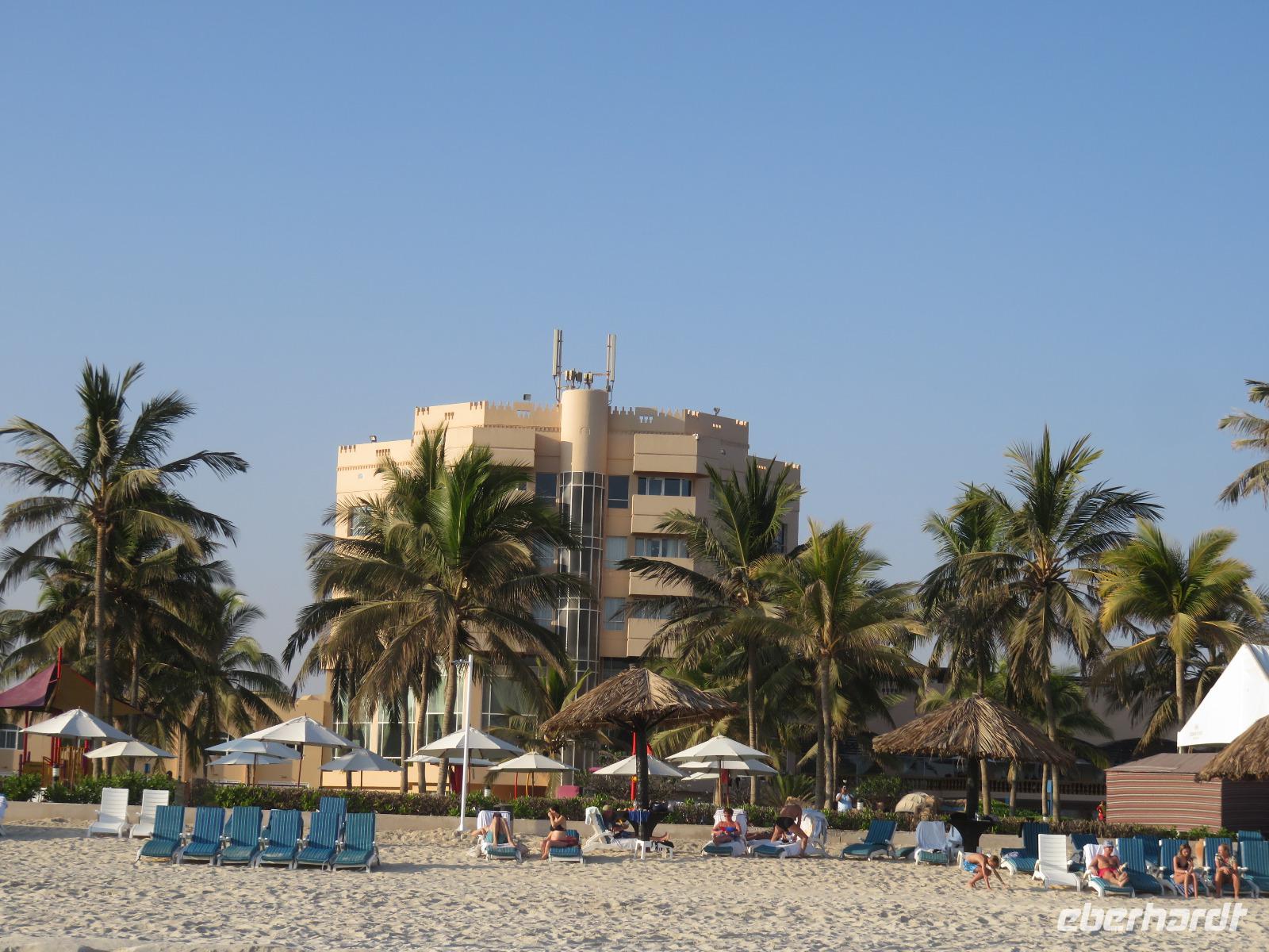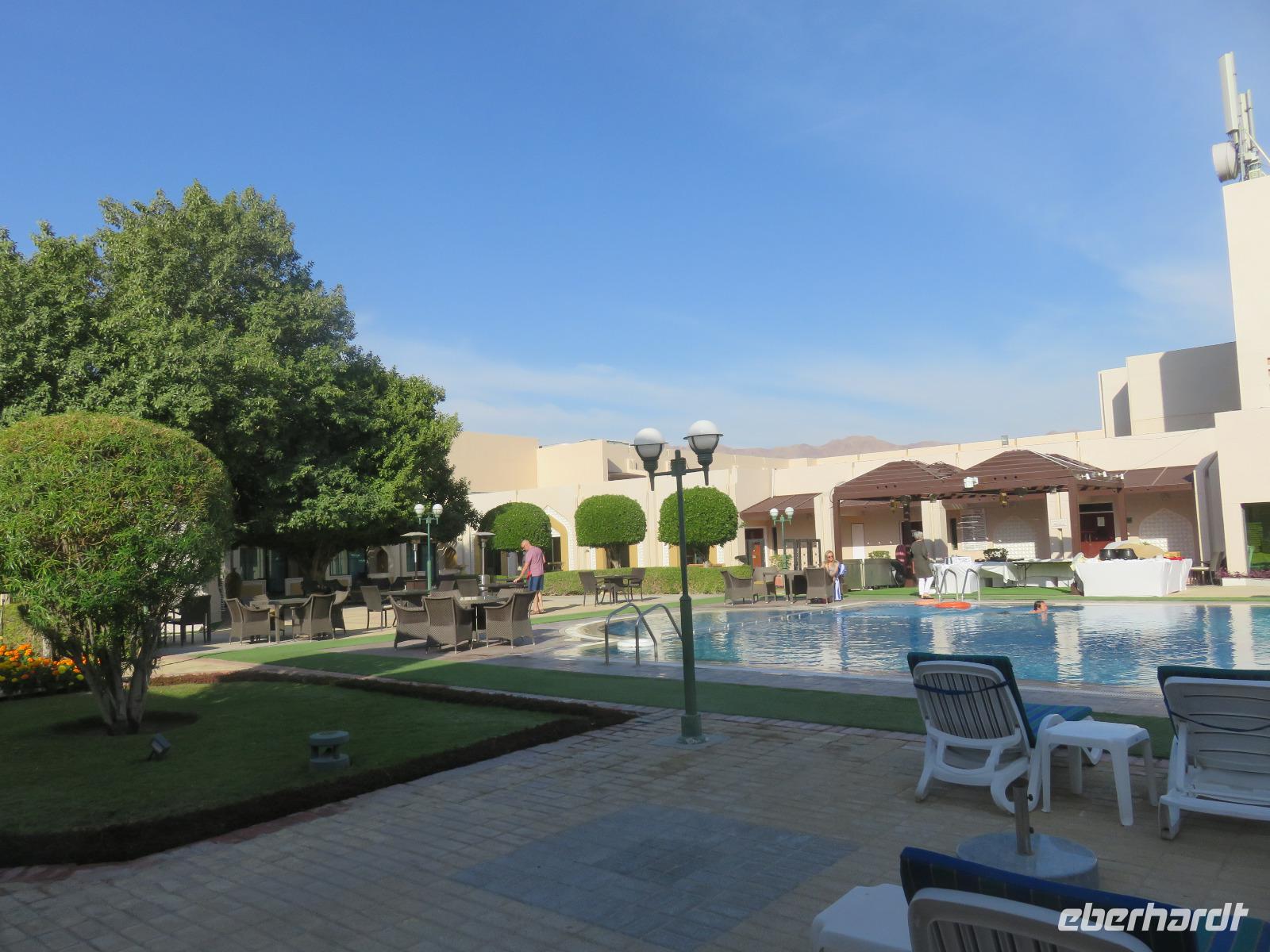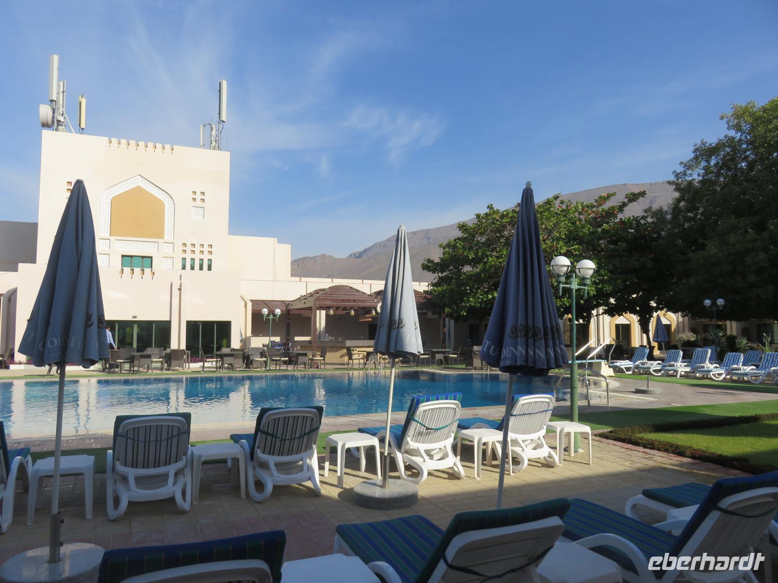 Wir das sind 12 neugierige und erwartungsvolle Reisegäste, die sich auf den Weg in den Orient, genauer gesagt in den Oman machen. Unser Swiss-Flug hebt pünktlich Richtung Zürich ab. In Zürich wechseln wir das Terminal und am Gate zum Abflug in den Oman erwarten uns noch zwei Reisegäste. Wir sind vollständig und auch der Flug nach Muscat ist pünktlich. Es geht über die schneebedeckten Alpen zunächst über den Persischen Golf nach Dubai. Nach der Zwischenlandung zum Passagieraus- und Zustieg und zum Betanken, folgen nochmals 40 Minuten Flug bis Muscat. Die Einreise ist etwas langwierig, da gleichzeitig mehrere Flieger ankommen. Tawfiq, unser örtlicher Reiseleiter, erwartet uns bereits. Er begrüßt uns herzlich und begleitet uns zum Ramada Hotel. Nach kurzen Hinweisen zum Programm für den nächsten Tag, beziehen wir unsere Zimmer. Wir möchten alle nur noch rasch ins Bett, denn es ist bereits früher Morgen.