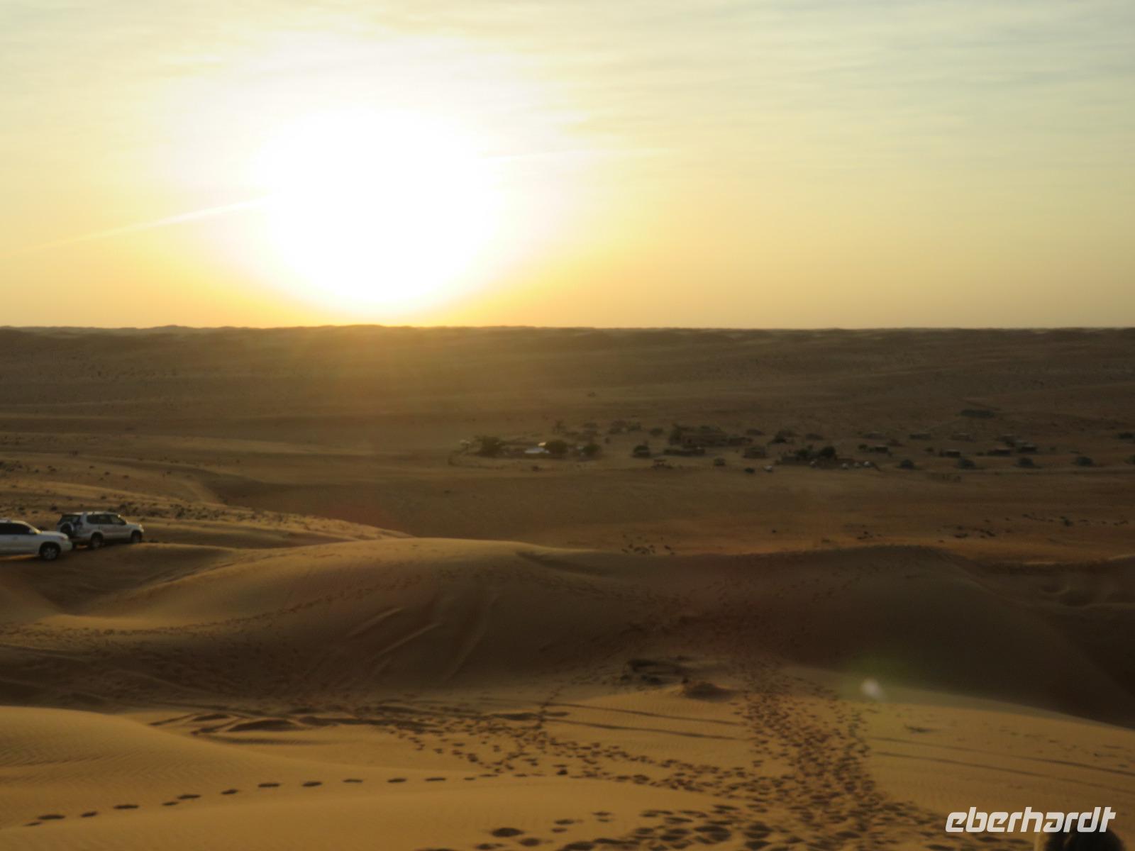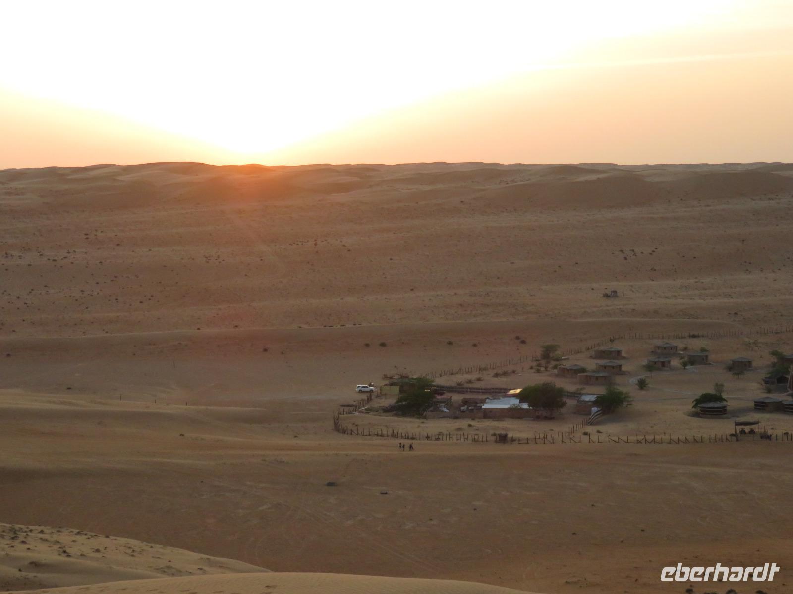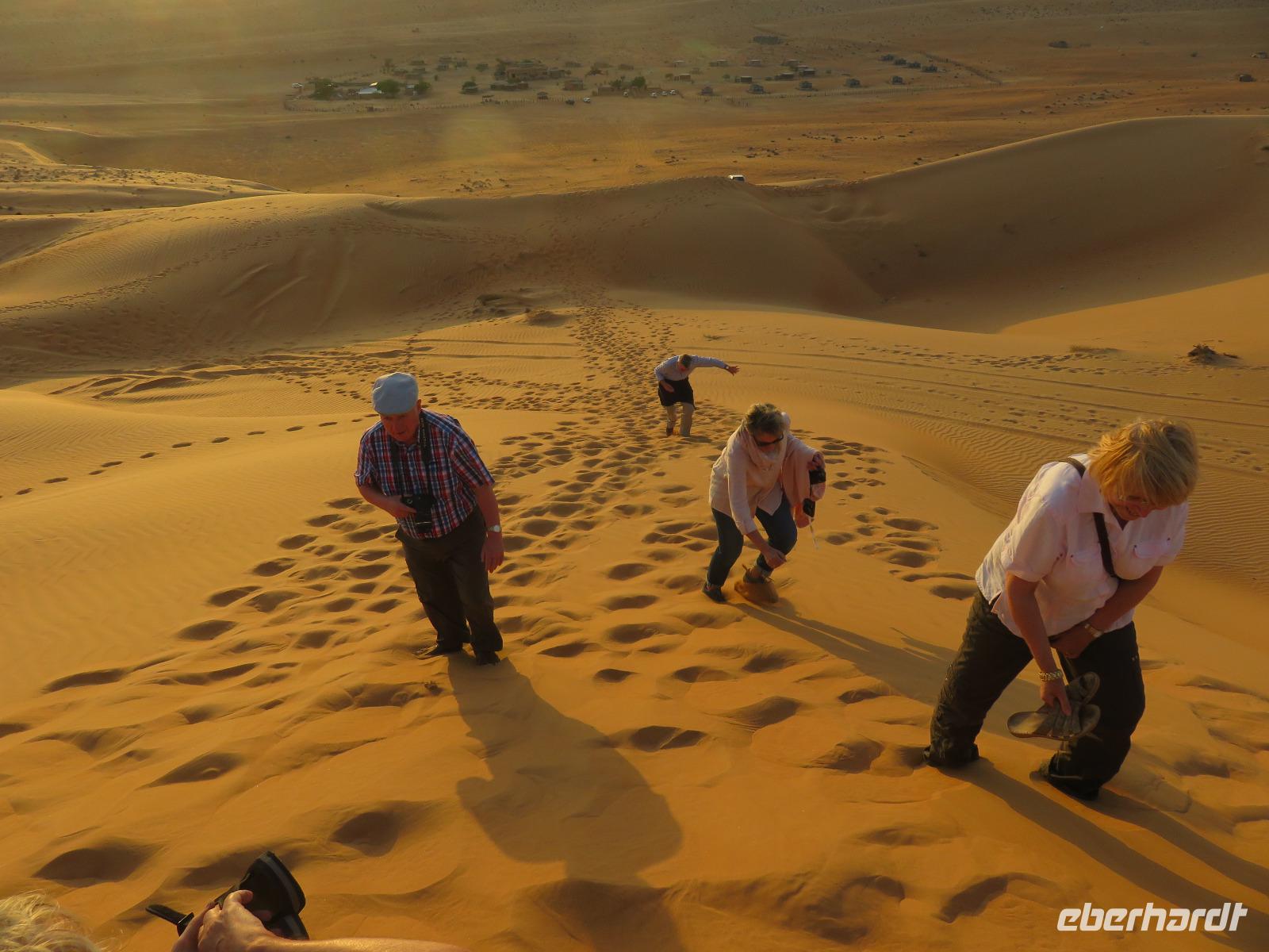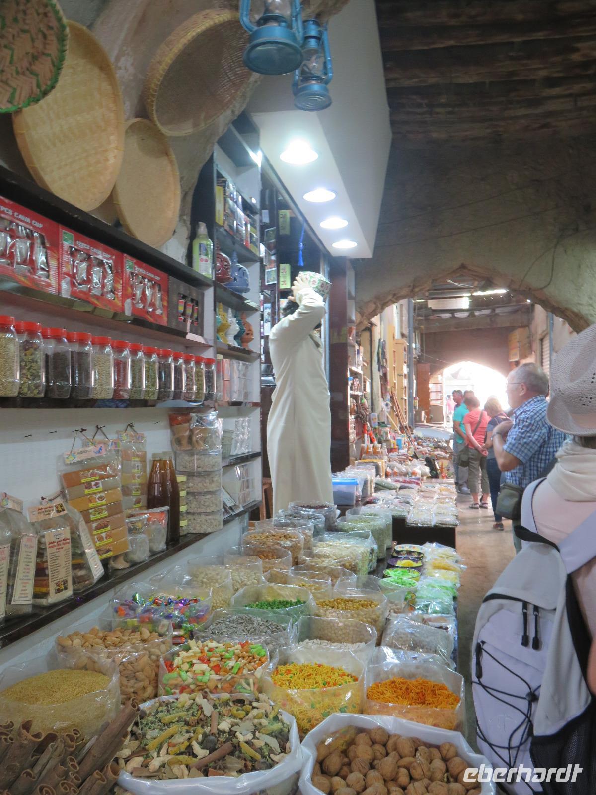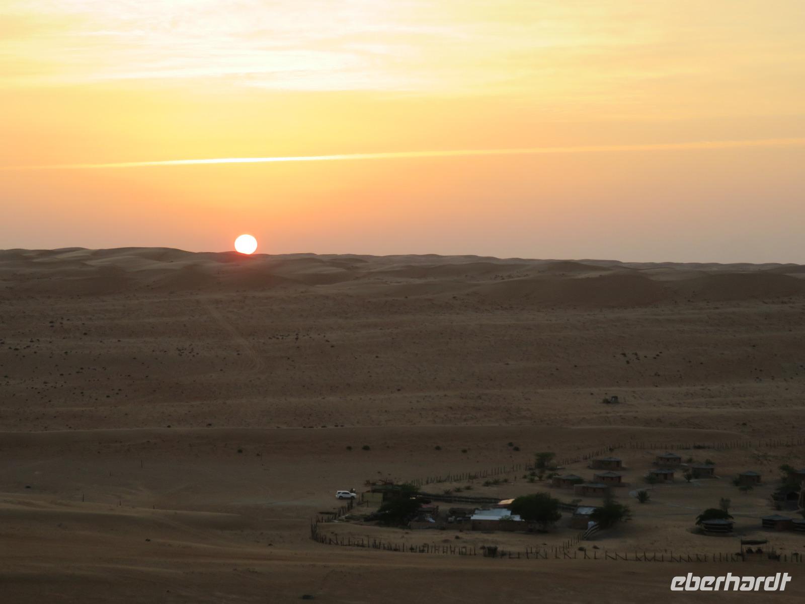 Am Morgen fahren wir zunächst nach Nizwas zum Souk. Zunächst sehen wir den Bereich, wo am Freitag immer der traditionelle Viehmarkt stattfindet. Twafiq erklärt uns kurz das Prozedere, wie die Tiere gehandelt werden. Im Dattelmarkt verkosten wir die verschiedenen Sorten Datteln, die im Oman einfach dazu gehören und überall als eine Form der Gastfreundschaft gereicht werden. Anschließend geht es in den Obst- und Gemüsemarkt. Ganz ursprüngliche bieten die Einheimischen ihre Waren feil. Auf dem Weg zum Fort von Nizwa durchstreifen wir den Gewürzmarkt vorbei. Im Handwerkermarkt mit verschiedenen Angeboten von Silberschmuck, Töpfereiwaren und anderen Kunsthandwerkarbeiten ist etwas Zeit zum Schauen und auch Kaufen. Der Besuch des Souks ist für uns sehr interessant. Anschließend statten wir dem Fort von Nizwa einen Besuch ab. Im 17. Jahrhundert ist es zum Schutz der Stadt errichtet wurden. Im Innenhof tritt gerade eine Gruppe Männer mit traditionellen Gesängen auf und wir lauschen eine Weile. Nun besteigen wir durch das interessante mehrfach verwinkelte Treppenhaus den großen Turm. Von hier oben bietet sich uns ein herrlicher Blick über die Stadt und die umliegenden Berge. Im kleinen Museum bekommen wir einen kleinen, sehr interessanten Einblick in die Geschichte der Stadt und das Leben der Omanis in früherer Zeit. Auf dem Hof zeigen Frauen, wie das traditionelle Omanische Brot gebacken wird. Ein Töpfer und ein Tischler führen ihr Handwerk aus. Wir sehen auch, wie Ziegenkäse auf traditionelle Art hergestellt wird. Nun heißt es nochmals rund 2,5 Stunden zu fahren, ehe wir den Eingang der Wüste erreichen. Nach einer Mittagspause in Ibra wird am Eingang der Wüste der Reifendruck in unseren 4 Jeeps reduziert. Über Sandpisten geht es jetzt direkt ins Wüstenabenteuer. Wir sehen einige Beduinen mit Ihren Ziegen und Kamelen. Allerdings leben heute die meisten Beduinen nicht mehr als Nomaden. Sie sind in festen Häusern in der Wüste sesshaft. Nach etwa 30 Minuten Fahrt kommen wir im Safari Desert Camp an. Mit Tee, omanischem Kaffee und natürlich Datteln werden wir begrüßt. Wir beziehen unsere recht einfach ausgestatteten bungalowartigen Unterkünfte. Nach einer kurzen Pause geht es mit den Jeeps hinauf auf die, dem Camp gegenüber liegende, rote Sanddüne. Das letzte Stück klettern wir durch den feinen Sand hinauf auf den Kamm der Düne. Wir erleben einen fantastischen Sonnenuntergang. Wir sind uns alle einig, dass dies ein Höhepunkt unsrer Reise ist. Wir steigen wieder zu den Jeeps hinab. Etwas abenteuerlich gestaltet sich die Rückfahrt zum Camp. Es geht in direkter Linie die Düne hinab. Es ging alles gut und es ist für uns ein tolles Erlebnis. Das Abendessen wird zum Teil ganz traditionell nach alt omanischer Art im Erdofen zubereitet. Wir dürfen zuschauen, wie das Lammfleisch, welches in Bananenblättern und Tüchern eingewickelt über mehrere Stunden gegart wurde, aus dem Erdofen geholt wird. Anschließend bedienen wir uns am Buffet. Die Beduinen führen einige traditionelle Gesänge vor. Bevor wir uns zur Ruhe legen, bestaunen wir den einmaligen Sternenhimmel. Wir genießen die Stille der Wüste.
