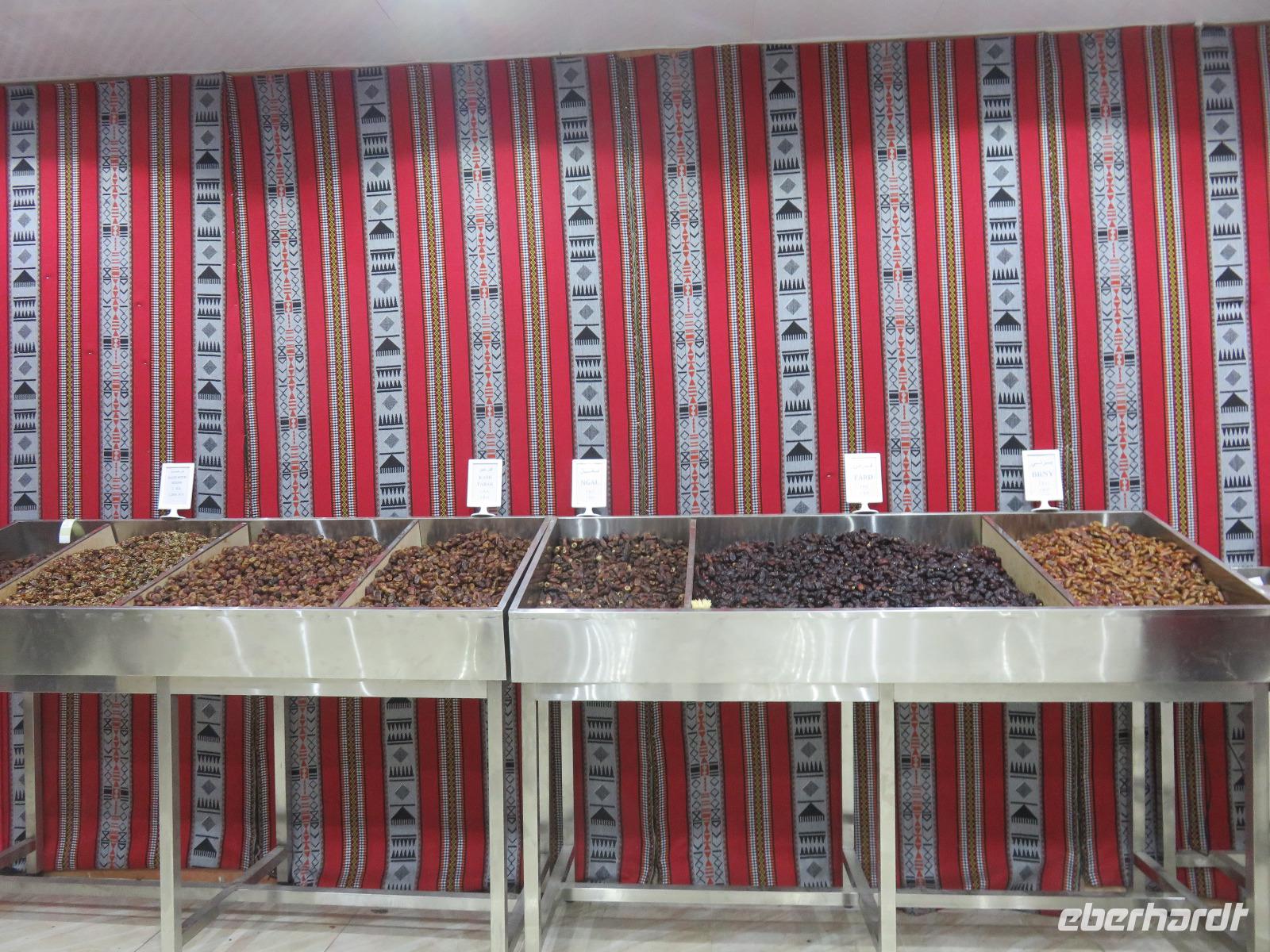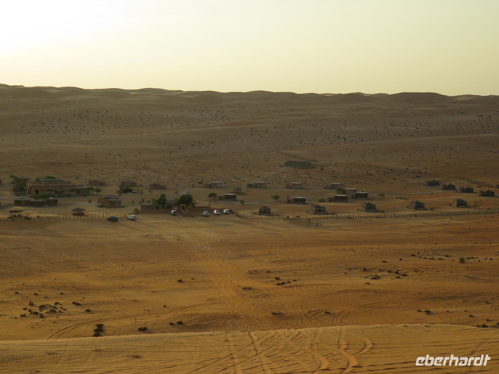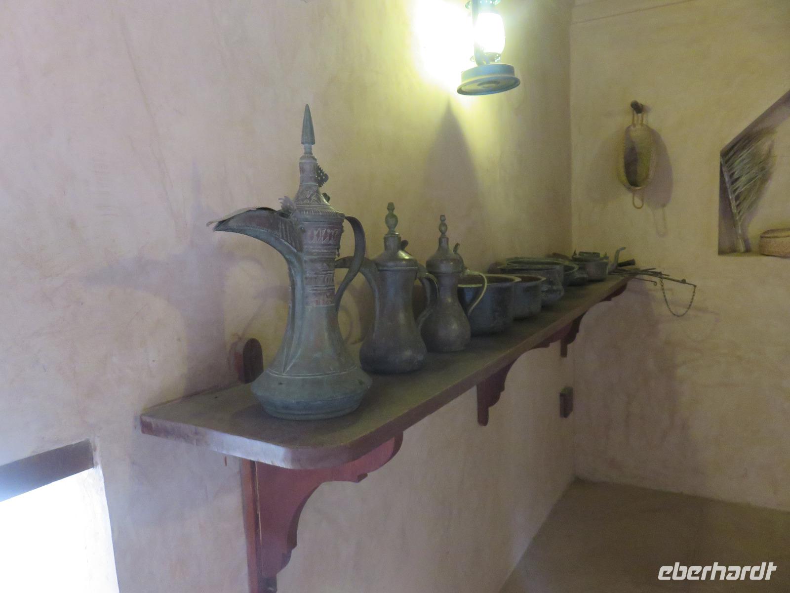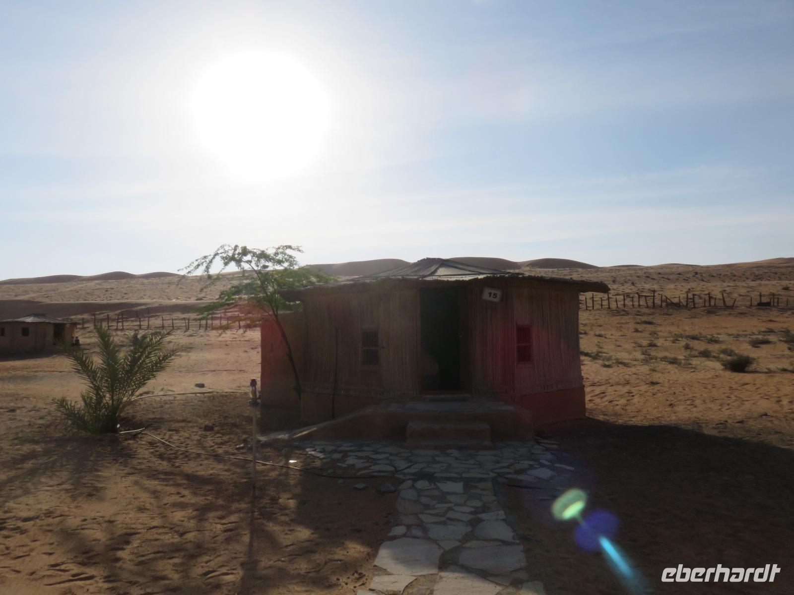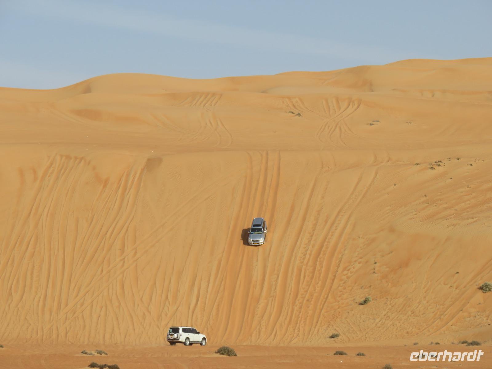 Am Morgen fahren wir zunächst nach Nizwas zum Souk. Zunächst sehen wir den Bereich, wo am Freitag immer der traditionelle Viehmarkt stattfindet. Twafiq erklärt uns kurz das Prozedere, wie die Tiere gehandelt werden. Im Dattelmarkt verkosten wir die verschiedenen Sorten Datteln, die im Oman einfach dazu gehören und überall als eine Form der Gastfreundschaft gereicht werden. Anschließend geht es in den Obst- und Gemüsemarkt. Ganz ursprüngliche bieten die Einheimischen ihre Waren feil. Auf dem Weg zum Fort von Nizwa durchstreifen wir den Gewürzmarkt vorbei. Im Handwerkermarkt mit verschiedenen Angeboten von Silberschmuck, Töpfereiwaren und anderen Kunsthandwerkarbeiten ist etwas Zeit zum Schauen und auch Kaufen. Der Besuch des Souks ist für uns sehr interessant. Anschließend statten wir dem Fort von Nizwa einen Besuch ab. Im 17. Jahrhundert ist es zum Schutz der Stadt errichtet wurden. Im Innenhof tritt gerade eine Gruppe Männer mit traditionellen Gesängen auf und wir lauschen eine Weile. Nun besteigen wir durch das interessante mehrfach verwinkelte Treppenhaus den großen Turm. Von hier oben bietet sich uns ein herrlicher Blick über die Stadt und die umliegenden Berge. Im kleinen Museum bekommen wir einen kleinen, sehr interessanten Einblick in die Geschichte der Stadt und das Leben der Omanis in früherer Zeit. Auf dem Hof zeigen Frauen, wie das traditionelle Omanische Brot gebacken wird. Ein Töpfer und ein Tischler führen ihr Handwerk aus. Wir sehen auch, wie Ziegenkäse auf traditionelle Art hergestellt wird. Nun heißt es nochmals rund 2,5 Stunden zu fahren, ehe wir den Eingang der Wüste erreichen. Nach einer Mittagspause in Ibra wird am Eingang der Wüste der Reifendruck in unseren 4 Jeeps reduziert. Über Sandpisten geht es jetzt direkt ins Wüstenabenteuer. Wir sehen einige Beduinen mit Ihren Ziegen und Kamelen. Allerdings leben heute die meisten Beduinen nicht mehr als Nomaden. Sie sind in festen Häusern in der Wüste sesshaft. Nach etwa 30 Minuten Fahrt kommen wir im Safari Desert Camp an. Mit Tee, omanischem Kaffee und natürlich Datteln werden wir begrüßt. Wir beziehen unsere recht einfach ausgestatteten bungalowartigen Unterkünfte. Nach einer kurzen Pause geht es mit den Jeeps hinauf auf die, dem Camp gegenüber liegende, rote Sanddüne. Das letzte Stück klettern wir durch den feinen Sand hinauf auf den Kamm der Düne. Wir erleben einen fantastischen Sonnenuntergang. Wir sind uns alle einig, dass dies ein Höhepunkt unsrer Reise ist. Wir steigen wieder zu den Jeeps hinab. Etwas abenteuerlich gestaltet sich die Rückfahrt zum Camp. Es geht in direkter Linie die Düne hinab. Es ging alles gut und es ist für uns ein tolles Erlebnis. Das Abendessen wird zum Teil ganz traditionell nach alt omanischer Art im Erdofen zubereitet. Wir dürfen zuschauen, wie das Lammfleisch, welches in Bananenblättern und Tüchern eingewickelt über mehrere Stunden gegart wurde, aus dem Erdofen geholt wird. Anschließend bedienen wir uns am Buffet. Die Beduinen führen einige traditionelle Gesänge vor. Bevor wir uns zur Ruhe legen, bestaunen wir den einmaligen Sternenhimmel. Wir genießen die Stille der Wüste.