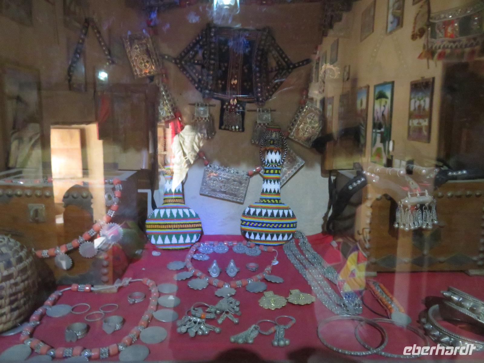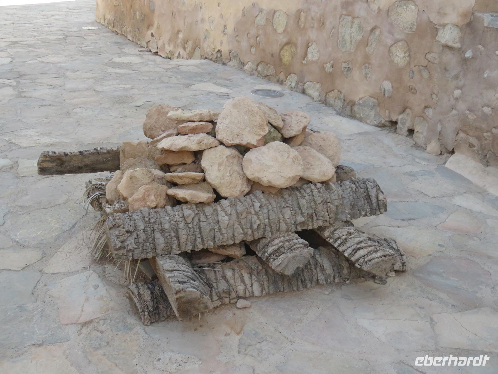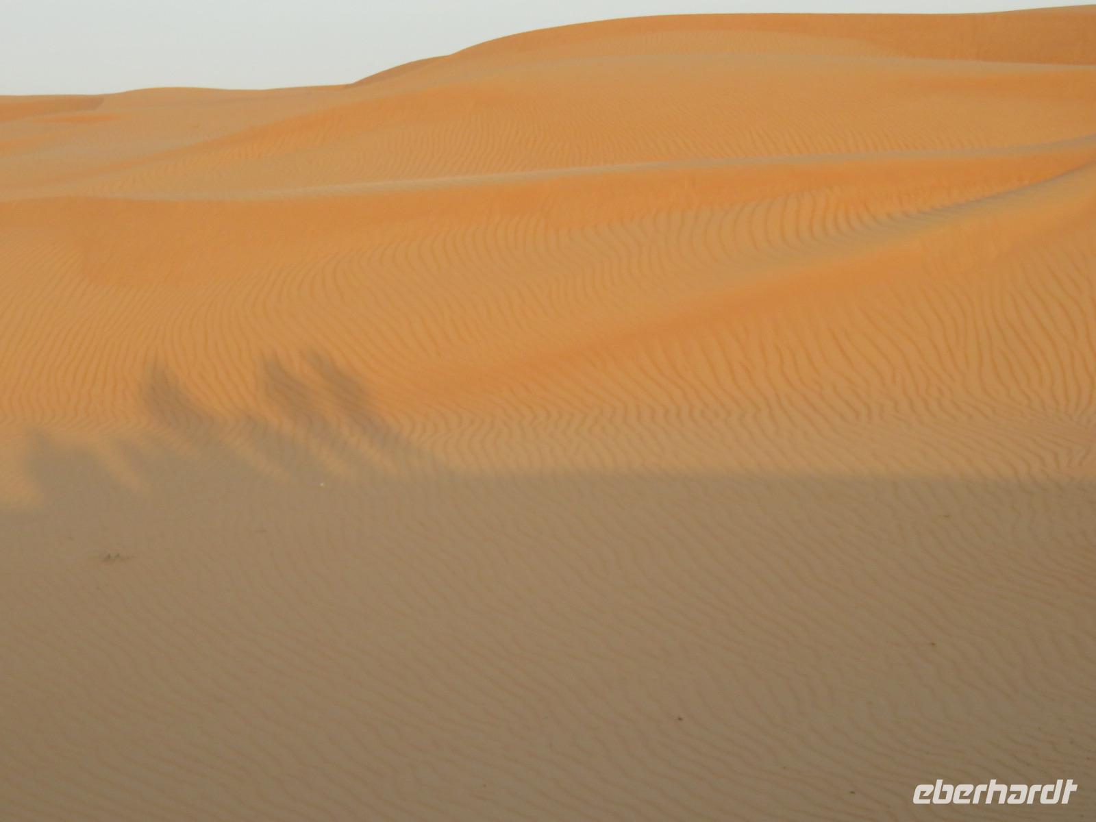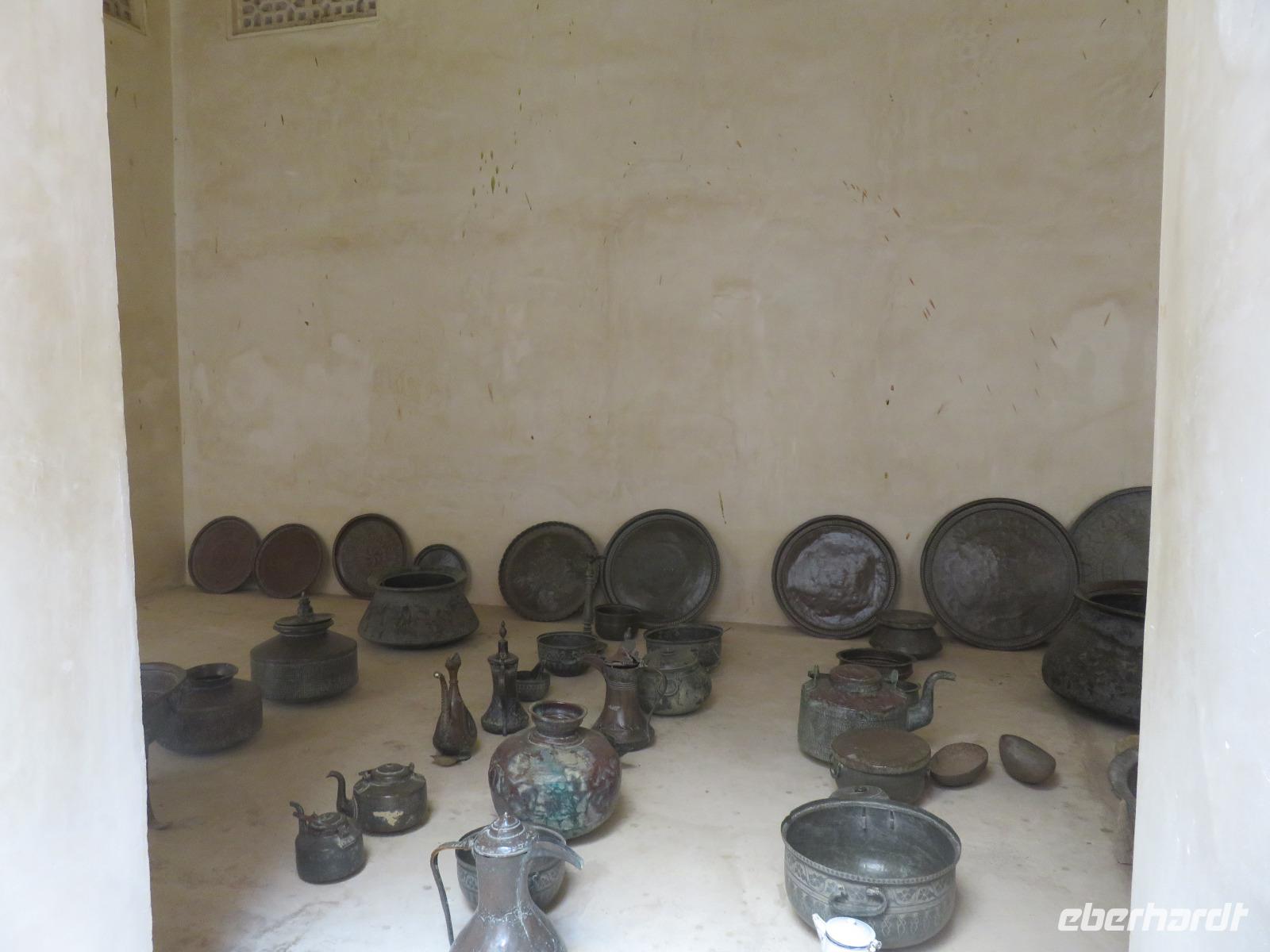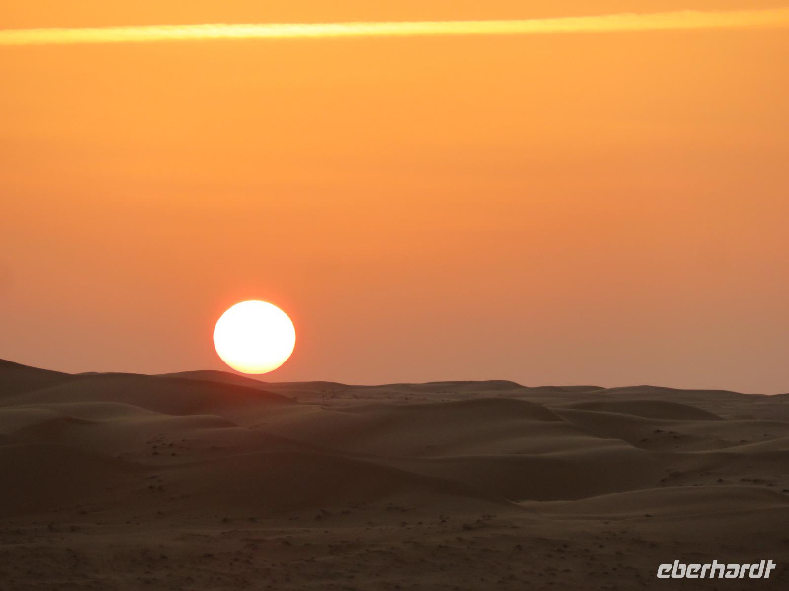 Am Morgen fahren wir zunächst nach Nizwas zum Souk. Zunächst sehen wir den Bereich, wo am Freitag immer der traditionelle Viehmarkt stattfindet. Twafiq erklärt uns kurz das Prozedere, wie die Tiere gehandelt werden. Im Dattelmarkt verkosten wir die verschiedenen Sorten Datteln, die im Oman einfach dazu gehören und überall als eine Form der Gastfreundschaft gereicht werden. Anschließend geht es in den Obst- und Gemüsemarkt. Ganz ursprüngliche bieten die Einheimischen ihre Waren feil. Auf dem Weg zum Fort von Nizwa durchstreifen wir den Gewürzmarkt vorbei. Im Handwerkermarkt mit verschiedenen Angeboten von Silberschmuck, Töpfereiwaren und anderen Kunsthandwerkarbeiten ist etwas Zeit zum Schauen und auch Kaufen. Der Besuch des Souks ist für uns sehr interessant. Anschließend statten wir dem Fort von Nizwa einen Besuch ab. Im 17. Jahrhundert ist es zum Schutz der Stadt errichtet wurden. Im Innenhof tritt gerade eine Gruppe Männer mit traditionellen Gesängen auf und wir lauschen eine Weile. Nun besteigen wir durch das interessante mehrfach verwinkelte Treppenhaus den großen Turm. Von hier oben bietet sich uns ein herrlicher Blick über die Stadt und die umliegenden Berge. Im kleinen Museum bekommen wir einen kleinen, sehr interessanten Einblick in die Geschichte der Stadt und das Leben der Omanis in früherer Zeit. Auf dem Hof zeigen Frauen, wie das traditionelle Omanische Brot gebacken wird. Ein Töpfer und ein Tischler führen ihr Handwerk aus. Wir sehen auch, wie Ziegenkäse auf traditionelle Art hergestellt wird. Nun heißt es nochmals rund 2,5 Stunden zu fahren, ehe wir den Eingang der Wüste erreichen. Nach einer Mittagspause in Ibra wird am Eingang der Wüste der Reifendruck in unseren 4 Jeeps reduziert. Über Sandpisten geht es jetzt direkt ins Wüstenabenteuer. Wir sehen einige Beduinen mit Ihren Ziegen und Kamelen. Allerdings leben heute die meisten Beduinen nicht mehr als Nomaden. Sie sind in festen Häusern in der Wüste sesshaft. Nach etwa 30 Minuten Fahrt kommen wir im Safari Desert Camp an. Mit Tee, omanischem Kaffee und natürlich Datteln werden wir begrüßt. Wir beziehen unsere recht einfach ausgestatteten bungalowartigen Unterkünfte. Nach einer kurzen Pause geht es mit den Jeeps hinauf auf die, dem Camp gegenüber liegende, rote Sanddüne. Das letzte Stück klettern wir durch den feinen Sand hinauf auf den Kamm der Düne. Wir erleben einen fantastischen Sonnenuntergang. Wir sind uns alle einig, dass dies ein Höhepunkt unsrer Reise ist. Wir steigen wieder zu den Jeeps hinab. Etwas abenteuerlich gestaltet sich die Rückfahrt zum Camp. Es geht in direkter Linie die Düne hinab. Es ging alles gut und es ist für uns ein tolles Erlebnis. Das Abendessen wird zum Teil ganz traditionell nach alt omanischer Art im Erdofen zubereitet. Wir dürfen zuschauen, wie das Lammfleisch, welches in Bananenblättern und Tüchern eingewickelt über mehrere Stunden gegart wurde, aus dem Erdofen geholt wird. Anschließend bedienen wir uns am Buffet. Die Beduinen führen einige traditionelle Gesänge vor. Bevor wir uns zur Ruhe legen, bestaunen wir den einmaligen Sternenhimmel. Wir genießen die Stille der Wüste.