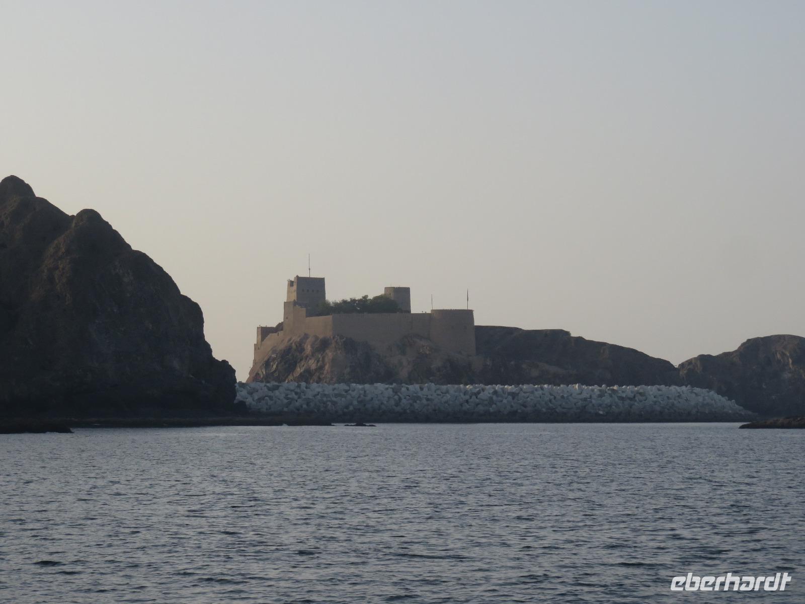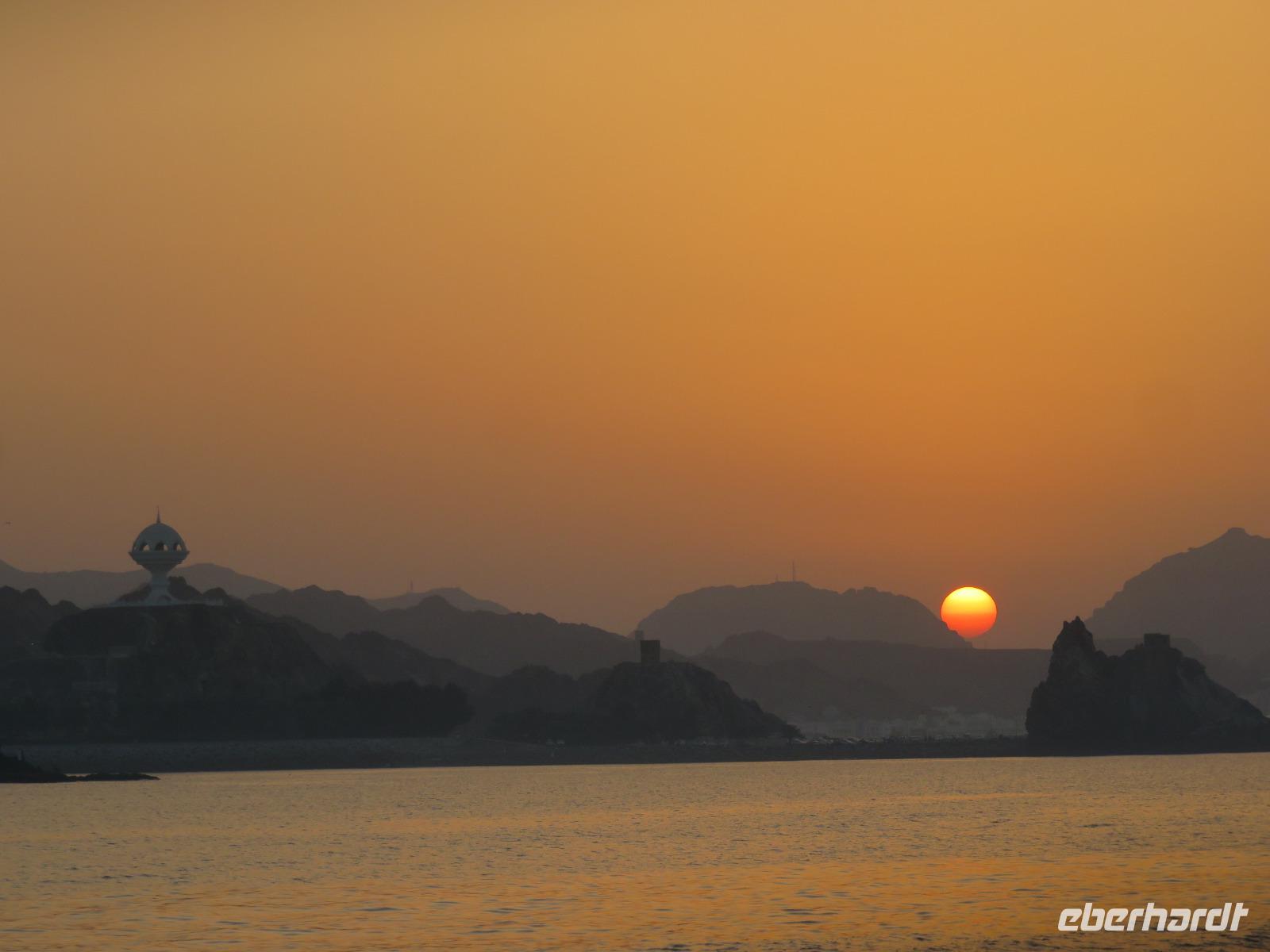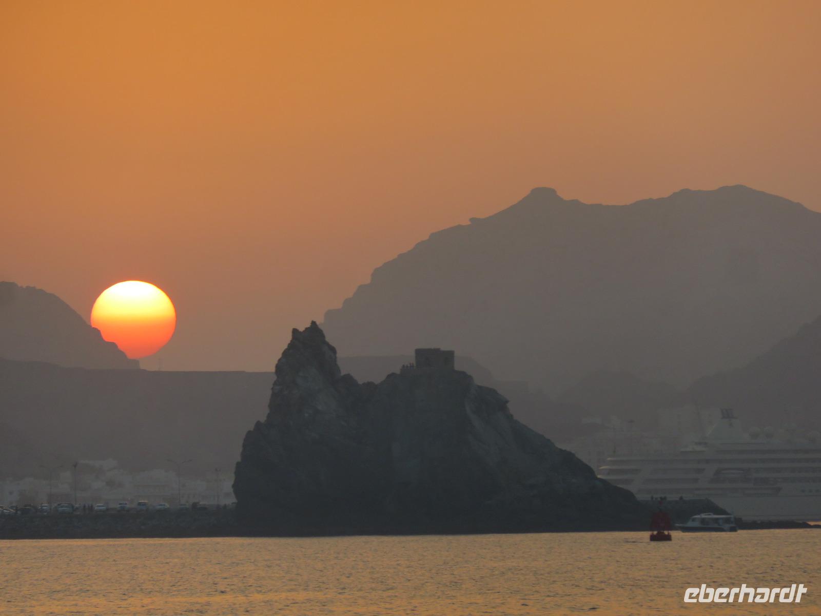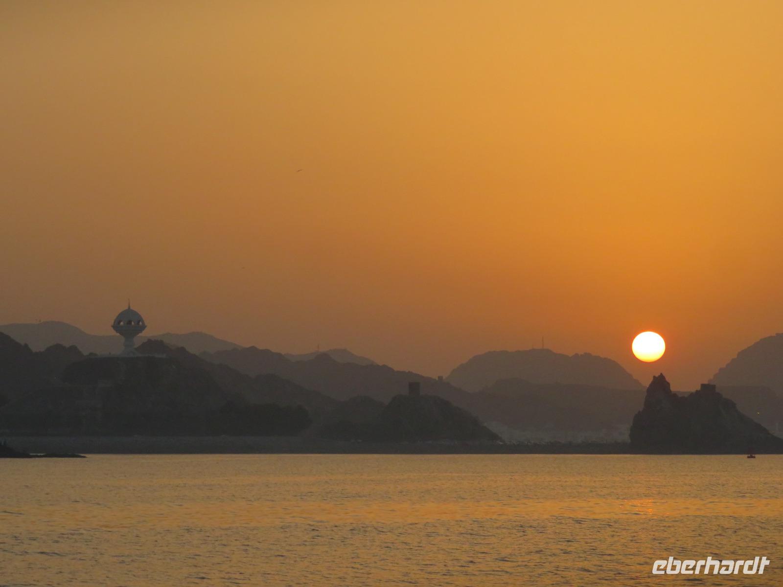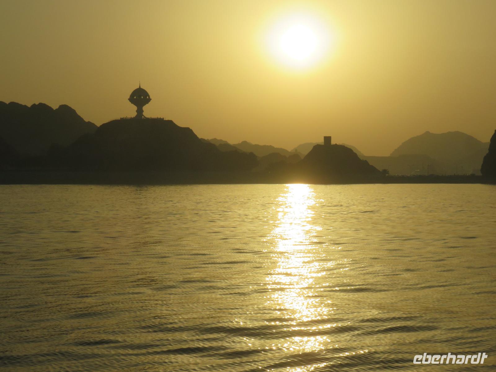 Nach dem Frühstück besuchen wir zunächst den Fischmarkt in Barka. Jeden Morgen kommen die Fischer mit ihrem Fang auf den Markt zum Verkauf. Außerdem findet eine Auktion für die besten Fische statt. Wir schauen einige Zeit bei der Auktion zu. Beim Bummel über den Markt entdecken wir mehrere große Thunfische und viele andere wie Sepias, Baraccudas, verschiedene Hechte, kleine Haie, Rochen und kleine Fische zum Fritieren. Unser nächstes Ziel ist das Fort Nakahl. Es wurde 1990 aufwendig restauriert und diente dem Imam Said bin Sultan im 19. Jahrhundert als Wohnresidenz. Die Ursprünge der Anlage gehen bis ins 17. Jahrhundert zurück. Einige Räume sind wie zur Zeit des Imam eingerichtet. Vom Turm haben wir einen schönen Blick über die Landschaft mit Palmenhainen und Dörfern. An der warmen Quelle Ain Al Thowarah legen wir einen weiteren Stopp ein. Aus der Quelle tritt das Wasser mit einer Temperatur von etwa 40°C aus der Erde und fließt in einen kleinen Wadi. Im Fluss leben kleine Putzerfische, die die Hornhaut von den Füßen knappern. Einige Gäste halten die Füße in das warme Wasser und empfinden die Fische anfänglich als eine sehr kitzelige Angelegenheit, aber dennoch als sehr angenehm. Nach einer kurzen Pause im Hotel führt unser Weg in die Marina von Muscat. Wir besteigen eine traditionelle Dhau. Auf ihr erleben wir eine wunderschöne Fahrt entlang der Küste zum Sonnenuntergang. Wir sehen die alten Forts der Portugiesen, den Sultanspalast und die Yachten des Sultans vor der Altstadt. Während der gemütlichen Tour genießen wir das Meer und einen fantastischen Sonnenuntergang. Der Bus bringt uns nach einem herrlichen Tag zum Hotel zurück.
