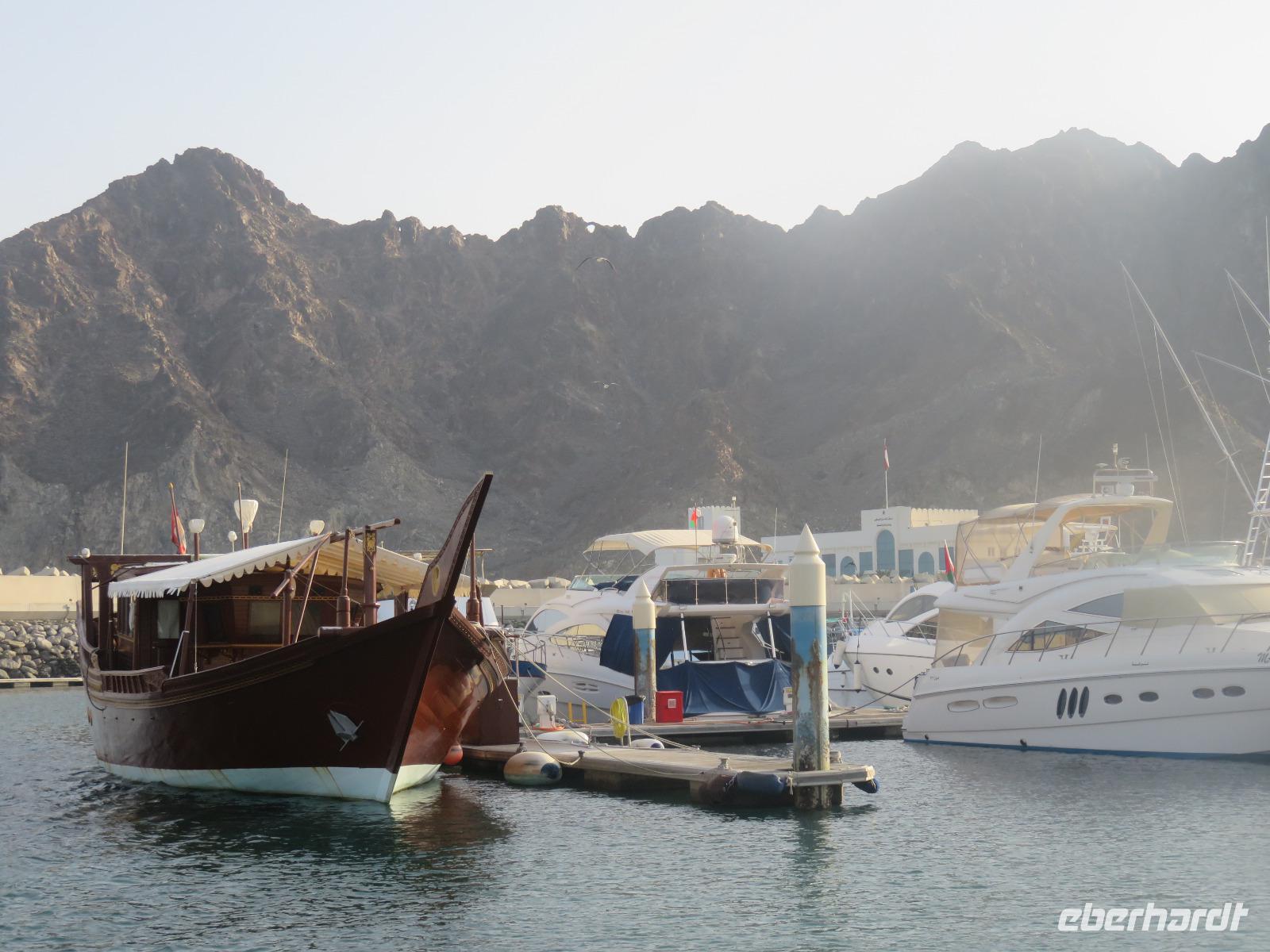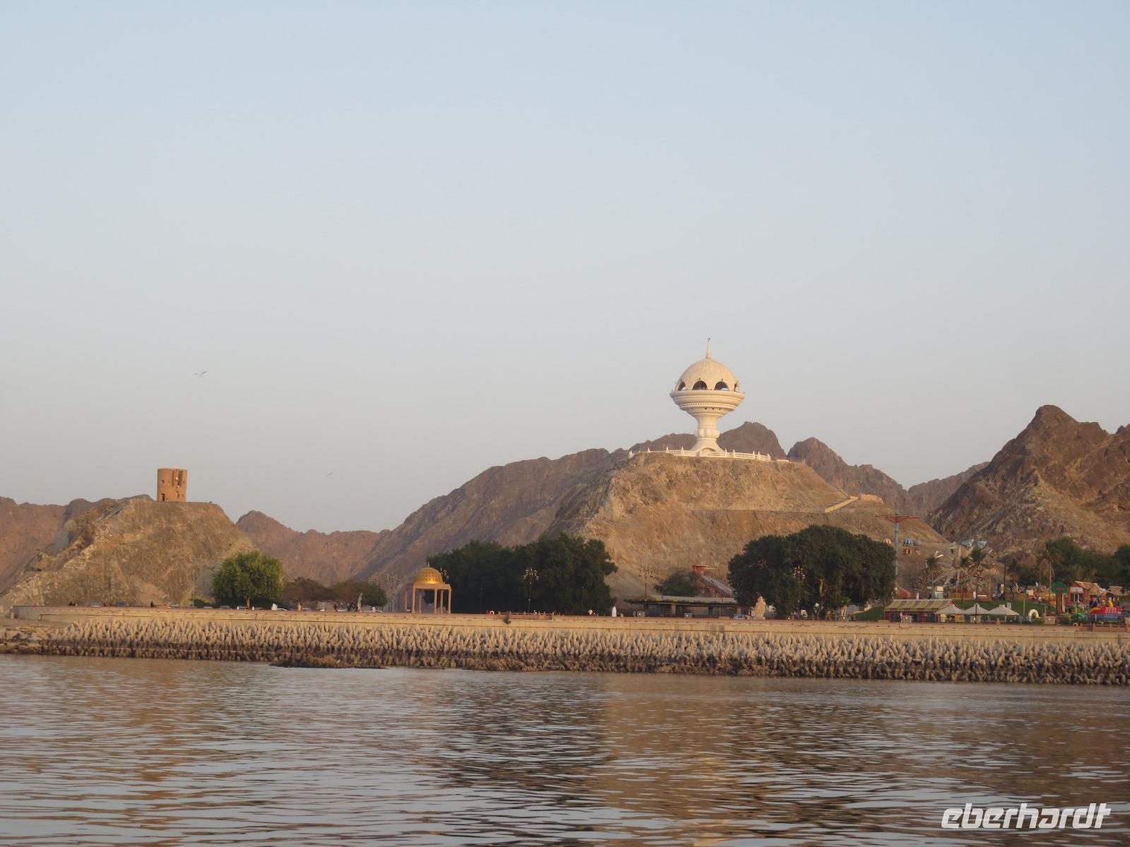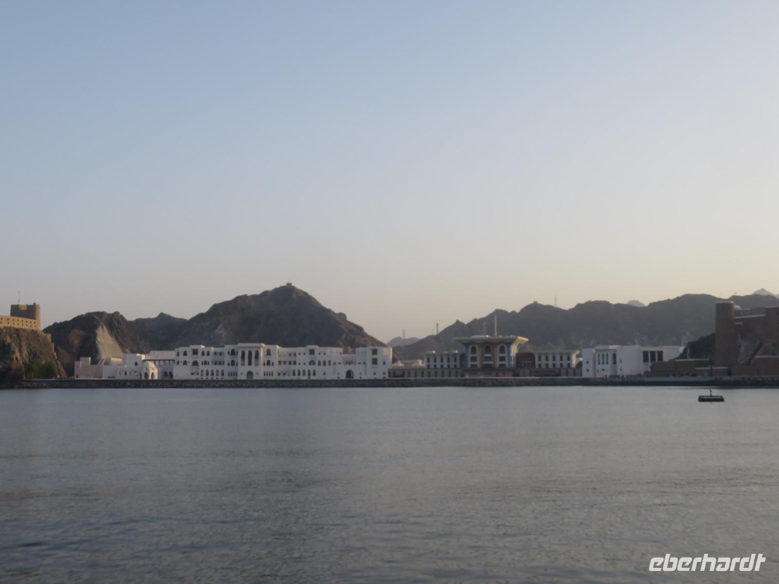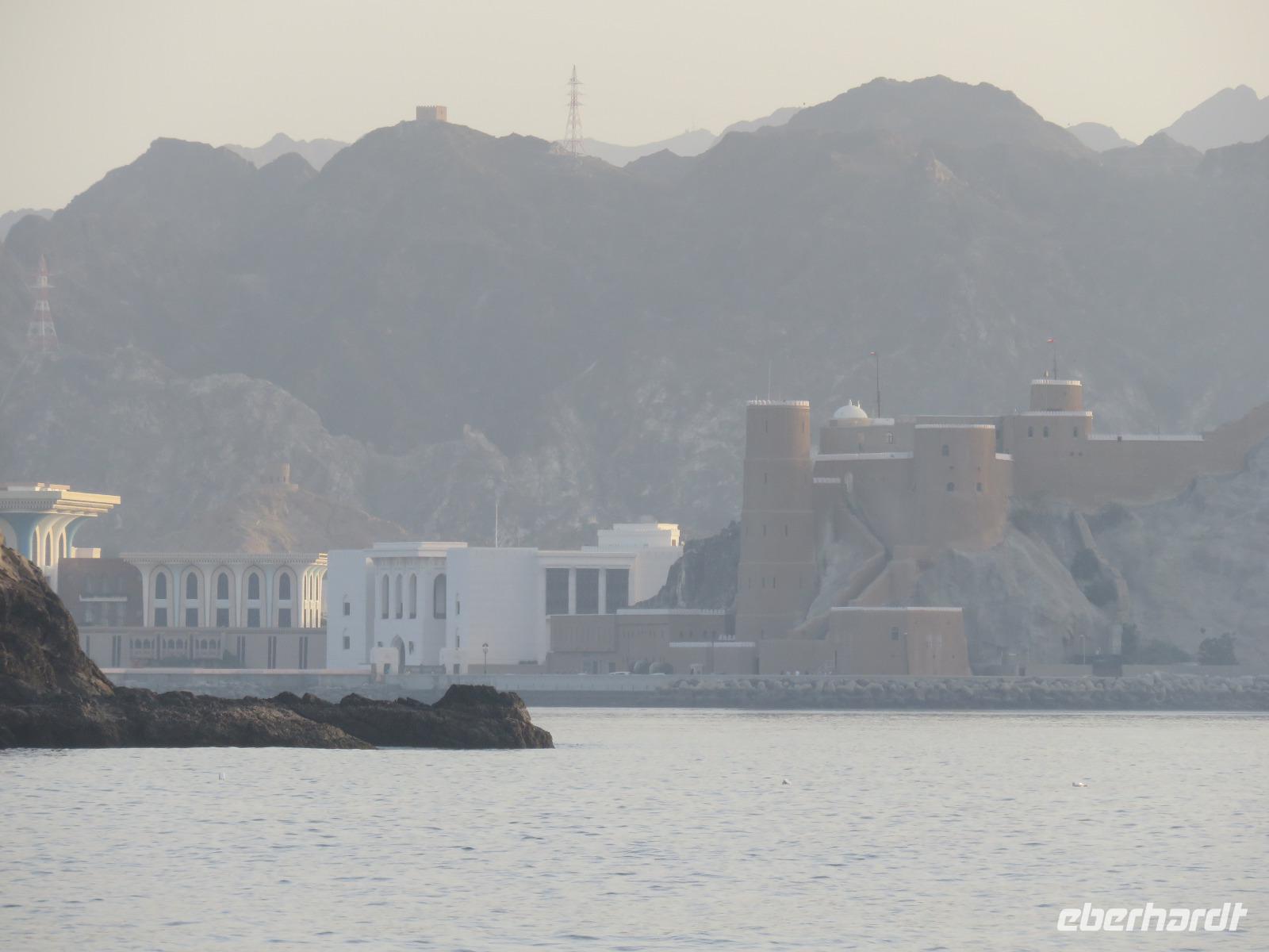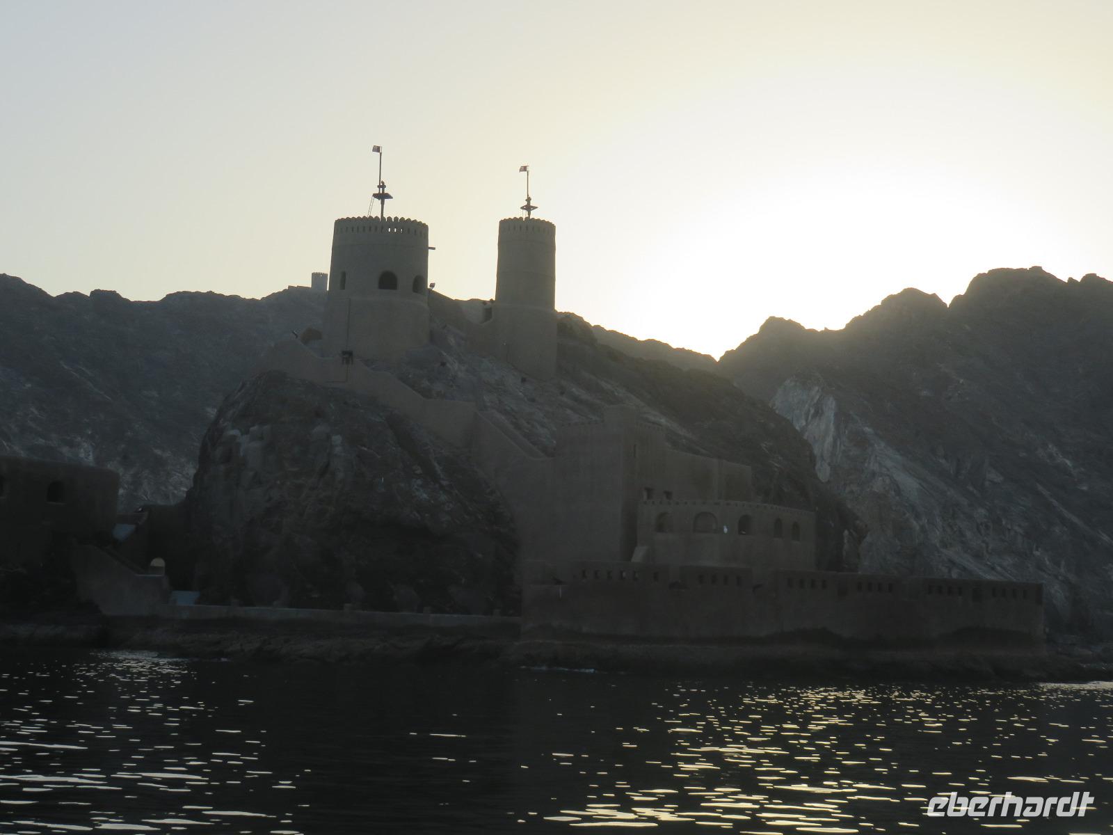 Nach dem Frühstück besuchen wir zunächst den Fischmarkt in Barka. Jeden Morgen kommen die Fischer mit ihrem Fang auf den Markt zum Verkauf. Außerdem findet eine Auktion für die besten Fische statt. Wir schauen einige Zeit bei der Auktion zu. Beim Bummel über den Markt entdecken wir mehrere große Thunfische und viele andere wie Sepias, Baraccudas, verschiedene Hechte, kleine Haie, Rochen und kleine Fische zum Fritieren. Unser nächstes Ziel ist das Fort Nakahl. Es wurde 1990 aufwendig restauriert und diente dem Imam Said bin Sultan im 19. Jahrhundert als Wohnresidenz. Die Ursprünge der Anlage gehen bis ins 17. Jahrhundert zurück. Einige Räume sind wie zur Zeit des Imam eingerichtet. Vom Turm haben wir einen schönen Blick über die Landschaft mit Palmenhainen und Dörfern. An der warmen Quelle Ain Al Thowarah legen wir einen weiteren Stopp ein. Aus der Quelle tritt das Wasser mit einer Temperatur von etwa 40°C aus der Erde und fließt in einen kleinen Wadi. Im Fluss leben kleine Putzerfische, die die Hornhaut von den Füßen knappern. Einige Gäste halten die Füße in das warme Wasser und empfinden die Fische anfänglich als eine sehr kitzelige Angelegenheit, aber dennoch als sehr angenehm. Nach einer kurzen Pause im Hotel führt unser Weg in die Marina von Muscat. Wir besteigen eine traditionelle Dhau. Auf ihr erleben wir eine wunderschöne Fahrt entlang der Küste zum Sonnenuntergang. Wir sehen die alten Forts der Portugiesen, den Sultanspalast und die Yachten des Sultans vor der Altstadt. Während der gemütlichen Tour genießen wir das Meer und einen fantastischen Sonnenuntergang. Der Bus bringt uns nach einem herrlichen Tag zum Hotel zurück.