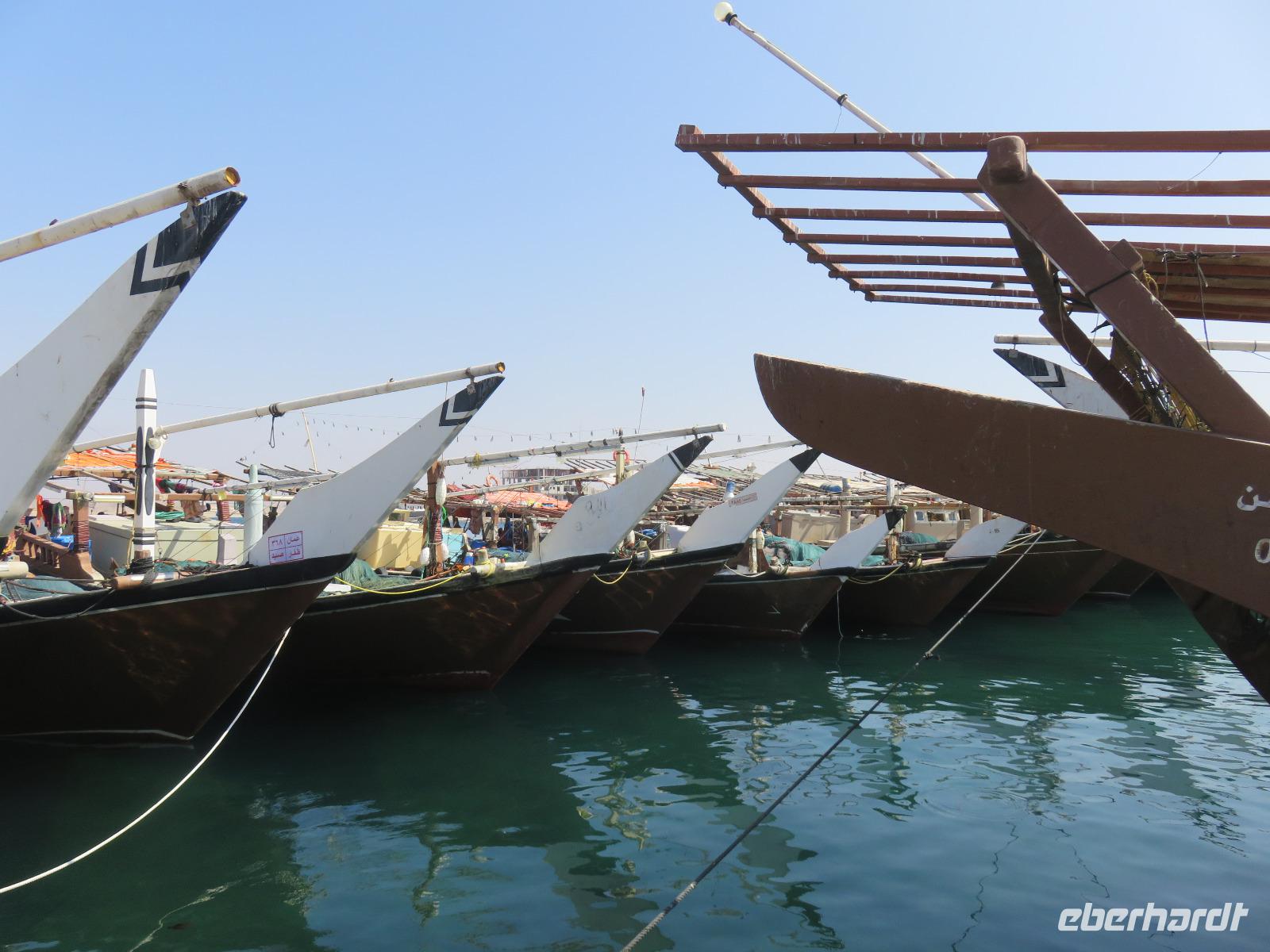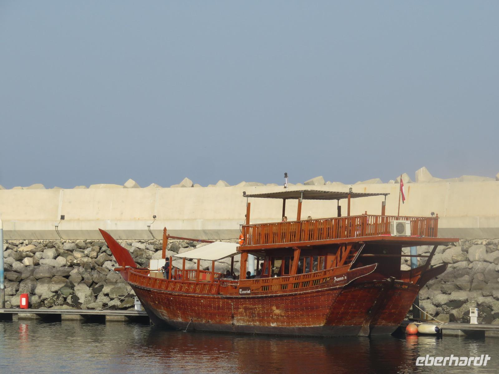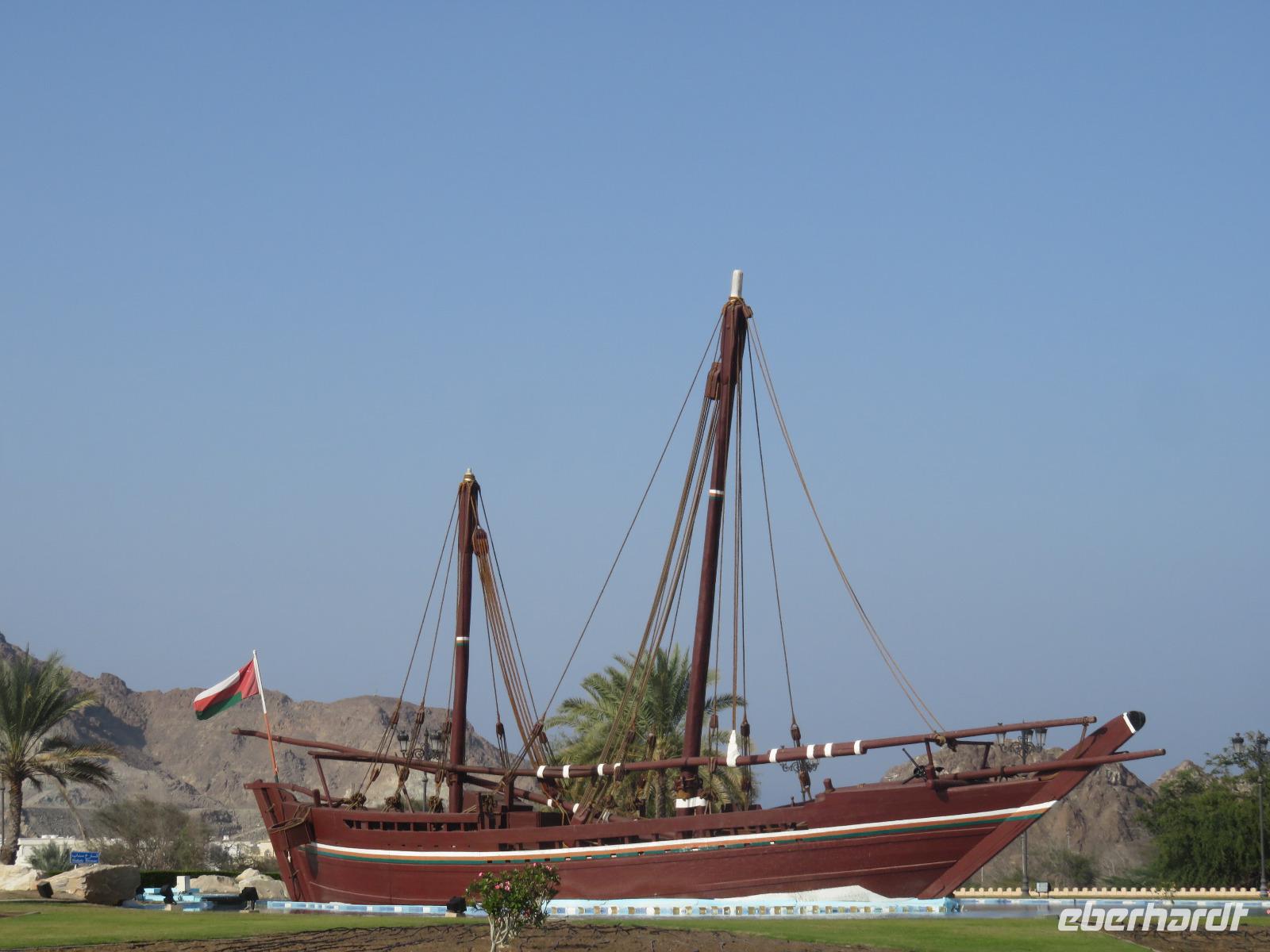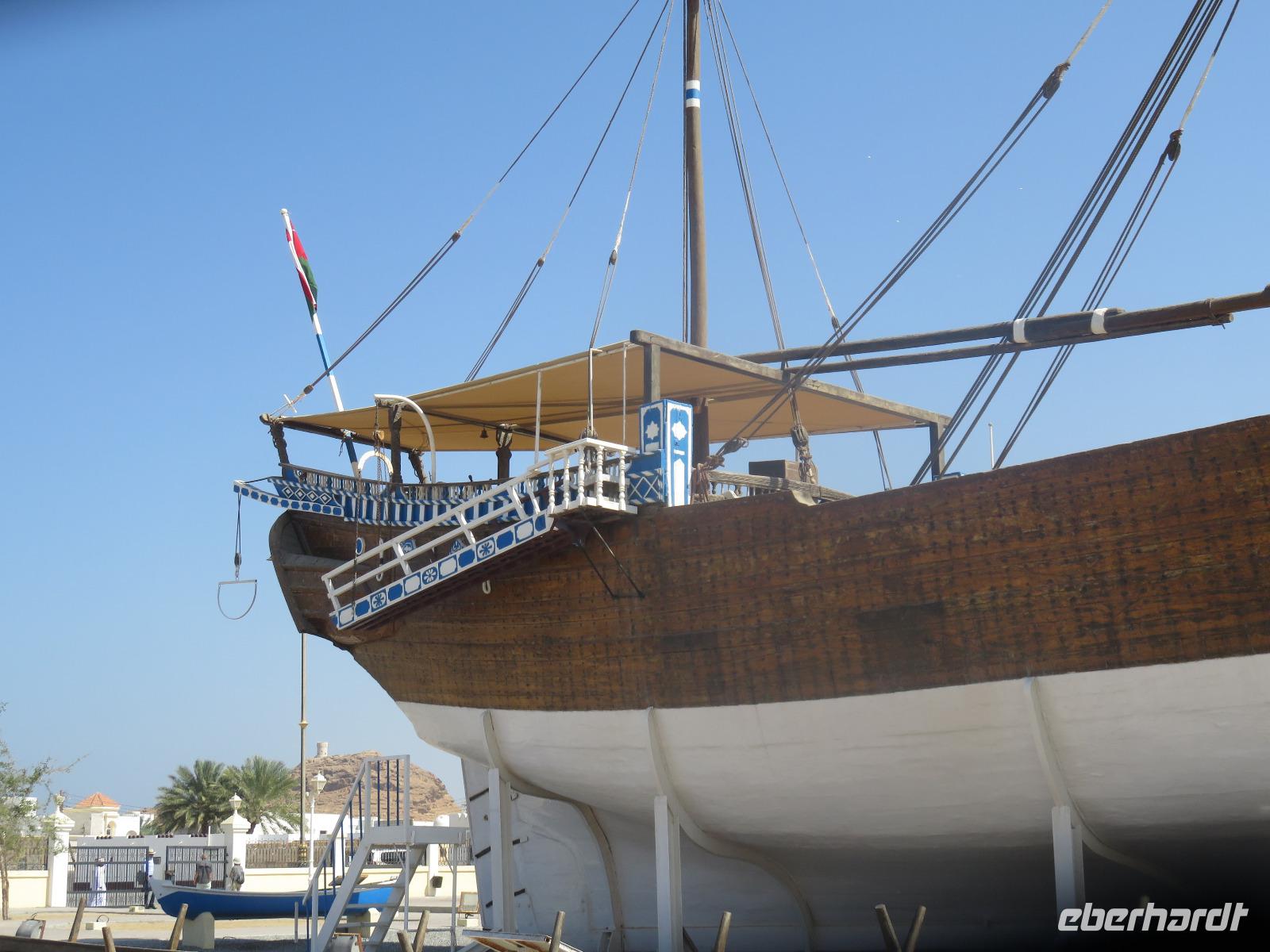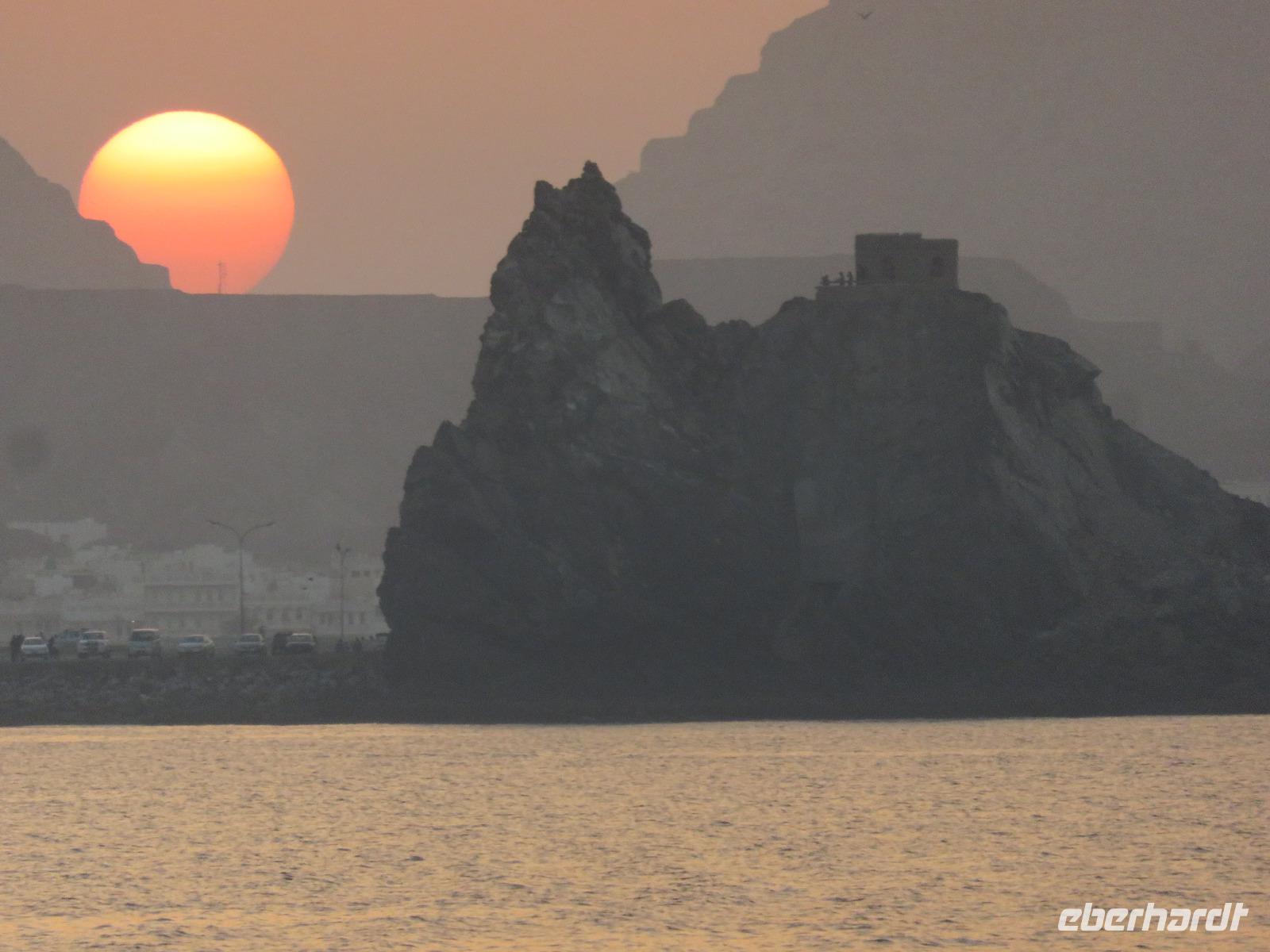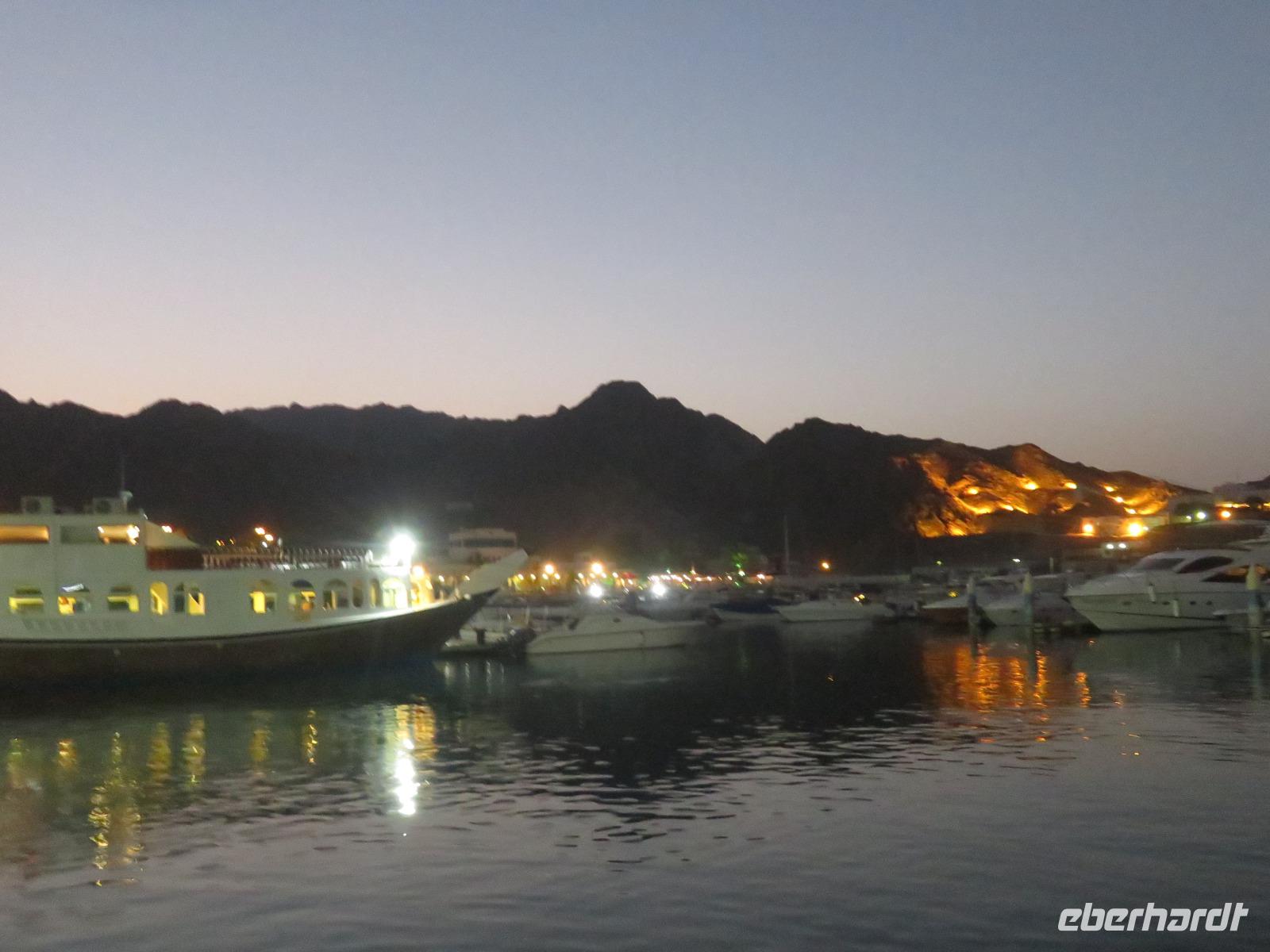 Nach dem Frühstück besuchen wir zunächst den Fischmarkt in Barka. Jeden Morgen kommen die Fischer mit ihrem Fang auf den Markt zum Verkauf. Außerdem findet eine Auktion für die besten Fische statt. Wir schauen einige Zeit bei der Auktion zu. Beim Bummel über den Markt entdecken wir mehrere große Thunfische und viele andere wie Sepias, Baraccudas, verschiedene Hechte, kleine Haie, Rochen und kleine Fische zum Fritieren. Unser nächstes Ziel ist das Fort Nakahl. Es wurde 1990 aufwendig restauriert und diente dem Imam Said bin Sultan im 19. Jahrhundert als Wohnresidenz. Die Ursprünge der Anlage gehen bis ins 17. Jahrhundert zurück. Einige Räume sind wie zur Zeit des Imam eingerichtet. Vom Turm haben wir einen schönen Blick über die Landschaft mit Palmenhainen und Dörfern. An der warmen Quelle Ain Al Thowarah legen wir einen weiteren Stopp ein. Aus der Quelle tritt das Wasser mit einer Temperatur von etwa 40°C aus der Erde und fließt in einen kleinen Wadi. Im Fluss leben kleine Putzerfische, die die Hornhaut von den Füßen knappern. Einige Gäste halten die Füße in das warme Wasser und empfinden die Fische anfänglich als eine sehr kitzelige Angelegenheit, aber dennoch als sehr angenehm. Nach einer kurzen Pause im Hotel führt unser Weg in die Marina von Muscat. Wir besteigen eine traditionelle Dhau. Auf ihr erleben wir eine wunderschöne Fahrt entlang der Küste zum Sonnenuntergang. Wir sehen die alten Forts der Portugiesen, den Sultanspalast und die Yachten des Sultans vor der Altstadt. Während der gemütlichen Tour genießen wir das Meer und einen fantastischen Sonnenuntergang. Der Bus bringt uns nach einem herrlichen Tag zum Hotel zurück.