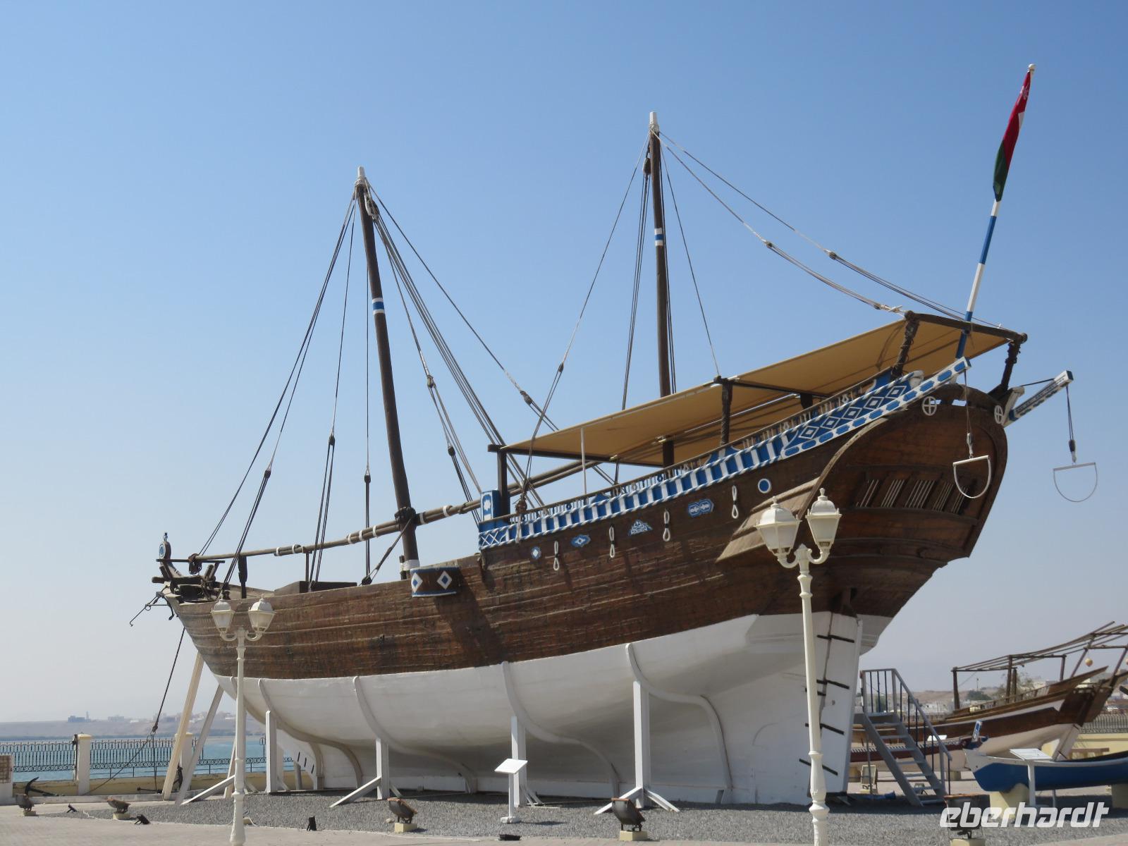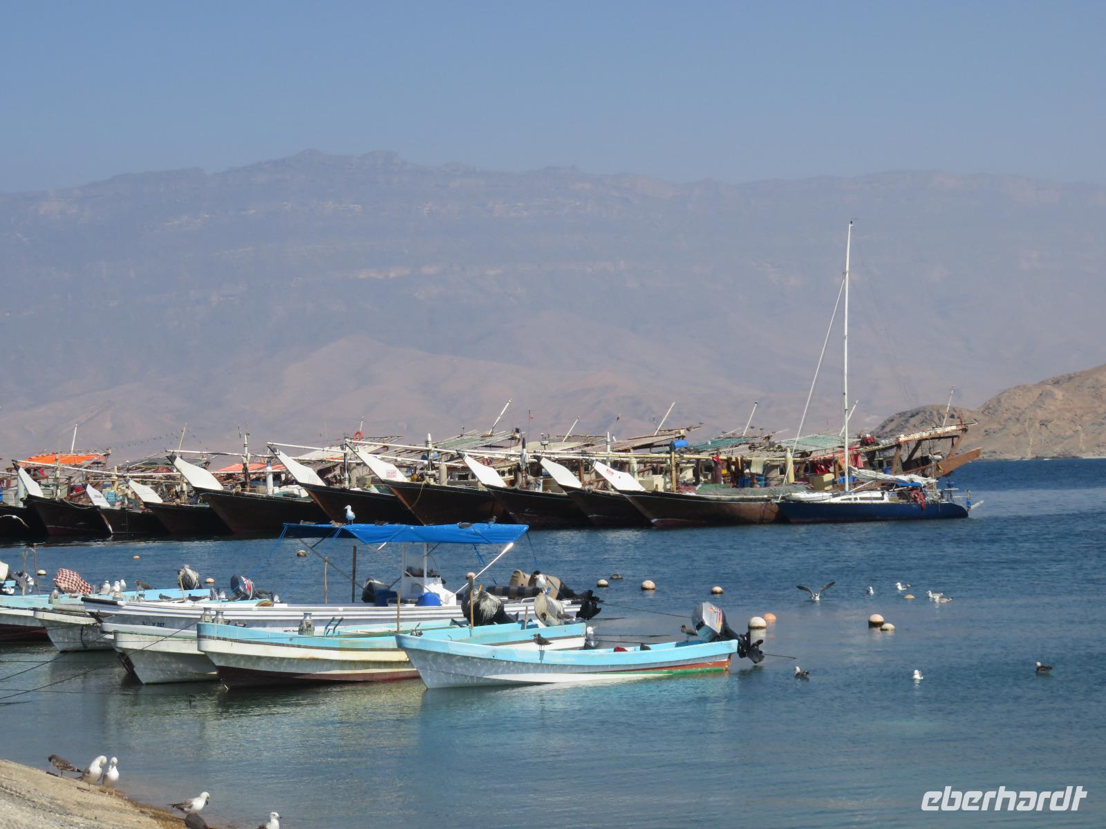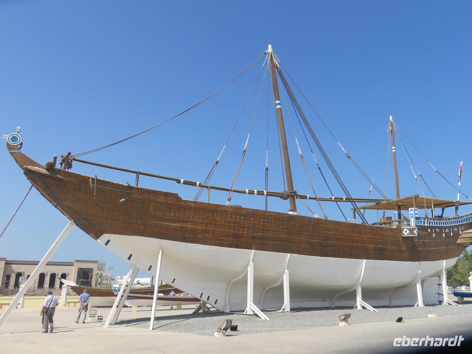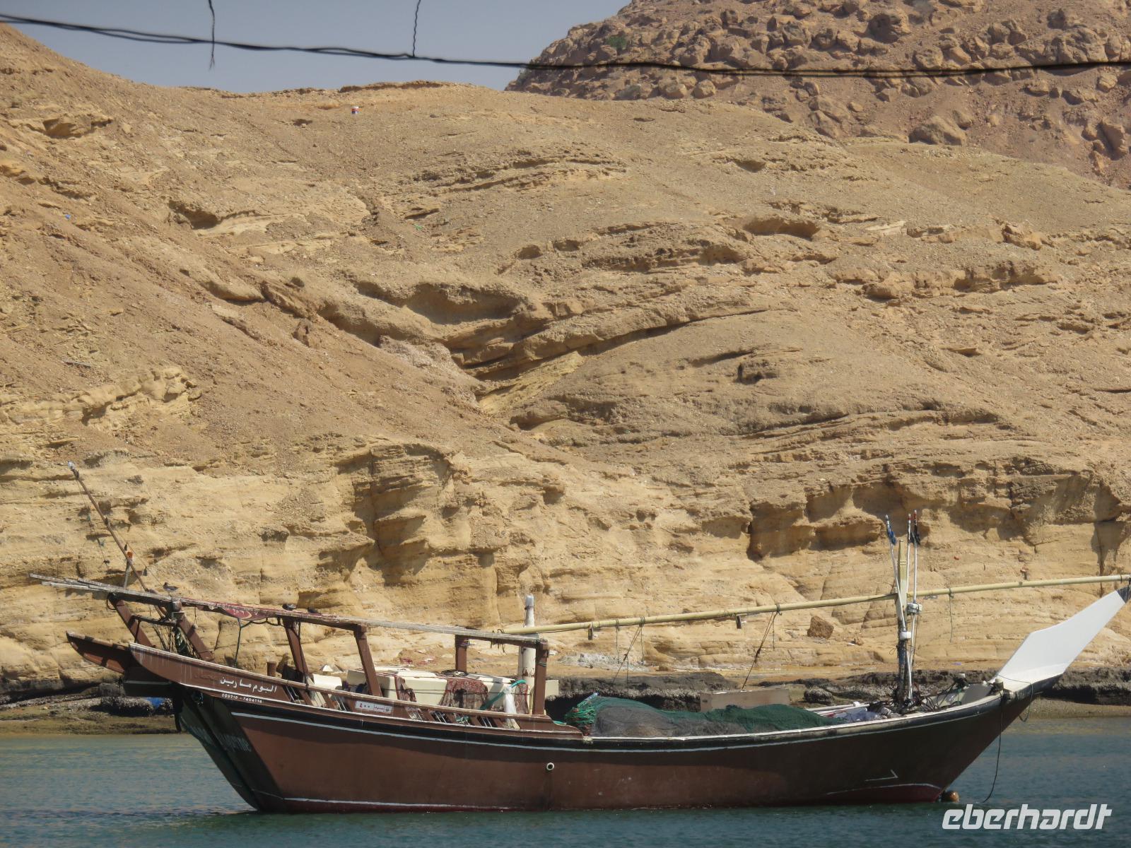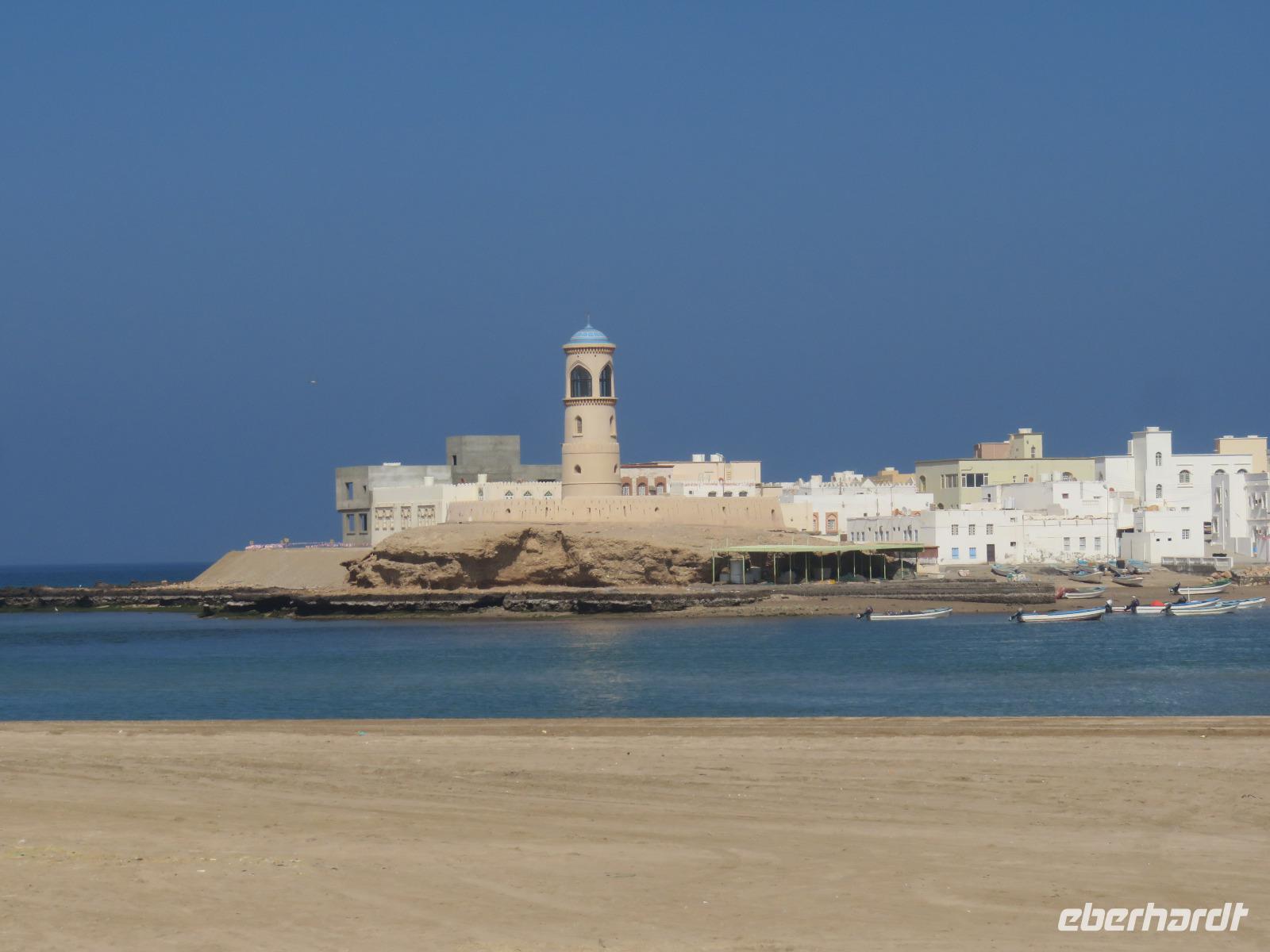 Nach dem Frühstück besuchen wir zunächst den Fischmarkt in Barka. Jeden Morgen kommen die Fischer mit ihrem Fang auf den Markt zum Verkauf. Außerdem findet eine Auktion für die besten Fische statt. Wir schauen einige Zeit bei der Auktion zu. Beim Bummel über den Markt entdecken wir mehrere große Thunfische und viele andere wie Sepias, Baraccudas, verschiedene Hechte, kleine Haie, Rochen und kleine Fische zum Fritieren. Unser nächstes Ziel ist das Fort Nakahl. Es wurde 1990 aufwendig restauriert und diente dem Imam Said bin Sultan im 19. Jahrhundert als Wohnresidenz. Die Ursprünge der Anlage gehen bis ins 17. Jahrhundert zurück. Einige Räume sind wie zur Zeit des Imam eingerichtet. Vom Turm haben wir einen schönen Blick über die Landschaft mit Palmenhainen und Dörfern. An der warmen Quelle Ain Al Thowarah legen wir einen weiteren Stopp ein. Aus der Quelle tritt das Wasser mit einer Temperatur von etwa 40°C aus der Erde und fließt in einen kleinen Wadi. Im Fluss leben kleine Putzerfische, die die Hornhaut von den Füßen knappern. Einige Gäste halten die Füße in das warme Wasser und empfinden die Fische anfänglich als eine sehr kitzelige Angelegenheit, aber dennoch als sehr angenehm. Nach einer kurzen Pause im Hotel führt unser Weg in die Marina von Muscat. Wir besteigen eine traditionelle Dhau. Auf ihr erleben wir eine wunderschöne Fahrt entlang der Küste zum Sonnenuntergang. Wir sehen die alten Forts der Portugiesen, den Sultanspalast und die Yachten des Sultans vor der Altstadt. Während der gemütlichen Tour genießen wir das Meer und einen fantastischen Sonnenuntergang. Der Bus bringt uns nach einem herrlichen Tag zum Hotel zurück.