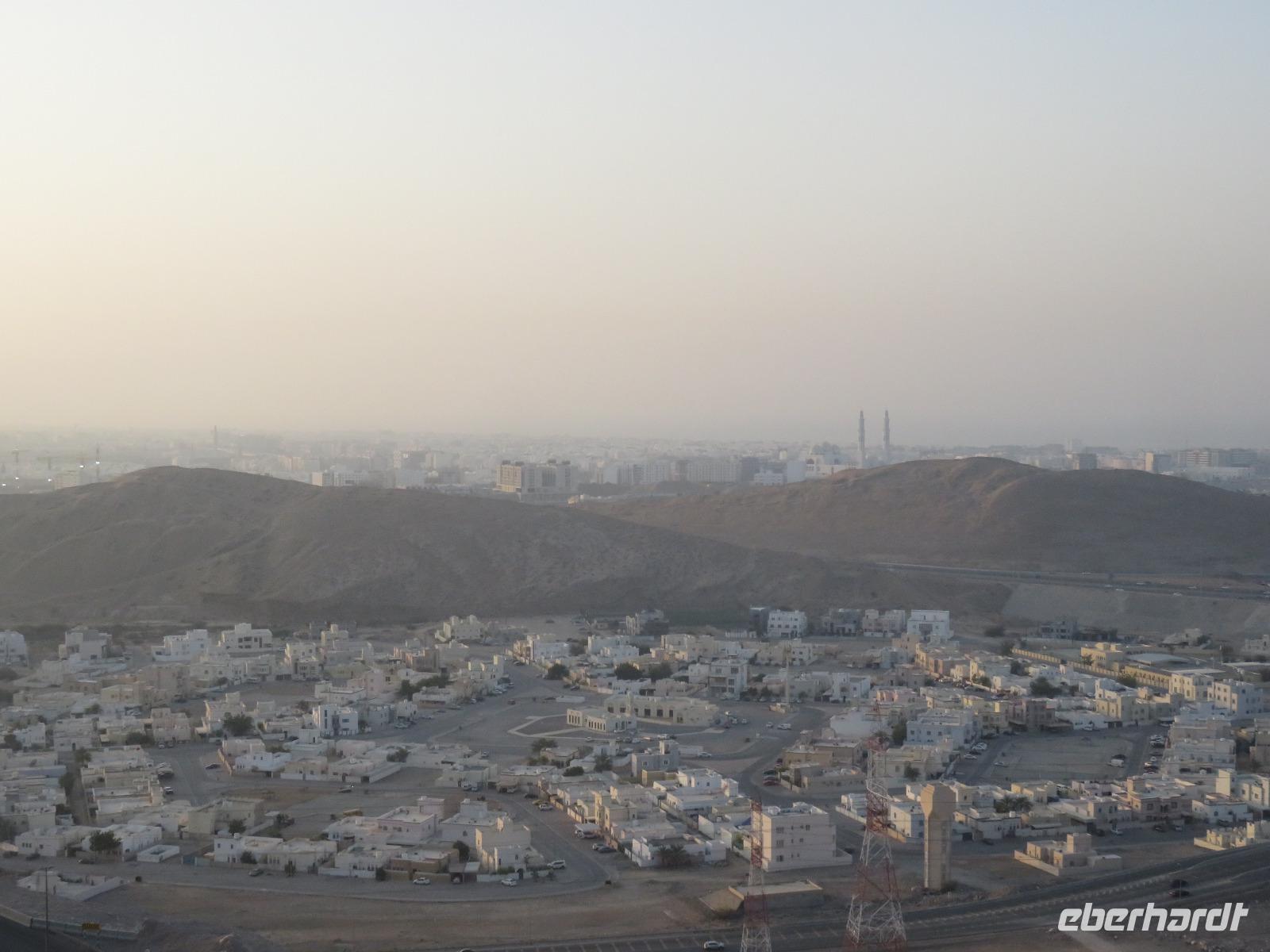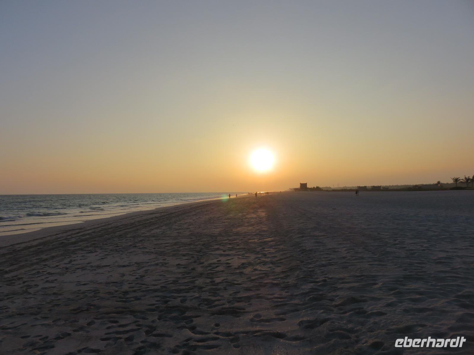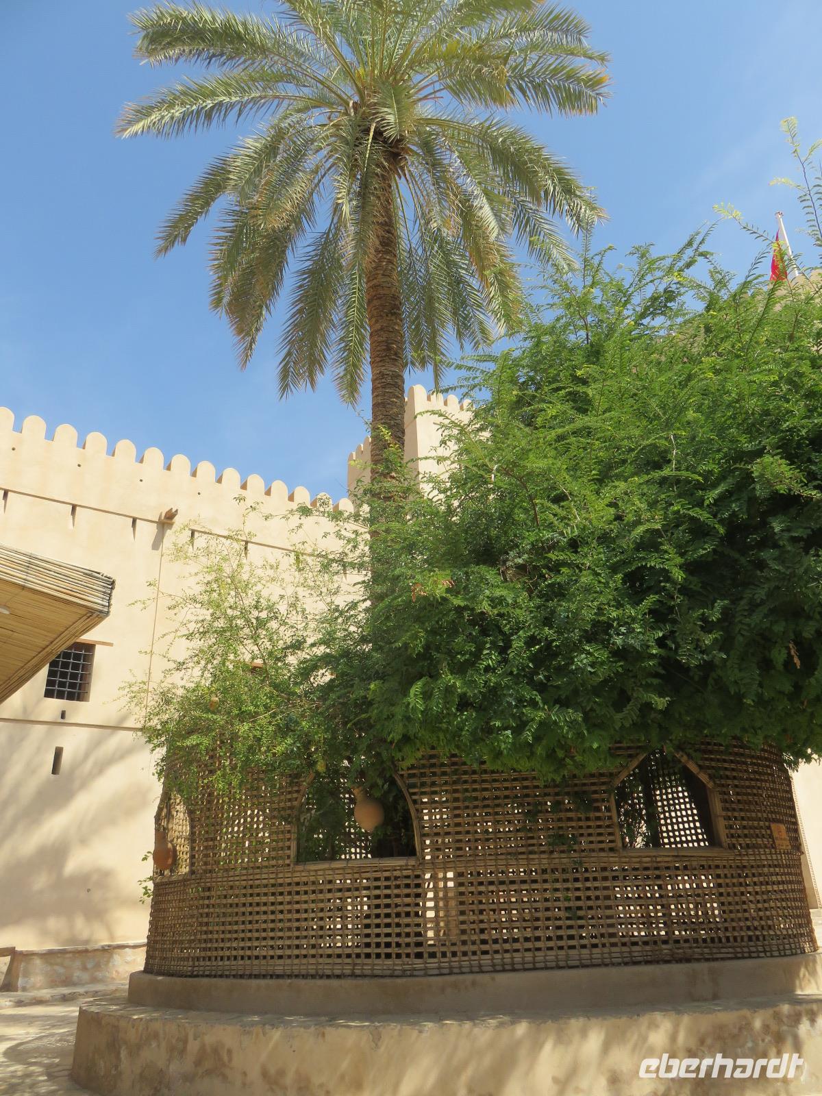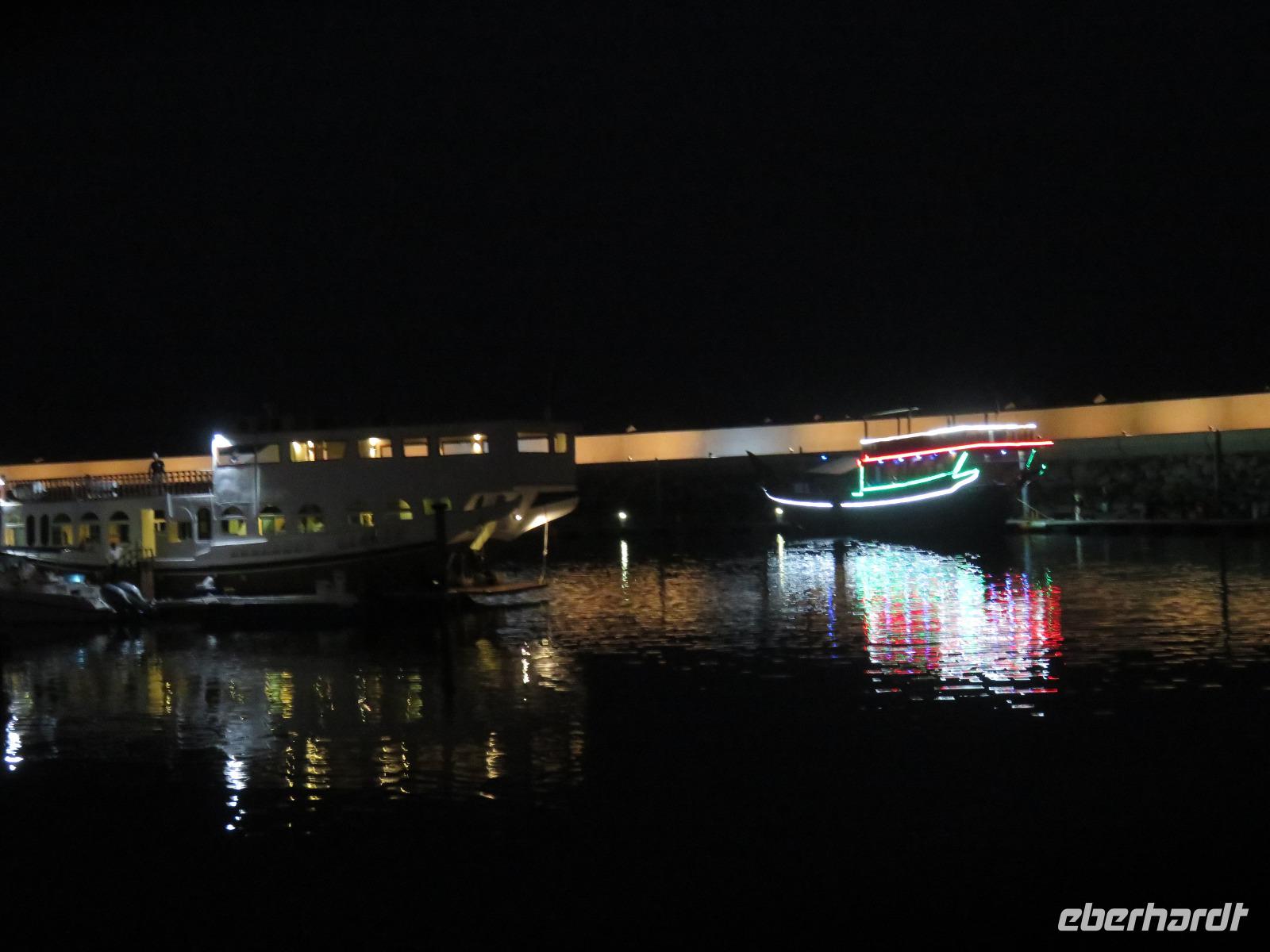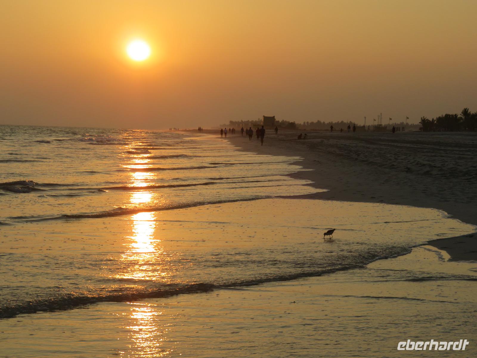 Nach dem Frühstück besuchen wir zunächst den Fischmarkt in Barka. Jeden Morgen kommen die Fischer mit ihrem Fang auf den Markt zum Verkauf. Außerdem findet eine Auktion für die besten Fische statt. Wir schauen einige Zeit bei der Auktion zu. Beim Bummel über den Markt entdecken wir mehrere große Thunfische und viele andere wie Sepias, Baraccudas, verschiedene Hechte, kleine Haie, Rochen und kleine Fische zum Fritieren. Unser nächstes Ziel ist das Fort Nakahl. Es wurde 1990 aufwendig restauriert und diente dem Imam Said bin Sultan im 19. Jahrhundert als Wohnresidenz. Die Ursprünge der Anlage gehen bis ins 17. Jahrhundert zurück. Einige Räume sind wie zur Zeit des Imam eingerichtet. Vom Turm haben wir einen schönen Blick über die Landschaft mit Palmenhainen und Dörfern. An der warmen Quelle Ain Al Thowarah legen wir einen weiteren Stopp ein. Aus der Quelle tritt das Wasser mit einer Temperatur von etwa 40°C aus der Erde und fließt in einen kleinen Wadi. Im Fluss leben kleine Putzerfische, die die Hornhaut von den Füßen knappern. Einige Gäste halten die Füße in das warme Wasser und empfinden die Fische anfänglich als eine sehr kitzelige Angelegenheit, aber dennoch als sehr angenehm. Nach einer kurzen Pause im Hotel führt unser Weg in die Marina von Muscat. Wir besteigen eine traditionelle Dhau. Auf ihr erleben wir eine wunderschöne Fahrt entlang der Küste zum Sonnenuntergang. Wir sehen die alten Forts der Portugiesen, den Sultanspalast und die Yachten des Sultans vor der Altstadt. Während der gemütlichen Tour genießen wir das Meer und einen fantastischen Sonnenuntergang. Der Bus bringt uns nach einem herrlichen Tag zum Hotel zurück.