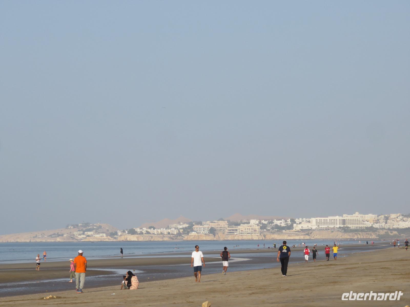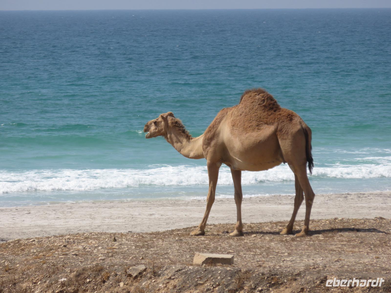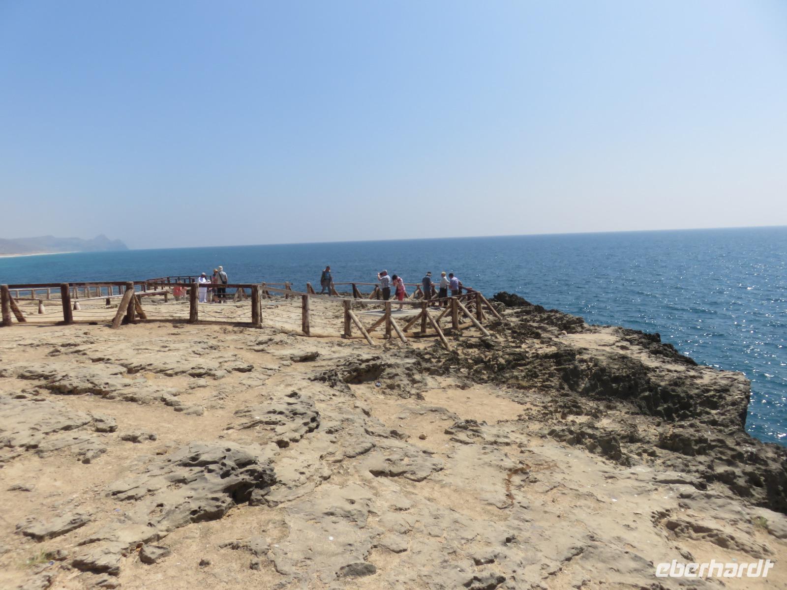 Nach dem Frühstück fahren wir in den Westen von Dhofar. Zunächst geht es hinauf in das Qara-Gebirge. Wir finden hier eine völlig andere Landschaft vor, als wir Sie im Norden des Omans erlebt haben. Kalkstein ist das dominierende Gestein und dementsprechend gibt es verschiedenste Fels- und Gebirgsformationen. Zuerst bringt uns der Bus auf 820 Meter Höhe. Dabei eröffnen sich uns immer wieder neue Ausblicke auf Salalah und die Berge. Wir sehen kleine Dörfer und Kamele, die an den Hängen nach Futter suchen. Unser Ziel ist das Grabmal des Propheten Hiob. Es liegt auf einem Berg. Salem erklärt uns die Geschichte von Hiob, der mit seiner Familie hier gelebt hat. Dann aber erfuhr er durch Krankheit großes Leid und verlor alles, außer seinen Glauben an Gott. Als es ihm ganz schlecht ging soll er der Legende nach mit dem Fuß auf den Boden gestampft haben und eine Quelle tat sich auf. Er wurde geheilt und seine Familie kehrte zurück und er führte ein gutes Leben bis zu seinem Tod. Wir sehen den Fußabdruck und den kleinen Tempel, in dem sich das Grab befindet. Nun geht es wieder hinab ans Meer. Unterwegs halten wir an einem Weihrauchbaum. Salem erklärt uns, wie der Weihrauch gewonnen wird: Die Stämme der Bäume werden angeritzt und das Harz tritt als weiße Flüssigkeit aus. Es trocknet in der Sonne und der Weihrauch kann nach 3 - 4 Wochen gesammelt werden. Weiter fahren wir zum Strand von Mughsay. Auch dieser mutet an, wie in der Karibik. Uns begegnet eine große Herde Kamele, die wir natürlich bei einem Fotostopp im Bild festhalten müssen. Zunächst besuchen wir einen Aussichtspunkt oberhalb des wunderbaren Strandes in mitten einer faszinierenden Gebirgslandschaft aus Kalkstein. Wir haben einen wunderschönen Blick auf das türkisblaue Meer tief unter uns. Anschließend erreichen wir wieder den Strand und besuchen die Blowholes von Mughsayl. In mitten bizarrer Felsgebilde am Strand schießen bei entsprechendem Wasserstand in regelmäßigen Abständen Meerwasserfontänen in die Luft. Leider können wir dies aber nicht beobachten, da der Wasserstand zu niedrig ist. Wir sehen aber eine Meeresschildkröte und sind fasziniert von der Schönheit des Ortes. Am Mittag kehren wir zum Hotel zurück. Der Nachmittag steht allen zum Erholen und Genießen des wunderschönen Karibik-Flairs am Strand zur Verfügung. Der Tag klingt wieder beim leckeren Abendessen im Strandrestaurant aus.