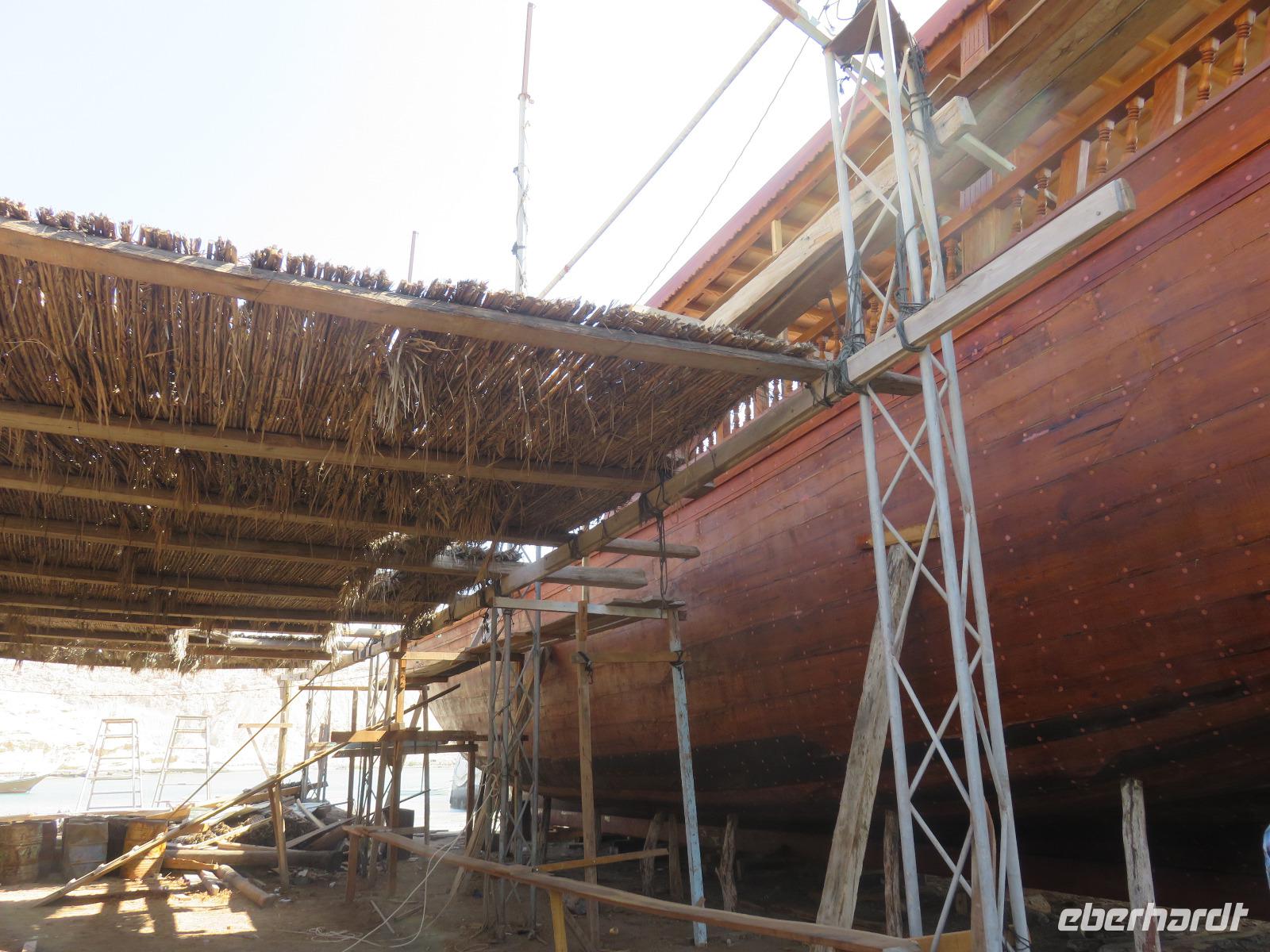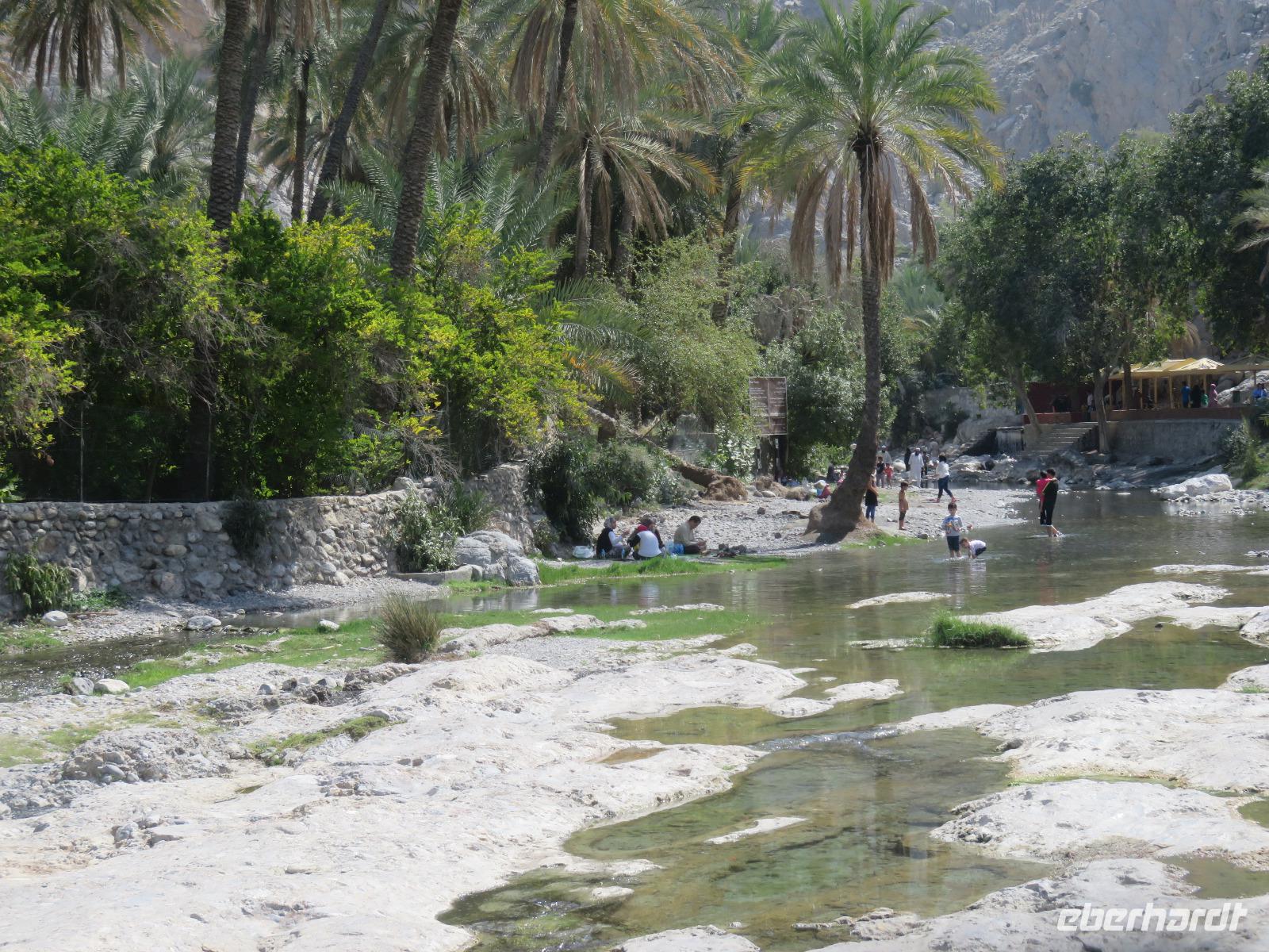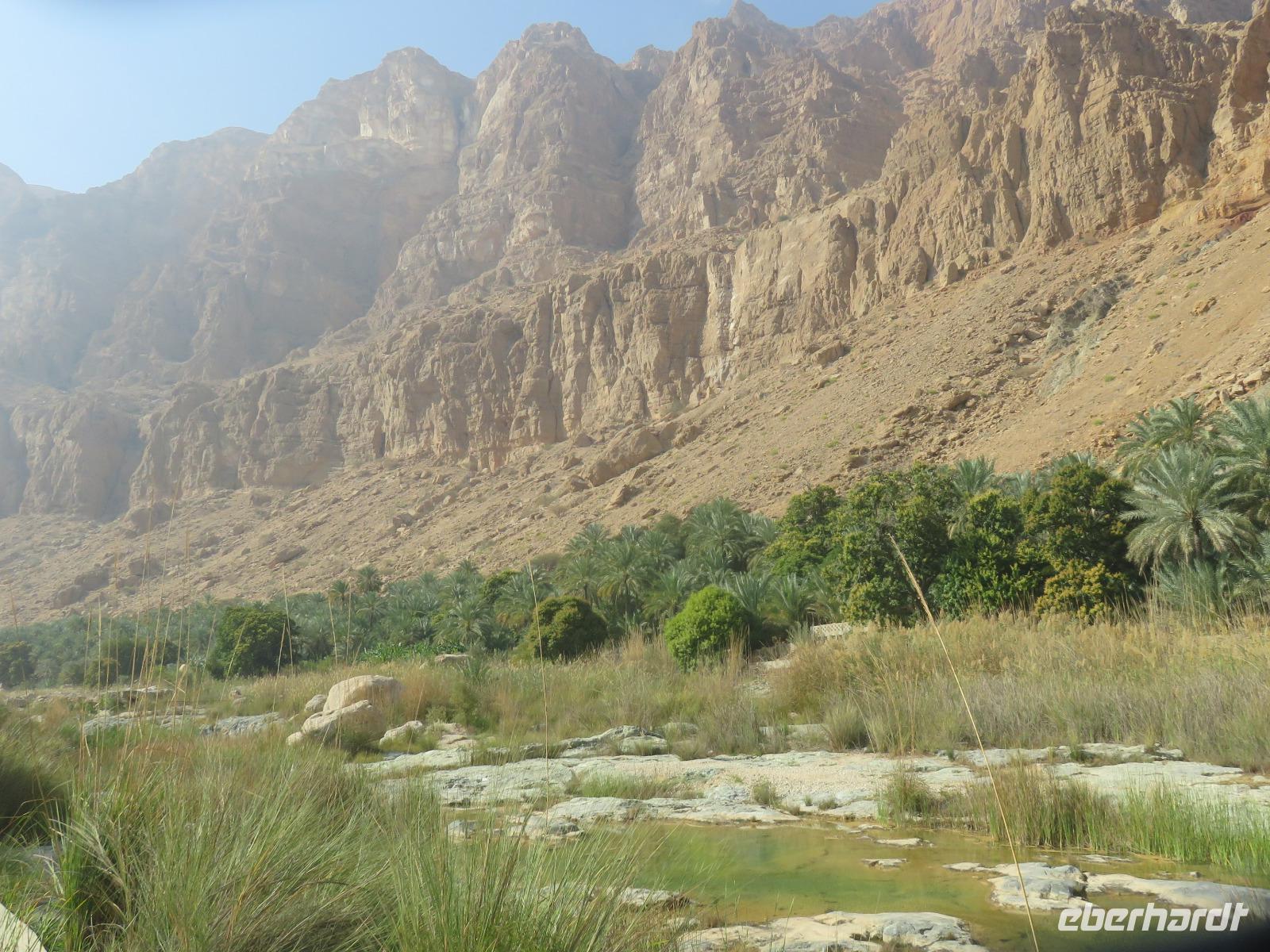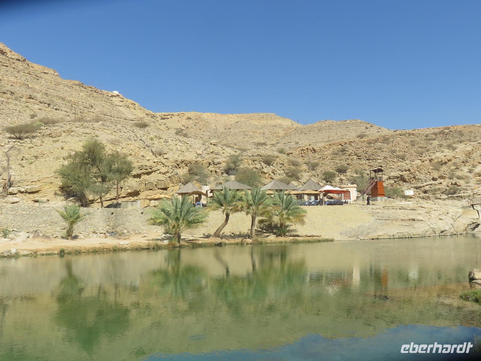 Am Morgen frühstücken wir im Camp. Anschließend fahren wir über die Sandpiste wieder zurück aus der Wüste. Nun muss der Reifendruck wieder erhöht werden. Unsere Fahrt führt uns hinein in die Alha Jar Ash Sharqi Berge zum Wadi Bani Khalid. Nach einem kurzen Spaziergang erreichen wir den wunderschönen See und die Schlucht mit beeindruckenden Gesteinsformationen, die das Wasser geformt hat. Im Fluss und See wagen einige Mutige aus unserer Gruppe ein Bad im warmen Wasser. Wir sind von der Schönheit des Wadis mit den Palmen sehr beeindruckt. Wir haben genügend Zeit, um diese auf uns wirken zu lassen. Über die wiederum sehr gut ausgebaute Straße durch die Berge geht die Reise wieder hinab in die Ebene. Gegen Mittag erreichen wir Sur, eine der ältesten Städte des Omans. Wir schauen uns zunächst eine alte Dhau an, welche bis in die siebziger Jahre des letzten Jahrhunderts noch auf dem Meer unterwegs war. Sie liegt nun an der Lagune von Sur als Ausstellungsstück neben einigen kleinen Booten. In einer einzigen Werft, die es in Sur noch gibt, werden heute noch nach traditioneller Art mit viel Handarbeit die Dhaus gebaut. Wir sehen eine fast fertige Dhau, an der indische Arbeiter beschäftigt sind. Die Dhaus werden heute meist als Yacht von Geschäftsleuten oder auch als Restaurants ausgestattet in Auftrag gegeben. Es werden jedoch moderne Elemente, wie Klimaanlage und Motorantrieb eingebaut. Für die prächtigen traditionellen Holzschiffe muss je nach ihrer Ausstattung der stolze Preis von 600.000 - 900.000 € bezahlt werden. An der Chorniche, der schönen Strandpromenade von Sur legen wir eine kurze Mittagspause ein. Weiter führt uns unsere Fahrt an der Küste entlang zum Wadi Tiwi. Es ist einer der schönsten Wadis. Er zieht sich über eine Länge von ca. 65 Kilometer durch die Berge. Wir fahren mit unseren Jeeps ein Stück hinein und sind überwältigt von den riesigen, hoch aufragenden Felswänden. Am Fuß der Wände befinden sich am Ufer des kleinen Flusses, der ganzjährig Wasser führt, wunderschöne Palmen und andere Pflanzen. Im Wadi gibt es mehrere Dörfer. Nach einem ausgiebigen Fotostopp fahren wir zurück an die Küste. Auf unserem weiteren Programm steht Besichtigung des Sinkhole bei Bamah. Der riesige Krater im Kalkstein entstand durch das Meerwasser und steht in Verbindung mit dem Meer. Wir beobachten einen mutigen Springer, der sich vom Rand des Kraters ca. 15 Meter in die Tiefe in das Wasser stürzt. Nach dem Fotostopp führt uns die Route nun wiederum durch eine einmalige Landschaft mit beeindruckenden Gebirgsformationen nach Muscat, der Hauptstadt des Omans. Oberhalb der Stadt legen wir einen Fotostopp ein. Uns bietet sich ein sehr guter Überblick über die Stadt. Wir verabschieden uns von unseren Jeepfahrern, die uns 4 Tage sicher durch den Oman gefahren haben. Über imposante Serpentinen, die wir bereits bei unserer Anreise aus dem Flugzeug gesehen hatten, erreichen wir wieder das Ramada Hotel Muscat.