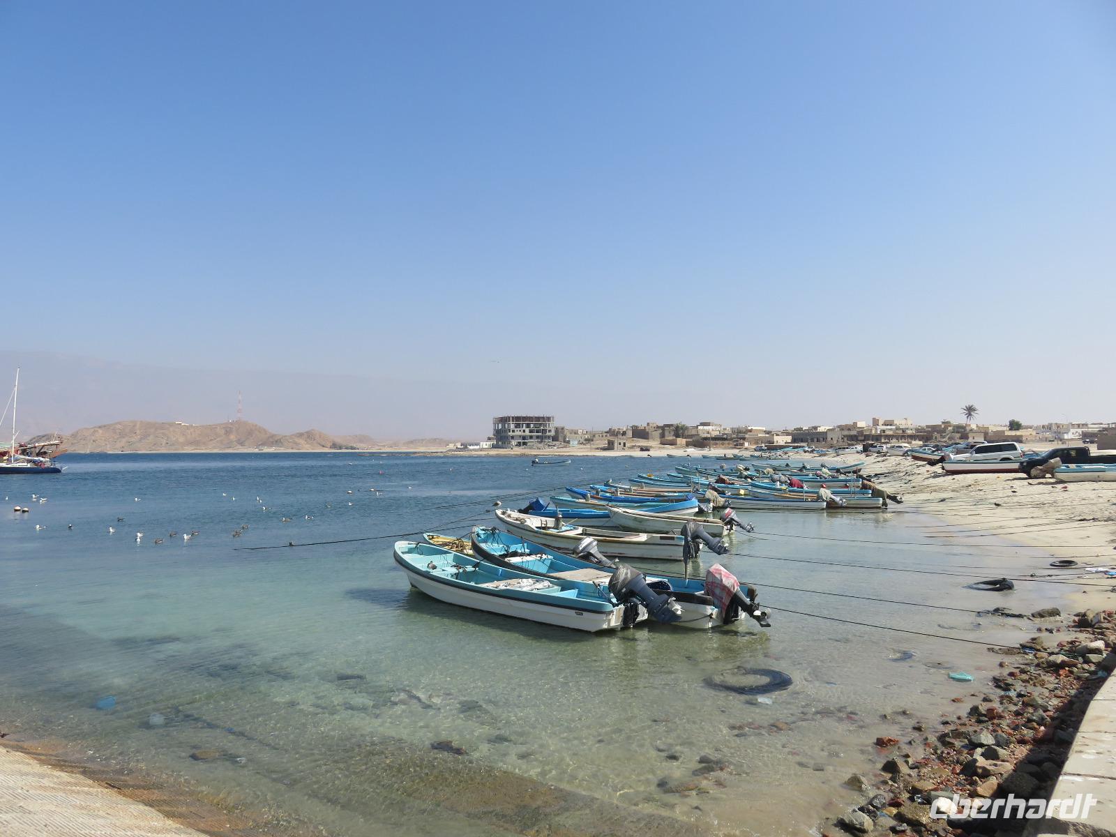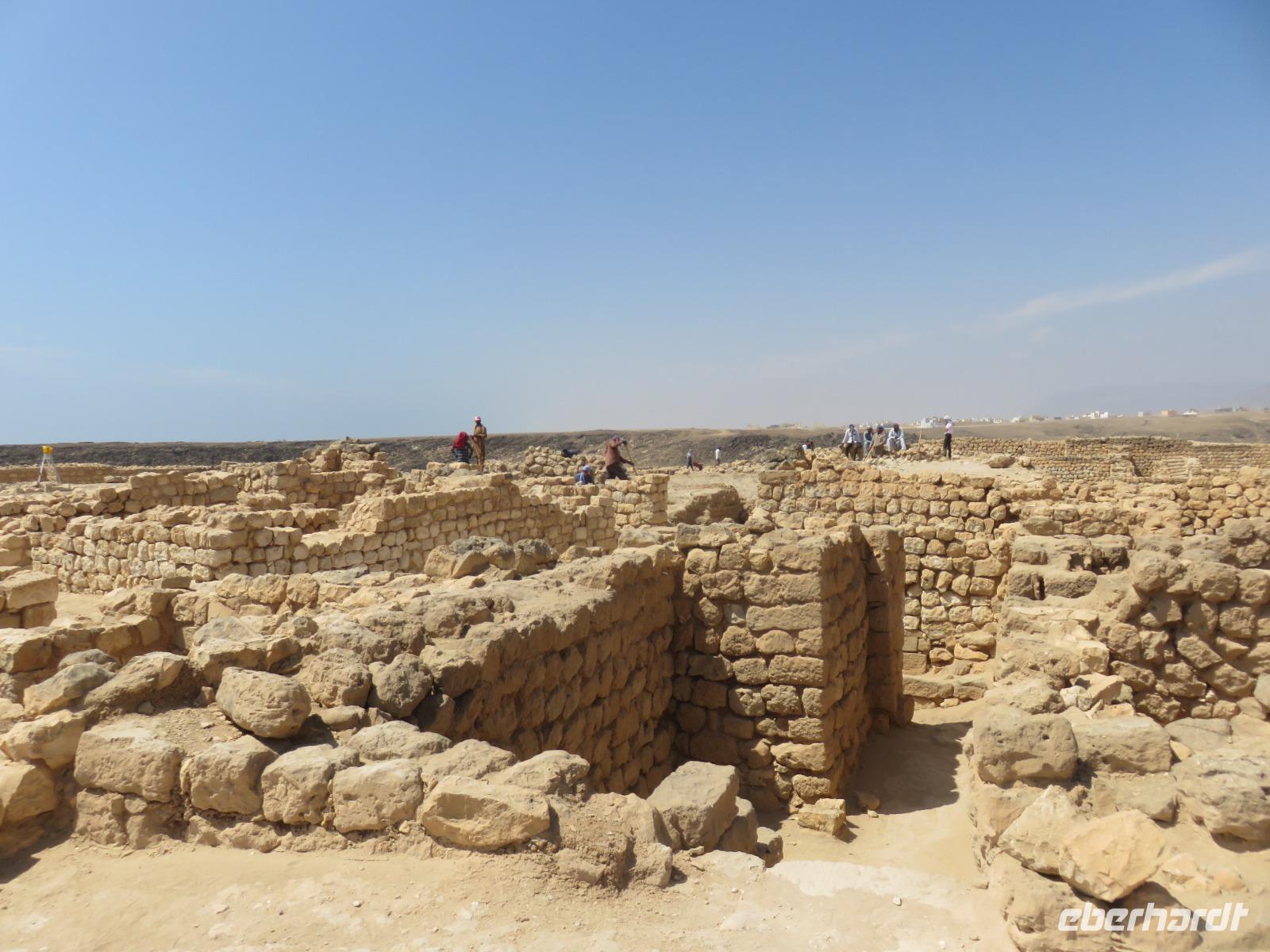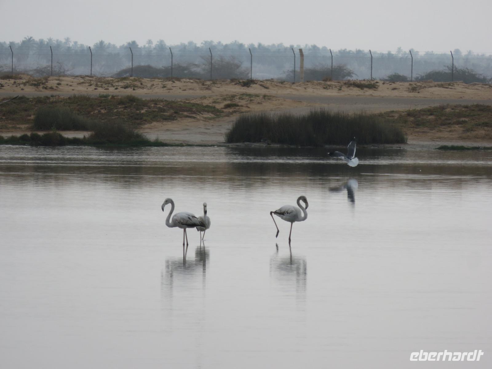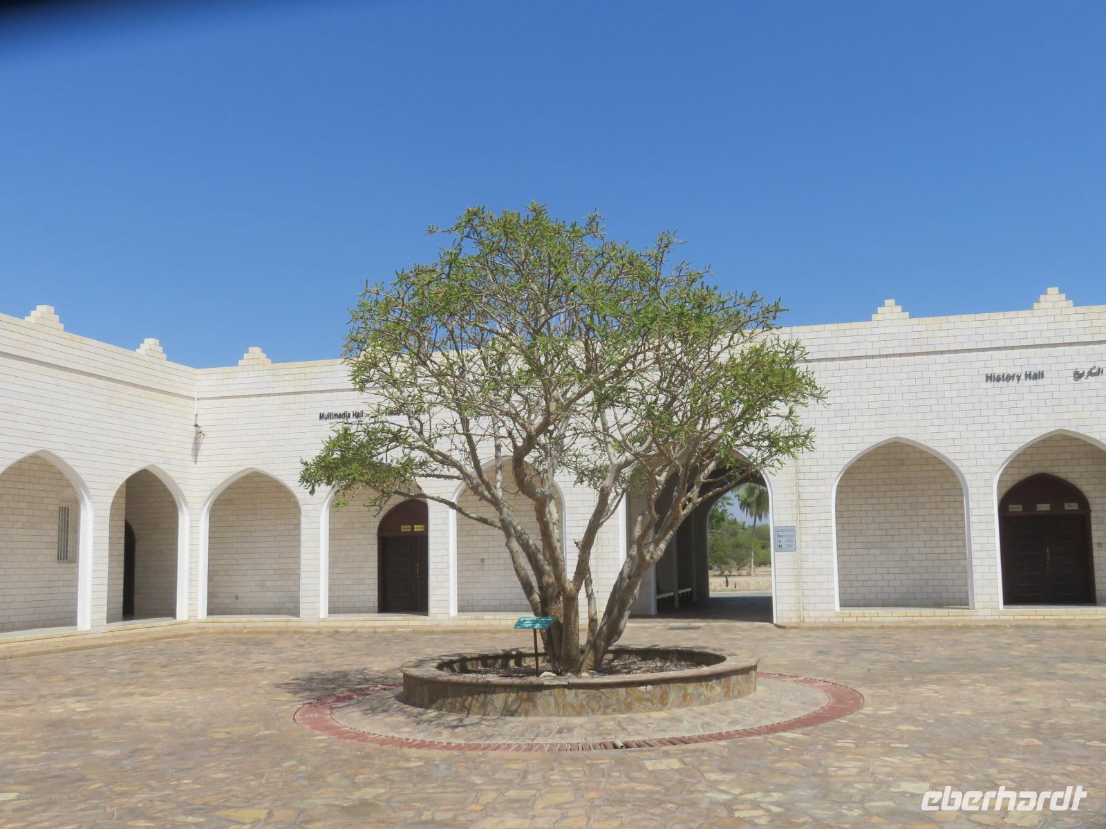 Am Morgen reisen wir Richtung Osten. Mirbat ist unser erstes Ziel. Unterwegs legen wir einen kurzen Stopp an einer Lagune ein, in der wir Flamingos, die hier weiß bzw. grau sind, beobachten können. In Mirbat sehen wir das Grab des Heiligen Bin Alis. Er war im 12. Jahrhundert ein angesehener Wissenschaftler und Gelehrter in der Region. In der Stadt Mirbat besuchen wir das Schloss des ehemaligen Herrschers. Dieses wird derzeit restauriert und beherbergt eine gute Ausstellung zur Geschichte der Stadt. Nun schauen wir am Hafen und auf dem Fischmarkt vorbei. Im Hafen liegen die kleinen Boot der Fischer und traditionelle Dhaus, mit denen die Fischer 3 - 4 Tage zum Fischfang fahren. Mit dem Bus erreichen wir das UNESCO-Weltkulturerbe Sumhuram. Vorher sehen wir am Straßenrand die wunderschön in Pink blühende Wüstenrose. In Sumhuram befindet sich eine antike Hafenanlage. Bereits vor 6.000 Jahren fand hier in einem, durch einen Wadi entstandenen natürlichem Hafen, der Weihrauchhandel statt. Bis nach Ägypten und in andere Länder wurde der Weihrauch, der zu damaliger Zeit kostbarer als Gold war per Schiff gebracht. Es entwickelte sich ein großes Handelszentrum. Als Fort wurde die Stadt auf einem Hügel mit direktem Zugang zum Hafen angelegt. Zur Blütezeit lebten 200 bis 300 Menschen hier. Es gab einen einen Brunnen, Lagerhäuser, Wohngebäude, ein Tempel und andere Gebäude. Diese historische Anlage ist heute als Ruinenstadt erkennbar und es werden noch immer Ausgrabungen vorgenommen. Wir spazieren durch die weitläufige Anlage und genießen die Aussicht über die imposante Anlage. Jetzt steht das Fort Taqah auf unserem Besuchsprogramm. Das Fort ist vor ca. 200 Jahren entstanden und diente dem Wali - also Bürgermeister der Region - als Wohn- und Arbeitsstätte. In allen Räumen können wir dhofarische und osmanische Alltagsgegenstände bestaunen. So erlangen wir einen guten Einblick in das Leben vor langer Zeit. Im Schlafraum des Walis sehen wir das Bett und im Kinderzimmer steht ein reizendes Kinderbett. In der Küche auf dem Dach sind Geschirrteile ausgestellt mit denen die typischen arabischen Gerichte hergestellt wurden. Direkt im Eingangsbereich befindet sich eines der Büros des Wali. Hier entschied er, ob ein Mensch der eine strafbare Handlung begangen hat, direkt ins im Hof liegende Gefängnis wandert oder als freier Mensch das Fort wieder verlässt. Dieser Besuch ist für uns sehr aufschlussreich. Anschließend fahren wir zu den Quellen von Ain Razat. Diese Quellen führen immer Wasser. Es wird über eine Bewässerungsanlage zur Versorgung der Felder abgeleitet. Das klare Wasser ist aber auch Lebensraum für viele Fische. Von einer kleinen Höhle oberhalb des Flusses, die früher als Schattenspender für die Hirten und heute als Picknick. Nach diesem letzten Stopp geht es zurück zum Hotel. Am Nachmittag nutzen wir die Zeit zum Baden im Meer und Erholen im Hotel. Am Abend bedienen wir uns wieder am reichhaltigen Buffet im Strandrestaurant und stoßen mit einem Glas Wein auf die schöne Reise an. Wir ließen die wirklich schönen Tage nochmals Revue passieren.