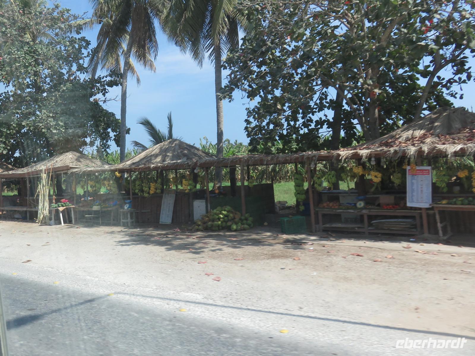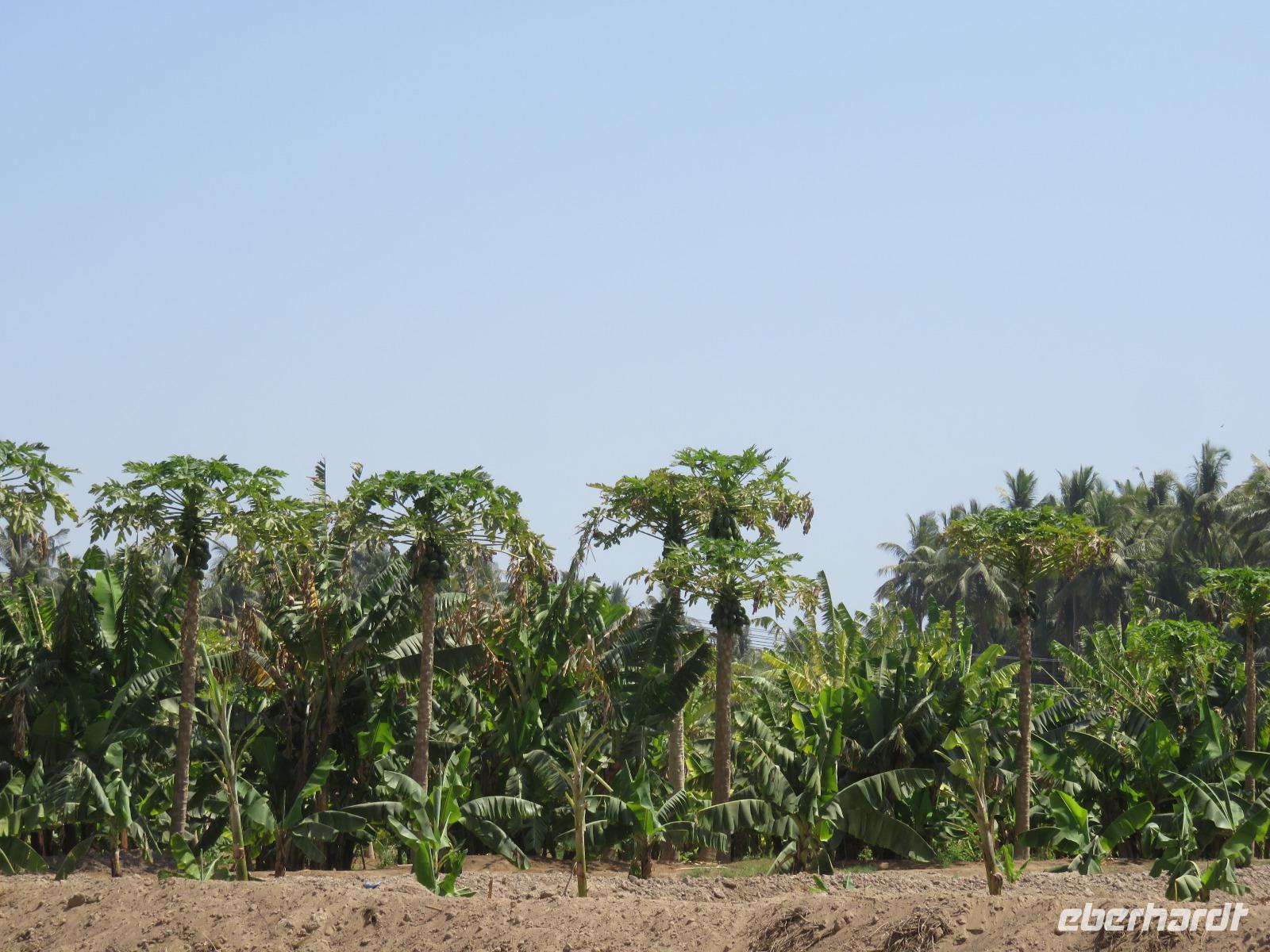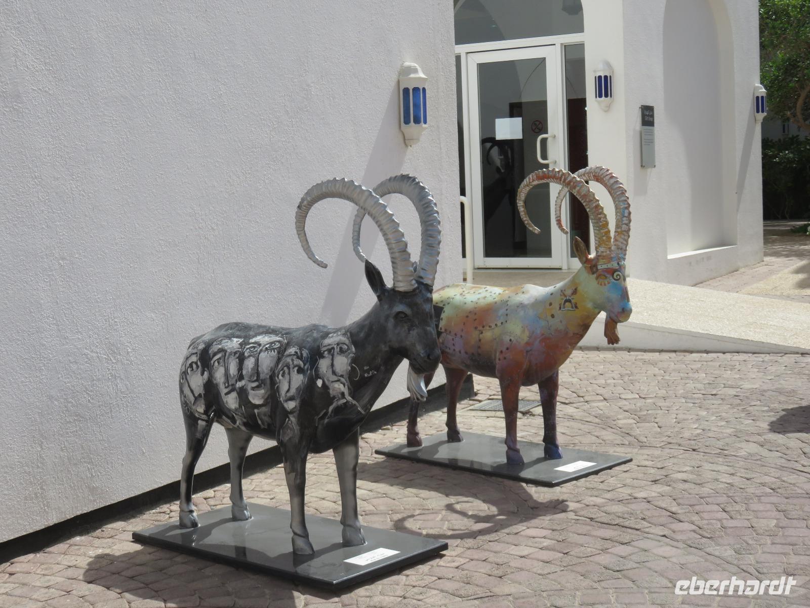 Zeitig am Morgen erwartet uns unser Bus zum Transfer zum Flughafen. Tawfiq kommt auch noch kurz zur Verabschiedung vorbei. Nach kurzer Fahrt erreichen wir den Flughafen Muscat. Die Abfertigung erfolgt rasch und problemlos. Nach knapp zwei Stunden Flugzeit landen wir sicher in Salalah in der Region Dhofar - dem Weihrauchland. Der Flughafen ist sehr überschaubar und unser Flieger ist der einzige, der gerade ankommt. Dadurch fahren unsere Koffer schon Karussell, als wir vom Flugzeug kommen. Am Ausgang begrüßt uns Salem unser Reiseleiter hier. Wir beginnen gleich mit der Stadtrundfahrt. Zunächst legen wir einen Fotostopp an der 2011 eröffneten Sultan Qaboos Moschee ein. Sie ist eine der zahlreichen Moscheen, die der Sultan mit Mitteln seines Privatvermögens seit Anfang des neuen Jahrtausends erbauen ließ. Nun führt uns die Reise in eine der vielen Plantagen, wo Kokospalmen, Bananen und vieles weitere Obst und Gemüse angebaut wird. Zunächst genießen wir jeder eine frisch aufgeschlagene Kokosnuss, deren Wasser sehr erfrischend und durstlöschend ist. Aber auch die süßen Bananen, die hier angebaut werden, schmecken uns köstlich. Wir spazieren in die Plantage und sehen, wie klug hier der Anbau erfolgt. Im Schatten der unzähligen Kokospalmen sind Gemüsebeete angelegt und wachsen Bananen, Papayabäume und andere Früchte. Unser Reiseleiter erklärt uns, dass eine Kokospalme komplett verwertet wird: Die Nüsse als Getränk, Süßigkeit und Gefäß, der Stamm als Baumaterial, die Blätter für Dächer, Matten und Behältnisse. Anschließend geht es weiter zum kurzen Fotostopp am Sultans Palast, den Al Husn-Palast. Ein imposanter Gebäude-Komplex mit eigener Moschee und dem Privatpalast des Herrschers und unzähligen Villen für die Bediensteten und Angestellten. Nun erreichen wir den Souk. Dieser ist vor allem für den Handel mit Weihrauch bekannt. Salem erklärt uns die verschiedenen Qualitäten des Harzes des Weihrauchbaumes und deren Verwendung. Natürlich kaufen wir Weihrauch ein. Leider bleibt nur wenig Zeit zum Schauen und Staunen, da wir genau in die Mittagszeit geraten und die Händler ihre Läden schließen. Wir gelangen zum Al Balid Museum in der Nähe unseres Hotels. In dem Museum neben den Ausgrabungen einer alten Stadt mit Handelshafen ist dIe Geschichte des Omans und der Region sehr anschaulich dargestellt. Der Weihrauch und der Handel mit ihm spielt seit Jahrhunderten eine große Rolle in der Region. Das wertvolle Harz wurde und wird in die ganze Welt verkauft. Mit Segelschiffen, den Dhaus gelangte es in die anderen Länder des Orients aber auch nach China und Rom. Wir sehen die historischen Handelsrouten. Im Oman wurden auch die ersten Schriften in arabischer Sprache verfasst. Auch darüber berichtet das Museum. Die Seefahrt spielte ebenfalls eine entscheidende Rolle in der Geschichte des Landes. In einem eigenen Saal wird die Entwicklung des Schiffsbaus und der Seefahrt erzählt. Nach diesem interessanten Besuch erreichen wir das nahegelegene Hotel Crown Plaza Salalah. Wir beziehen unsere Zimmer und alle gehen zuerst an den wunderschönen feinsandigen Strand. Hier kommt wirklich das Gefühl auf, als ob wir in der Karibik sind. Kokospalmen zieren den Hotelgarten und spenden Schatten und der Strand erstrahlt kilometerweit mit seinem weißen Sand in der Sonne. Leider beeinträchtigt eine Baustelle des Hotels direkt am Strand etwas das Urlaubsvergnügen. Es wird ein neues Restaurant gebaut. Am Abend treffen wir uns im Strandrestaurant zum Essen und dürfen und am reichhaltigen Buffet mit frisch gegrilltem Fleisch und Fisch bedienen.