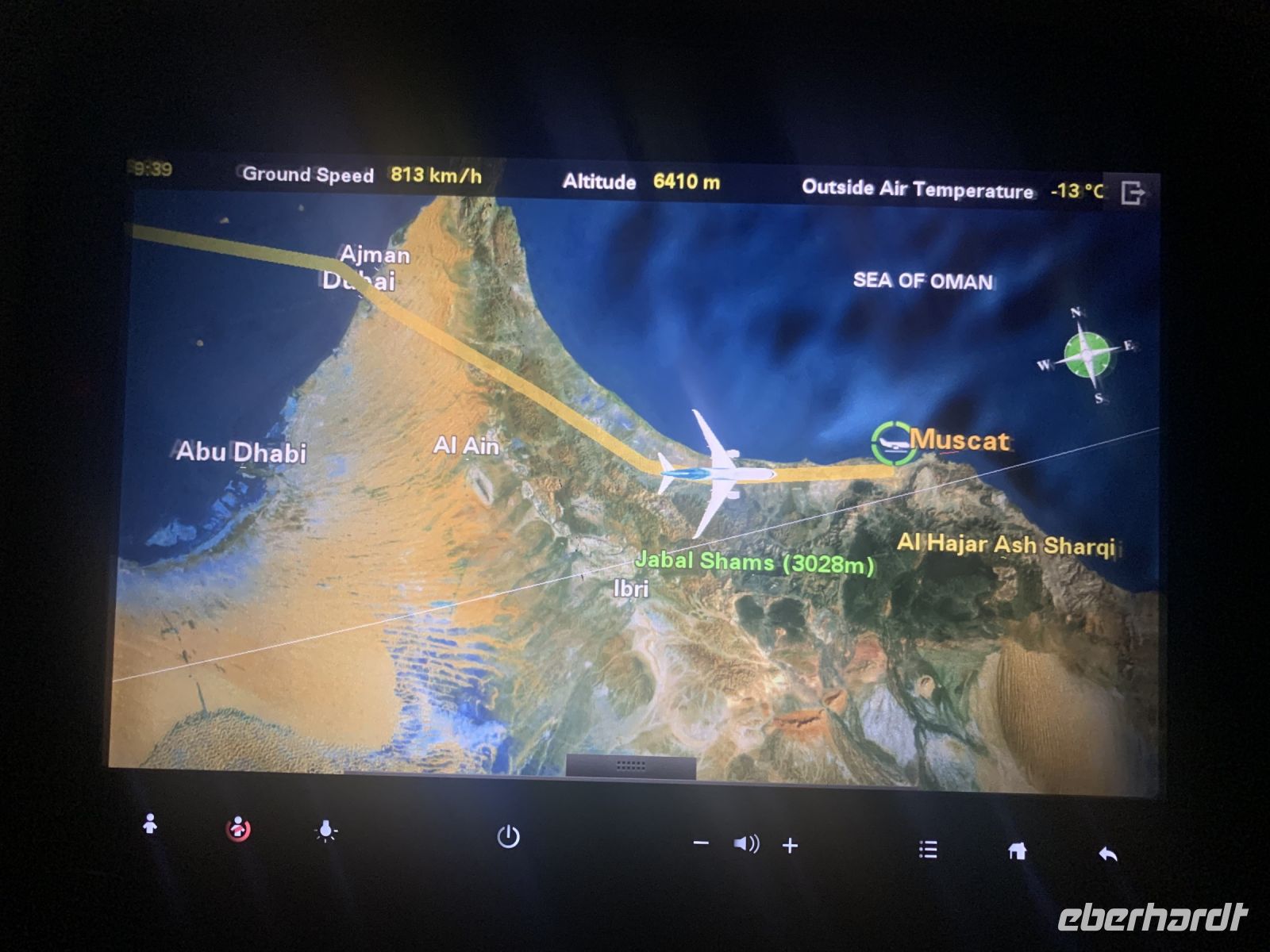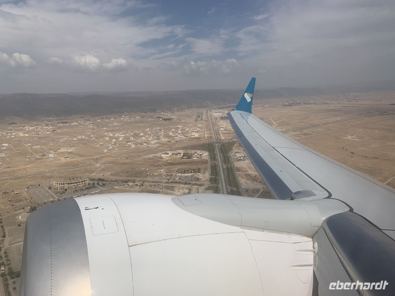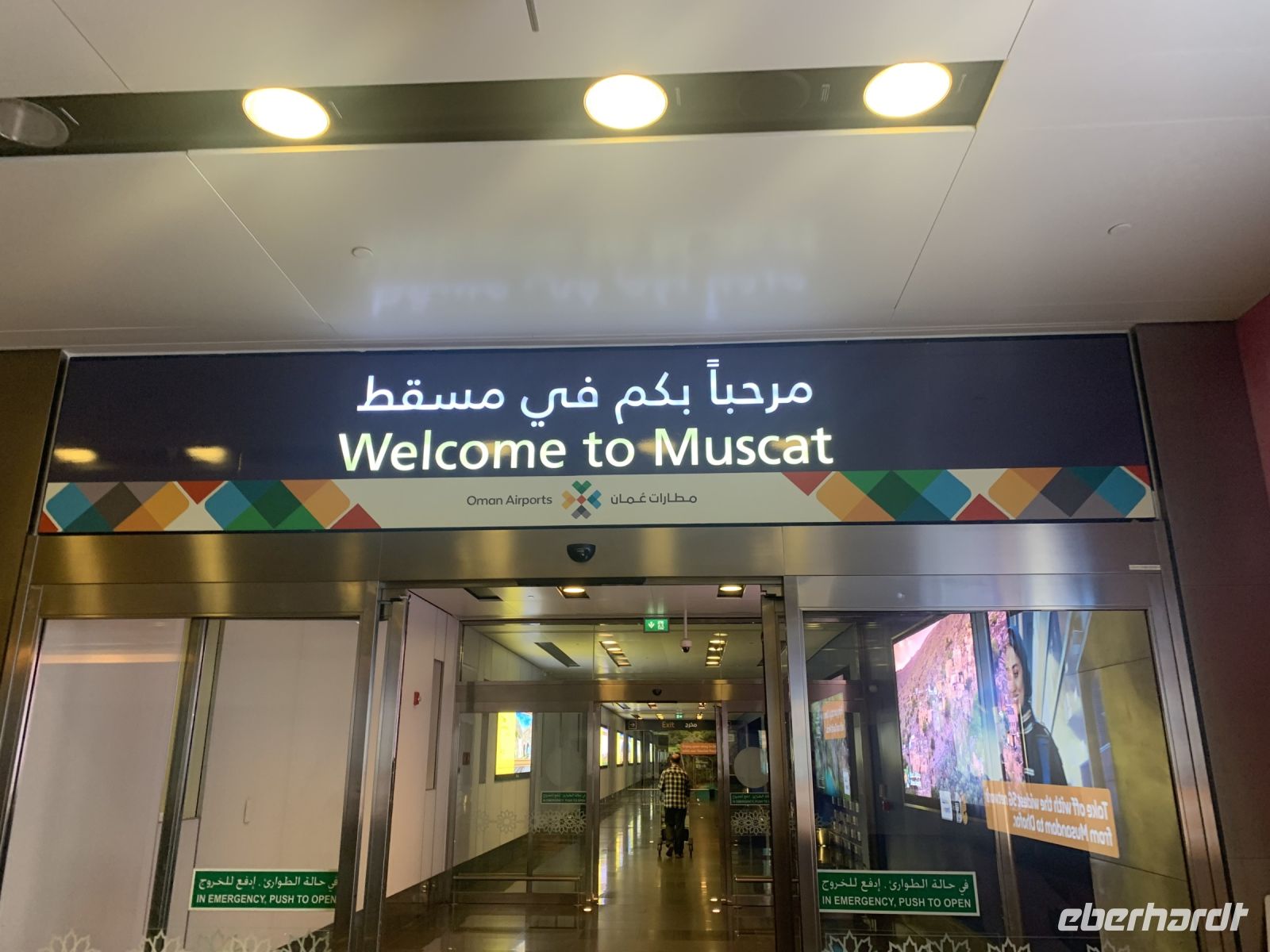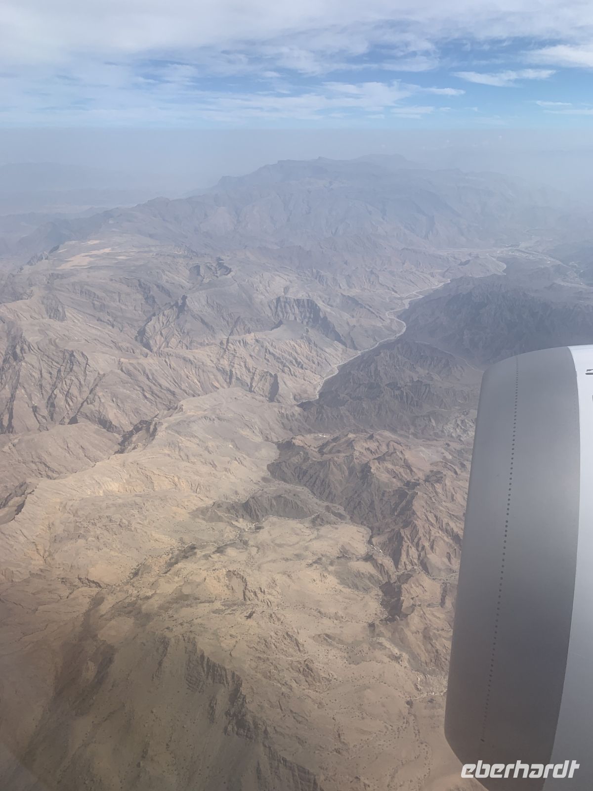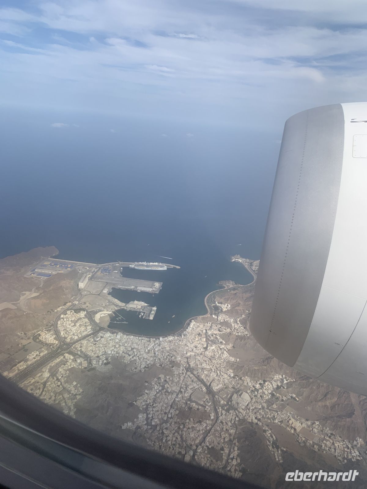 Mit verschiedenen Zubringerflügen, mit dem Zug oder individuell reisen wir nach Frankfurt/Main an und unsere kleine Reisegruppe mit 11 reiselustigen Gästen und mir ist komplett. Mit einem Dreamliner der Oman Air, der staatlichen Airlines des Sultanats Oman, fliegen wir in eine für uns unbekannte Welt. Der Flug (etwas mehr als 6 Stunden) ist äußerst angenehm, der Service der immer freundlich lächelnden Flugbegleiter ausgezeichnet; hier können sich manche Airline wirklich eine große Scheibe abschneiden! Sogar für 5 Minuten Verspätung wird sich aufrichtig entschuldigt!