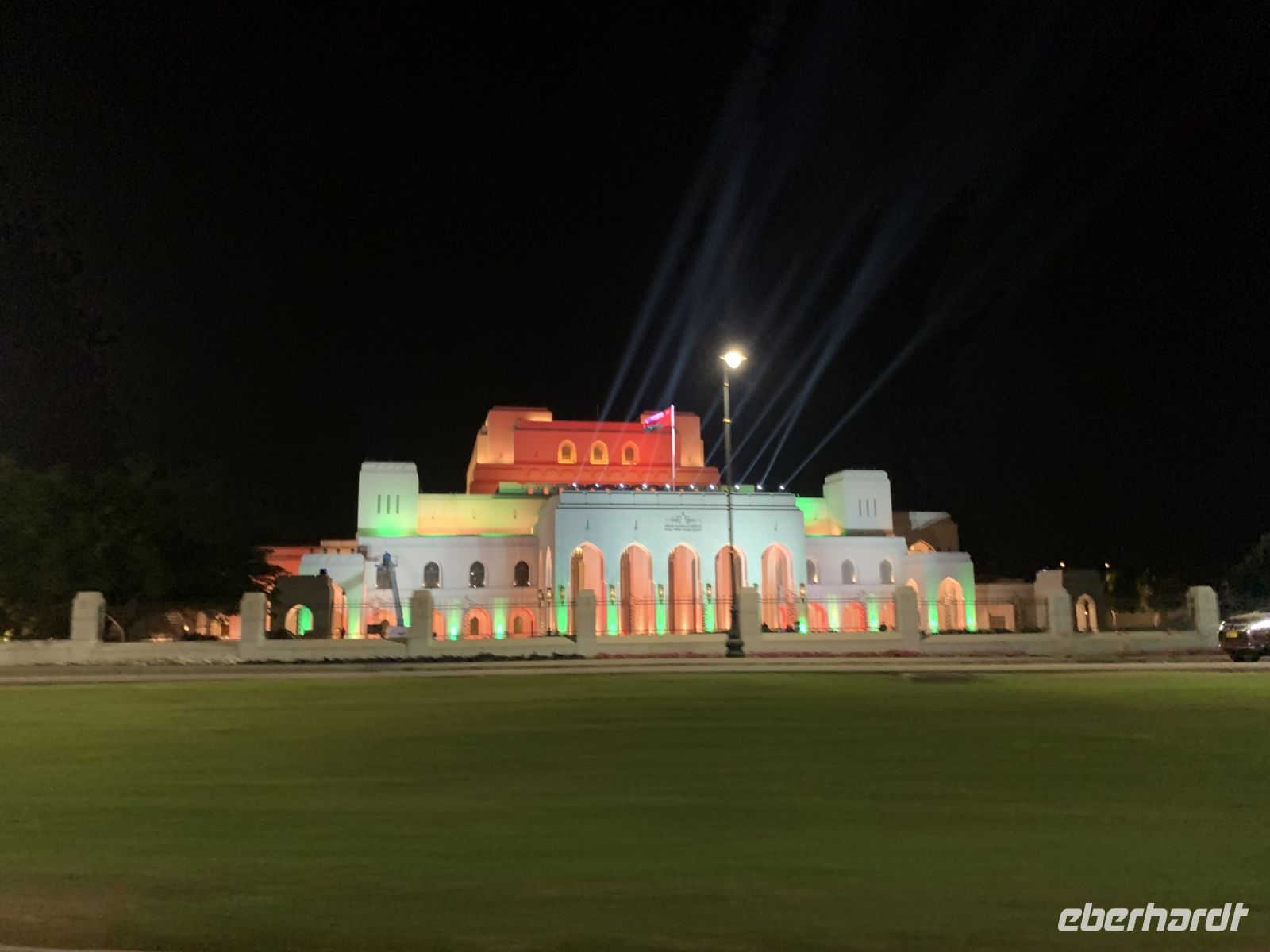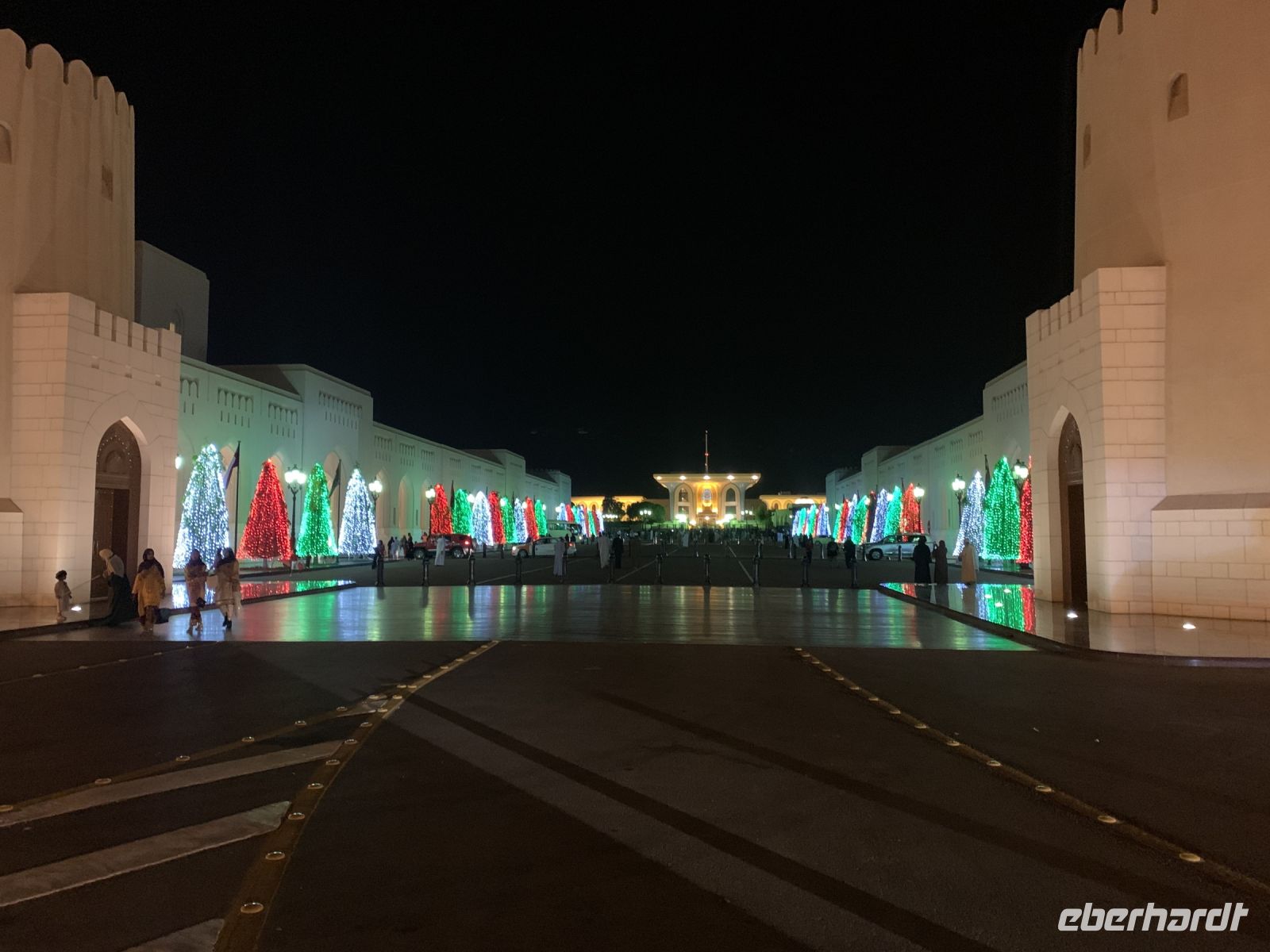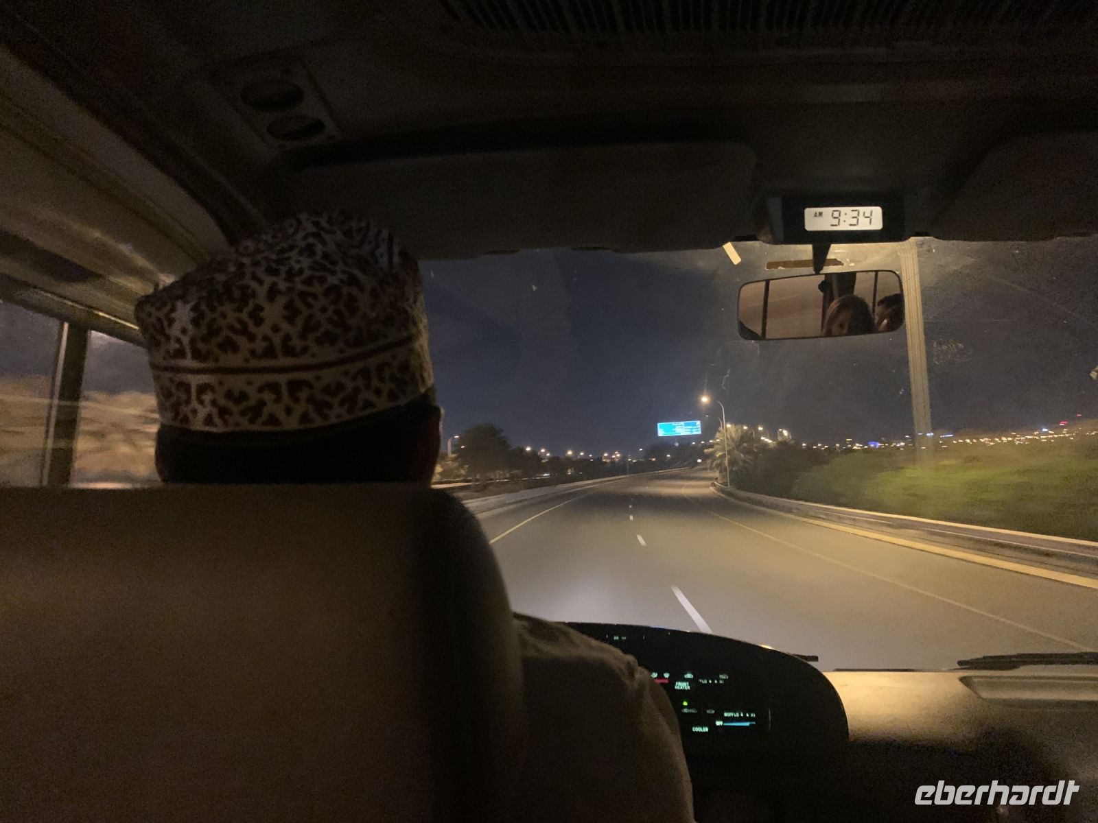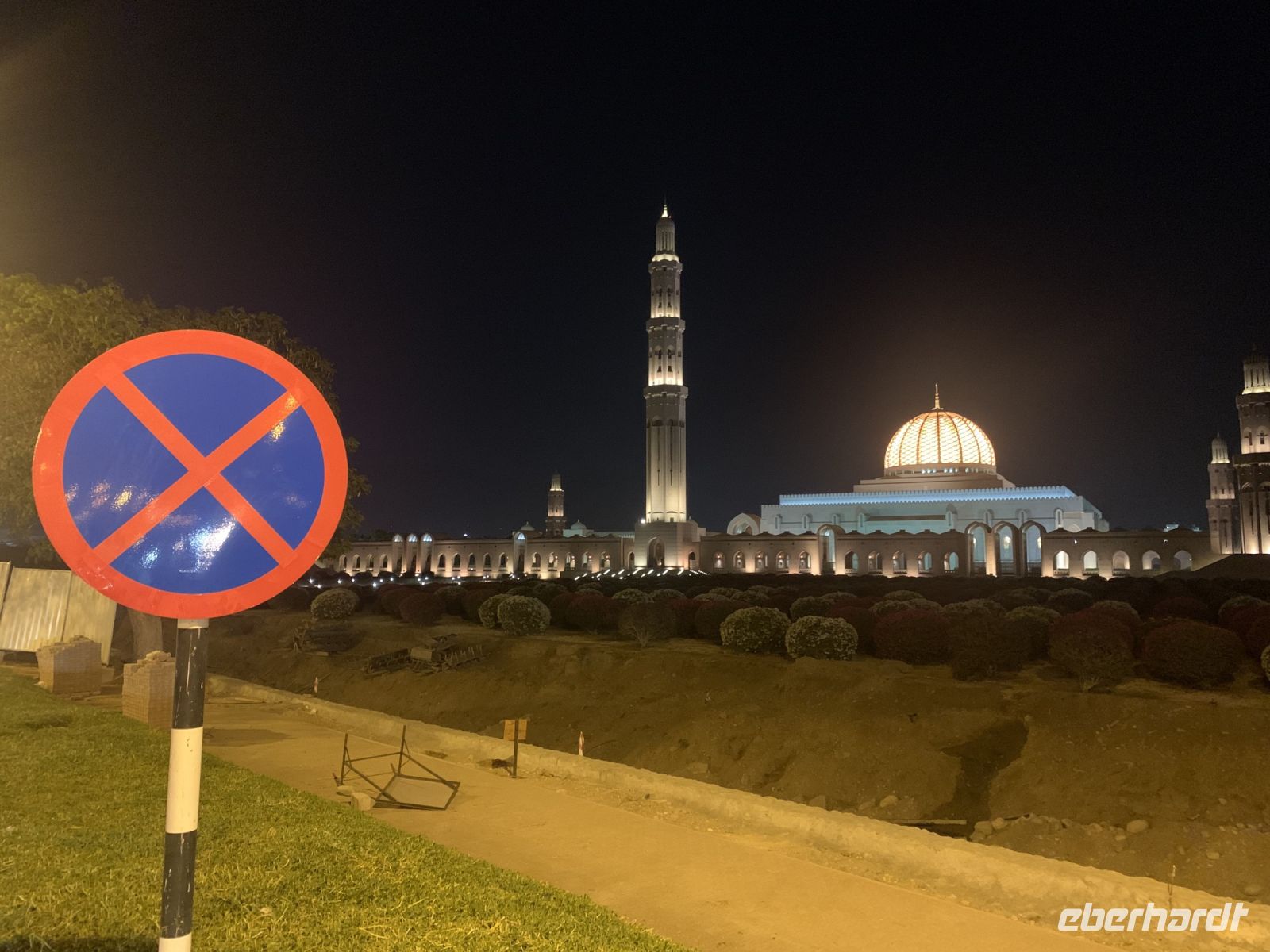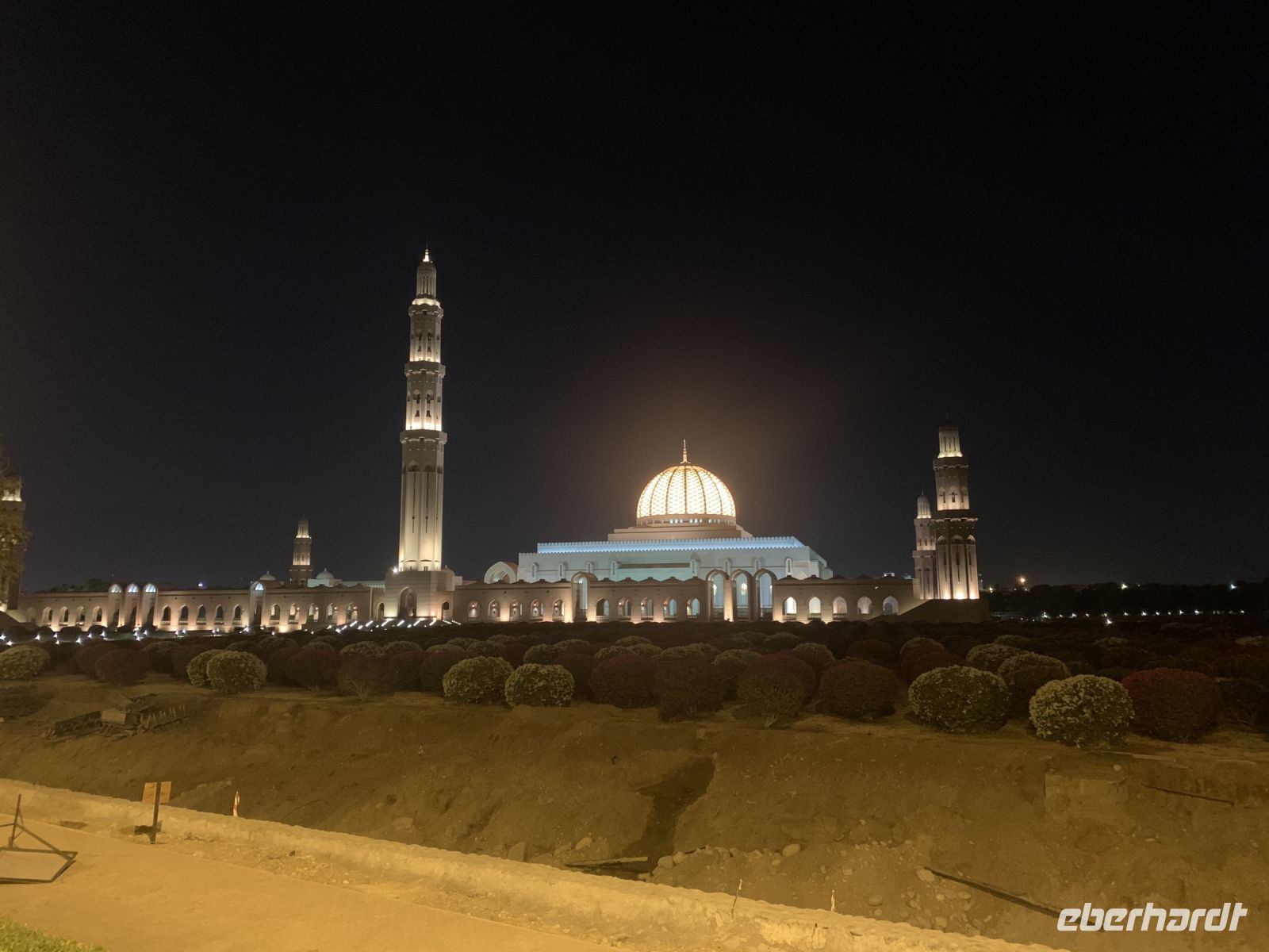 Schnell sind die Koffer im Anhänger unseres kleinen Coasters verstaut und wir starten in Richtung Hotel. Auf der Fahrt (der Flughafen liegt etwa 25 Kilometer westlich der Hauptstadt) zum Hotel erblicken wir bereits die großartig beleuchtete Sultan Qaboos Moschee, die wir alle im Bild festhalten.