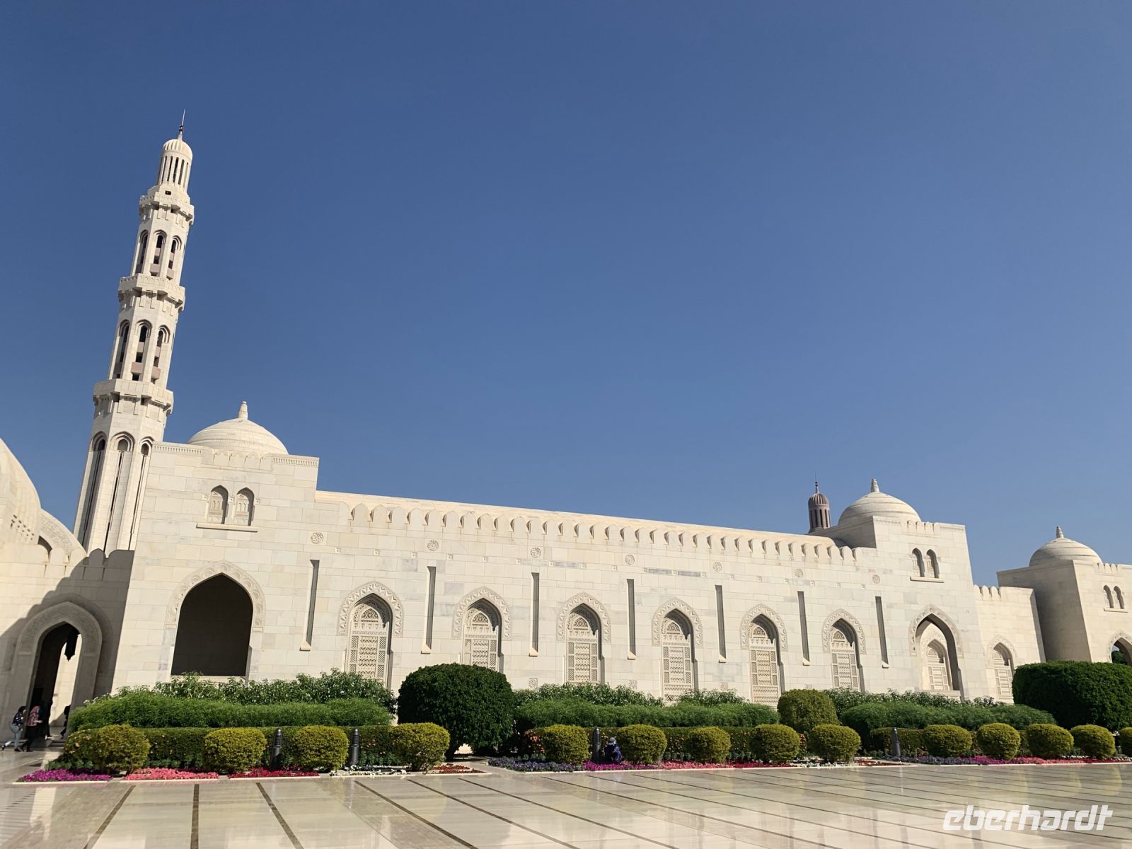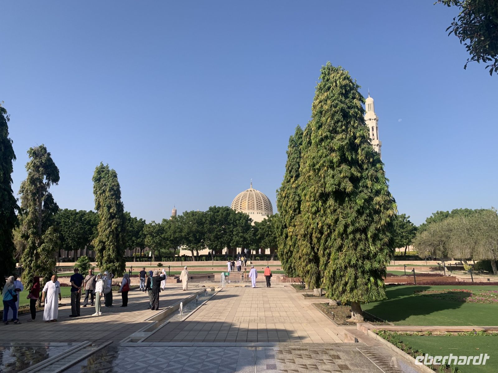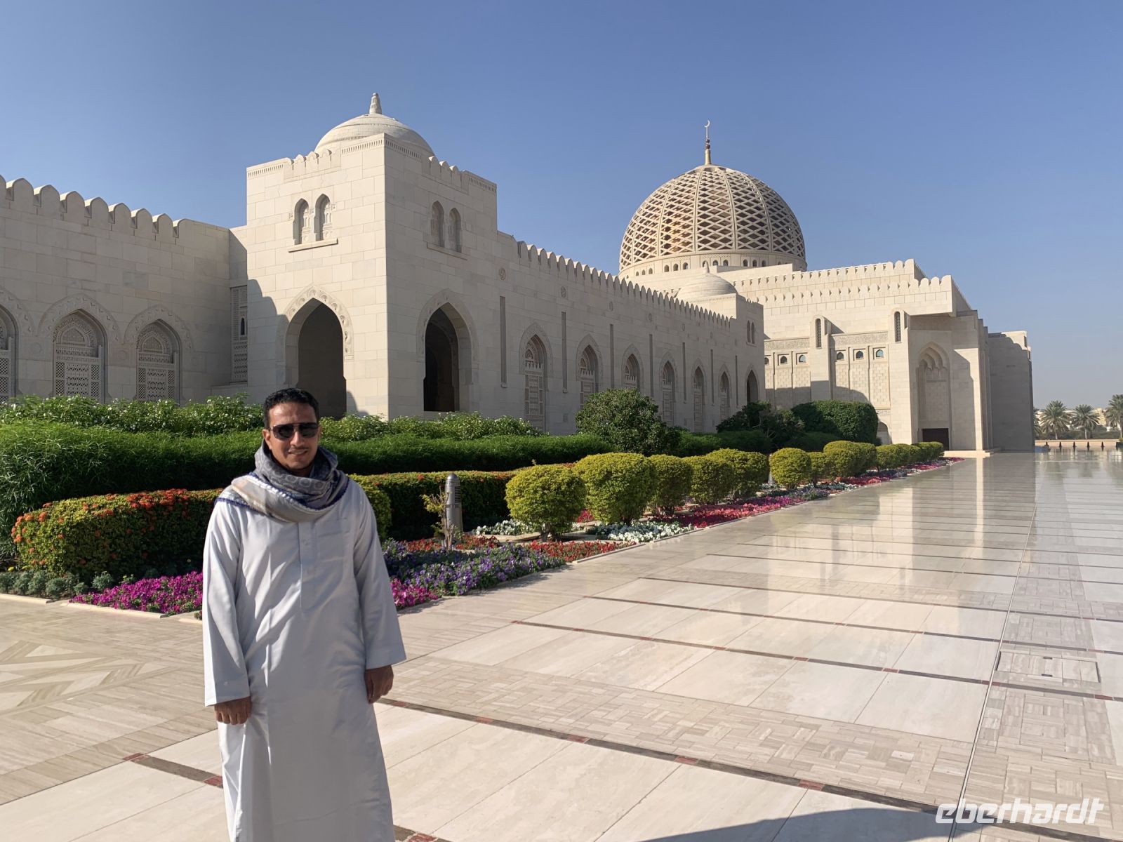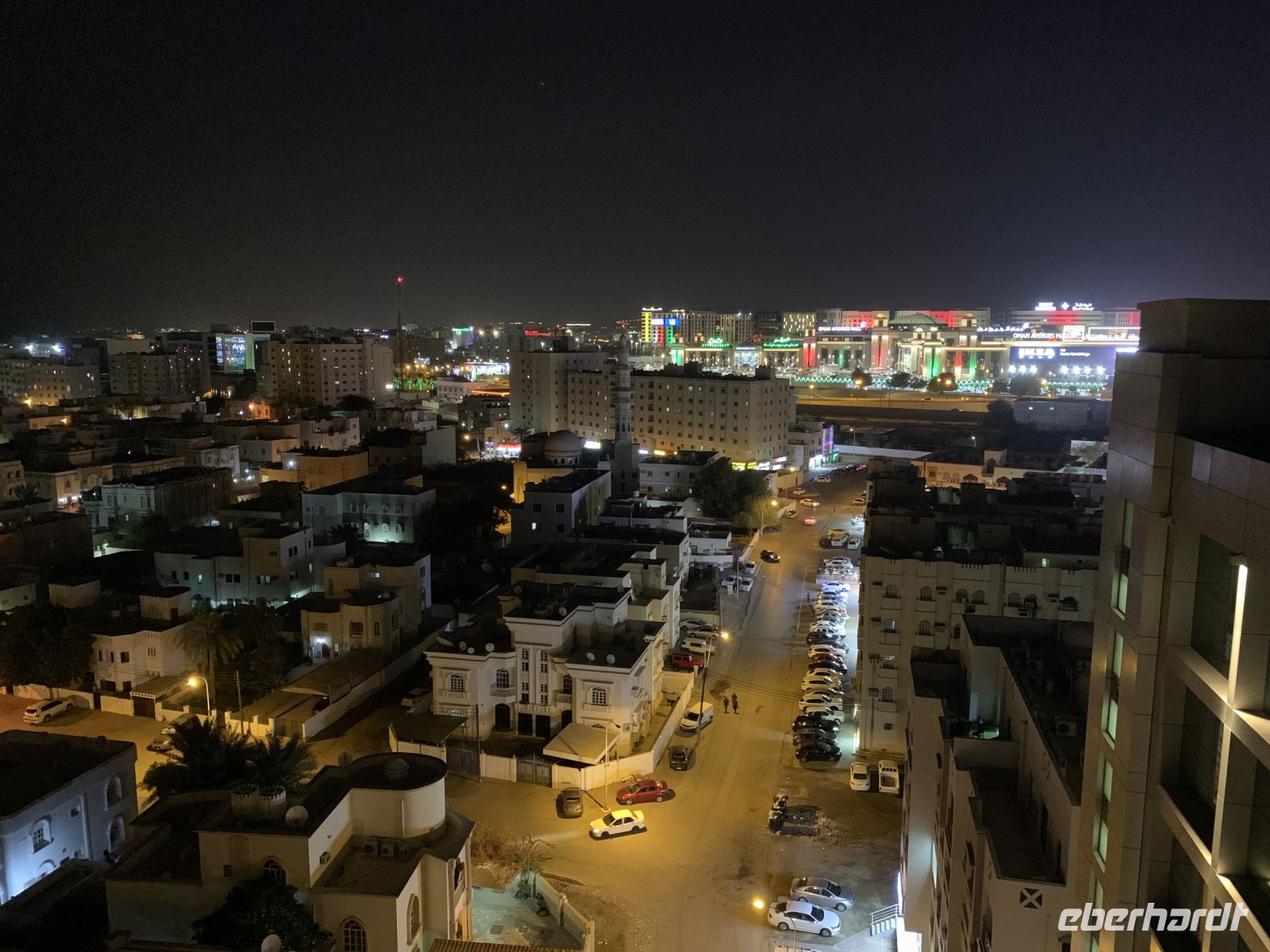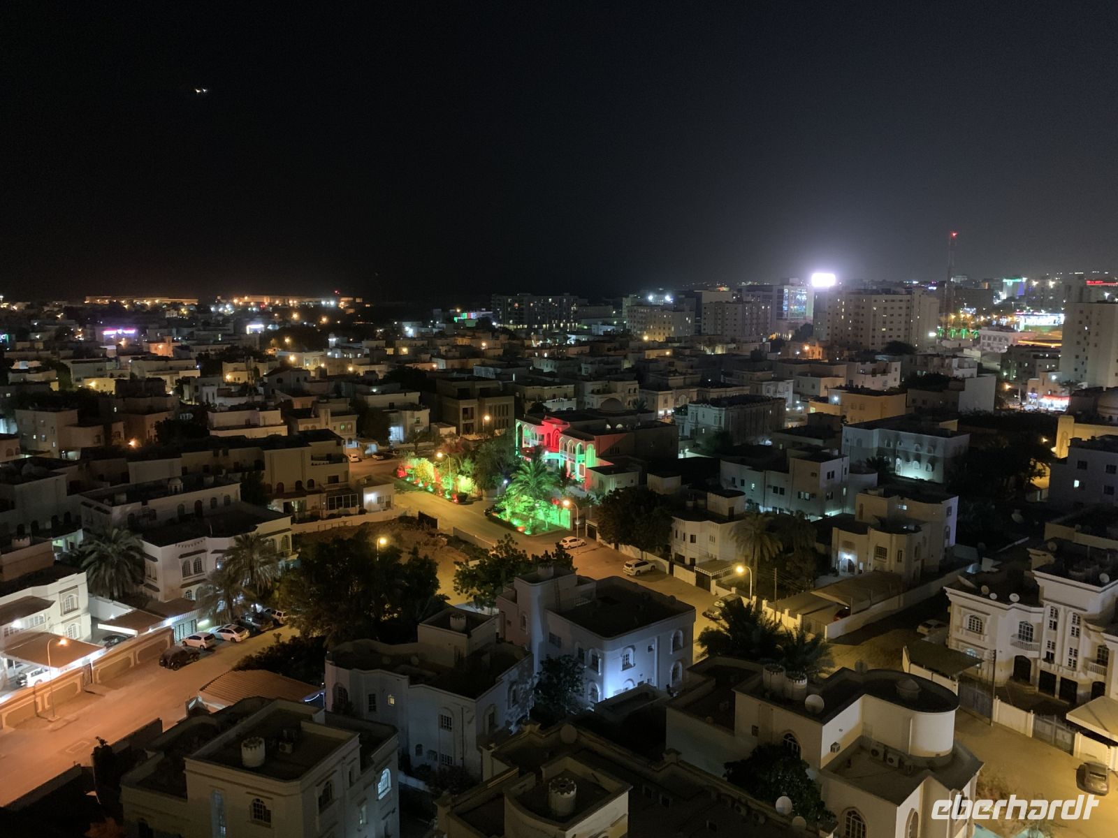 Schnell sind die Koffer im Anhänger unseres kleinen Coasters verstaut und wir starten in Richtung Hotel. Auf der Fahrt (der Flughafen liegt etwa 25 Kilometer westlich der Hauptstadt) zum Hotel erblicken wir bereits die großartig beleuchtete Sultan Qaboos Moschee, die wir alle im Bild festhalten.