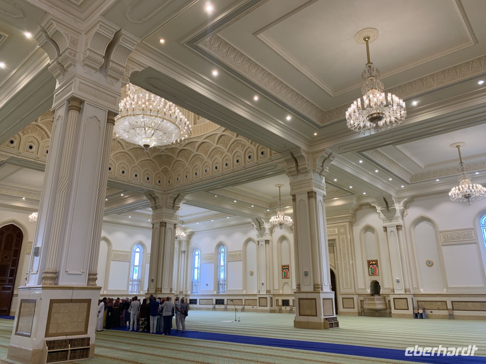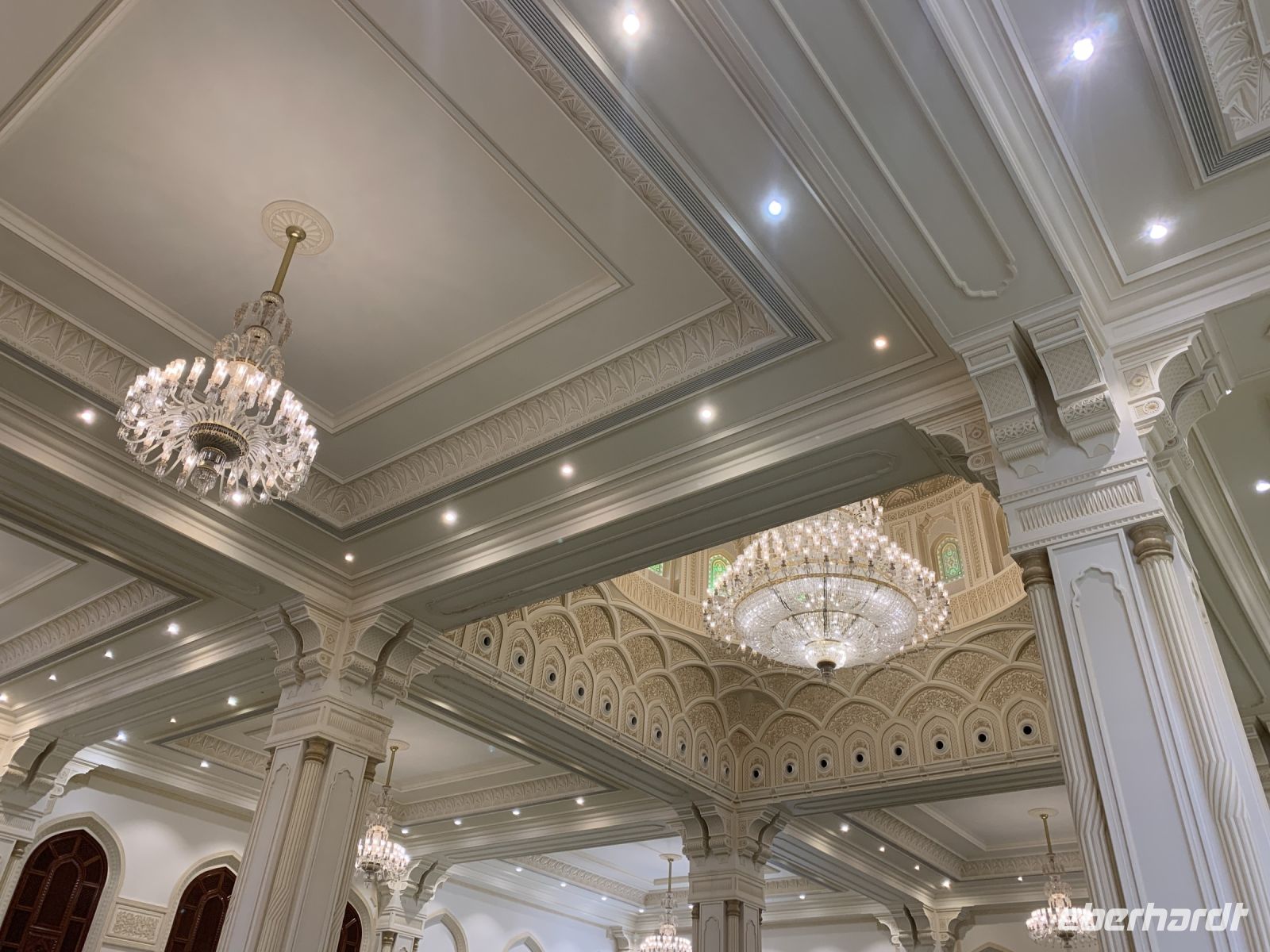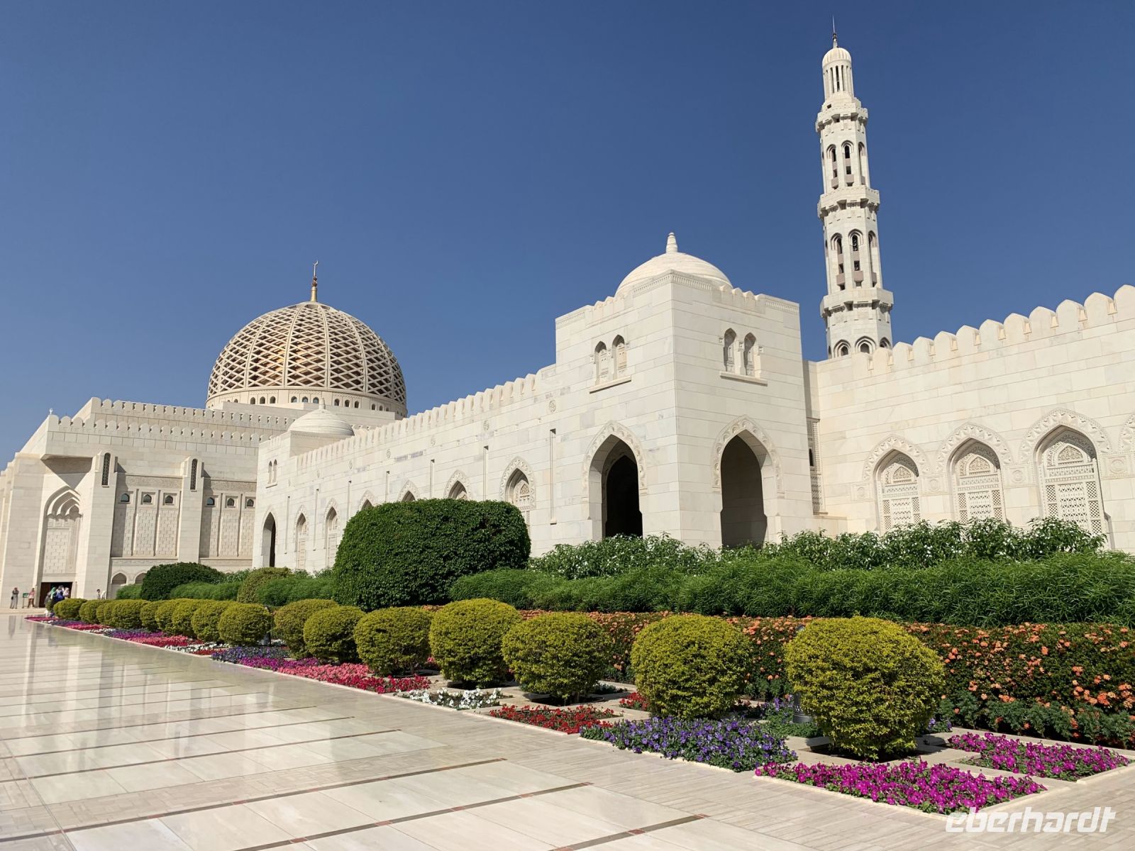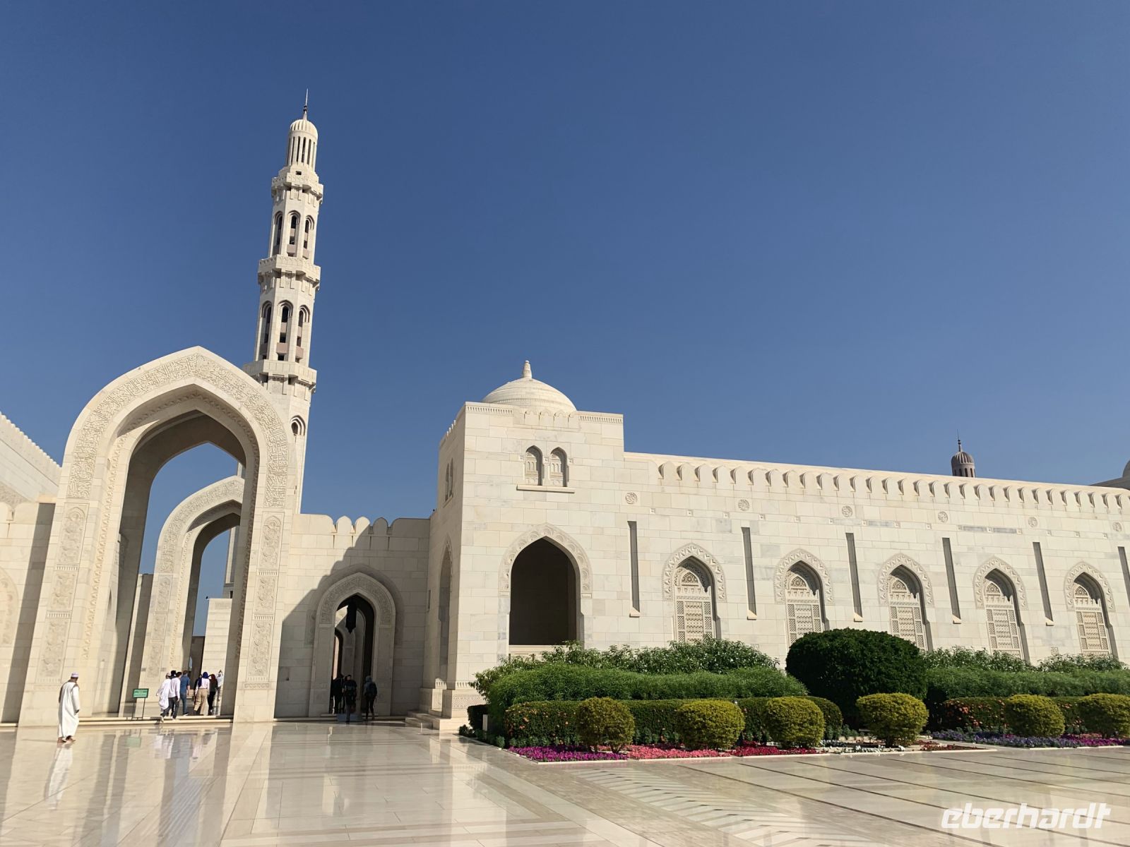 Schnell sind die Koffer im Anhänger unseres kleinen Coasters verstaut und wir starten in Richtung Hotel. Auf der Fahrt (der Flughafen liegt etwa 25 Kilometer westlich der Hauptstadt) zum Hotel erblicken wir bereits die großartig beleuchtete Sultan Qaboos Moschee, die wir alle im Bild festhalten.