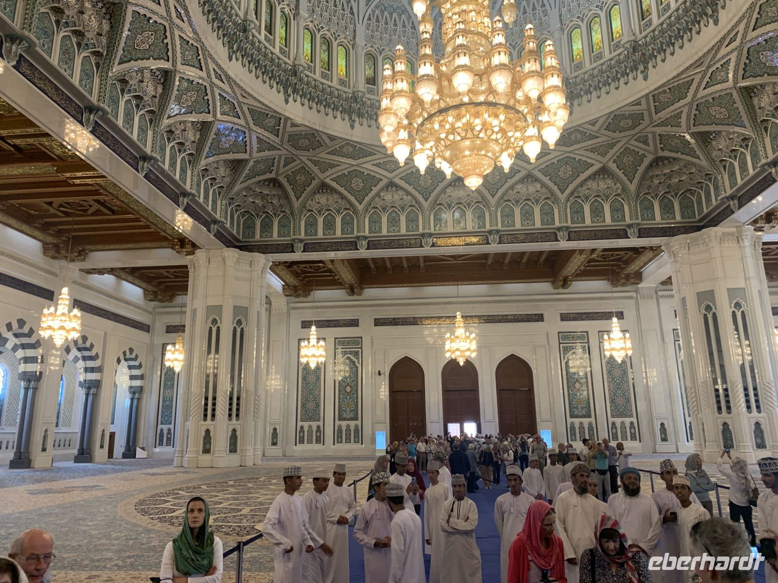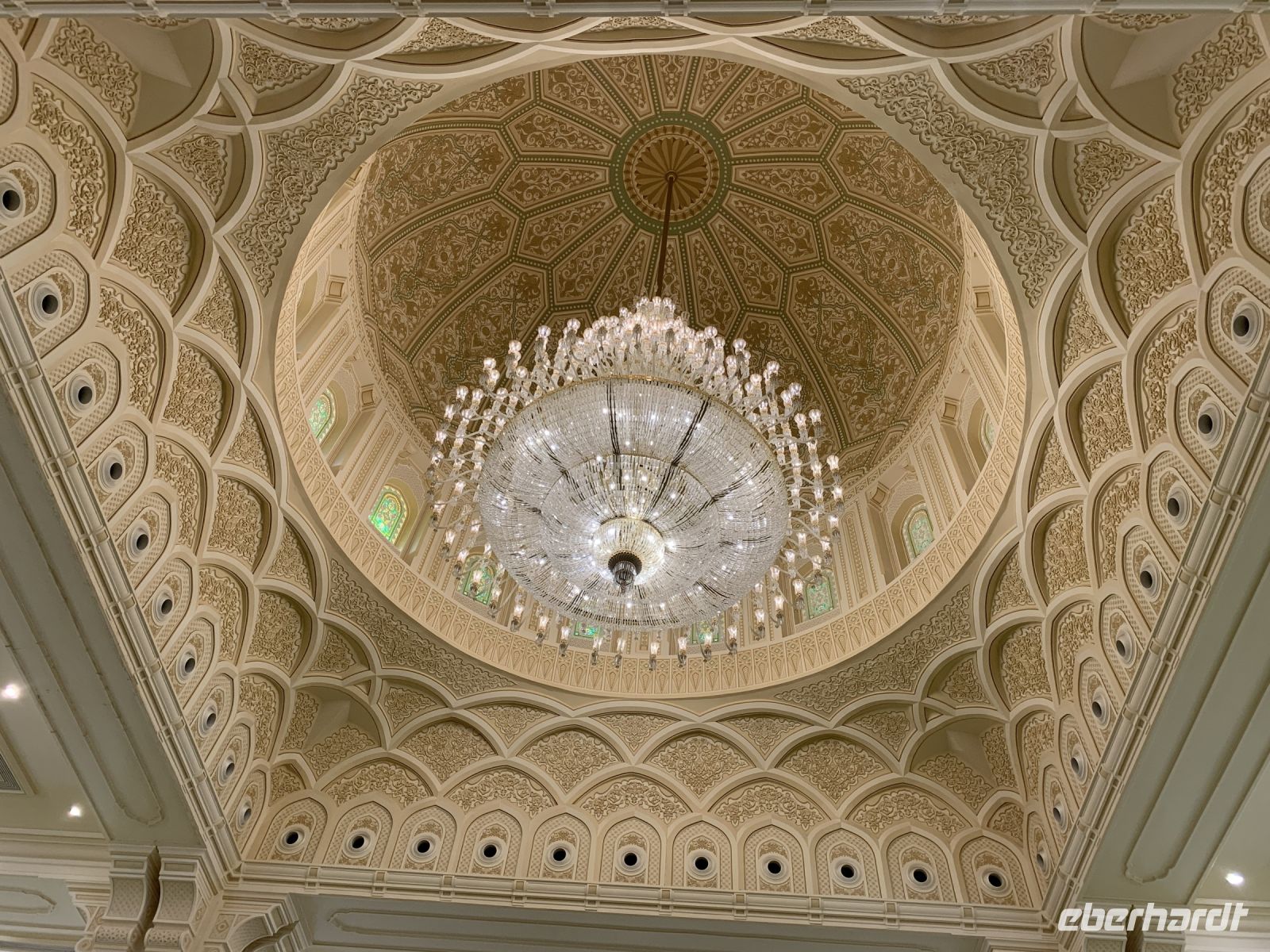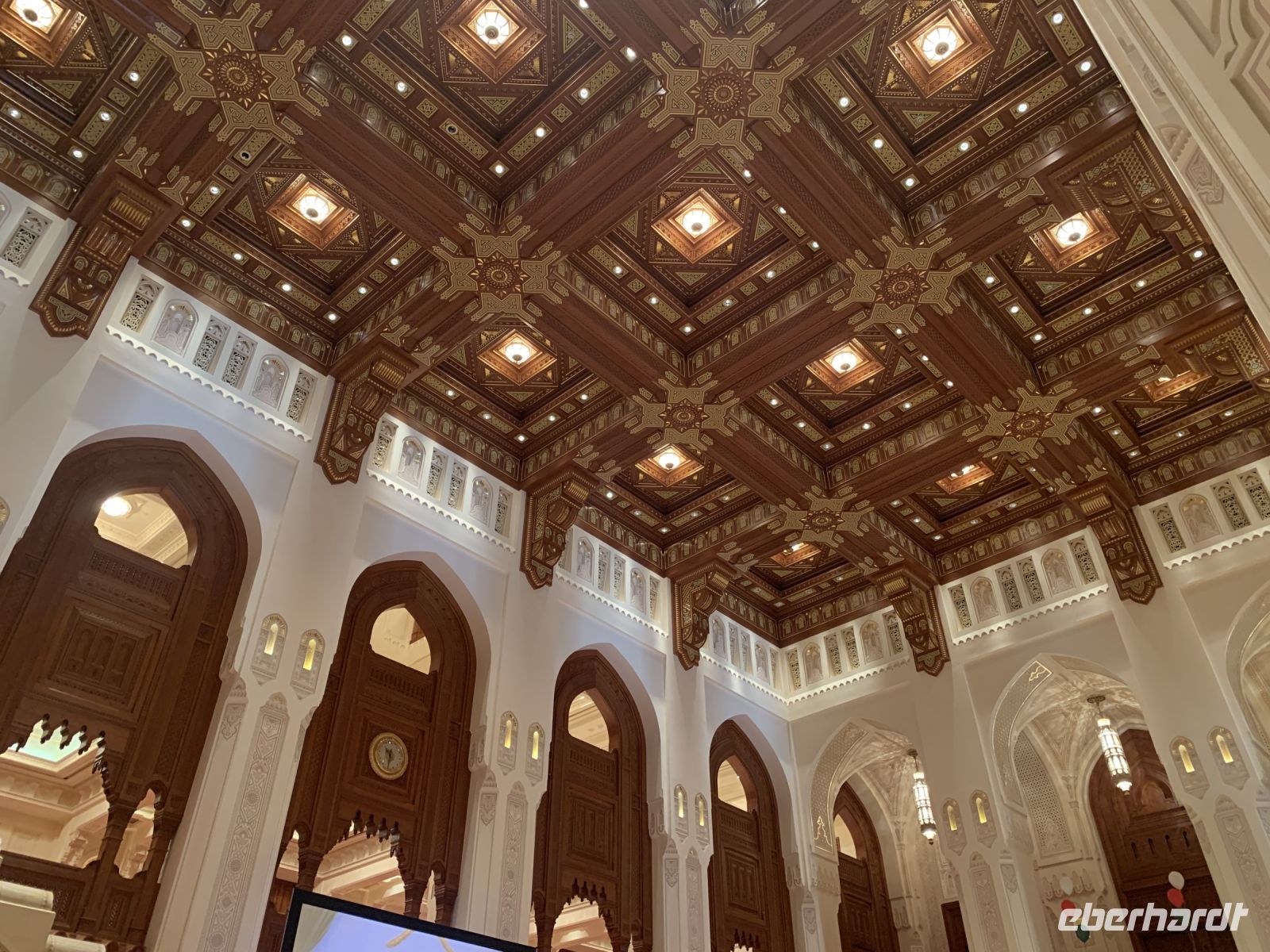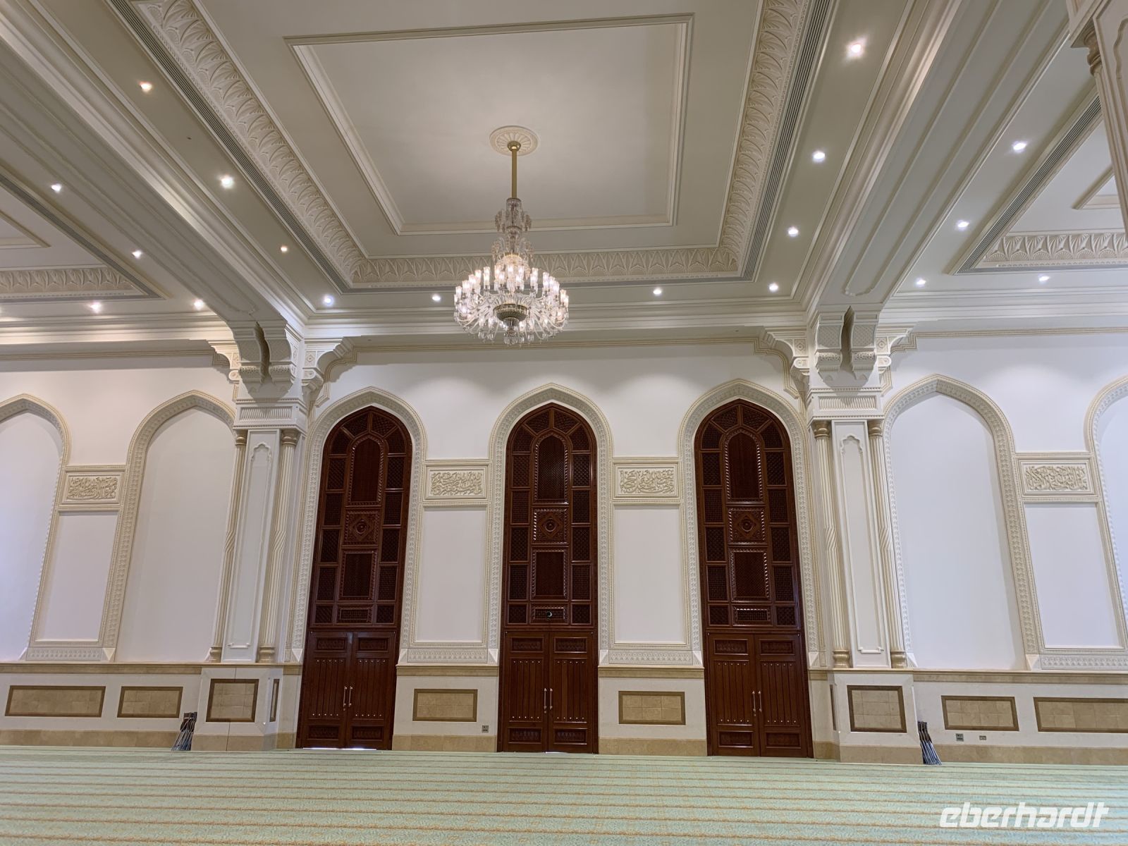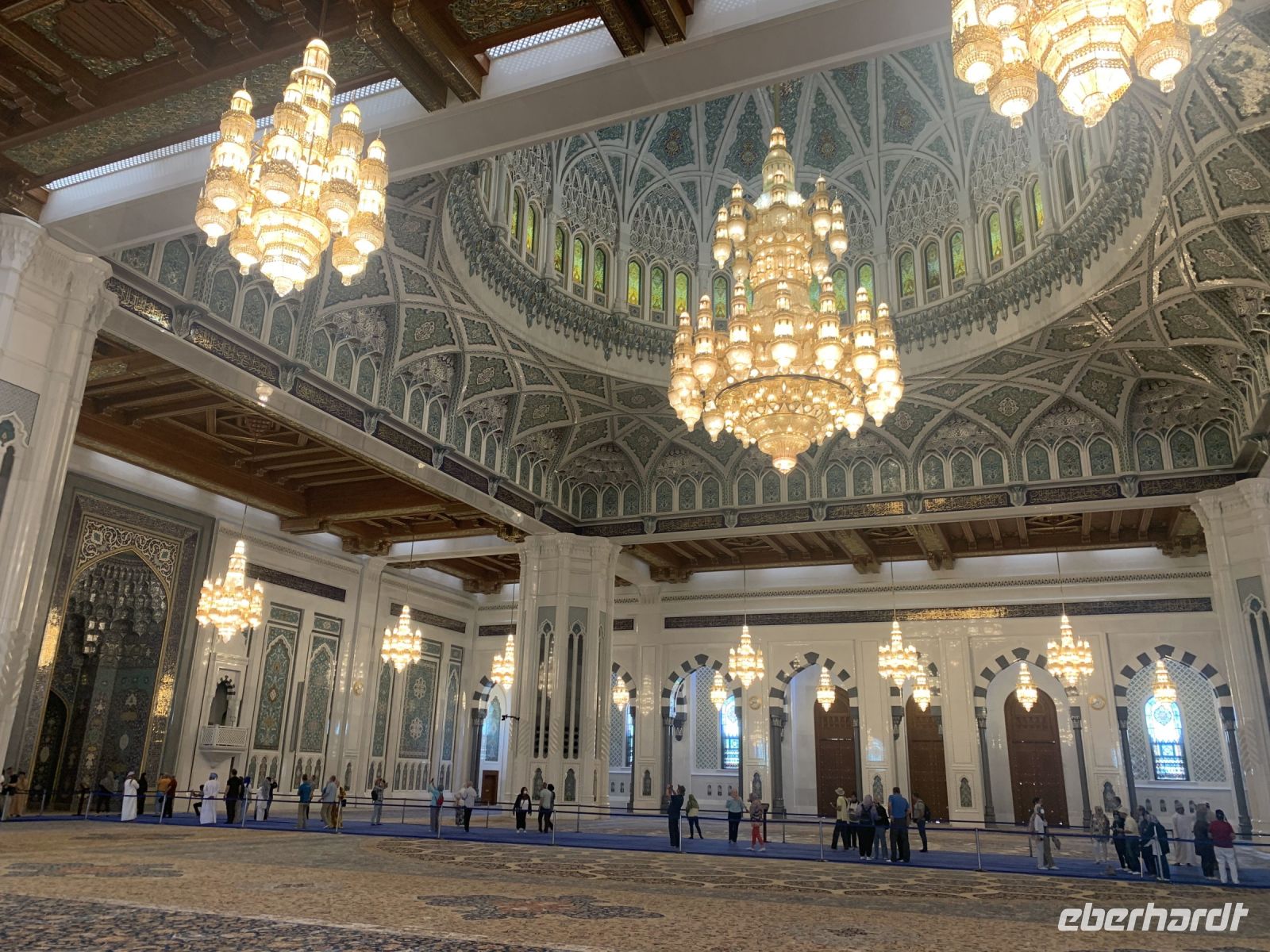 Schnell sind die Koffer im Anhänger unseres kleinen Coasters verstaut und wir starten in Richtung Hotel. Auf der Fahrt (der Flughafen liegt etwa 25 Kilometer westlich der Hauptstadt) zum Hotel erblicken wir bereits die großartig beleuchtete Sultan Qaboos Moschee, die wir alle im Bild festhalten.