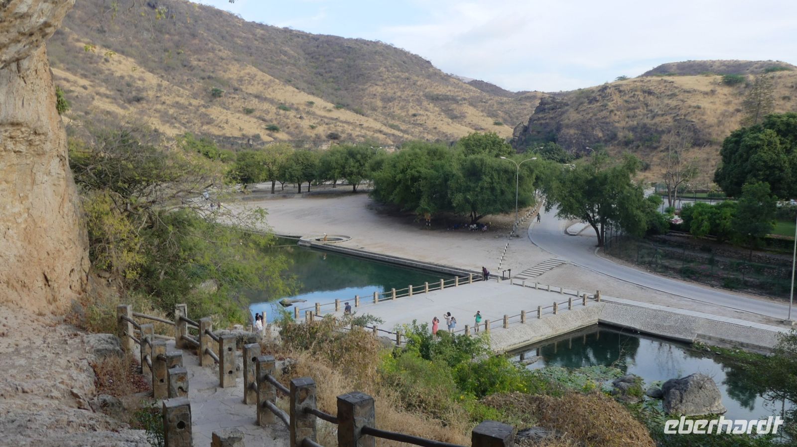 Unseren Halt in Mirbat kürzen wir ab, denn nach dem letzten Zyklon sind die historischen Gebäude überwiegend zerstört. Wir verlassen die Küste in das vielleicht bekannteste und schönste Seitental der Region, das Wadi Darbat. Da wir hier mit unserem großen Bus nicht weit kommen würden, wechseln wir zwischenzeitlich auf einen kleineren Coaster-Bus. Flankiert von grünen Hängen zieht sich ein Fluss durch das Tal. Für Einheimische ein Paradies, hier fährt man Tretboot, macht Picknick und Selfies mit den Wasserkaskaden.