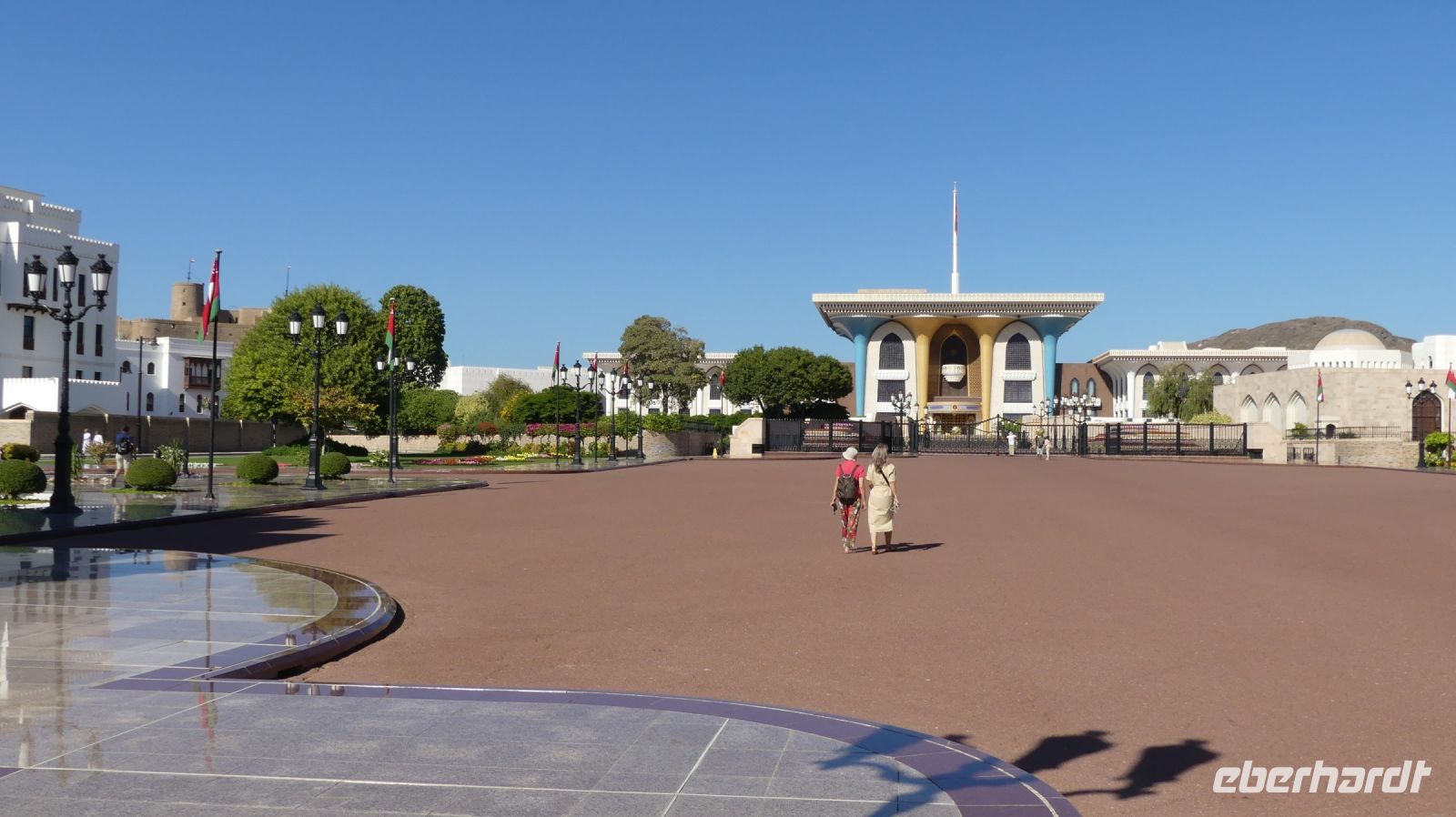 Eine Bucht weiter befindet sich „Old Muscat“, das alte Muscat, Wir nehmen mit dem Bus die alte Riyam Road, um einen Ausblick auf Old Muscat zu bekommen. Nach einem Museumsbesuch im Bait Al Zubair steuern wir den Sultanspalast an. Der 2020 verstorbene Sultan Qaboos, lies in den 1970er Jahren den Alam-Palast bauen (alam = arab. für Zeichen), als Zeichen für den Aufbruch des Sultanats in die Moderne. Rund um den Palast ist noch der Feiertagsschmuck vom Nationalfeiertag der letzten Wochen angebracht. Zu Füßen der früheren portugiesischen Festungen Jalali und Mirani spazieren wir durch das alte Muscat mit dem einstigen Gouverneurspalast Bait Garaiza und der kleinen blauen Moschee Masjid Al Khor bis zur Seeterrasse des Palastes.