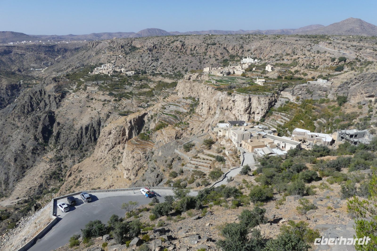 Es folgt noch eine ca. einstündige Fahrt tief und hoch in die Bergwelt hinein bis zum Grand Canyon von Oman. Als wir aussteigen, zeigen die Höhenmesser ziemlich genau 2.000 Meter an und die Temperatur ist um zehn auf 18 Grad gefallen. Es ist ein toller Ausblick in einen der weltgrößten Canyons, der hier fast 1.000 Meter senkrecht abfällt. Im Hintergrund liegt etwas unscheinbar der höchste Berg Omans, der 3009 Meter hohe Jebel Shams.