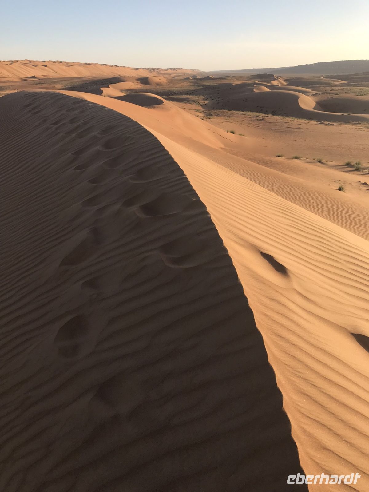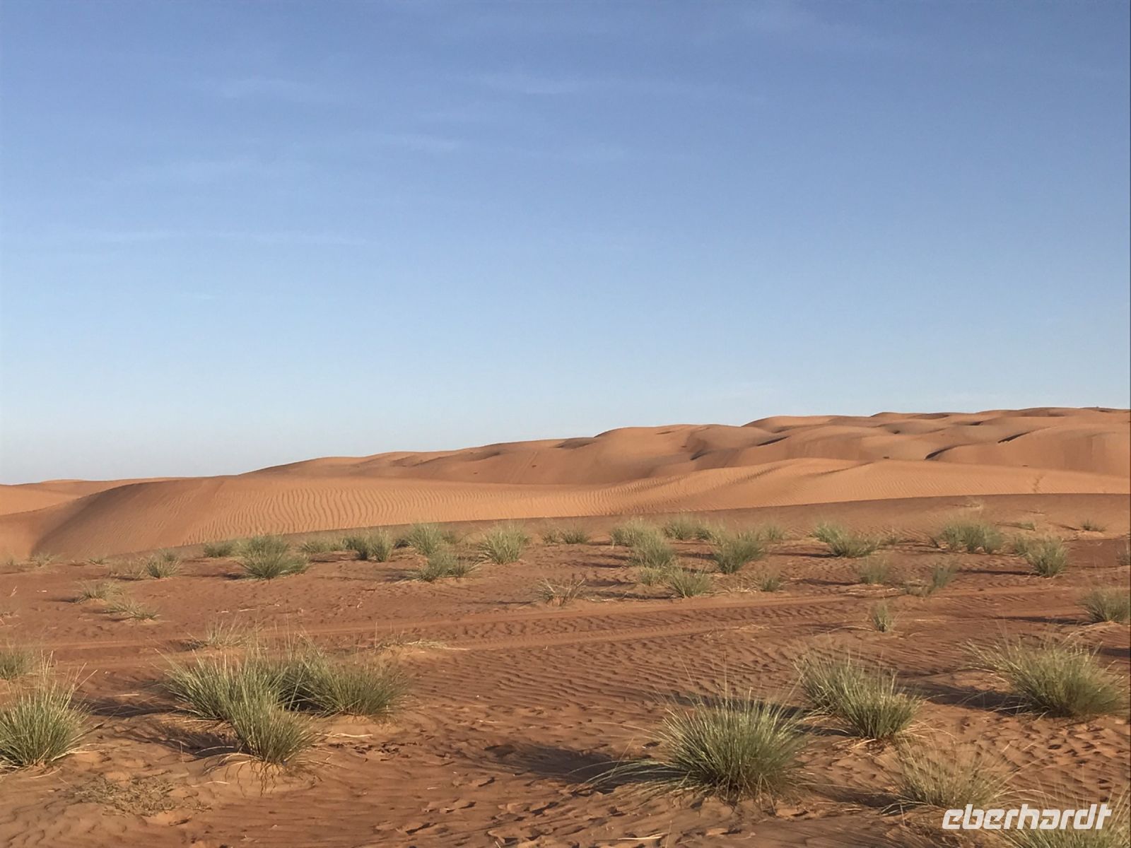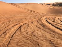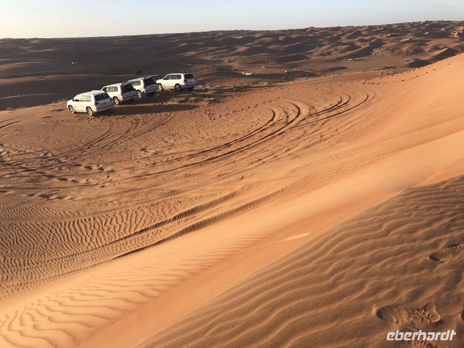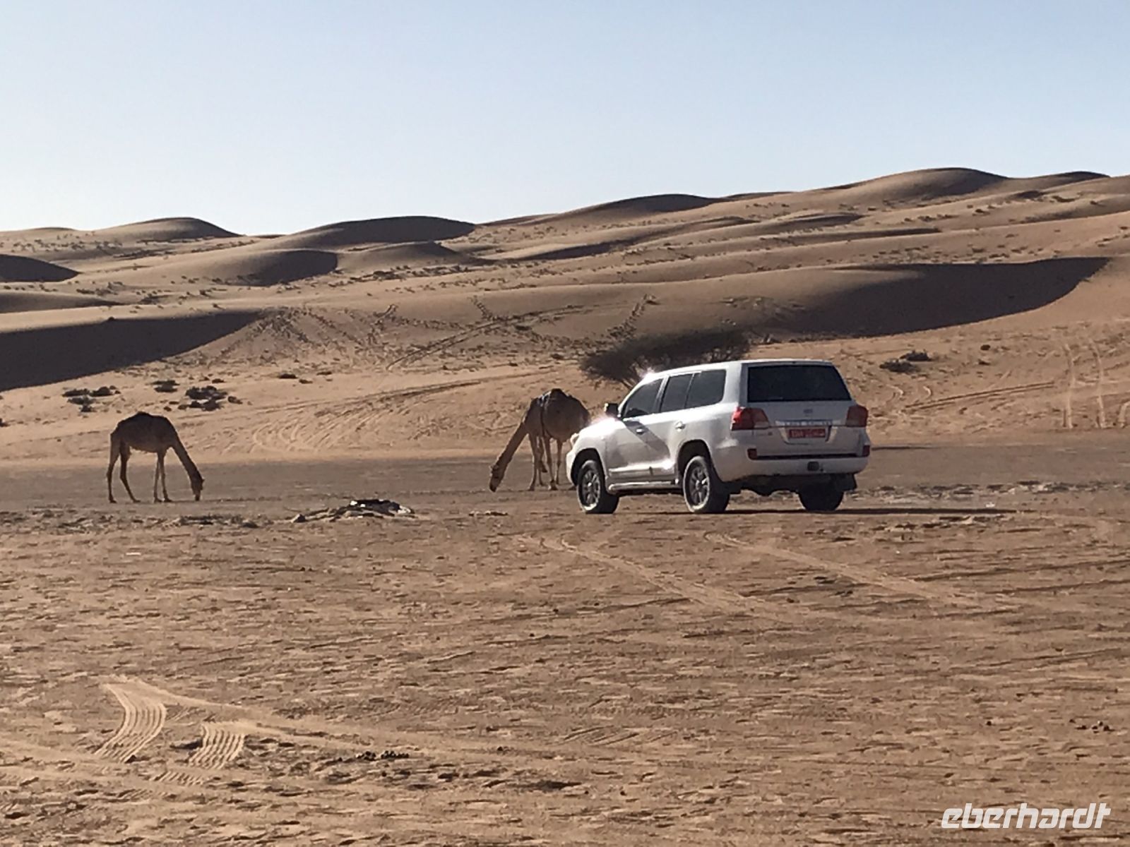 Jetzt wird es Zeit für unsere Fahrt in die Wüste, einer der Höhepunkt auf unserer an highlights und Besonderheiten ohnehin reichen Tour. Damit die Jeeps im Sand nicht ins Schlingern geraten, wird vorab etwas Luft aus den Reifen gelassen und dann geht es hinein in das Vergnügen. Breite Spuren zeigen den Weg, aber es macht unseren Fahrern auch Spaß, einmal auszuscheren und einen Dünenhügel hinauf zu fahren, breite Kurven zu nehmen und uns das Gefühl vom Sand zu vermitteln. Die Fahrt zu unserem Camp ist viel zu kurz, zu schön sind die Ausblicke auf die Dünen. Wenn es irgendwo ein paar dürre Sträucher gibt, sind auch Kühe, Ziegen oder Kamele nicht weit.